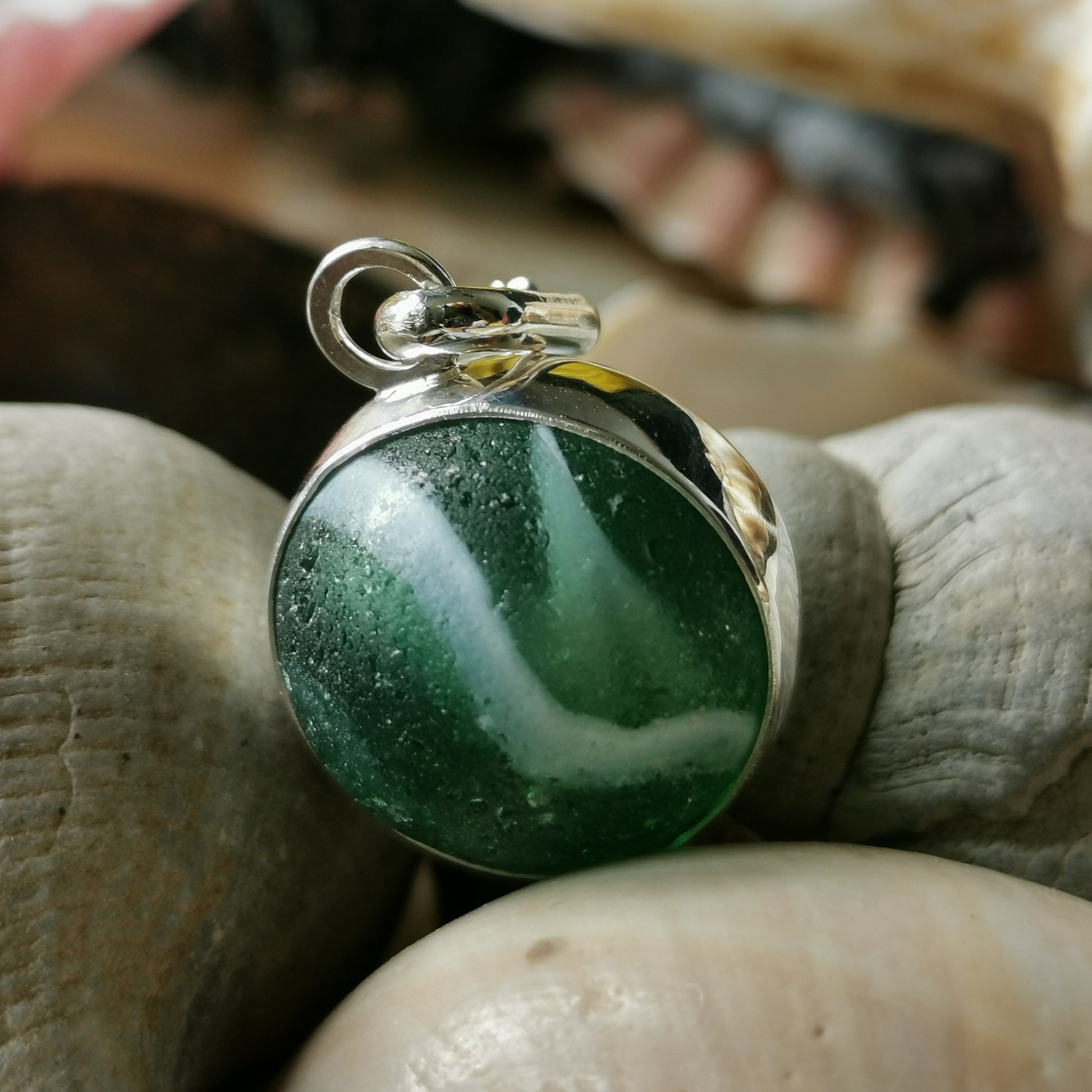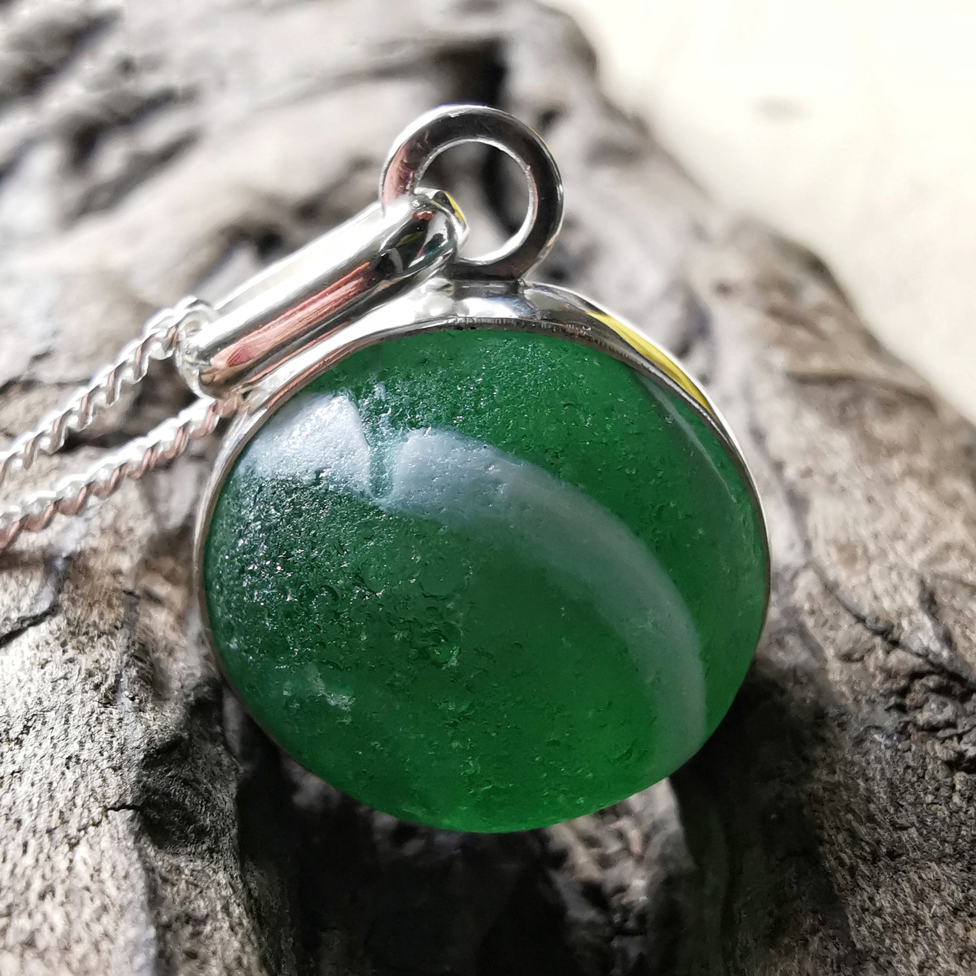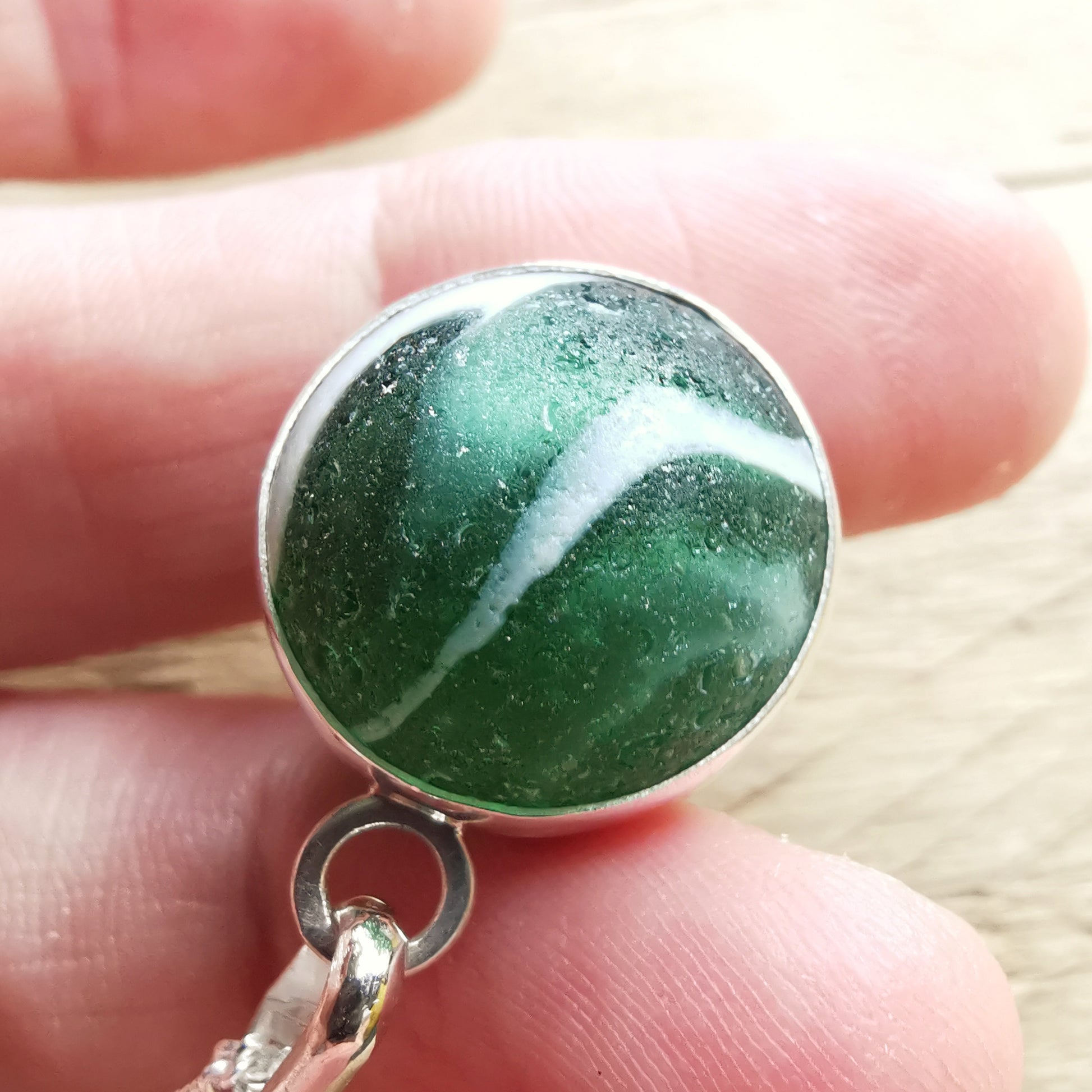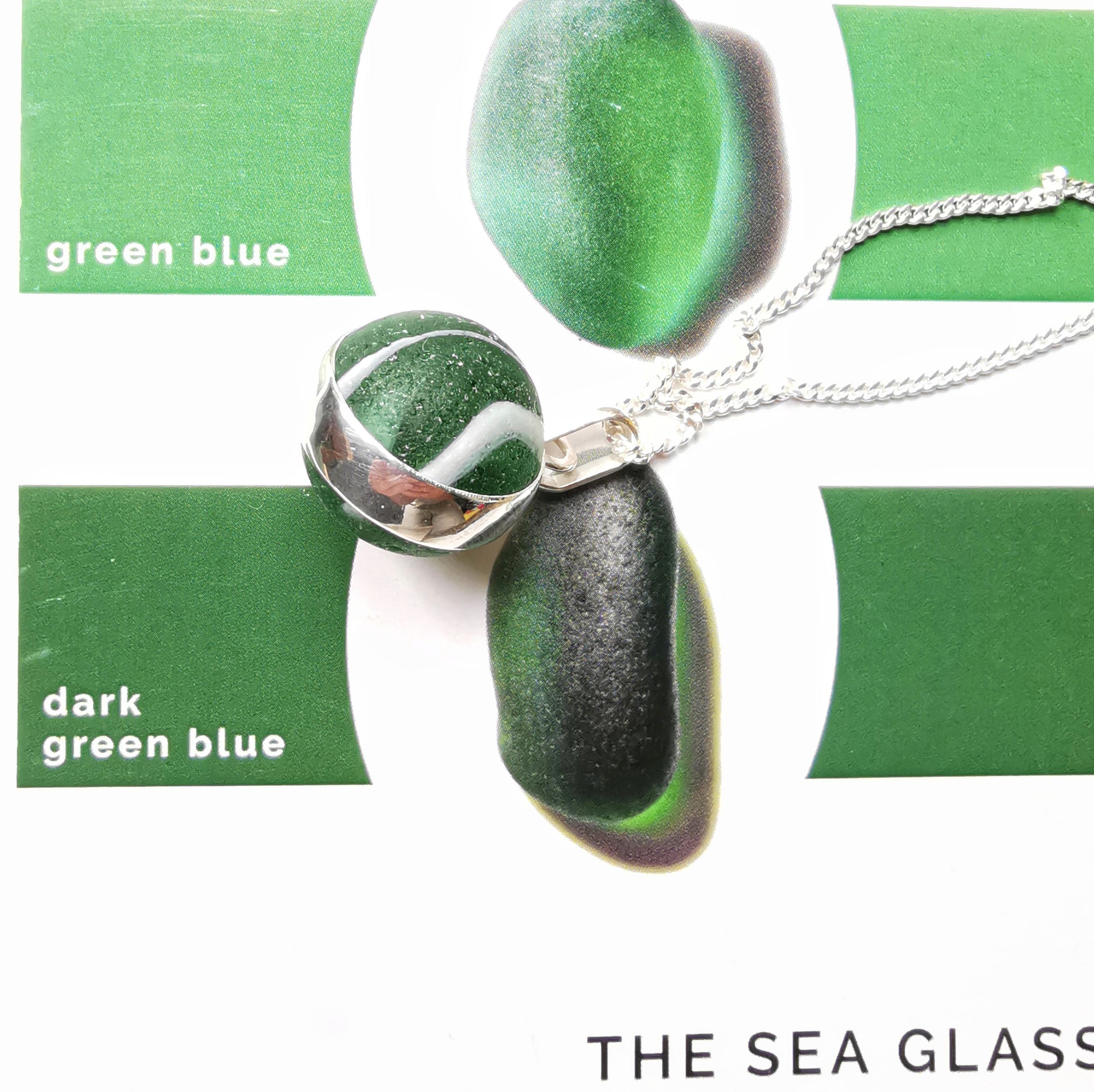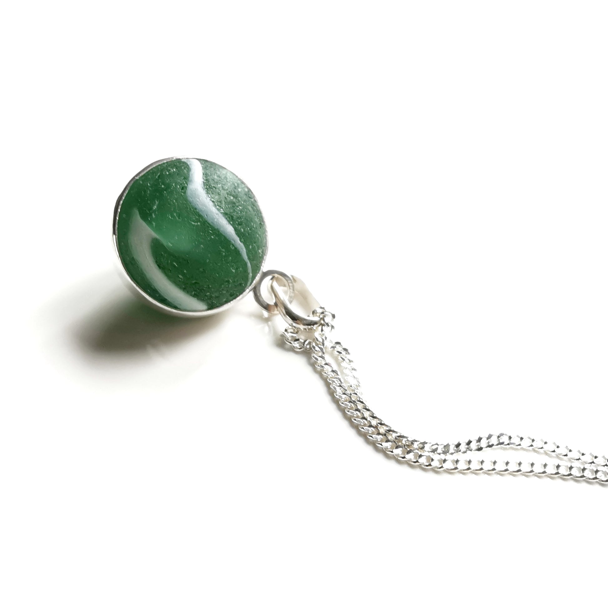One of a kind pendant composed with genuine frosted teal sea glass marble, found by myself on a beach in Edinburgh. The marble is set in fine silver bezel, the chain is sterling silver. The marble can spin in the bezel, this is normal and it is not a fault, marble is secure and is not going to fall of the bezel.