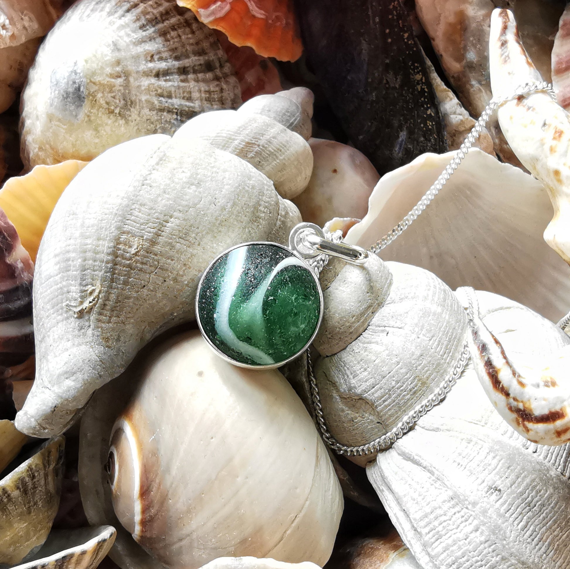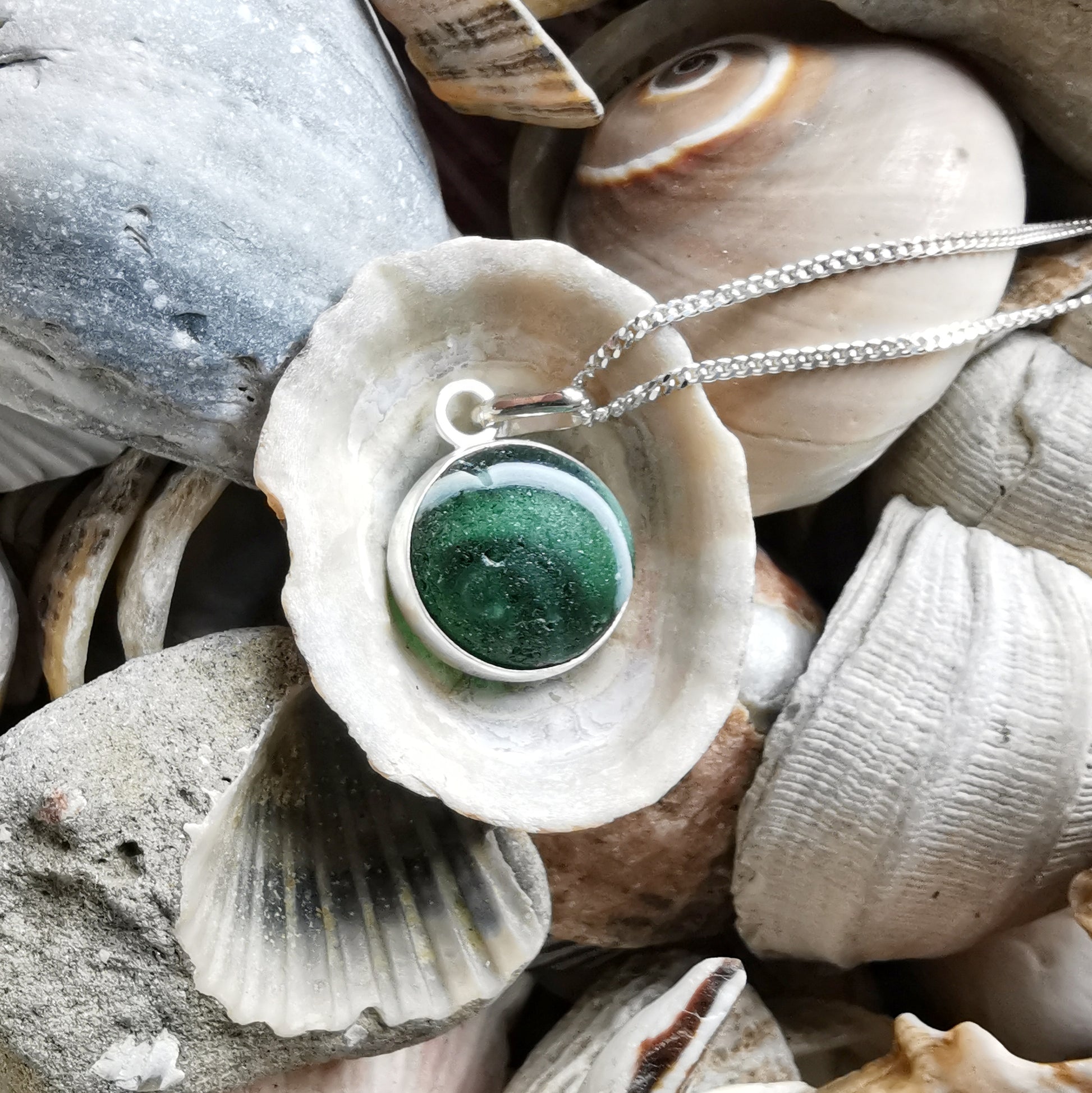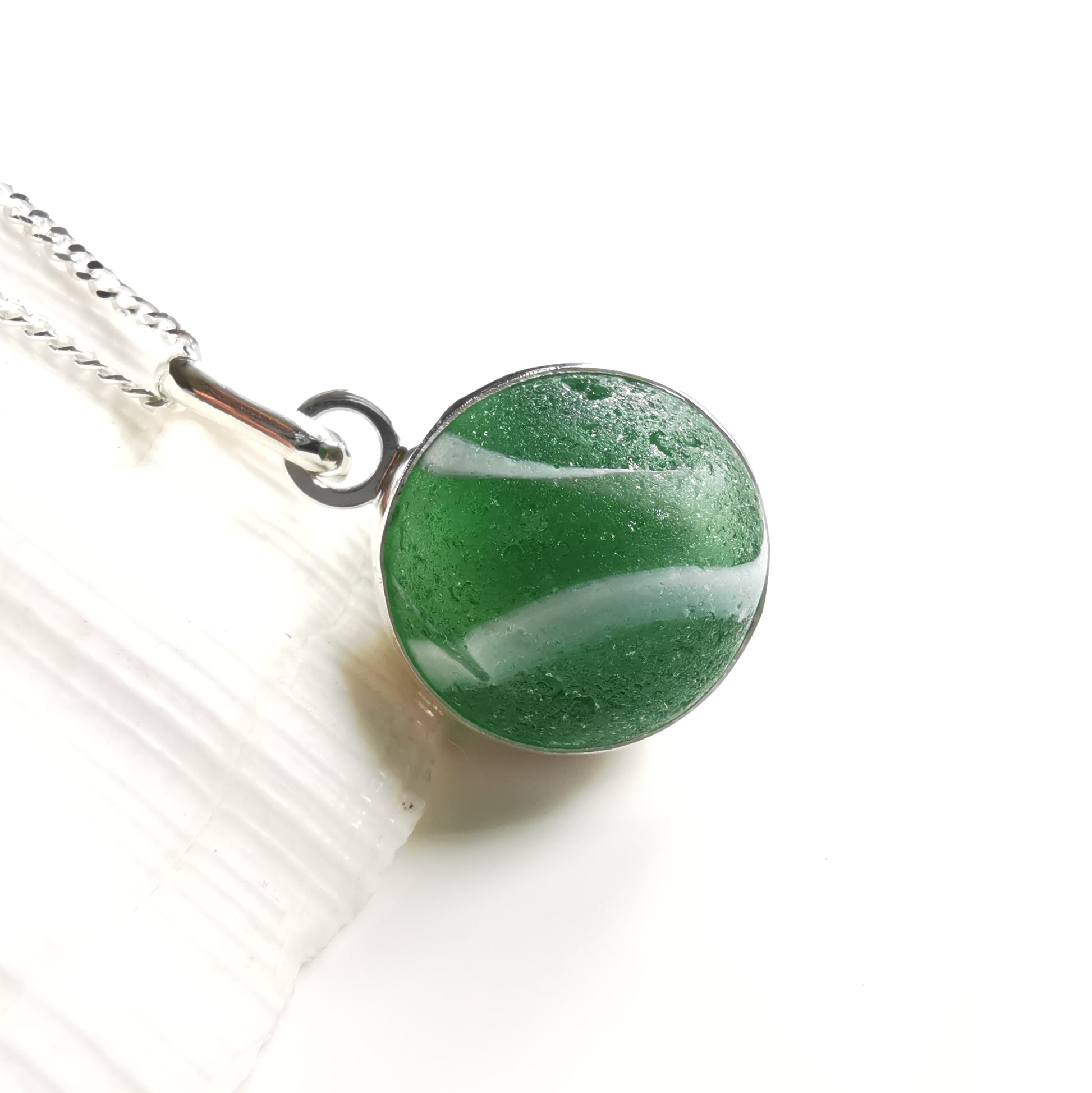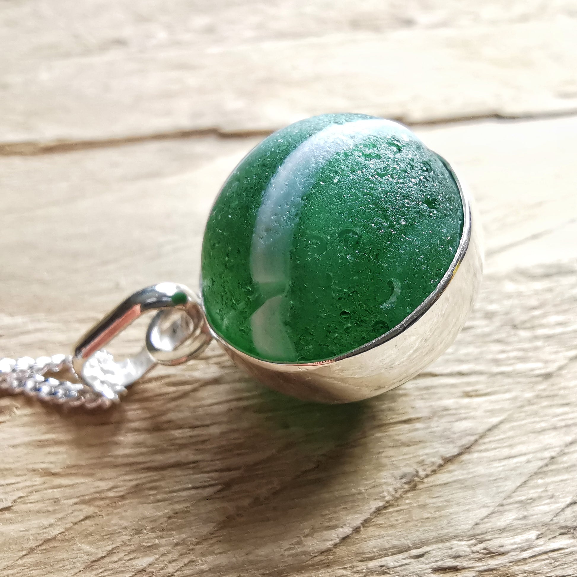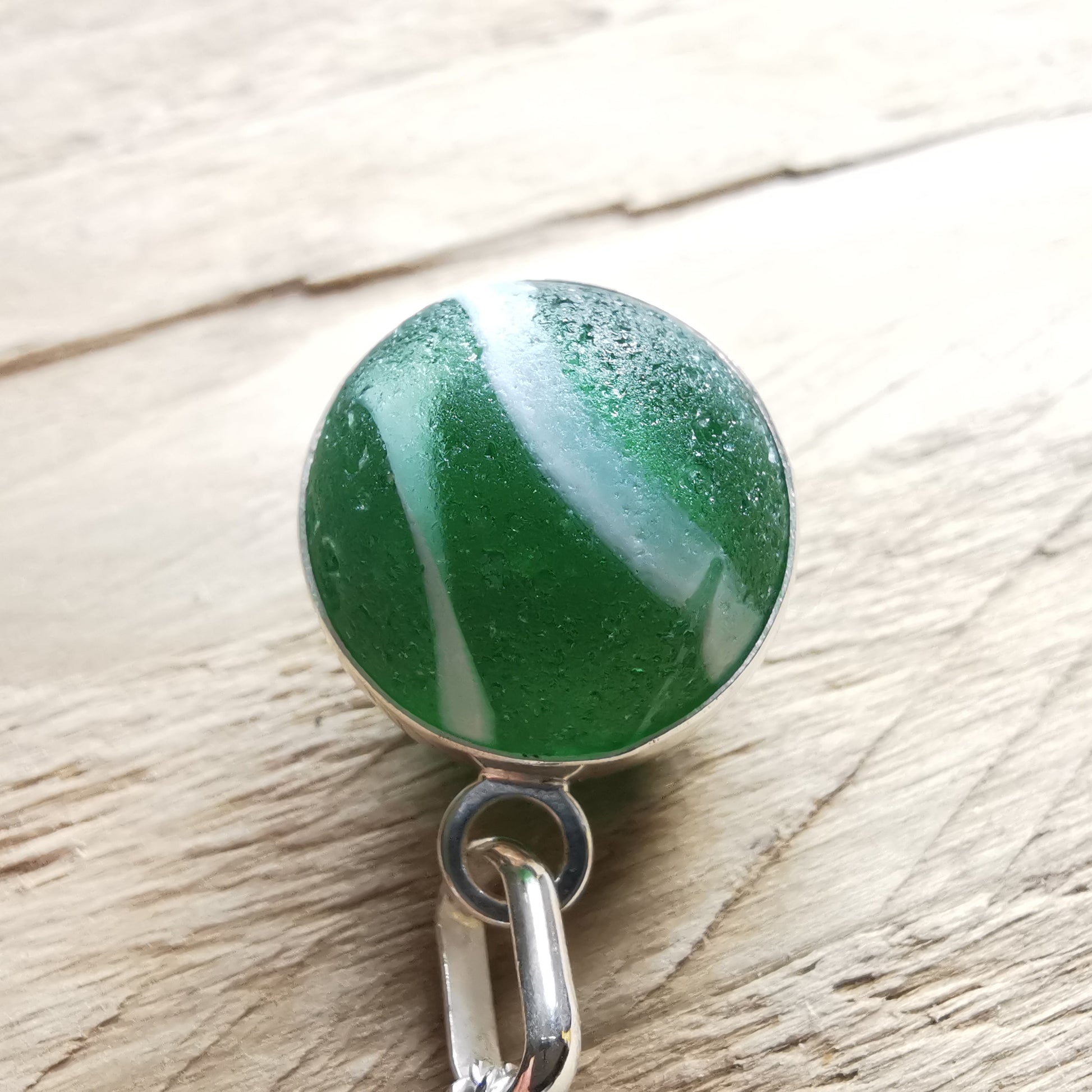 One of a kind pendant composed with genuine frosted teal sea glass marble, found by myself on a beach in Edinburgh. The marble is set in fine silver bezel, the chain is sterling silver. The marble can spin in the bezel, this is normal and it is not a fault, marble is secure and is not going to fall of the bezel.
