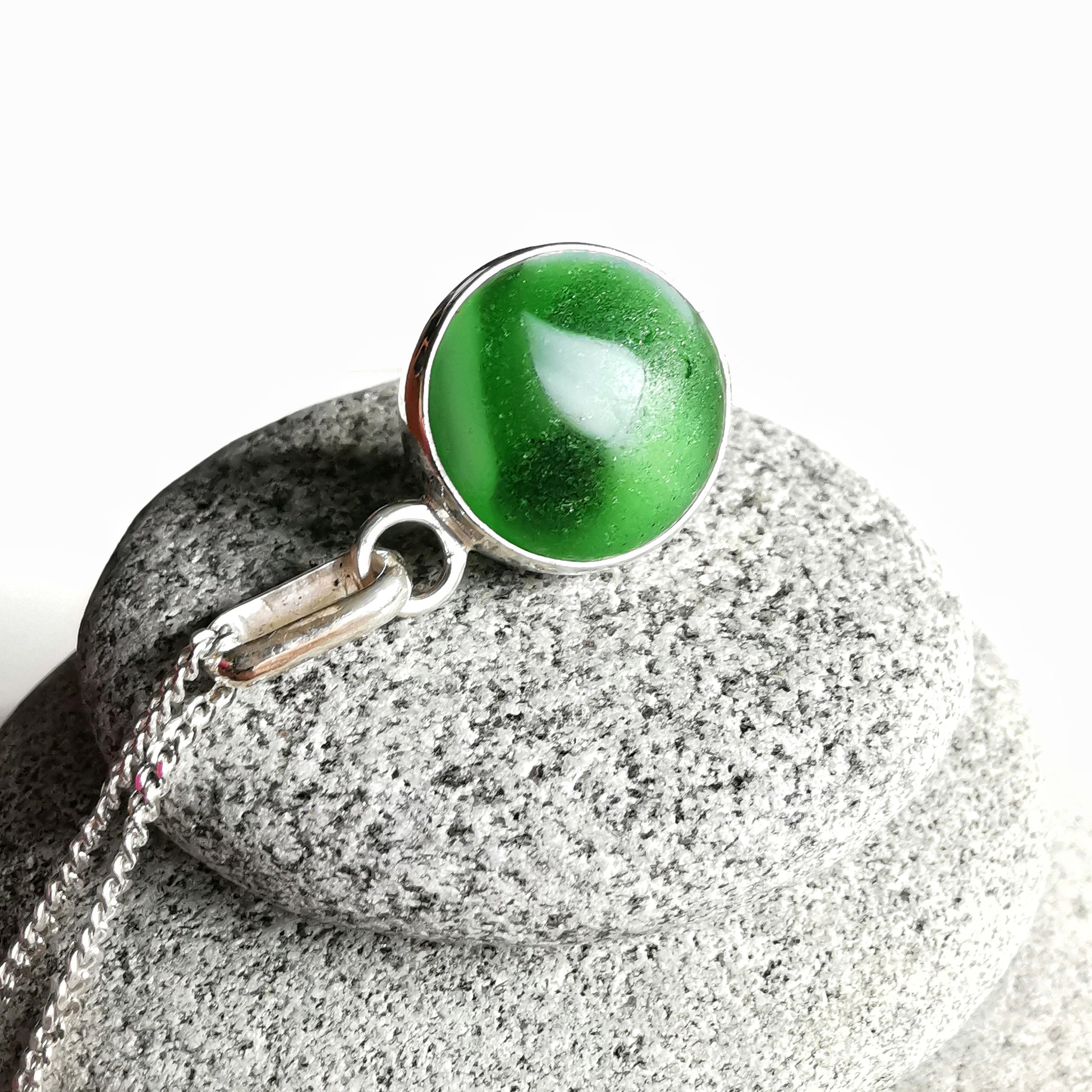 One of a kind pendant composed with genuine frosted green sea glass marble, found by myself on a beach in Edinburgh. The marble is set in fine silver bezel, the chain is sterling silver, marble can spin in the bezel, this is normal and it's not a fault.
