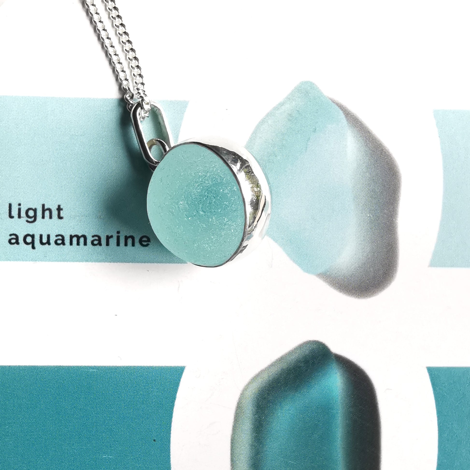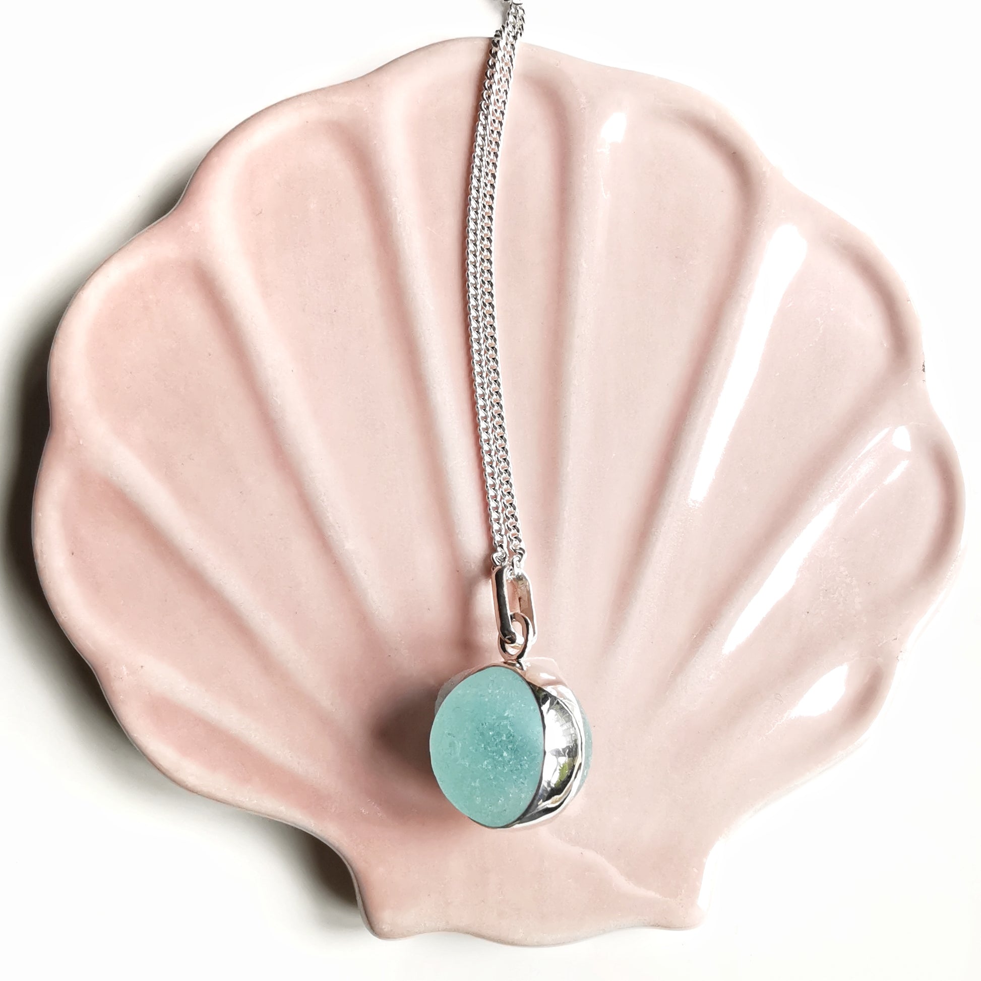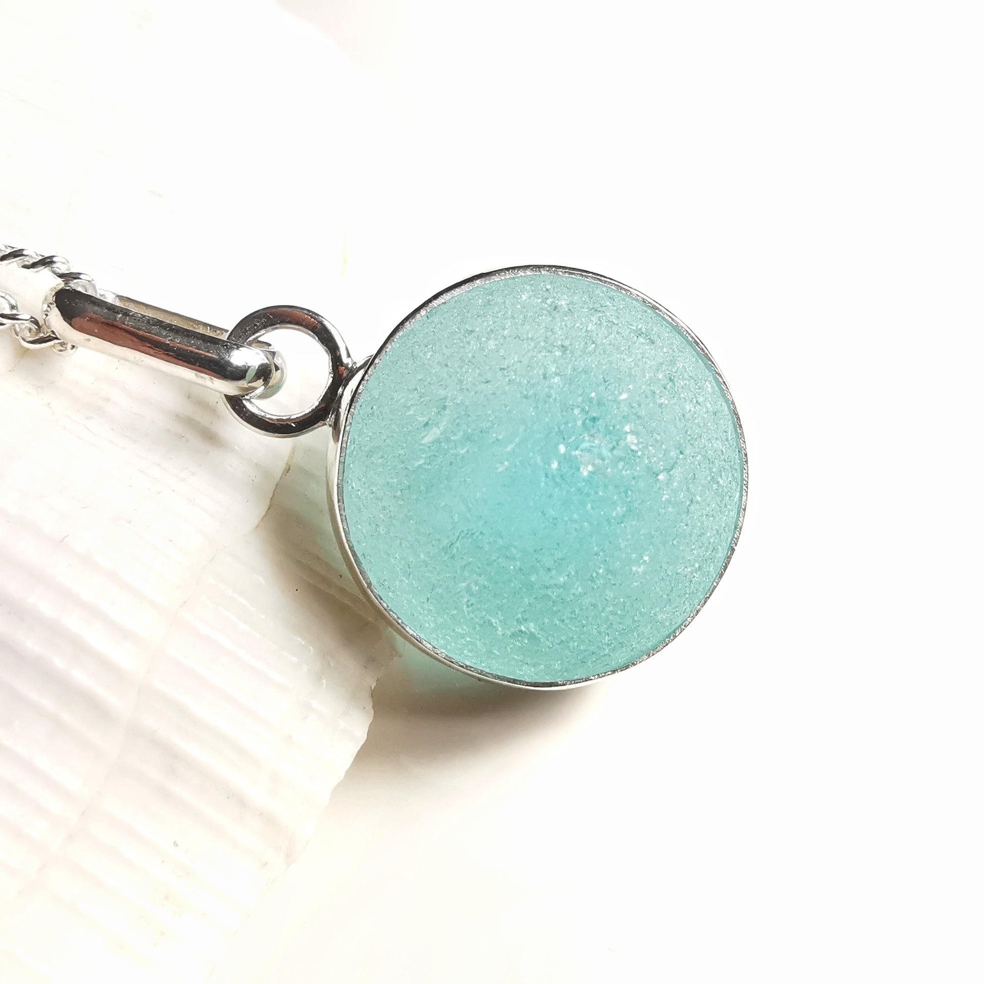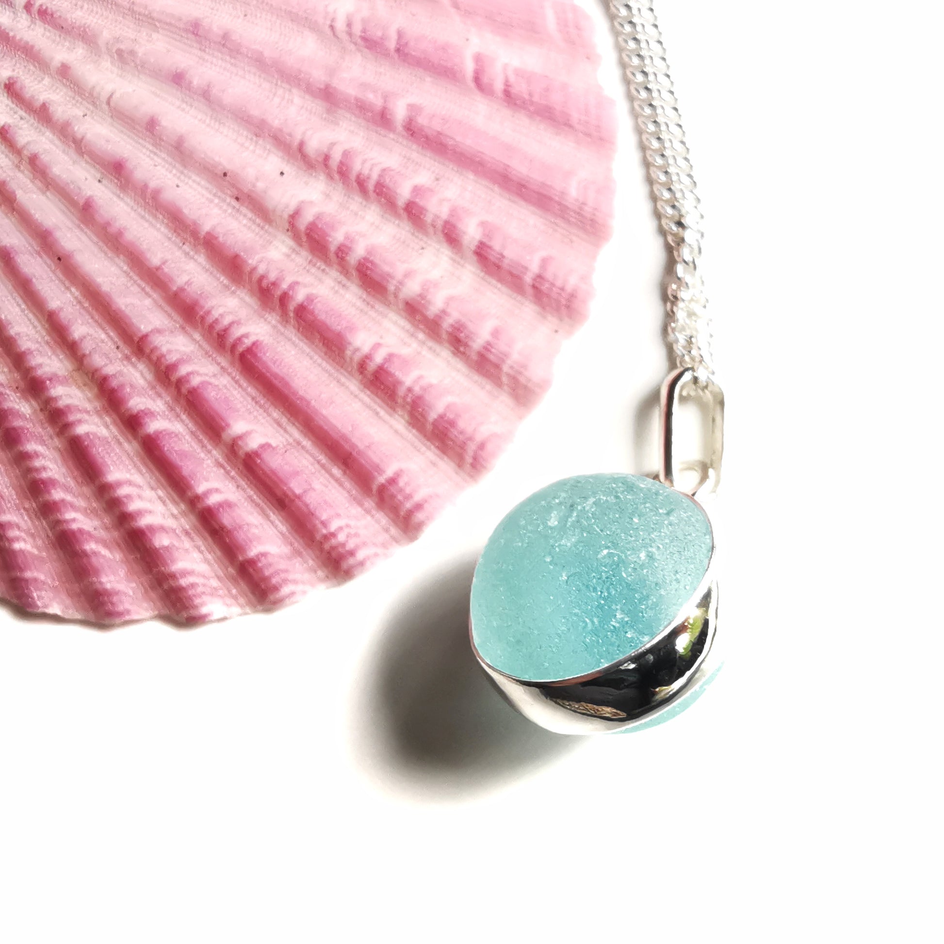 Scottish light aqua blue sea glass marble & sterling silver pendant.