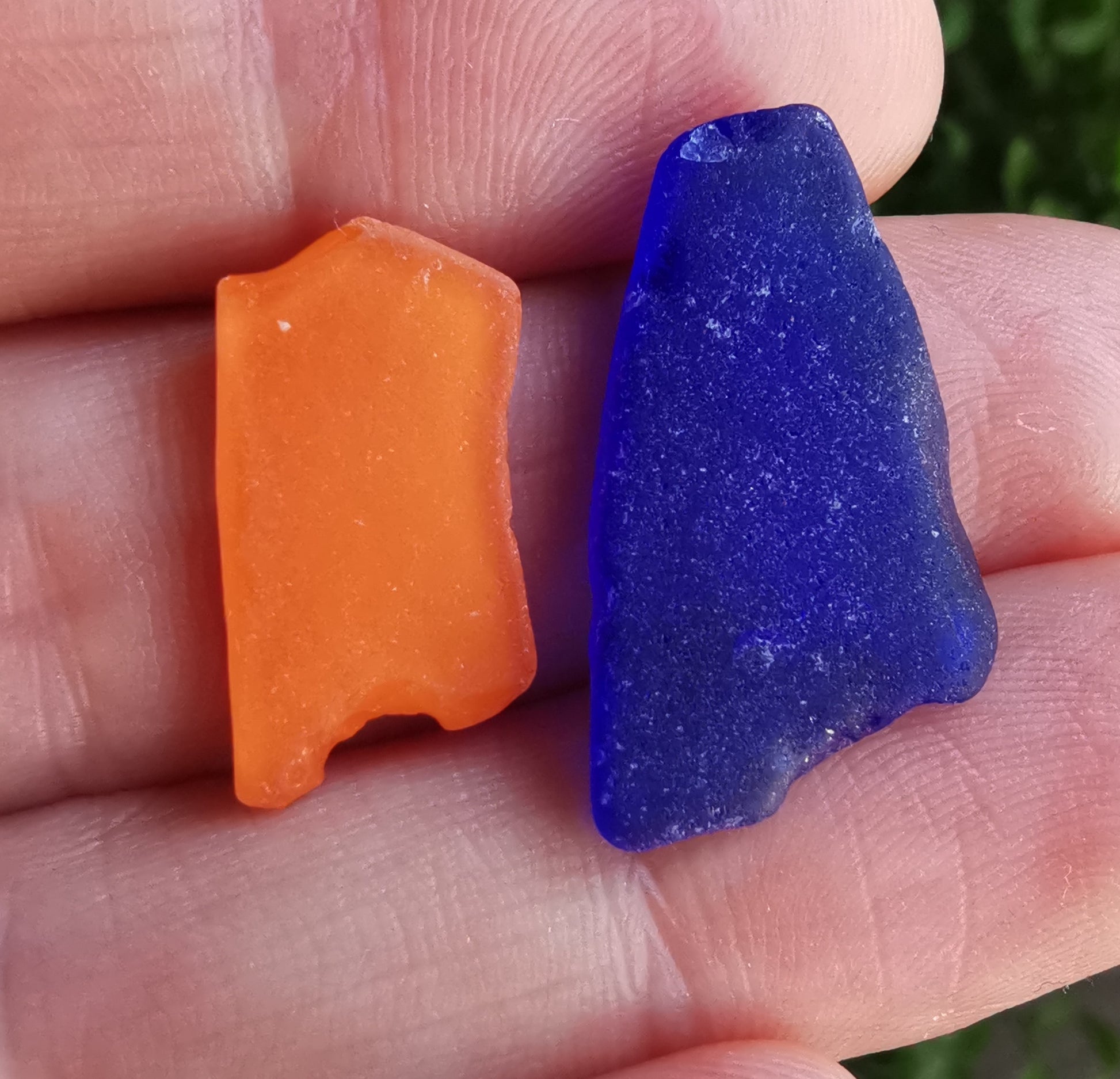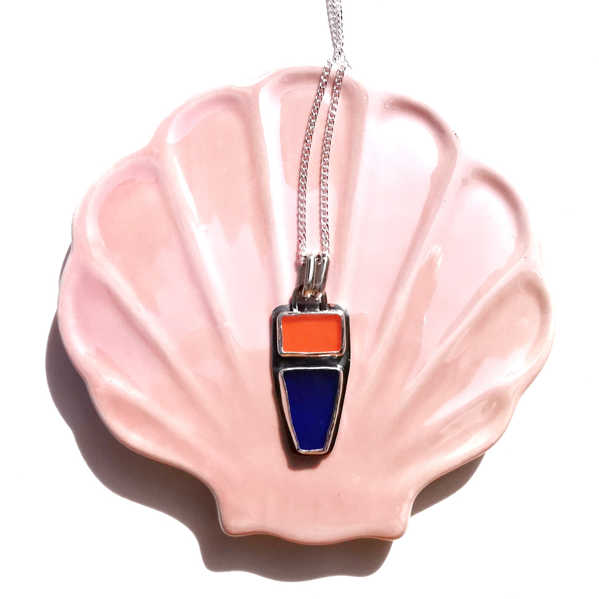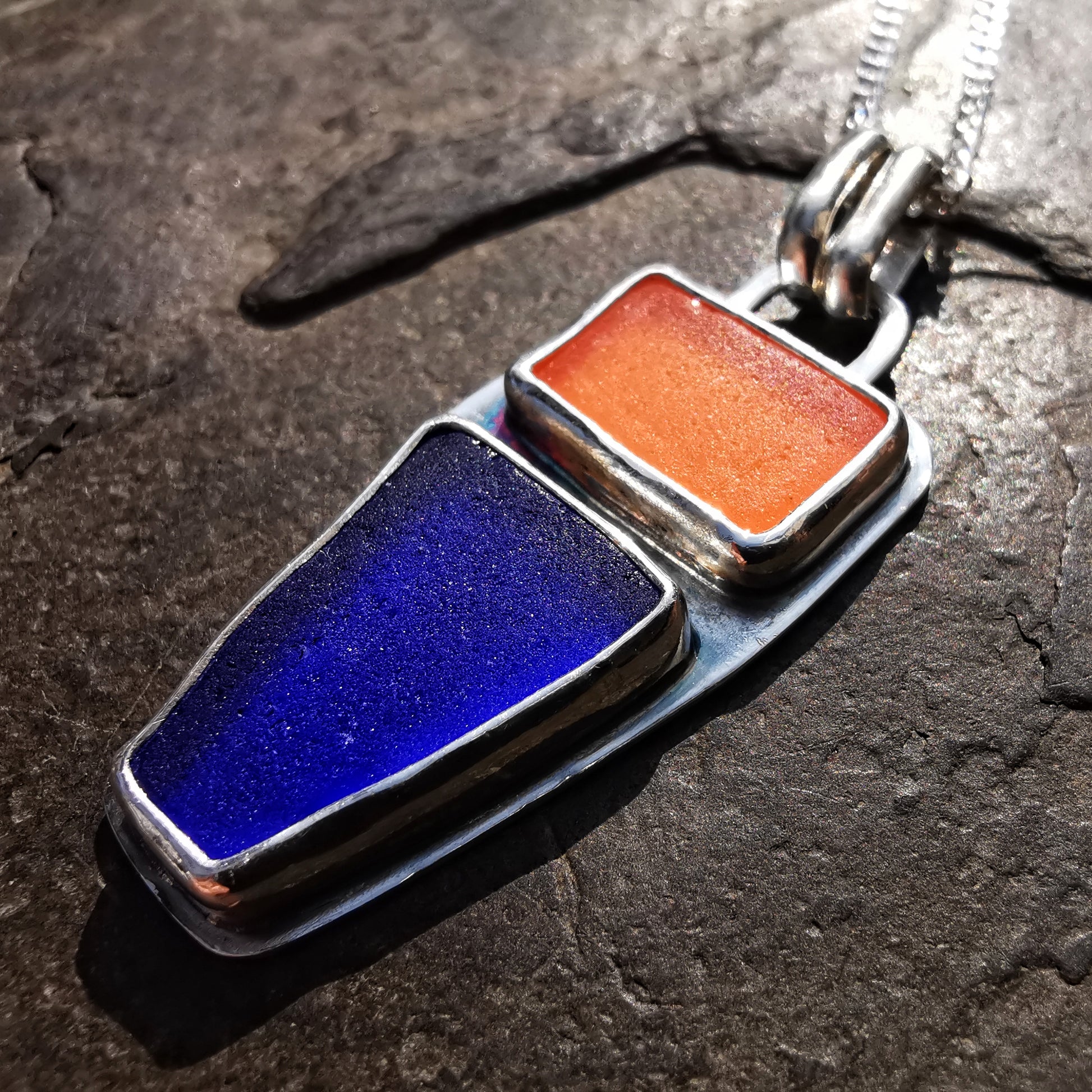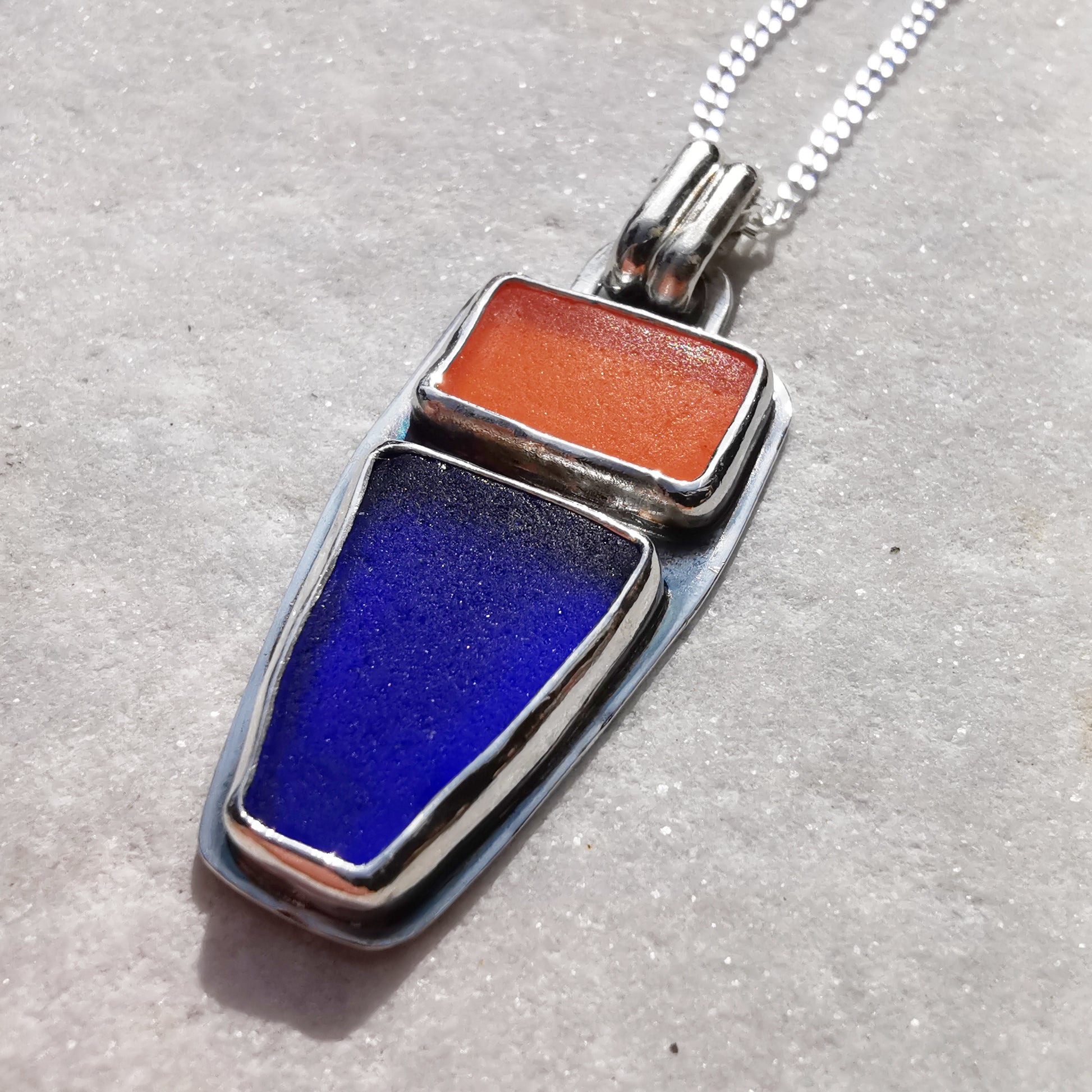 One of a kind pendant composed with Scottish orange and cobalt blue sea glass, found by me on Edinburgh's beaches. The sea glass is set in fine silver bezel, the chain is sterling silver. I've shaped the pieces myself, you can see how it looked previously on the last photo.