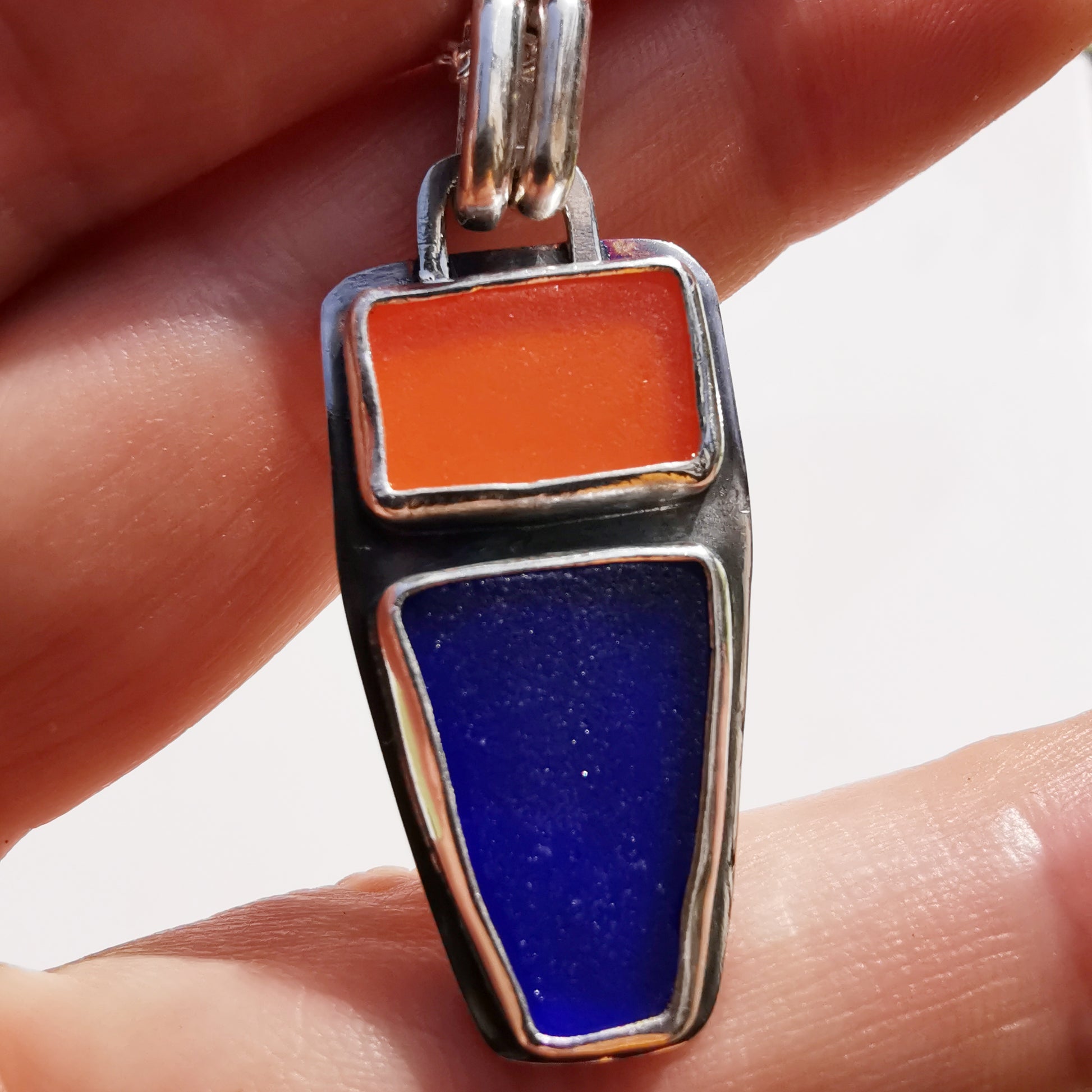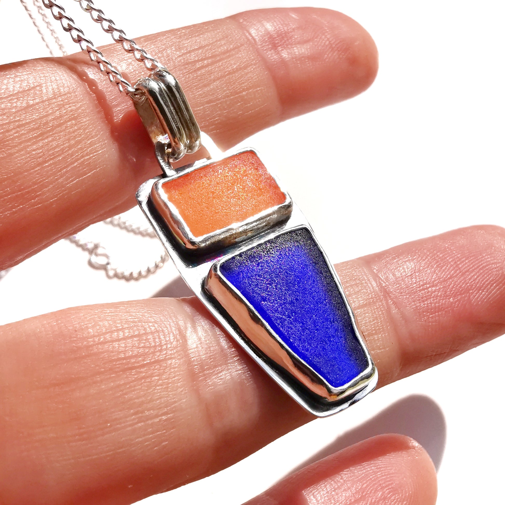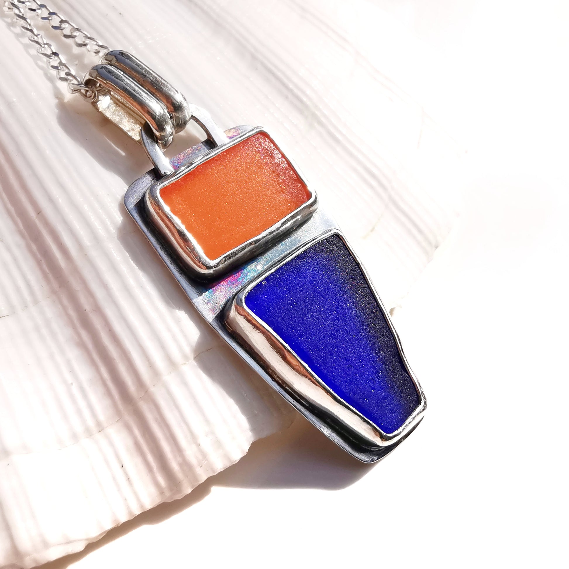 Scottish orange and blue sea glass & sterling silver pendant.