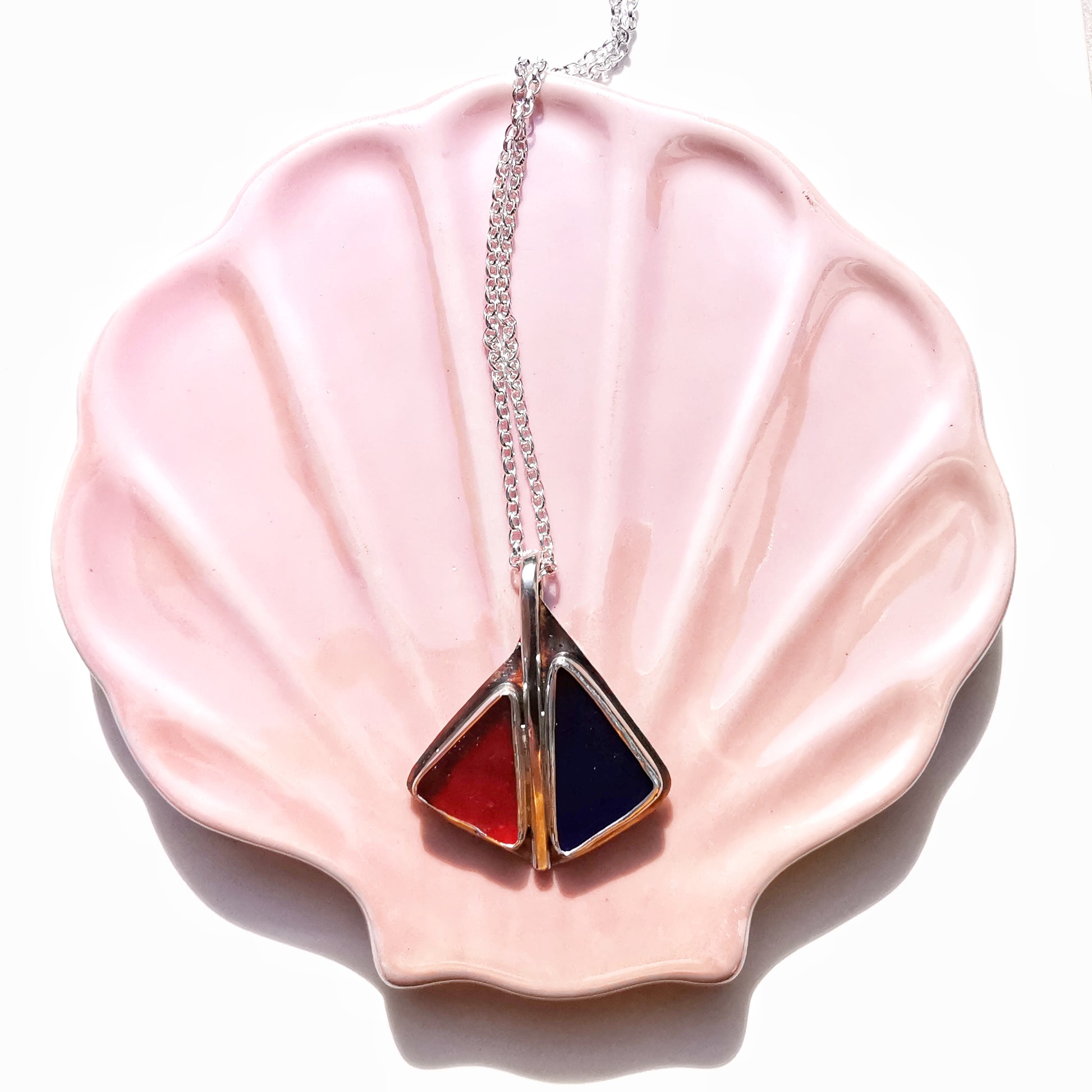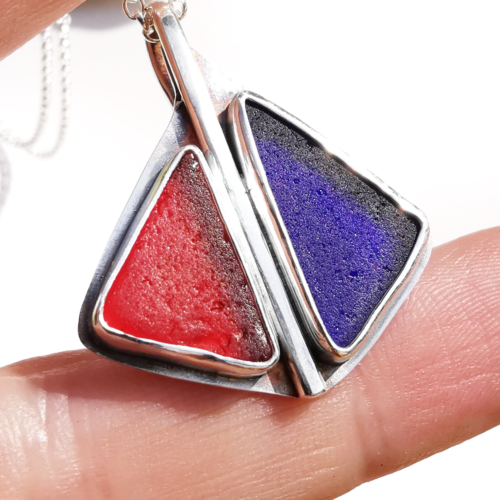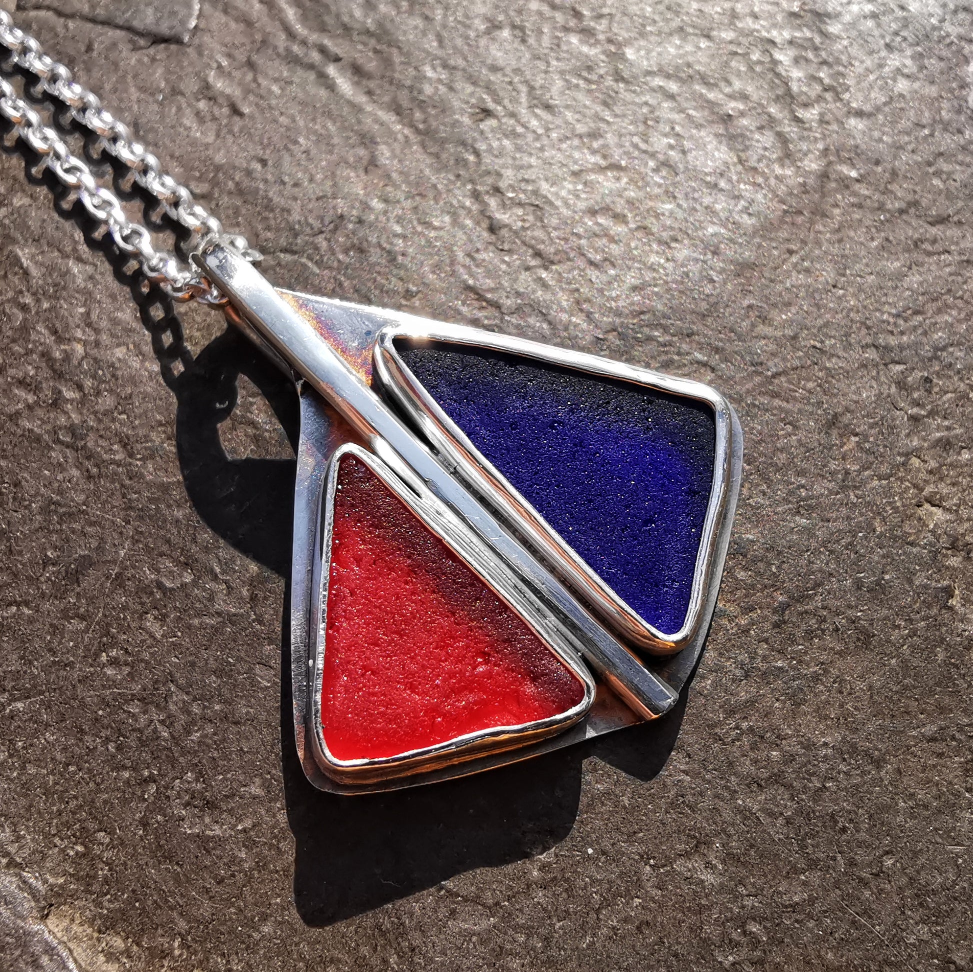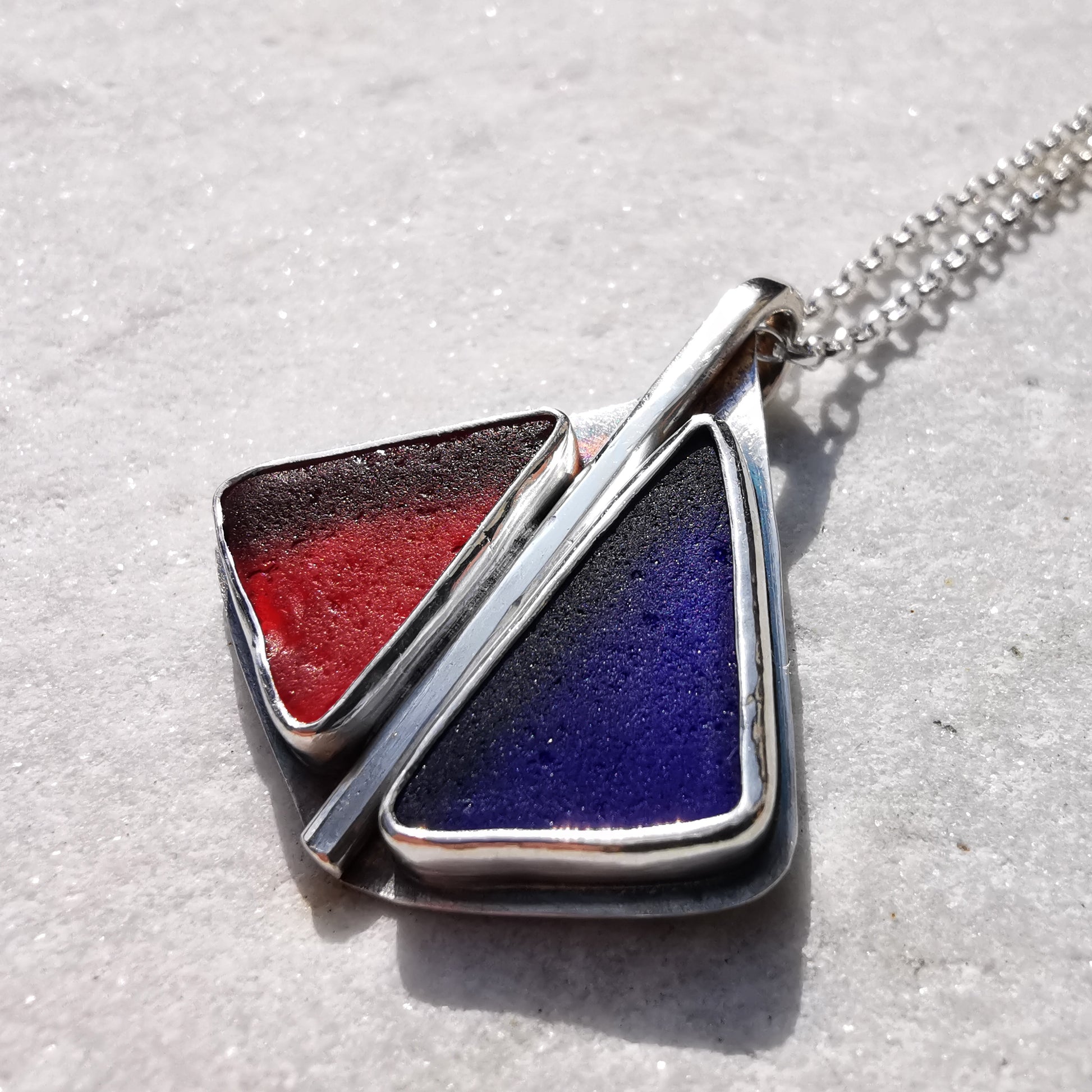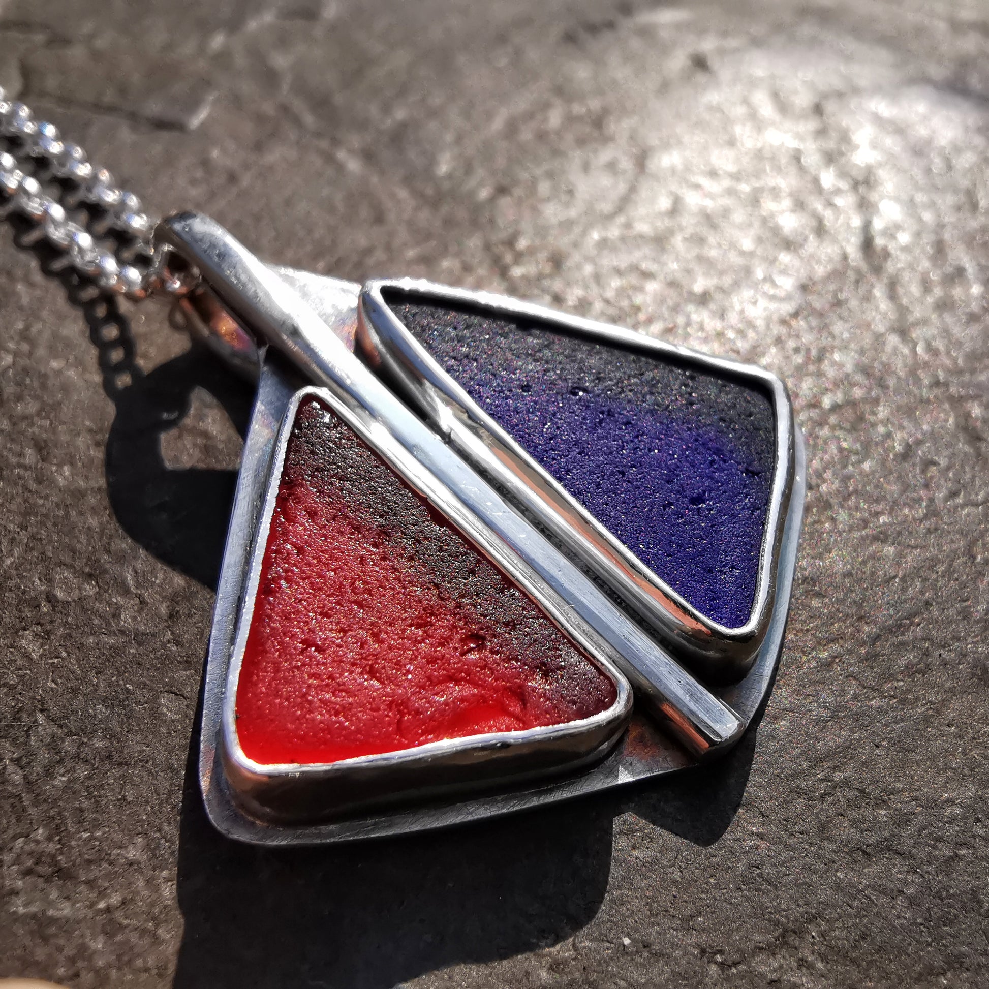 One of a kind pendant composed with Scottish pink and blue sea glass found by me on Edinburgh's beaches. The sea glass is set in fine silver bezel, the chain is sterling silver. I've shaped the pieces myself.