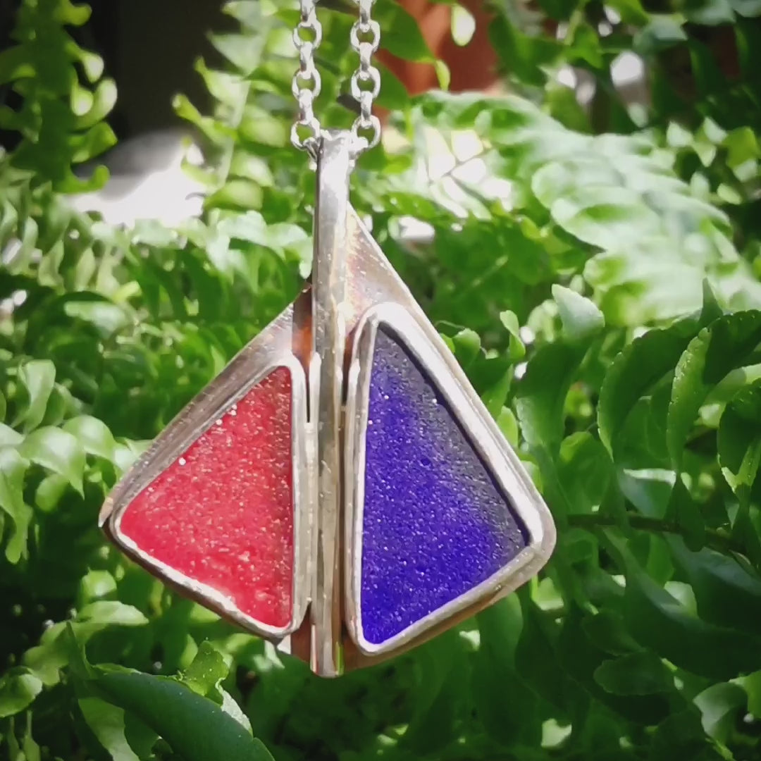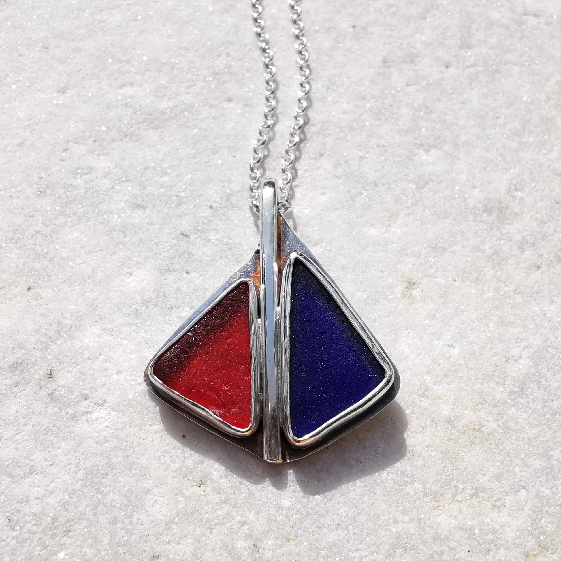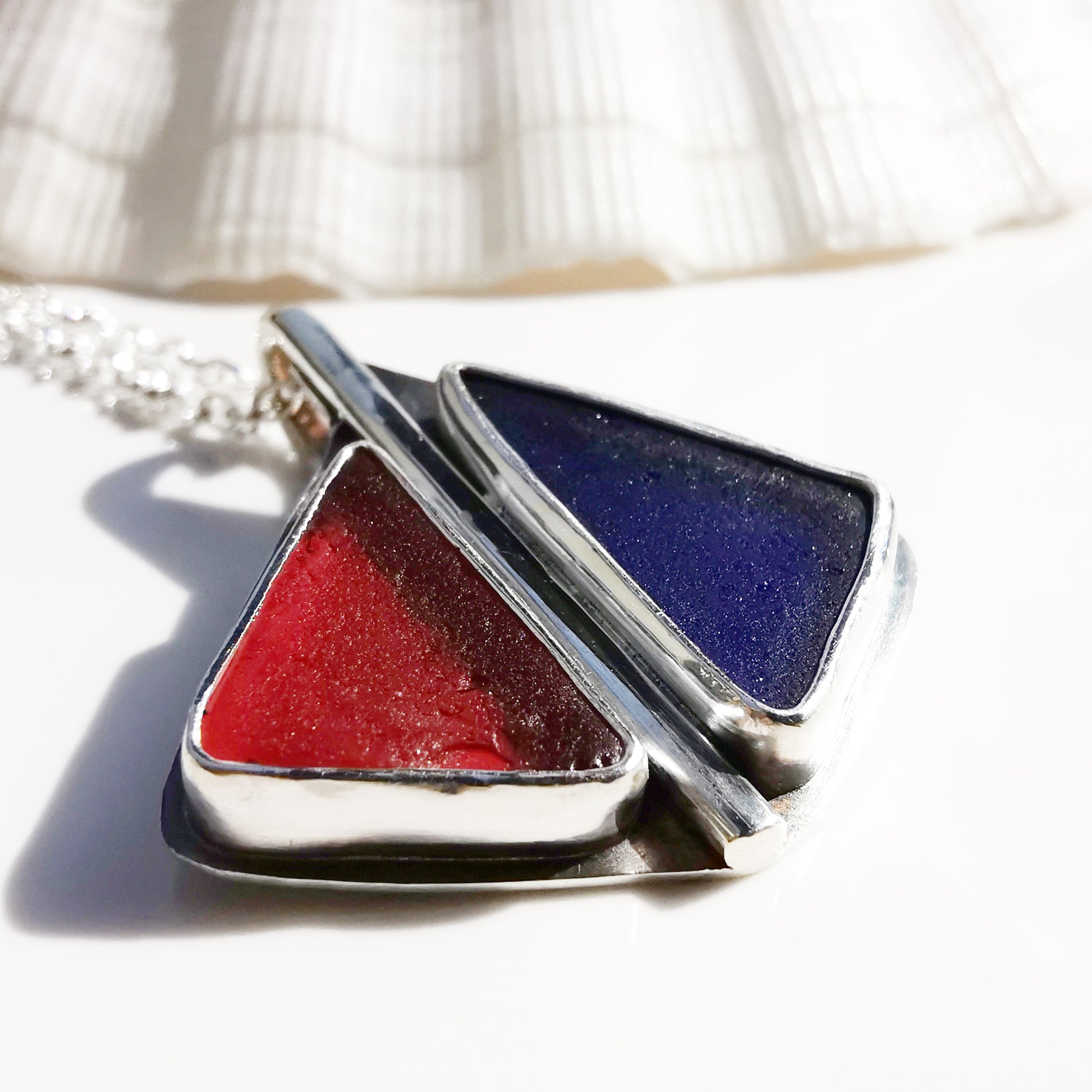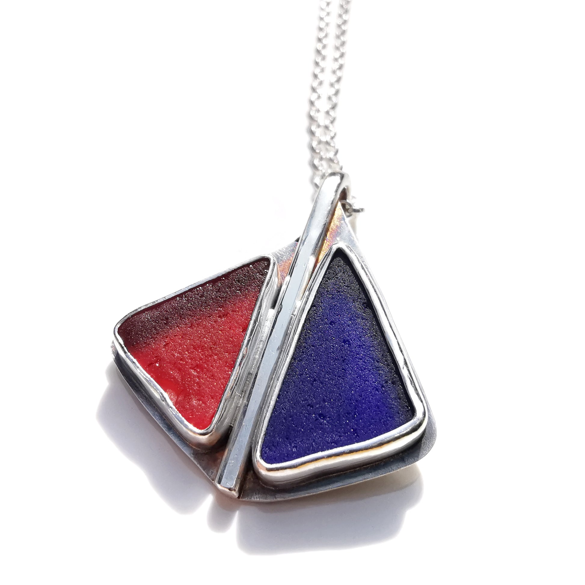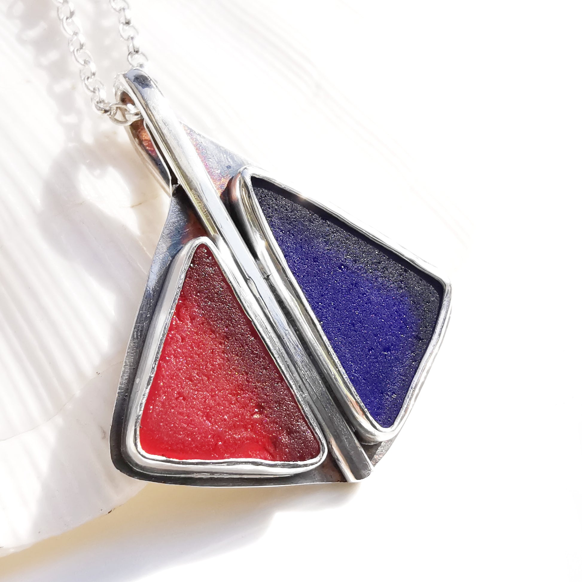 One of a kind pendant composed with Scottish pink and blue sea glass found by me on Edinburgh's beaches. The sea glass is set in fine silver bezel, the chain is sterling silver. I've shaped the pieces myself.