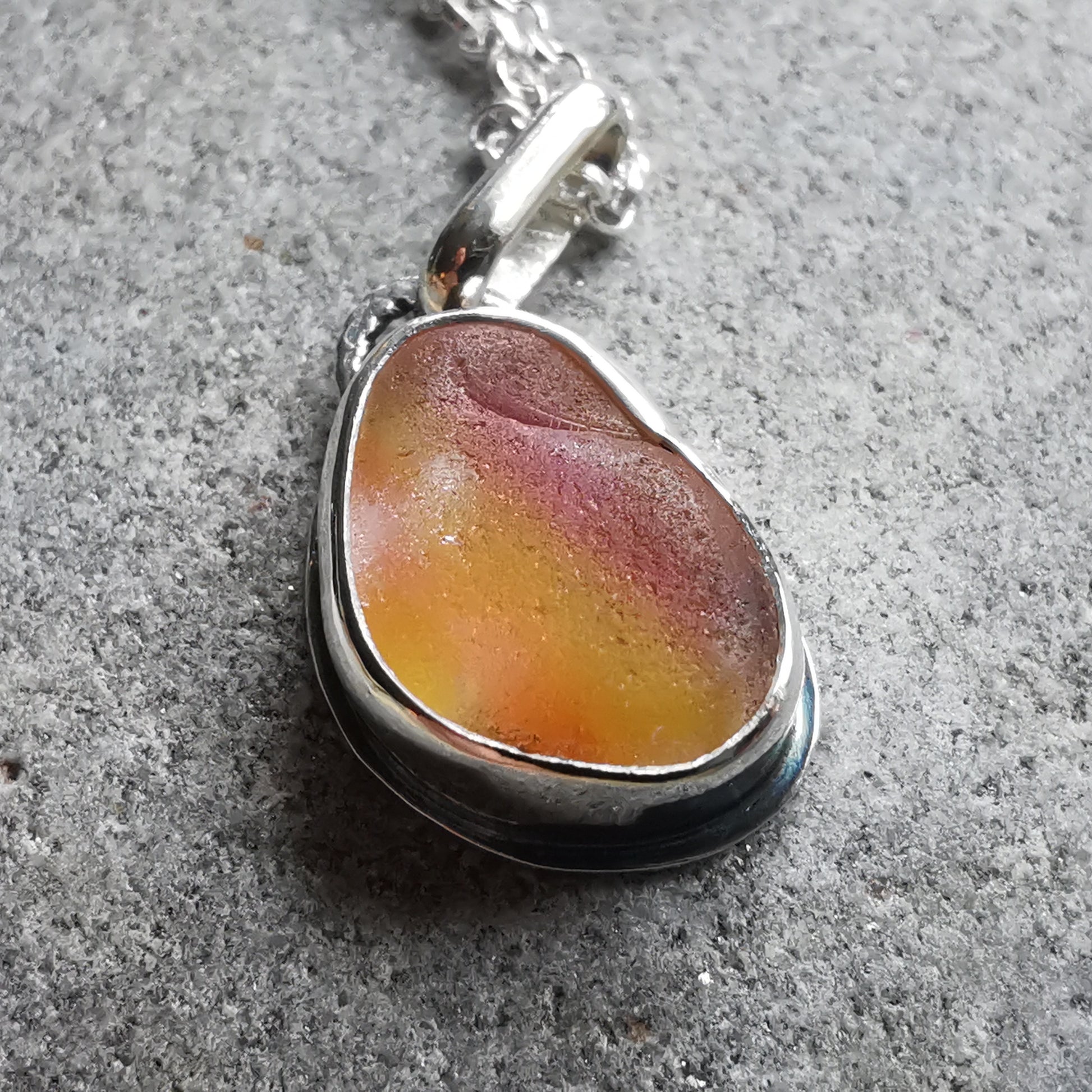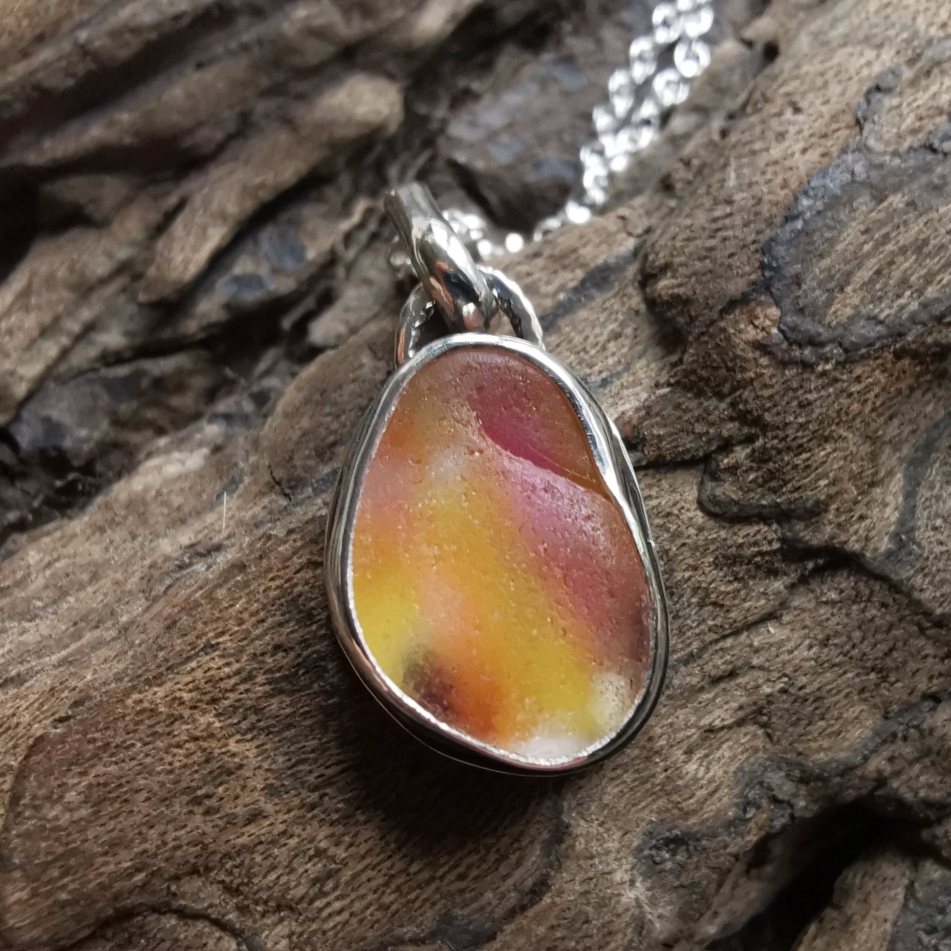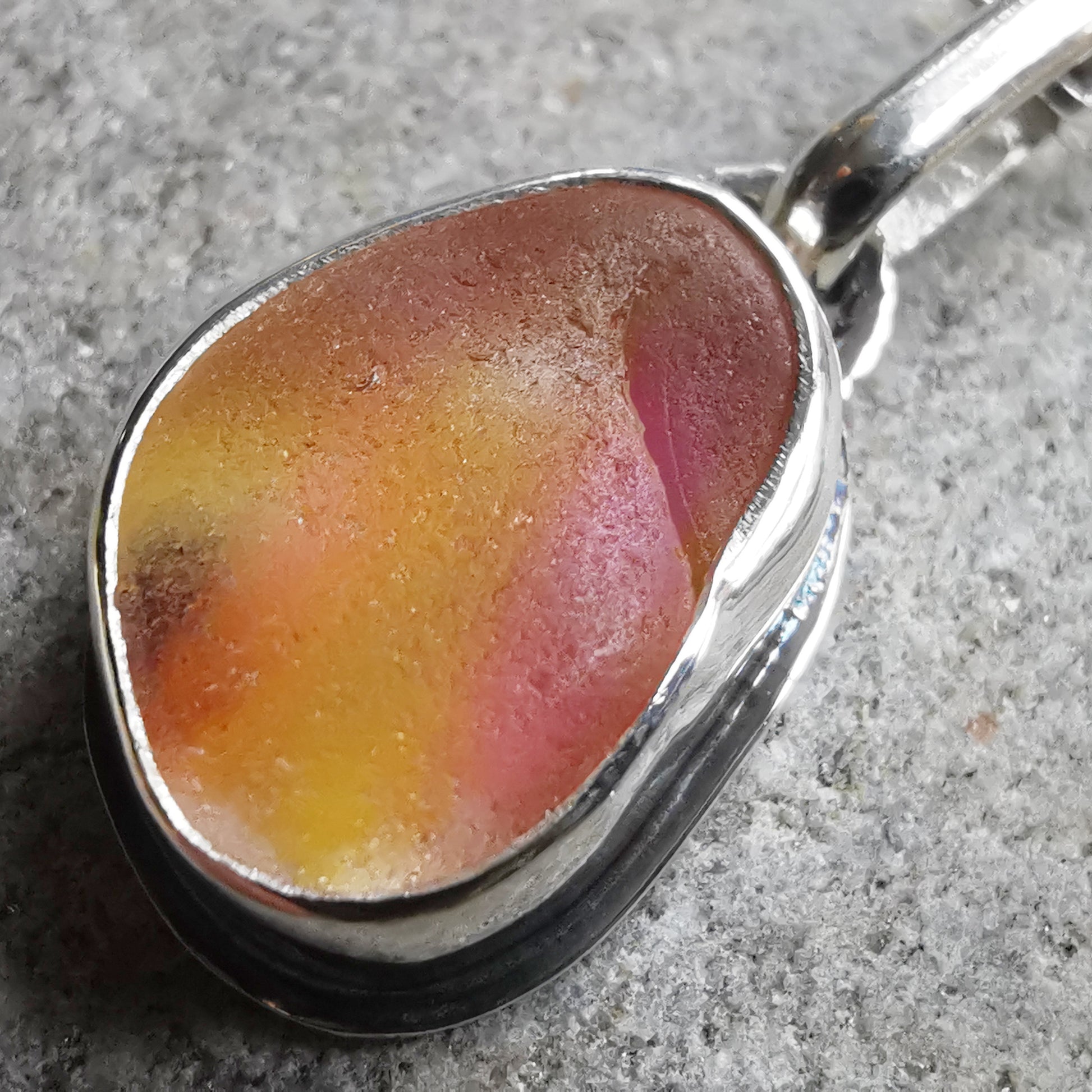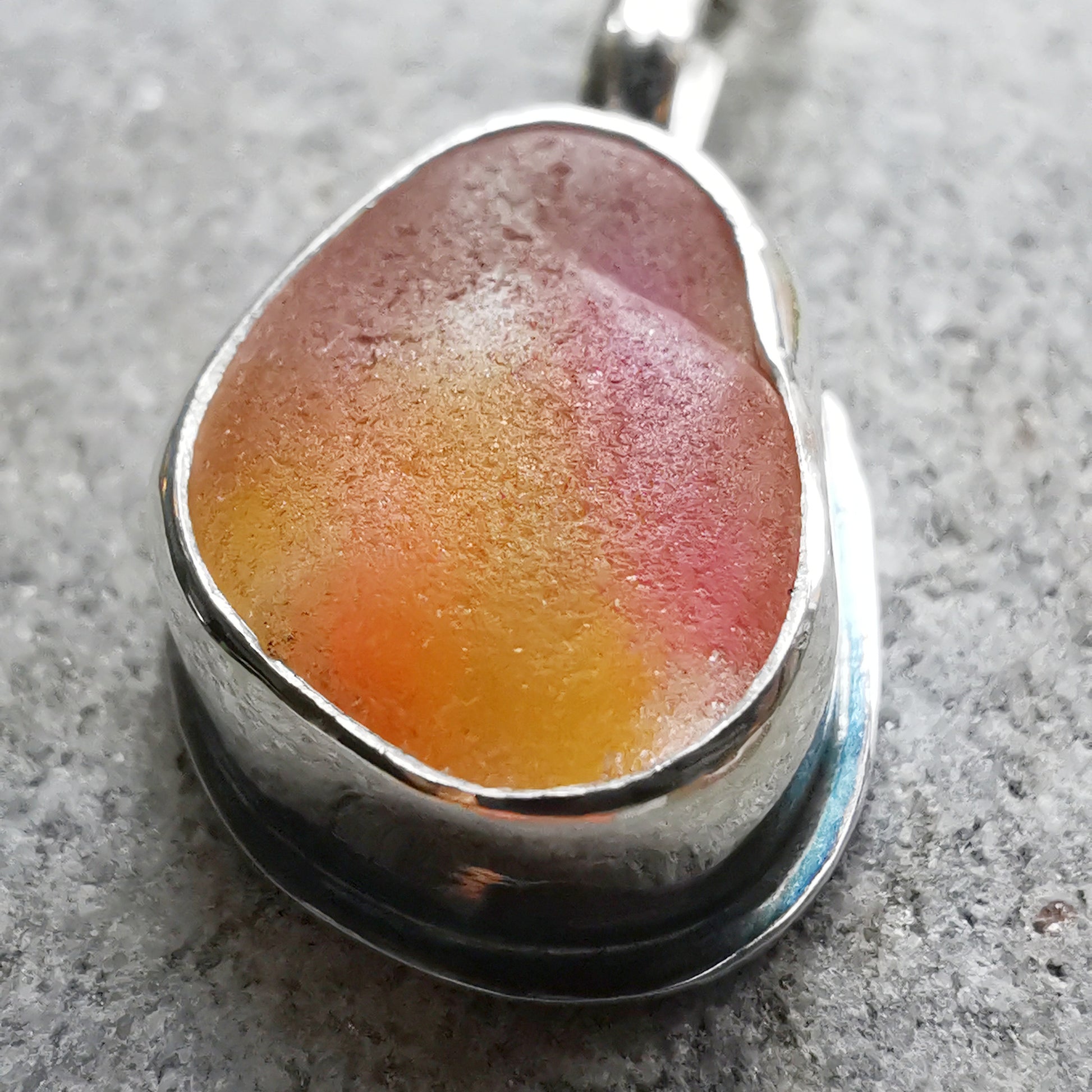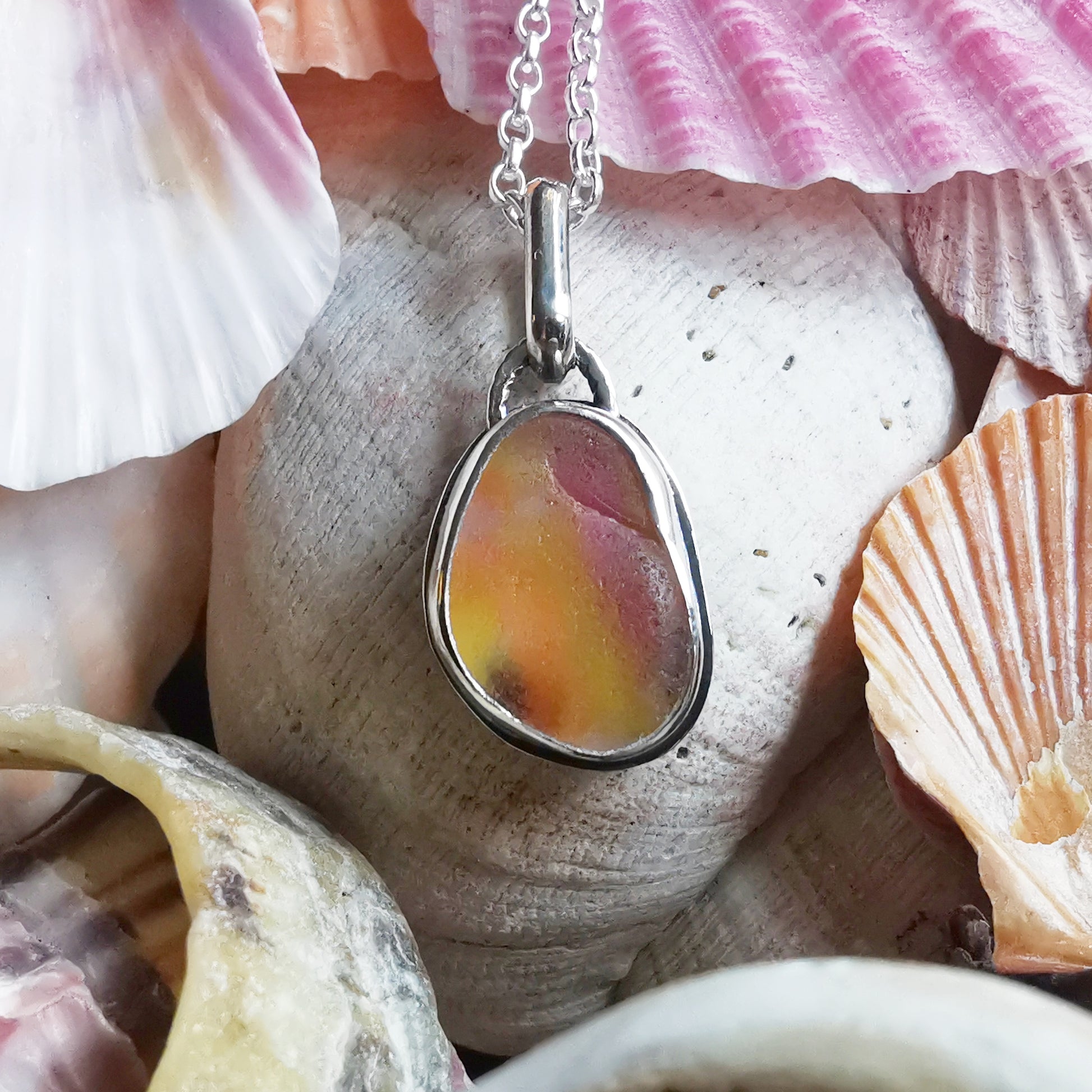 Scottish pink and yellow multicoloured sea glass & sterling silver pendant.