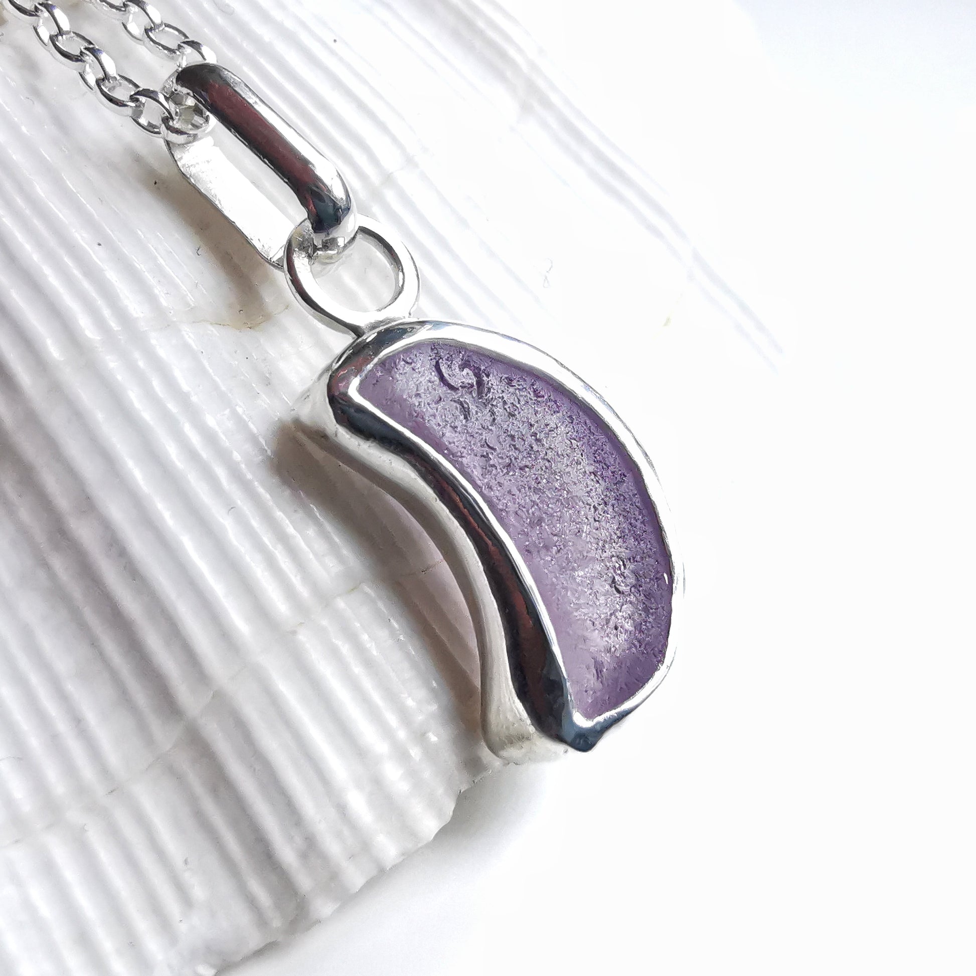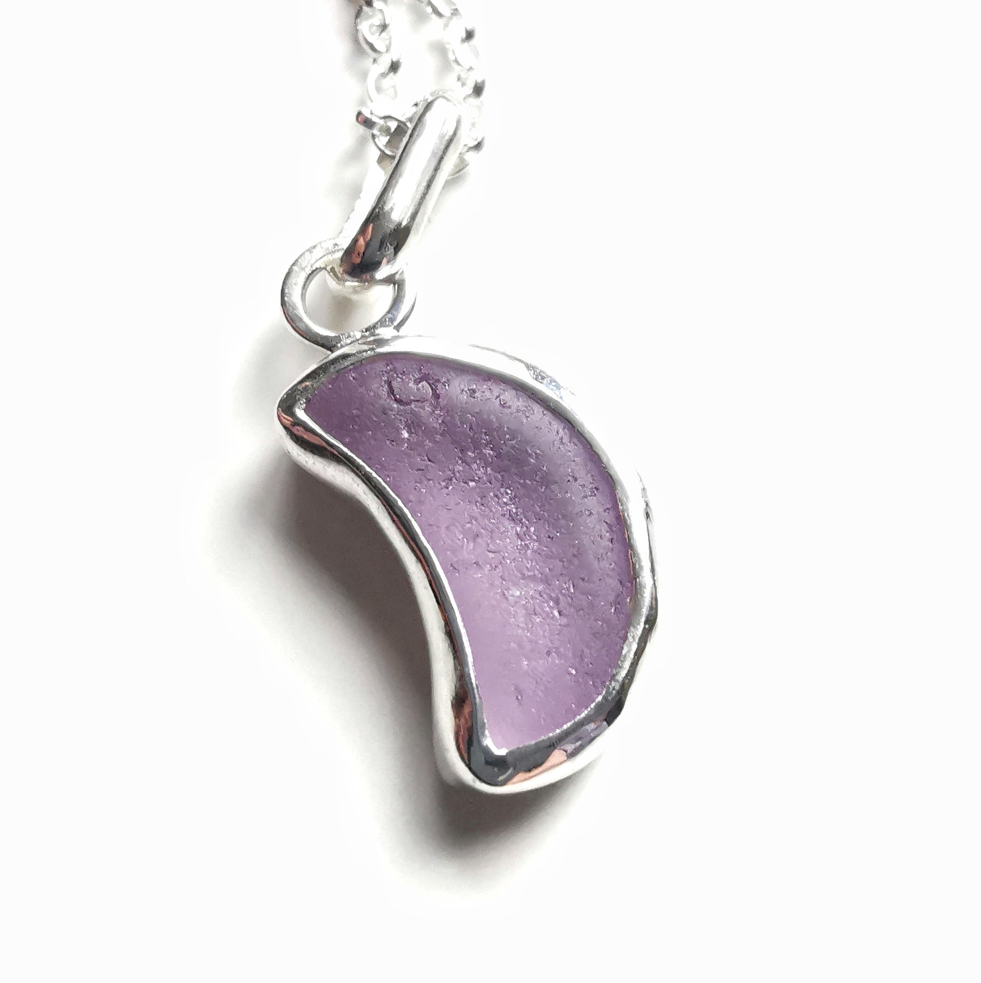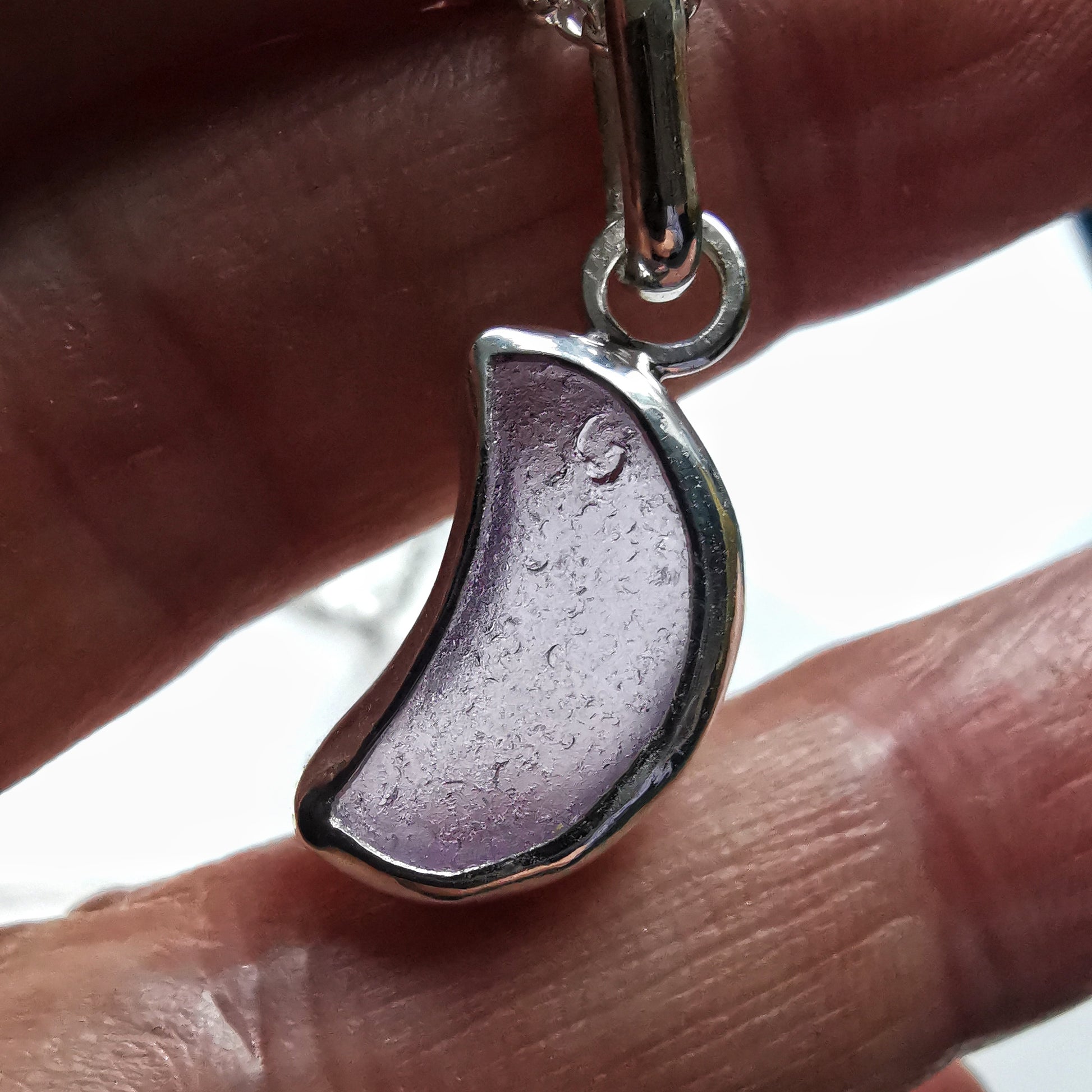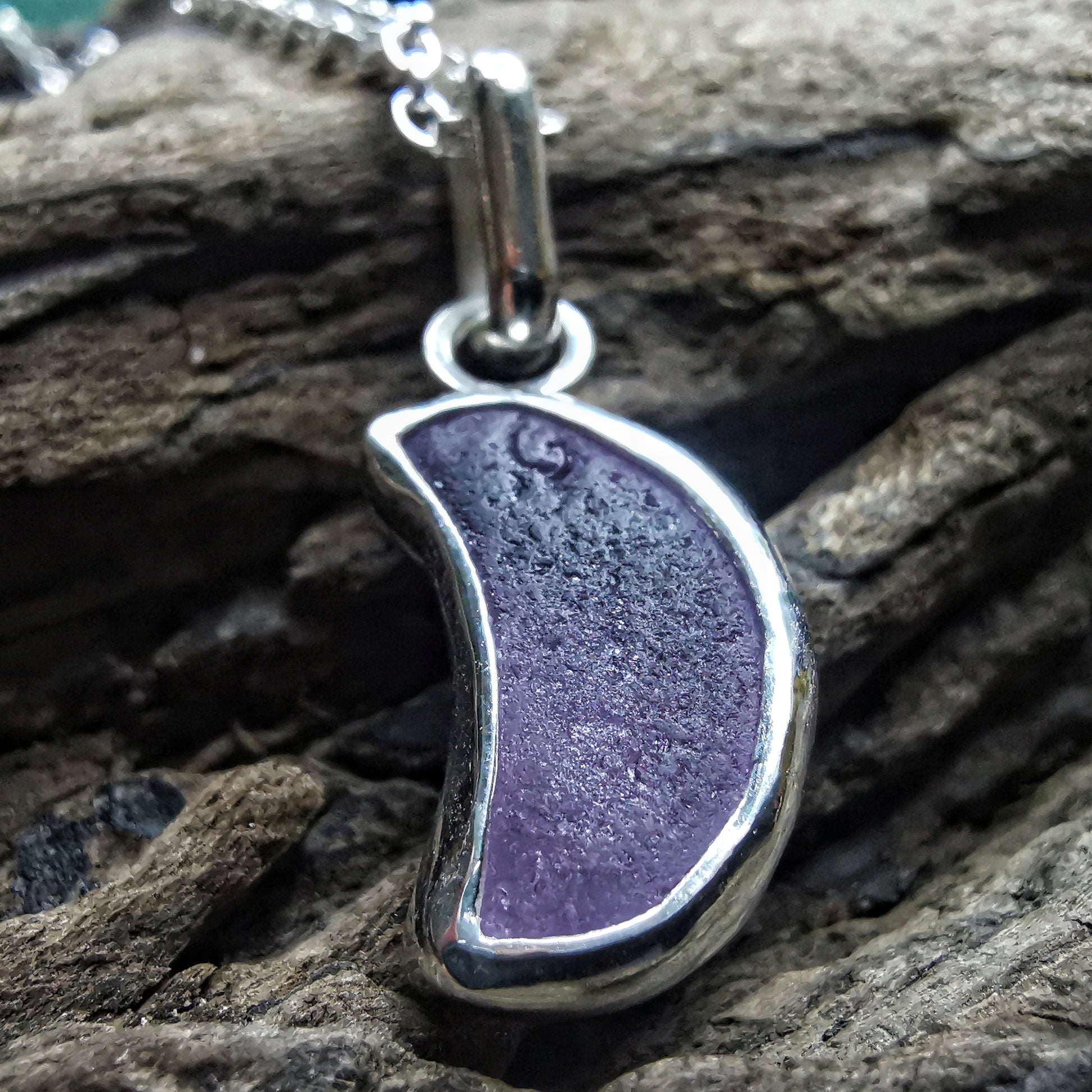 Scottish purple crescent moon sea glass & sterling silver pendant.