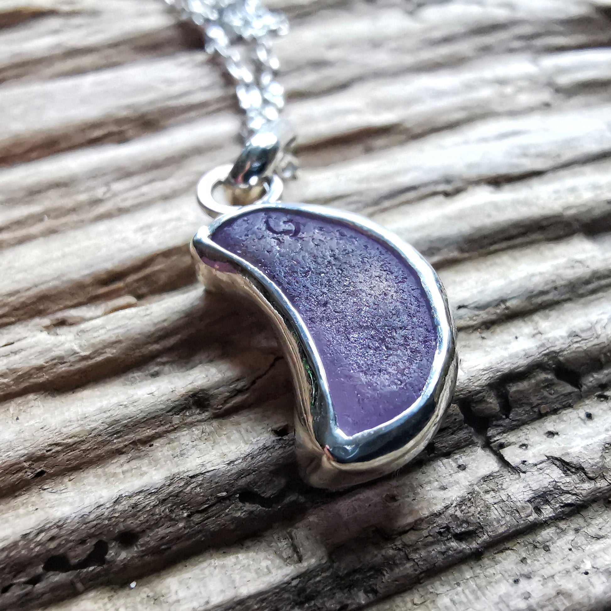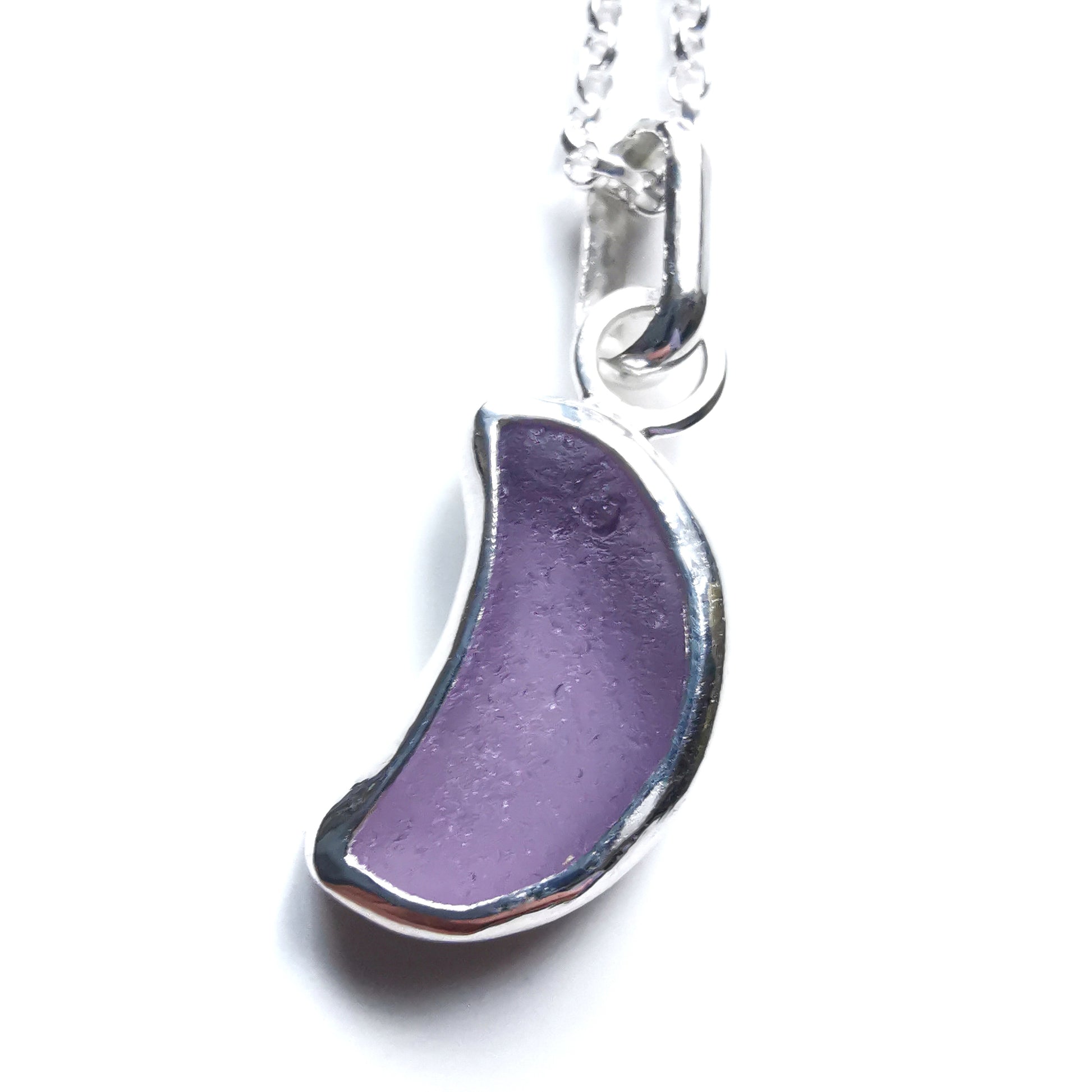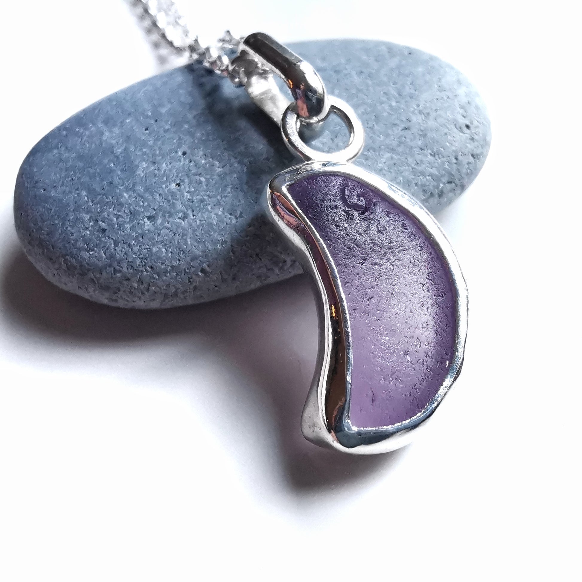 Scottish purple crescent moon sea glass & sterling silver pendant.