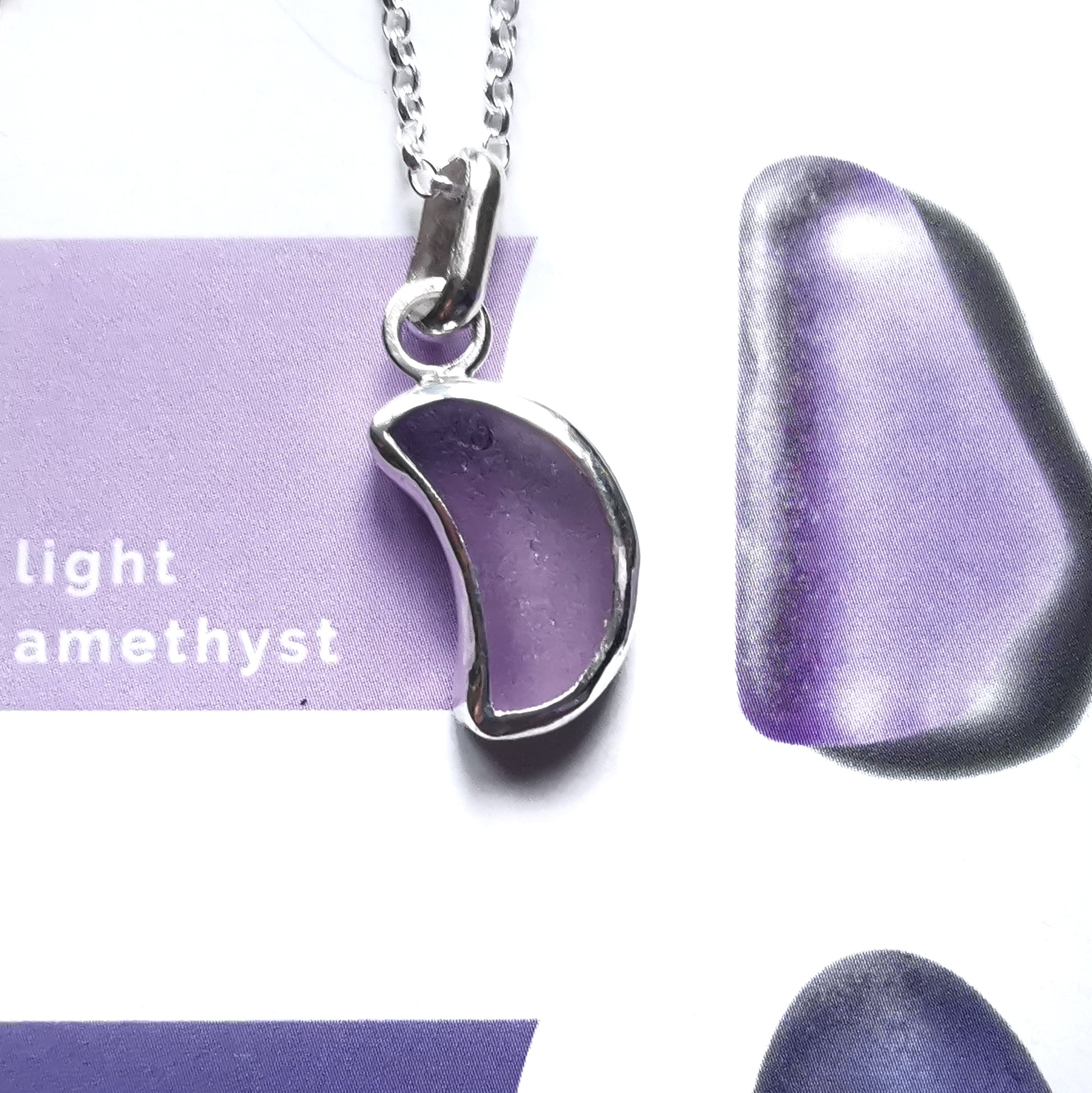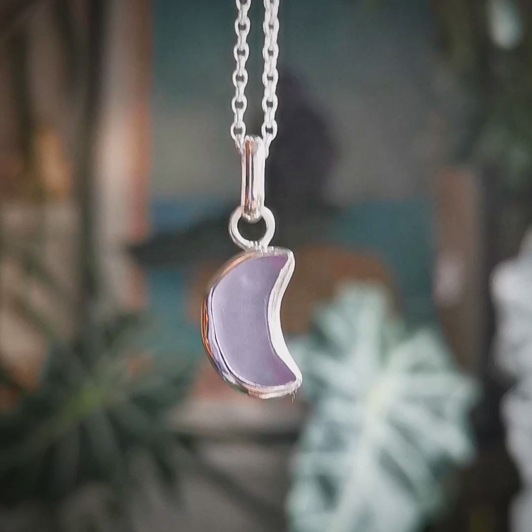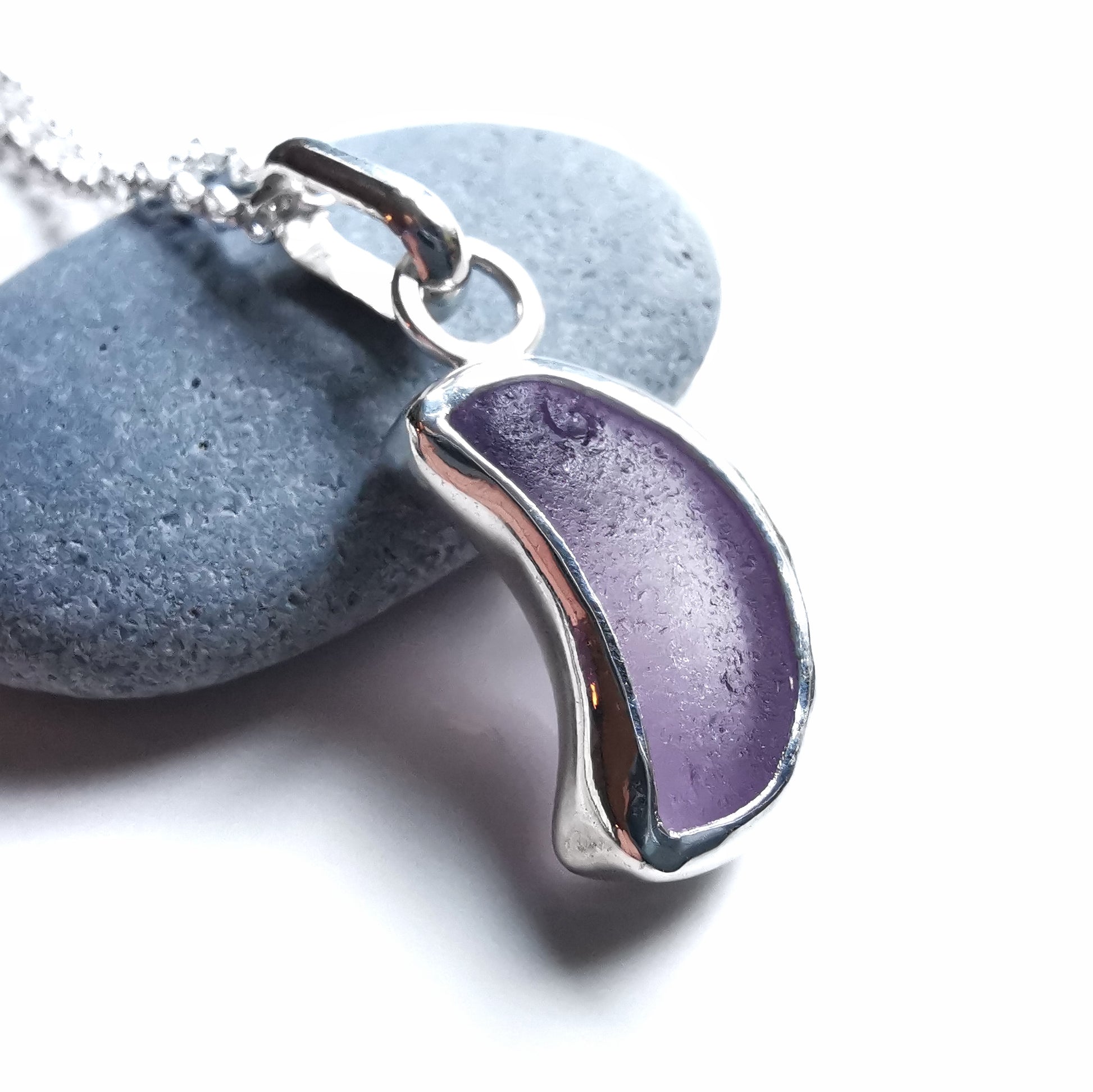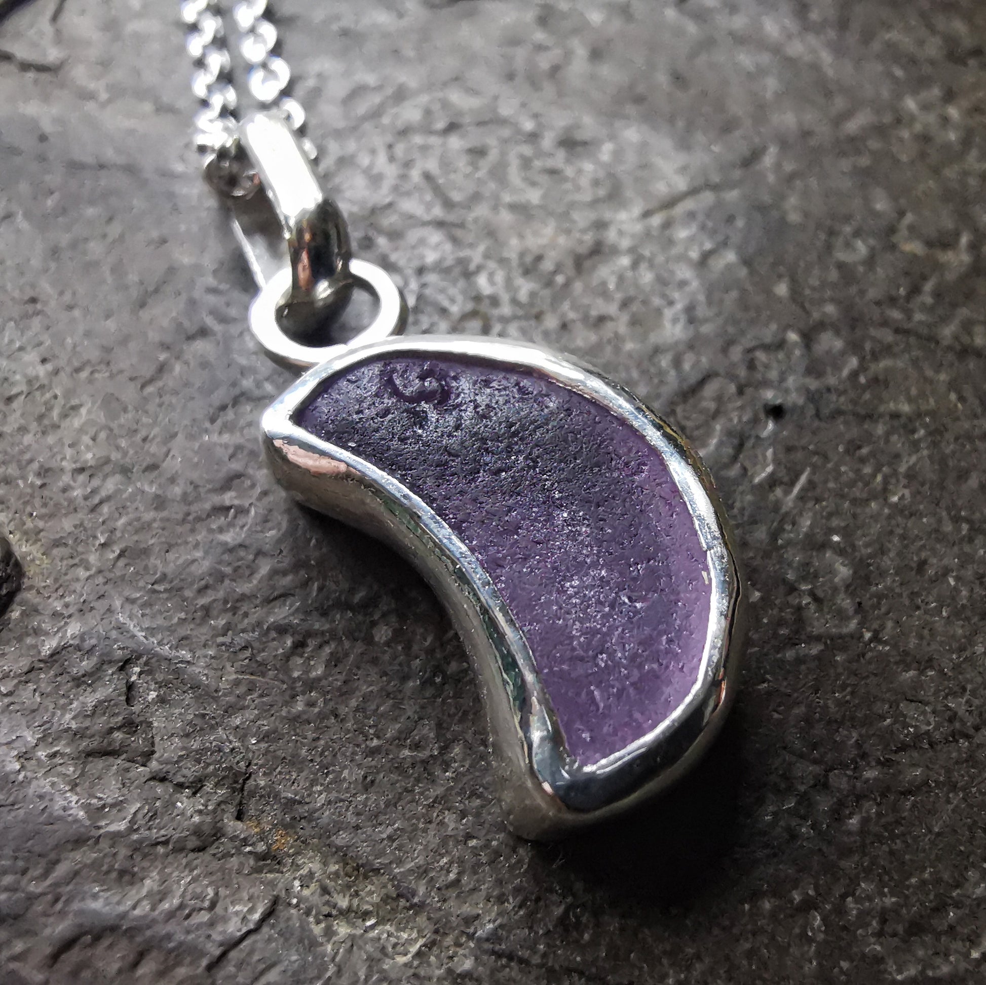Scottish purple crescent moon sea glass & sterling silver pendant.