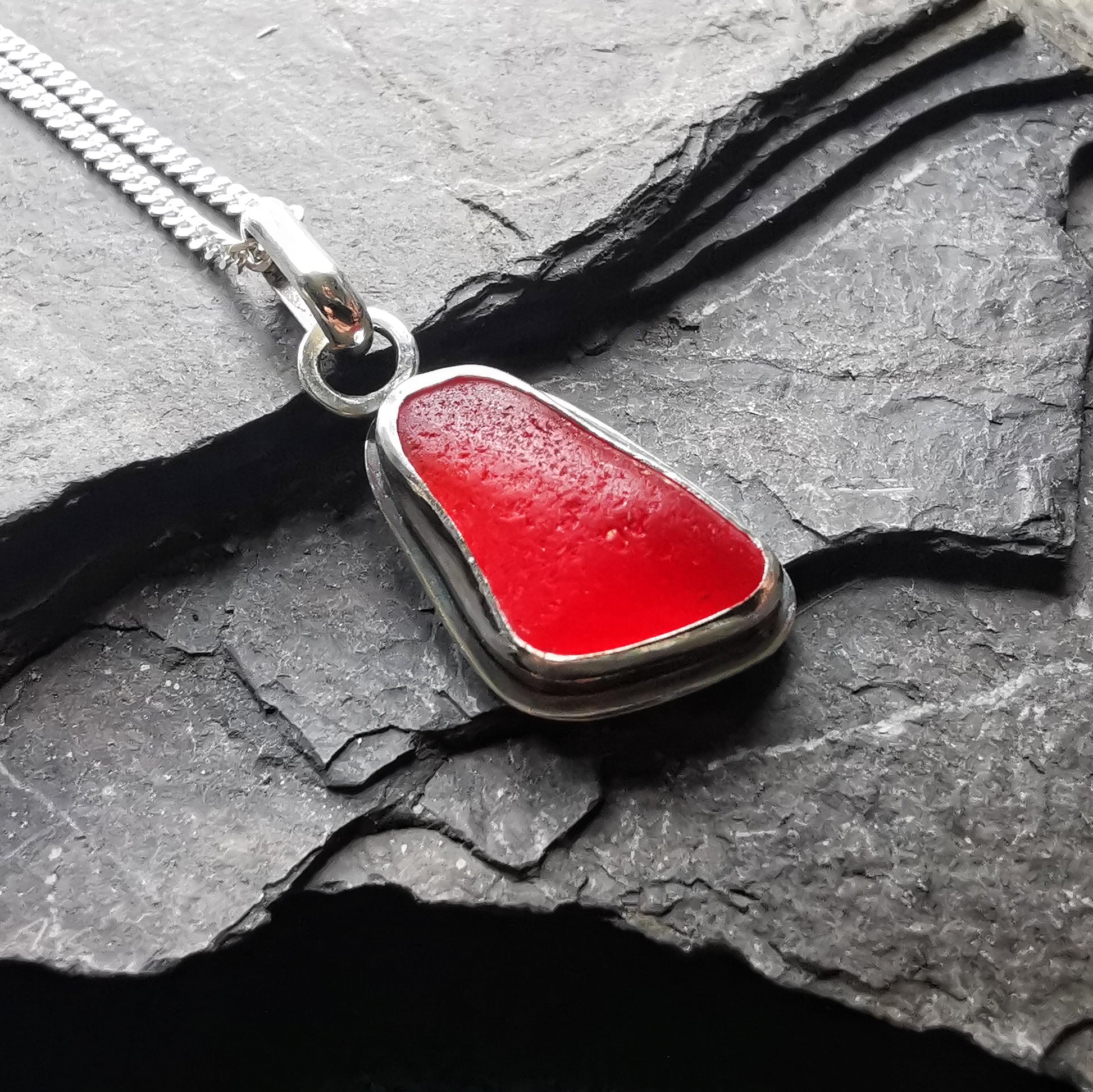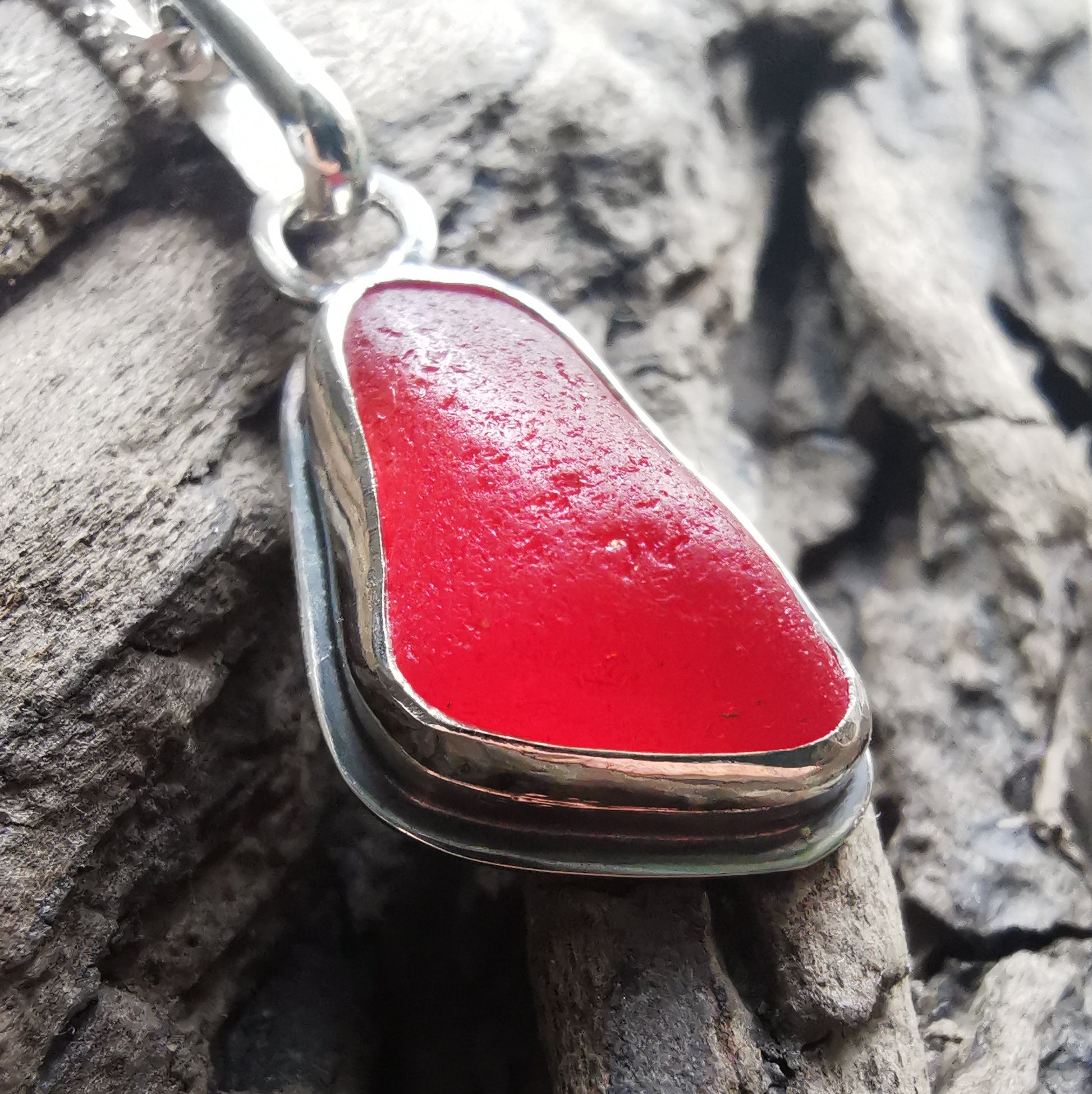 One of a kind pendant composed with genuine Scottish UV red sea glass. The sea glass is set in fine silver bezel, the chain is sterling silver.
