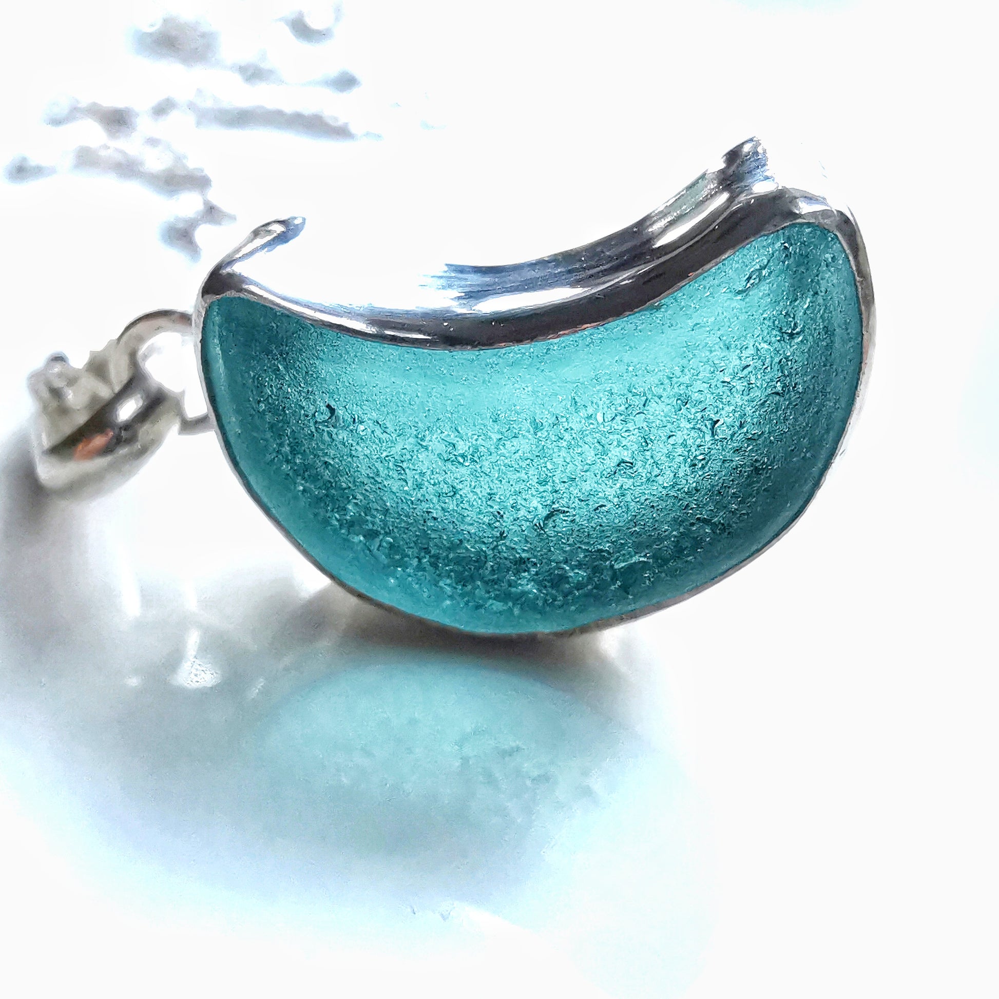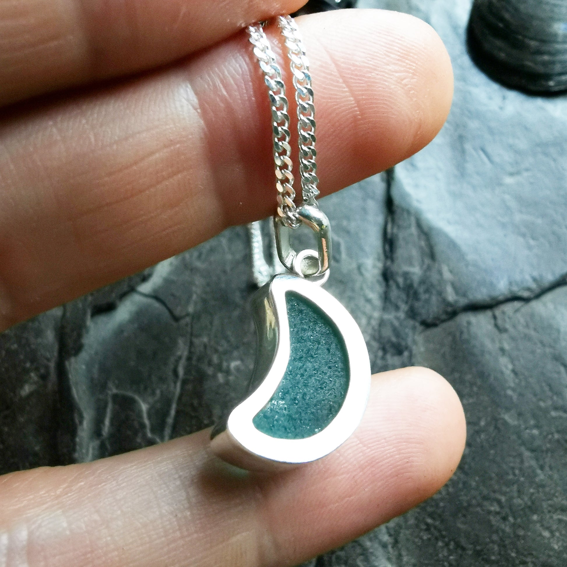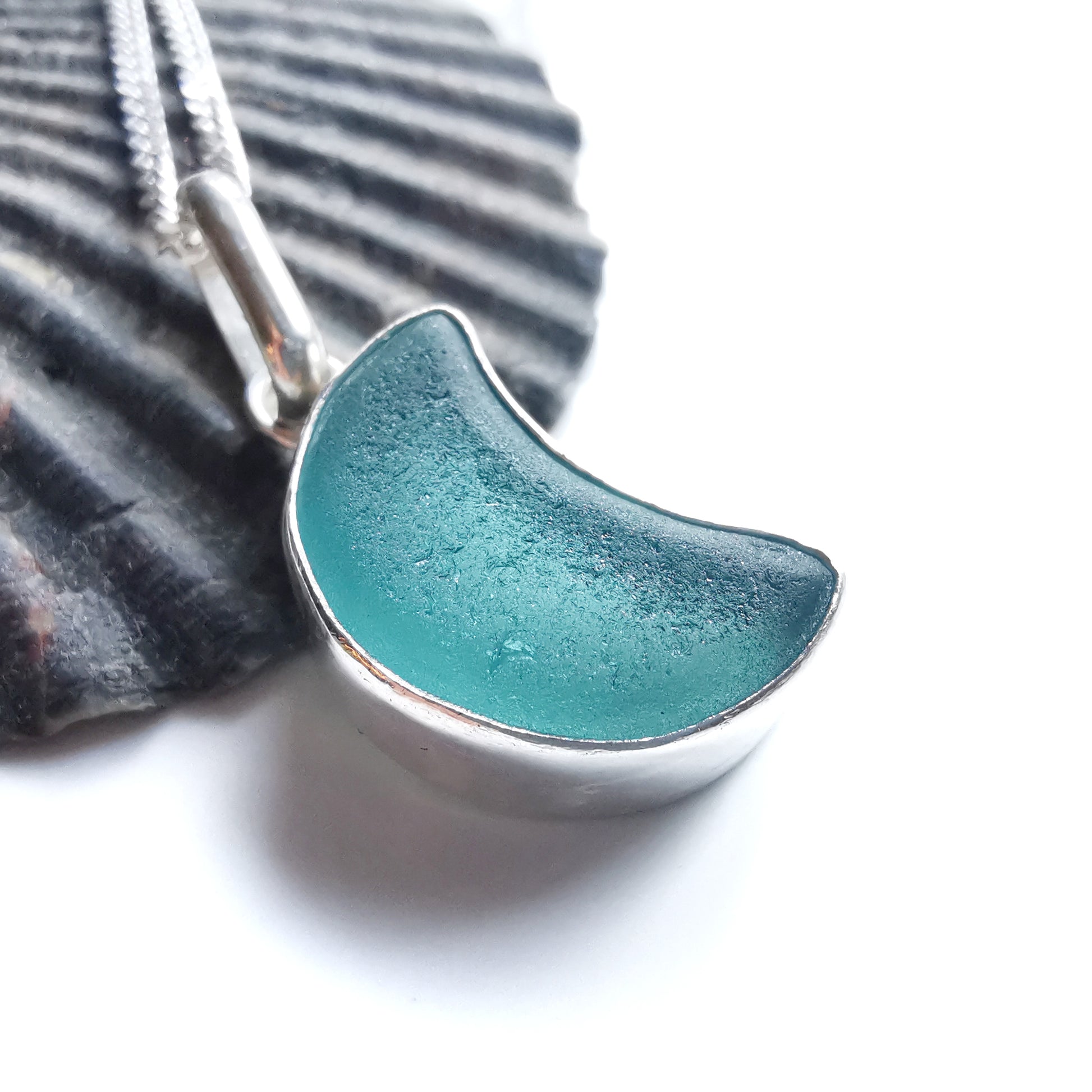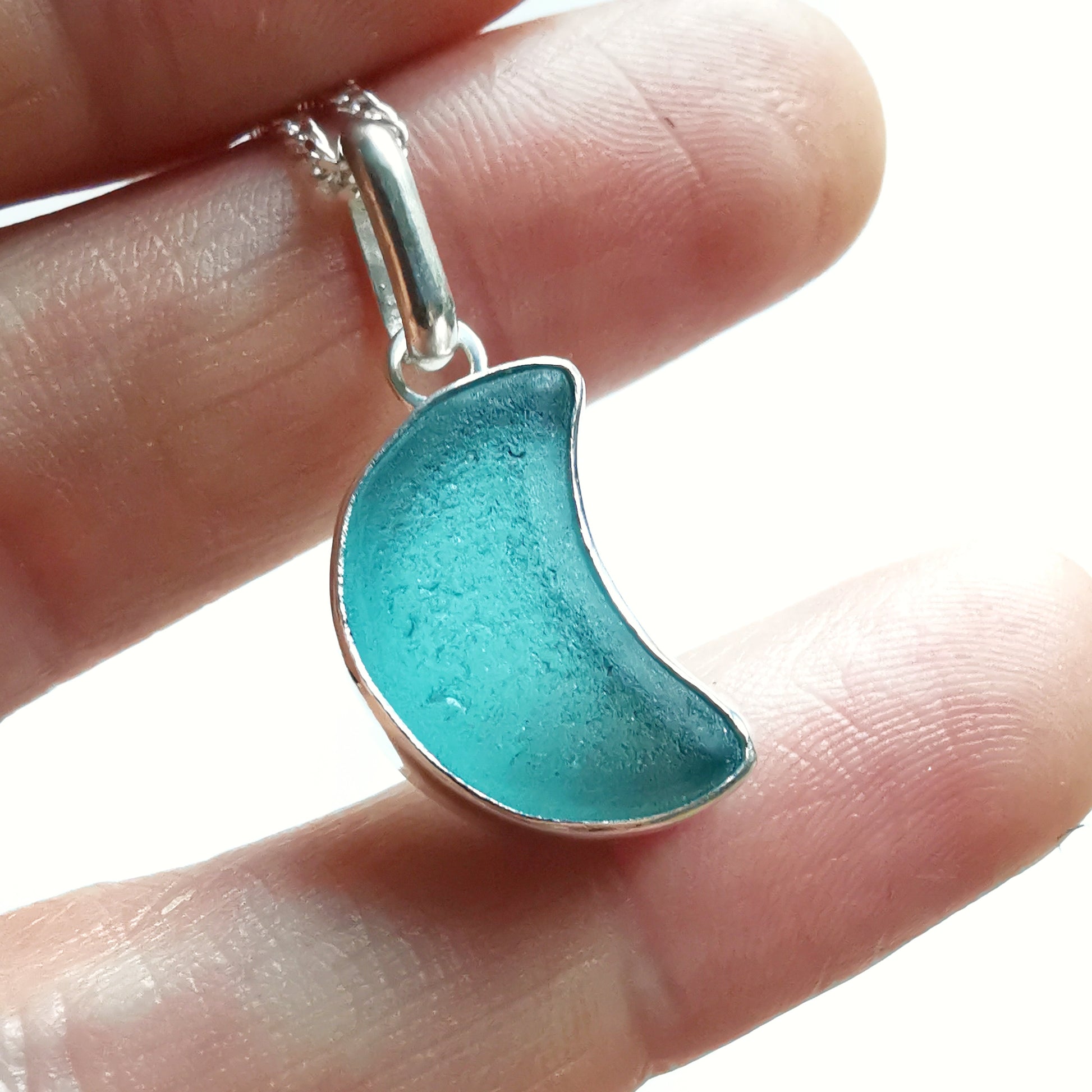 Scottish teal blue crescent moon sea glass & sterling silver pendant.