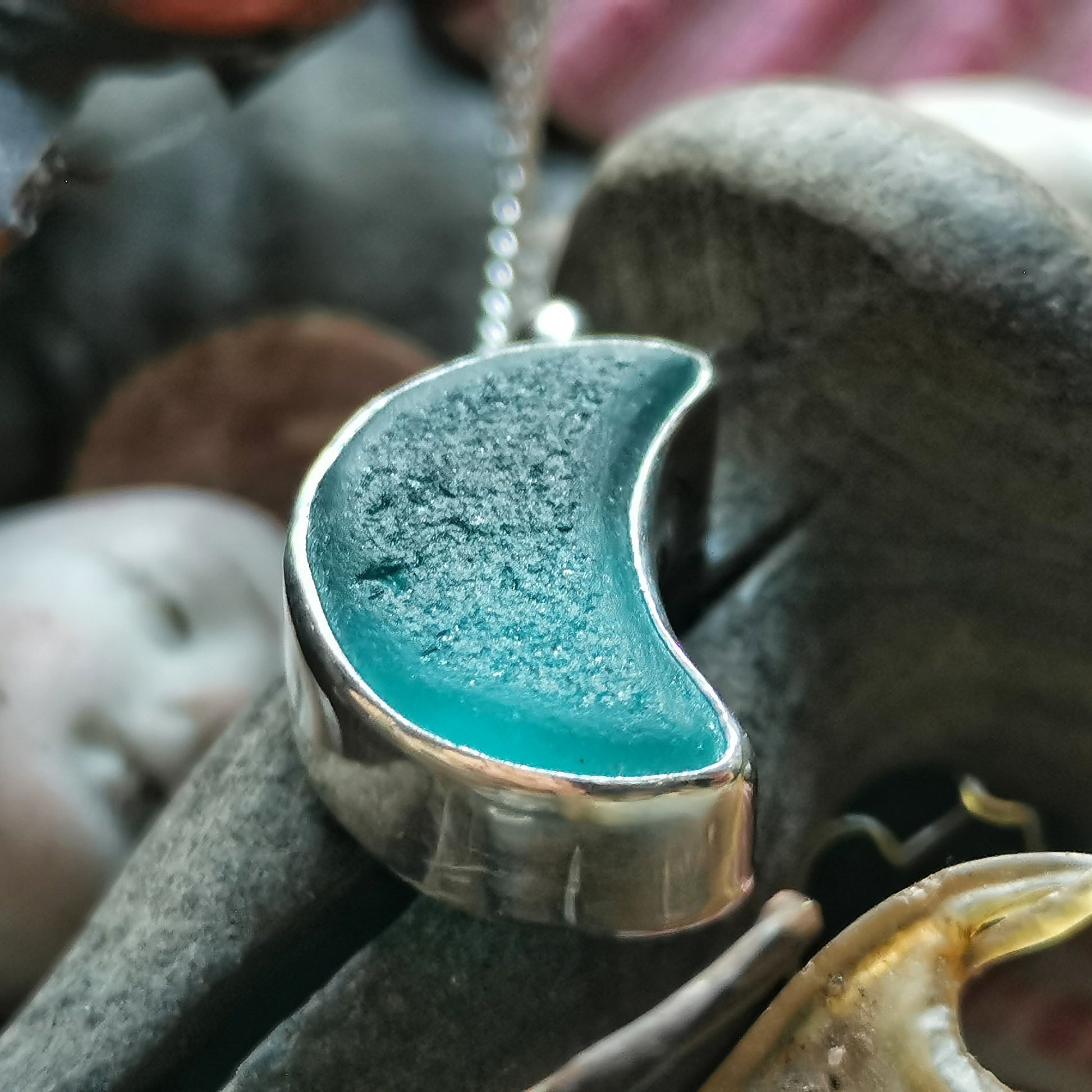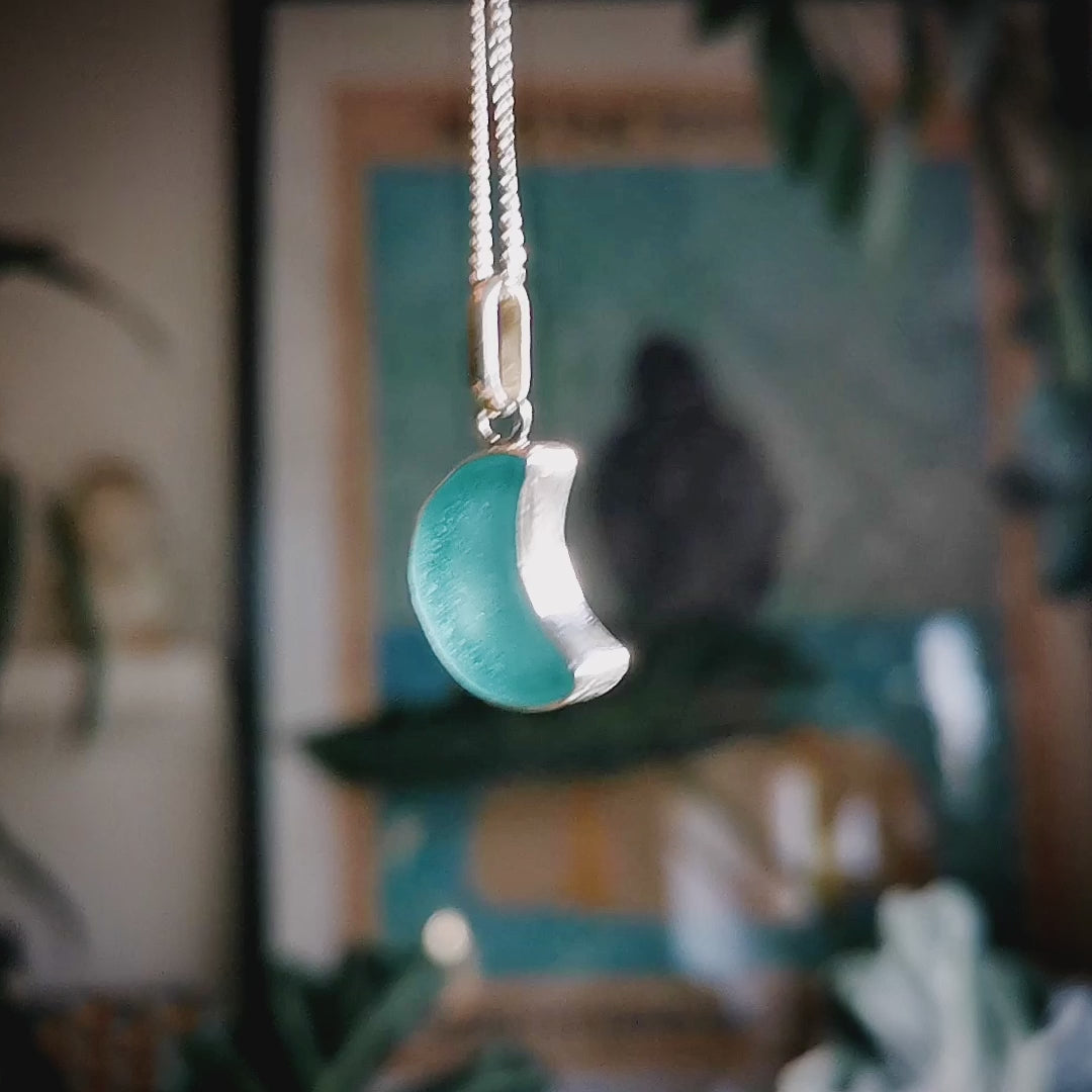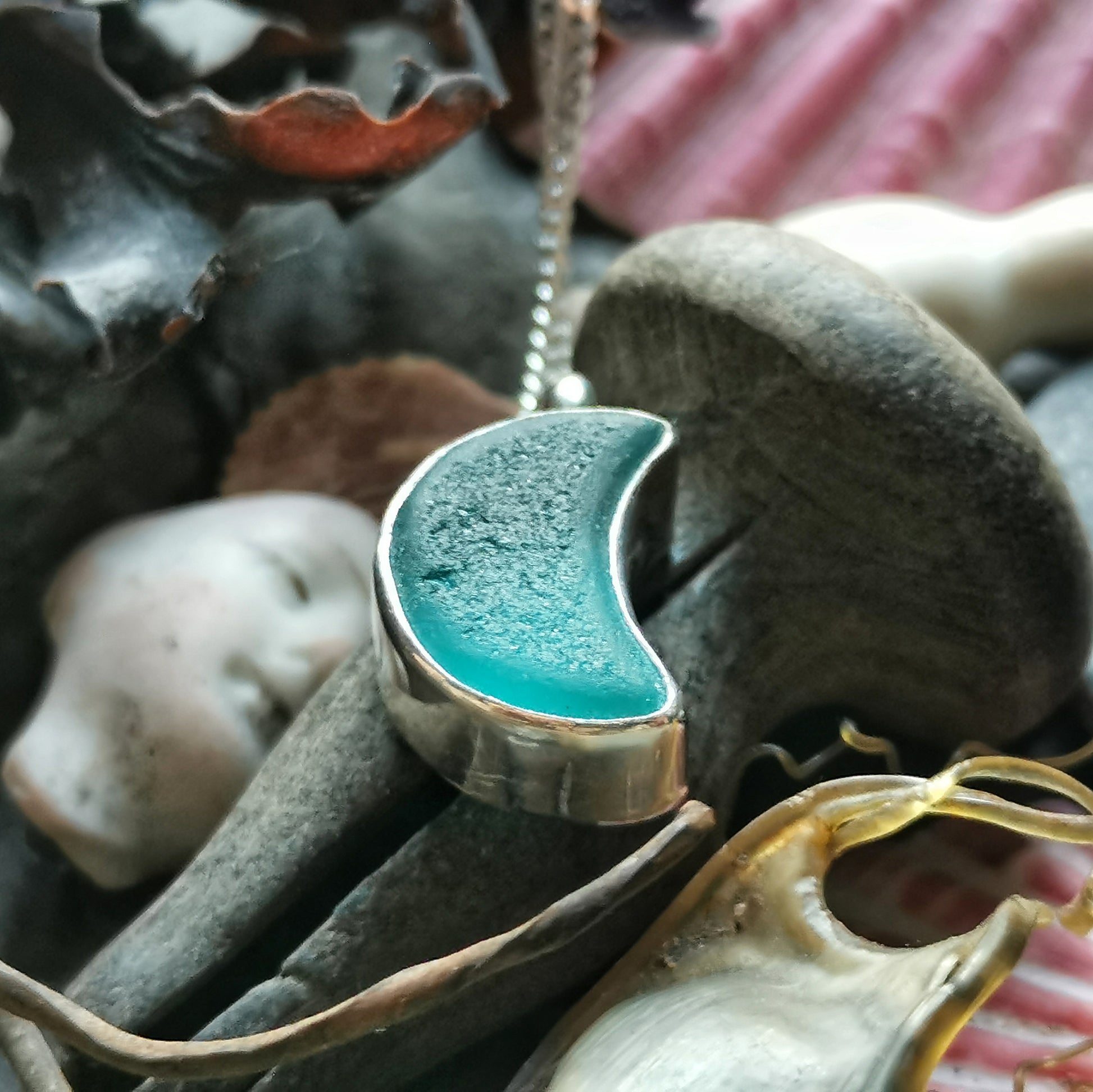 Scottish teal blue crescent moon sea glass & sterling silver pendant.