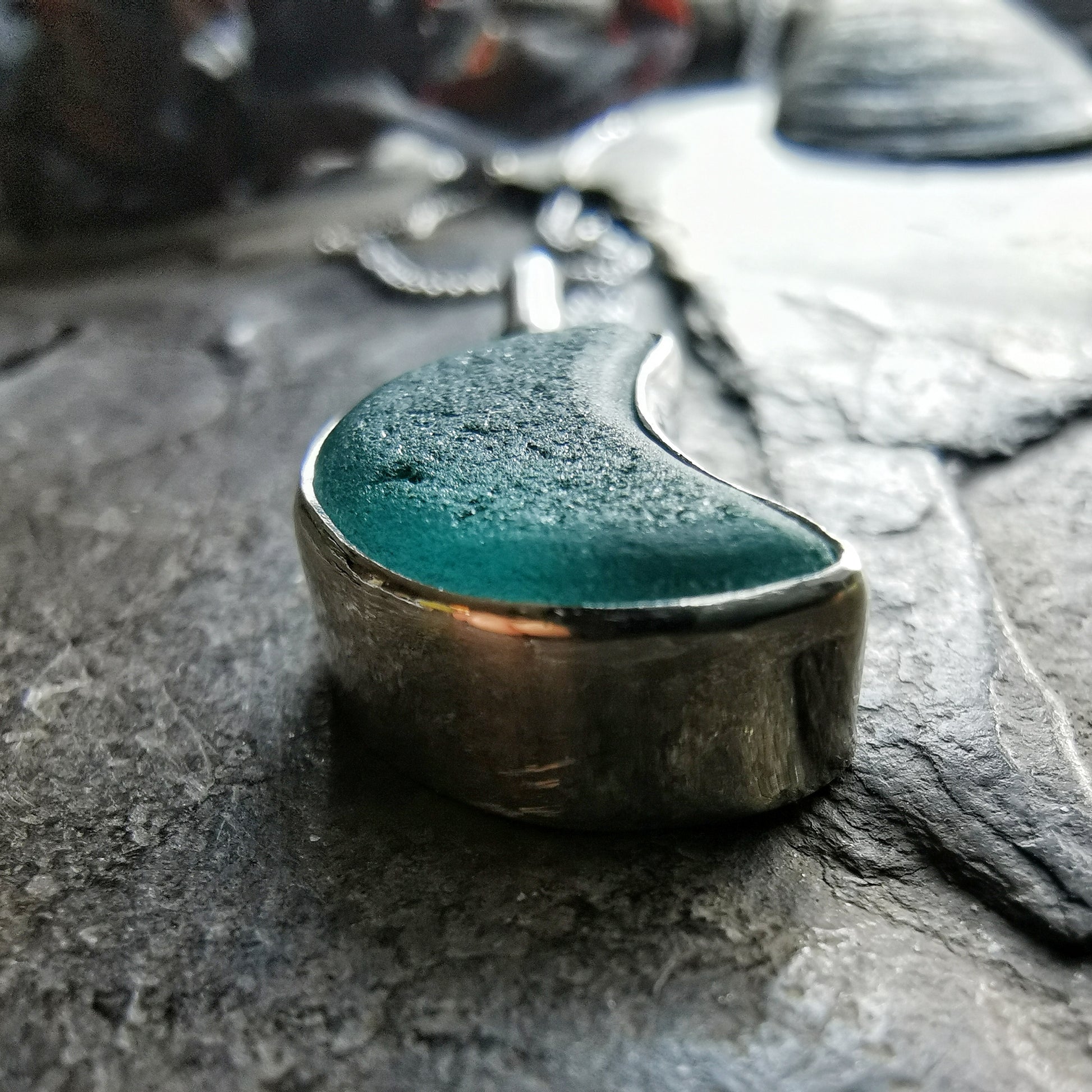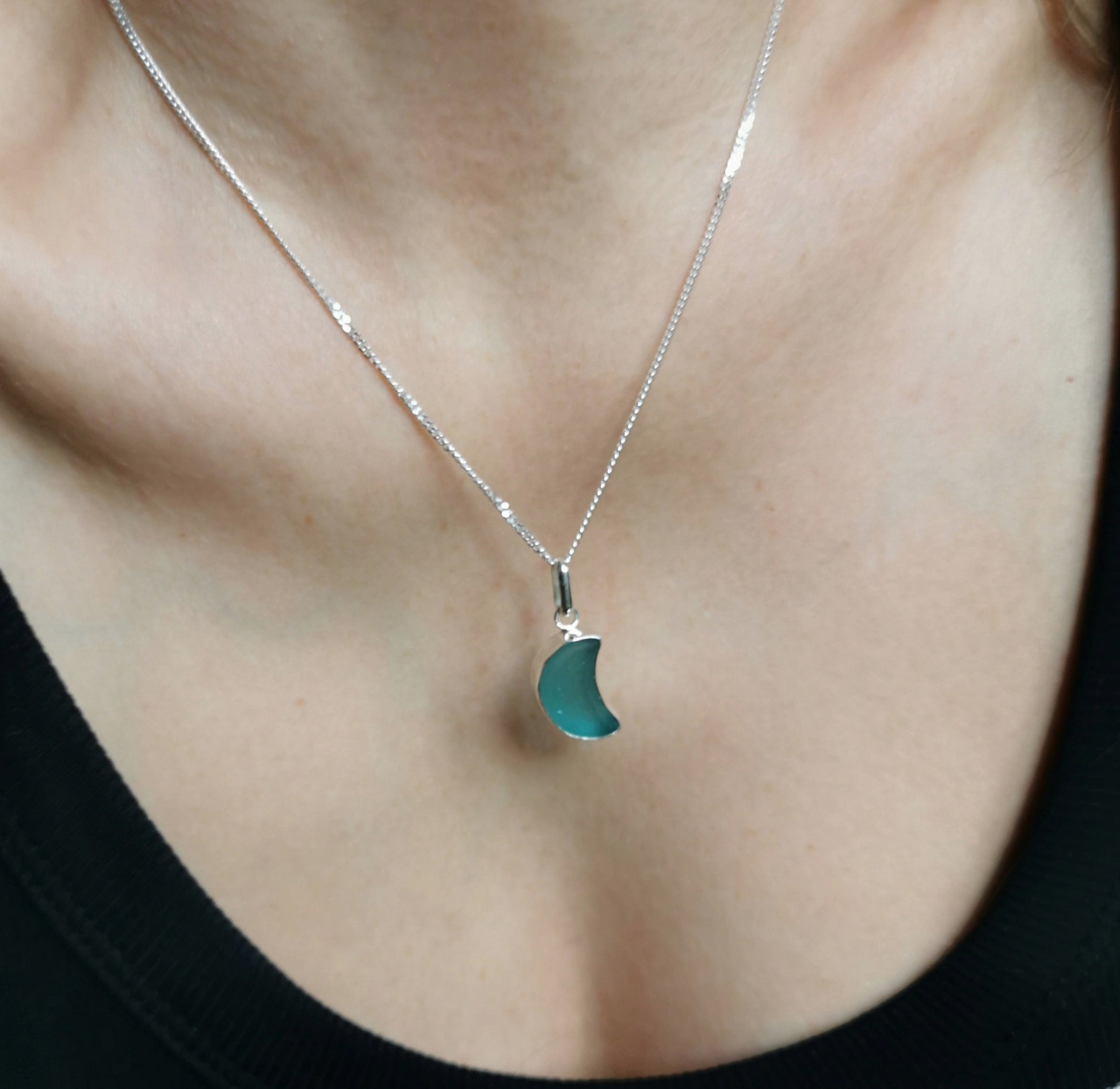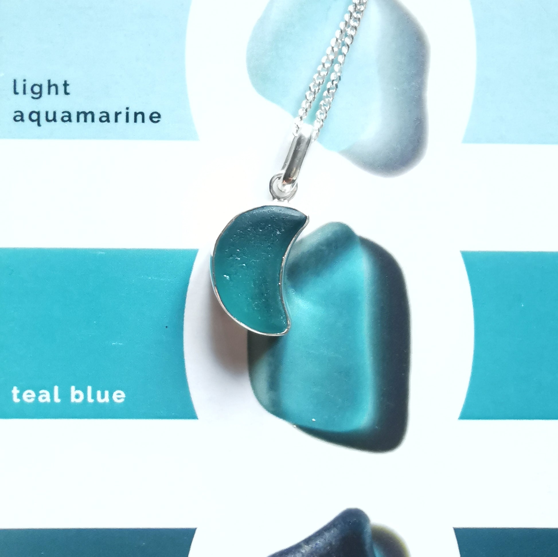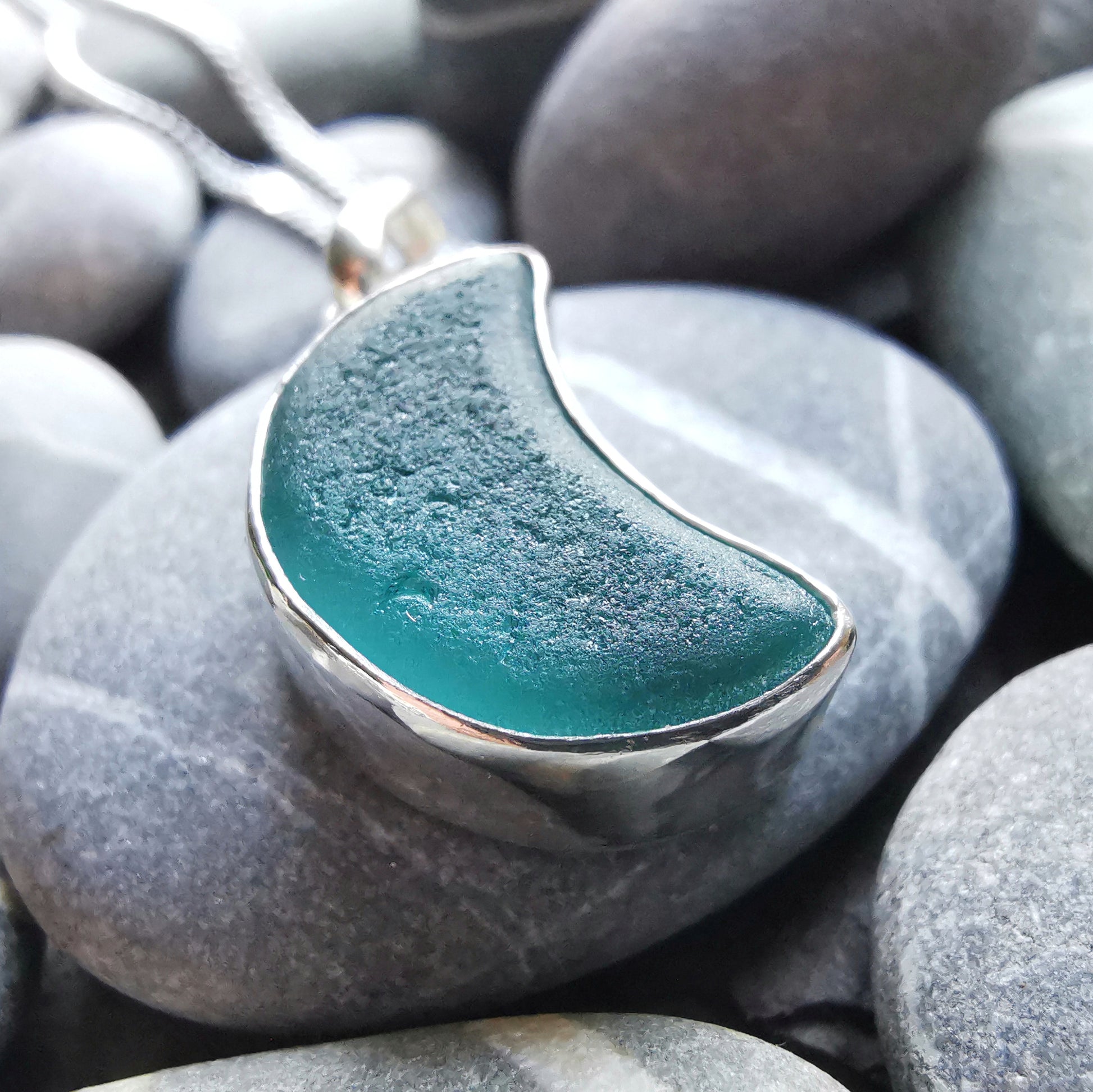 Scottish teal blue crescent moon sea glass & sterling silver pendant.