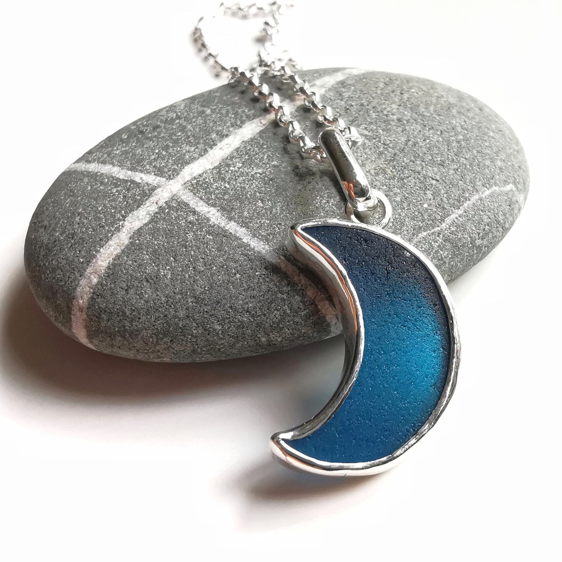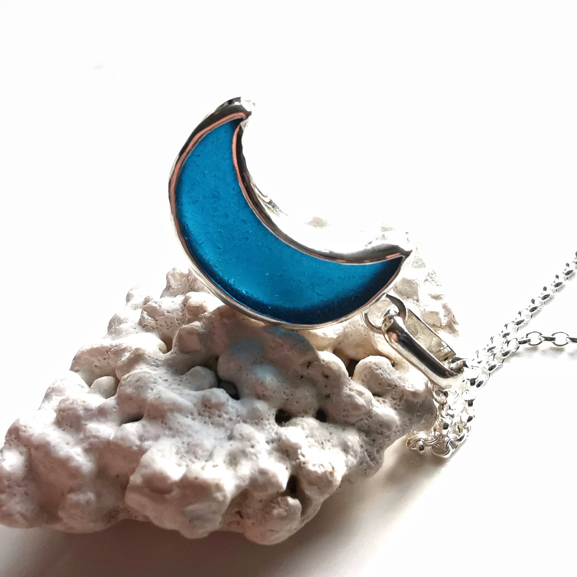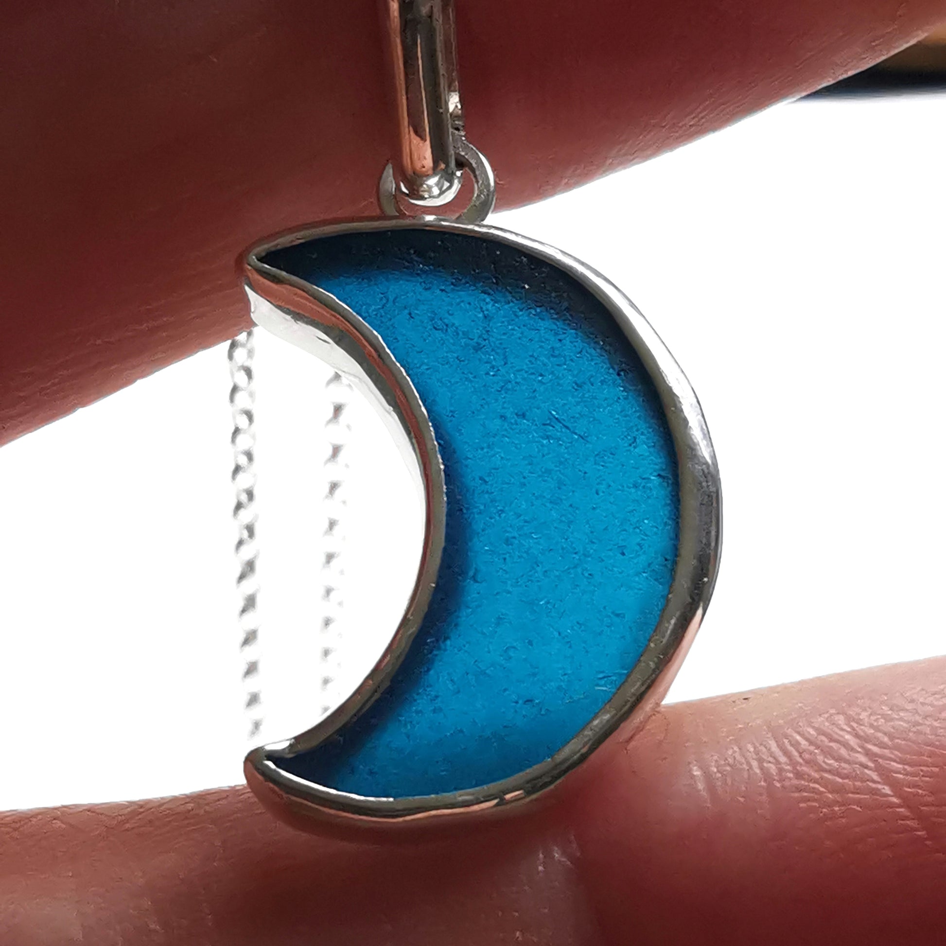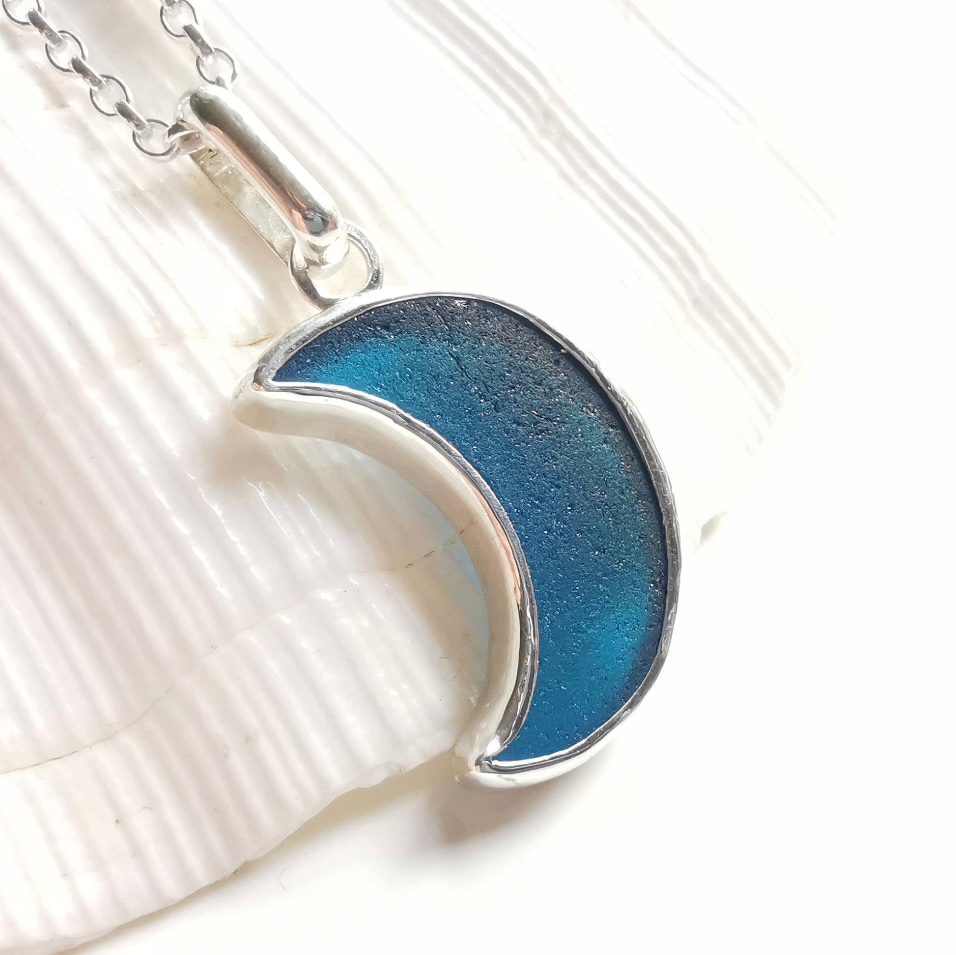 Scottish teal blue crescent moon sea glass & sterling silver pendant.