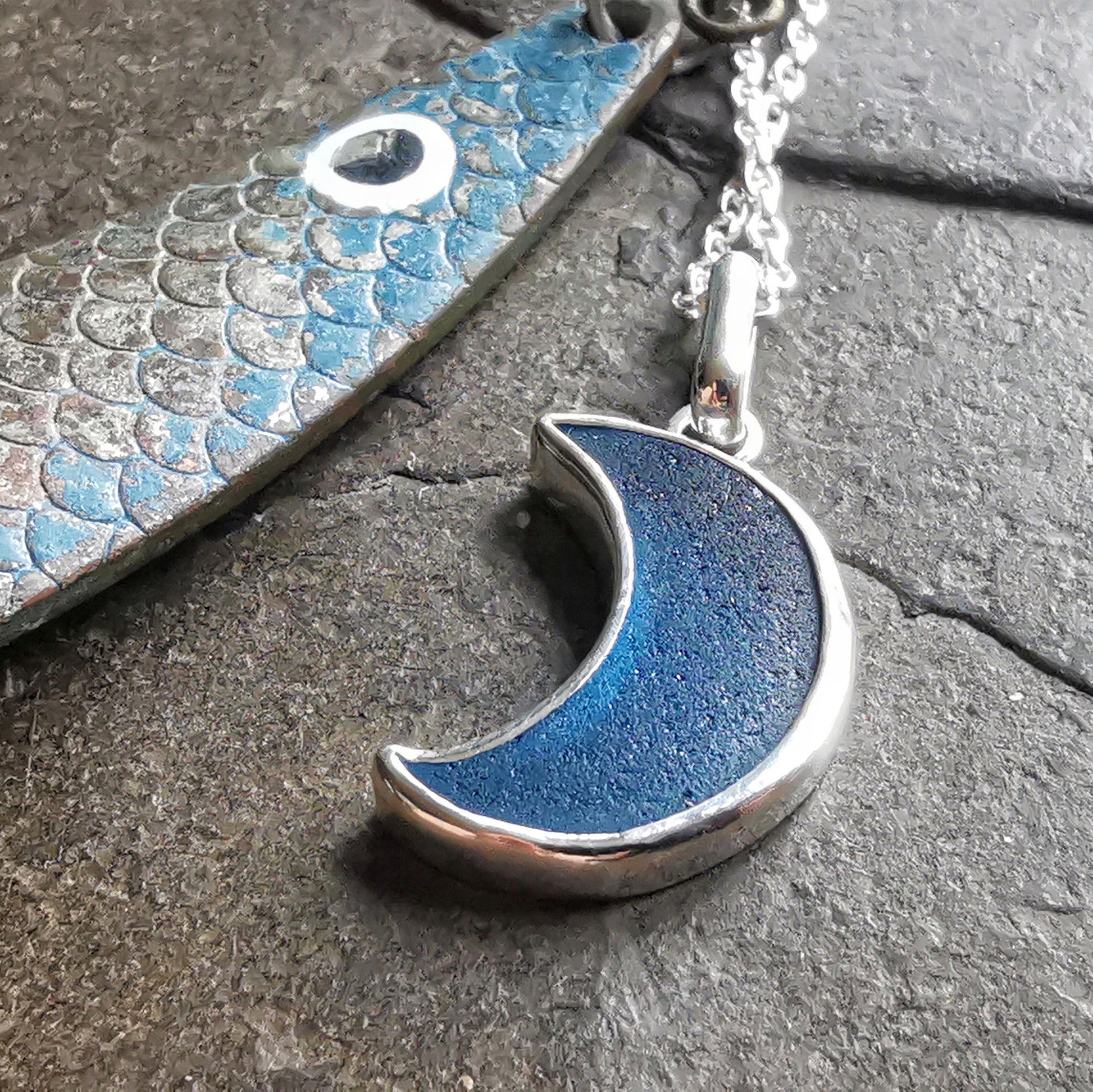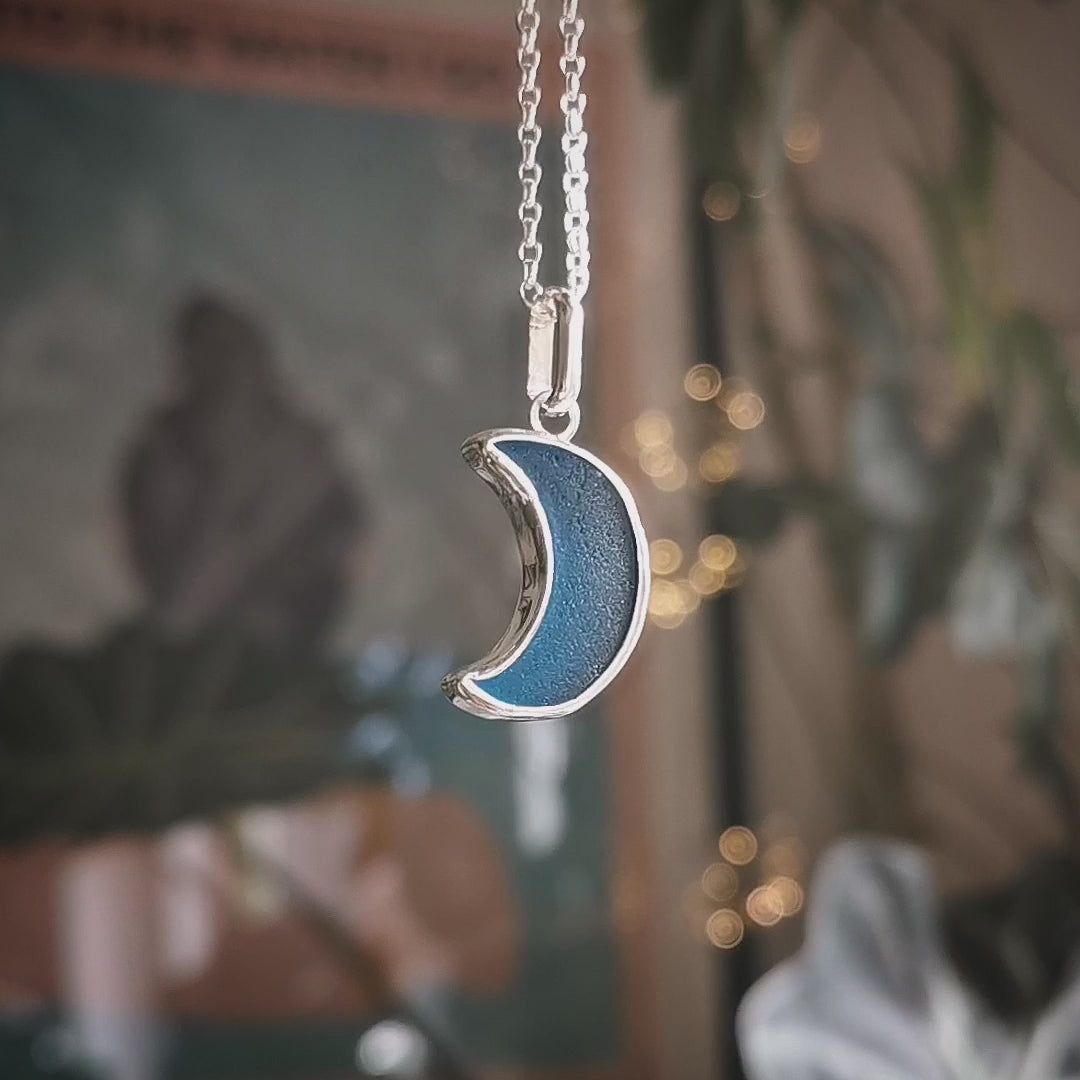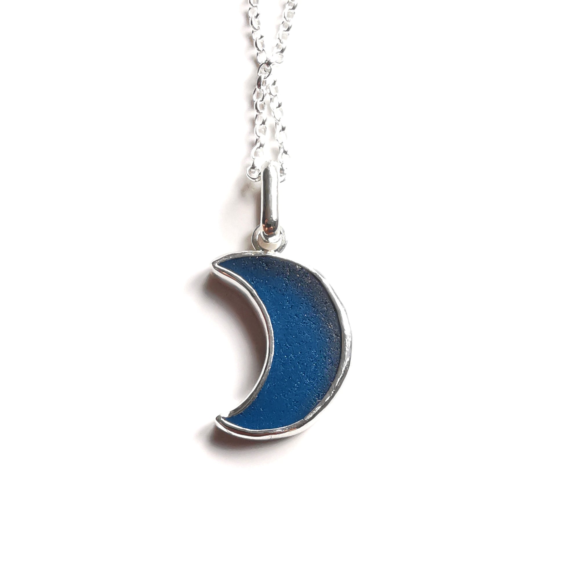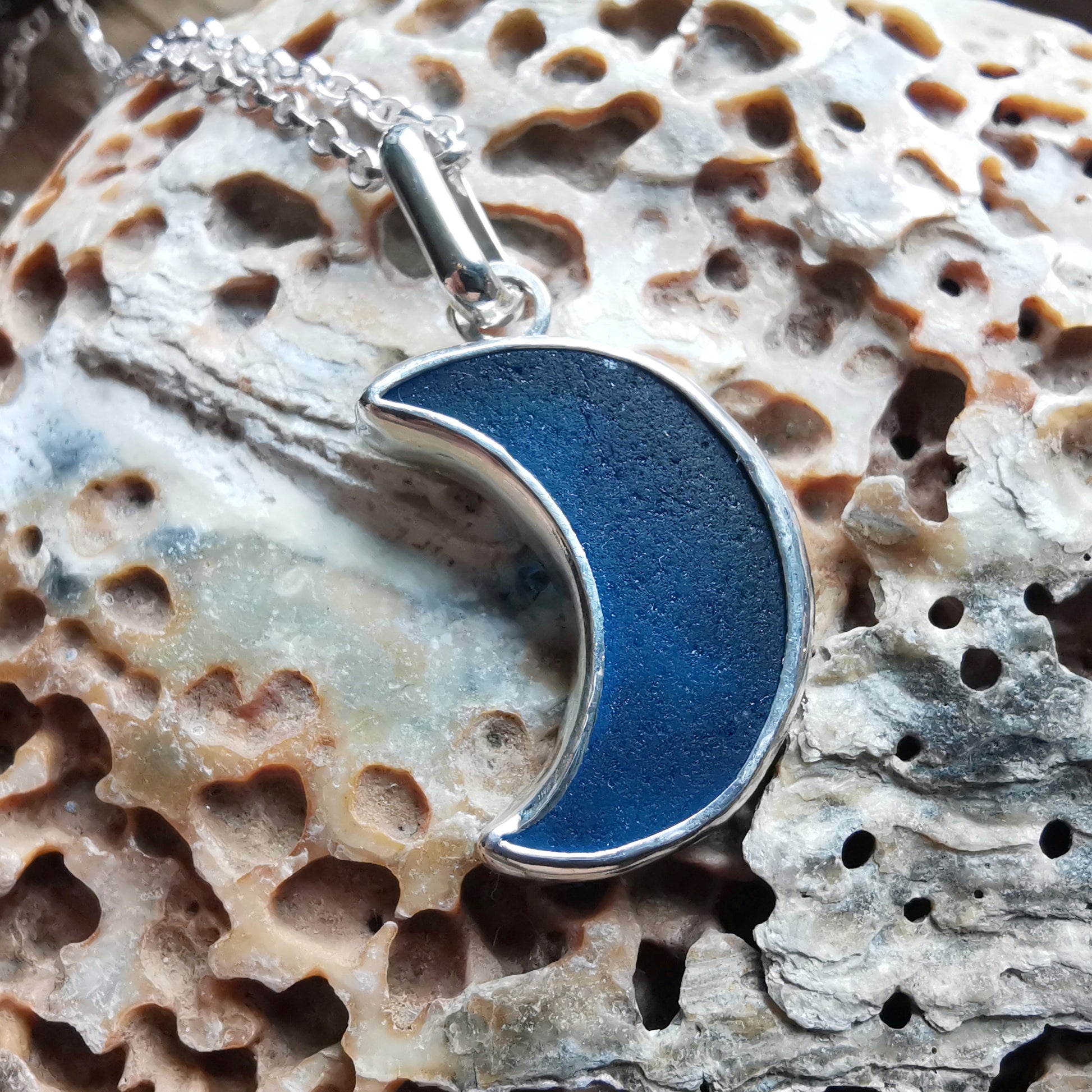 Scottish teal blue crescent moon sea glass & sterling silver pendant.