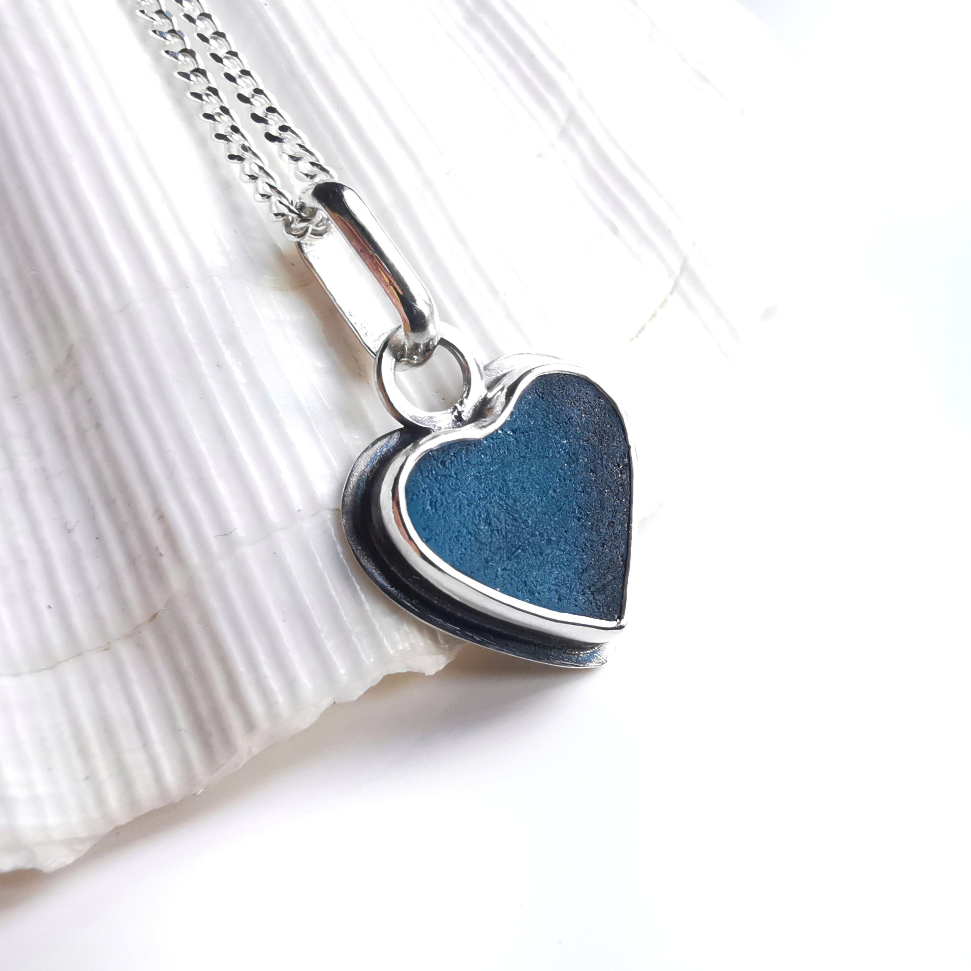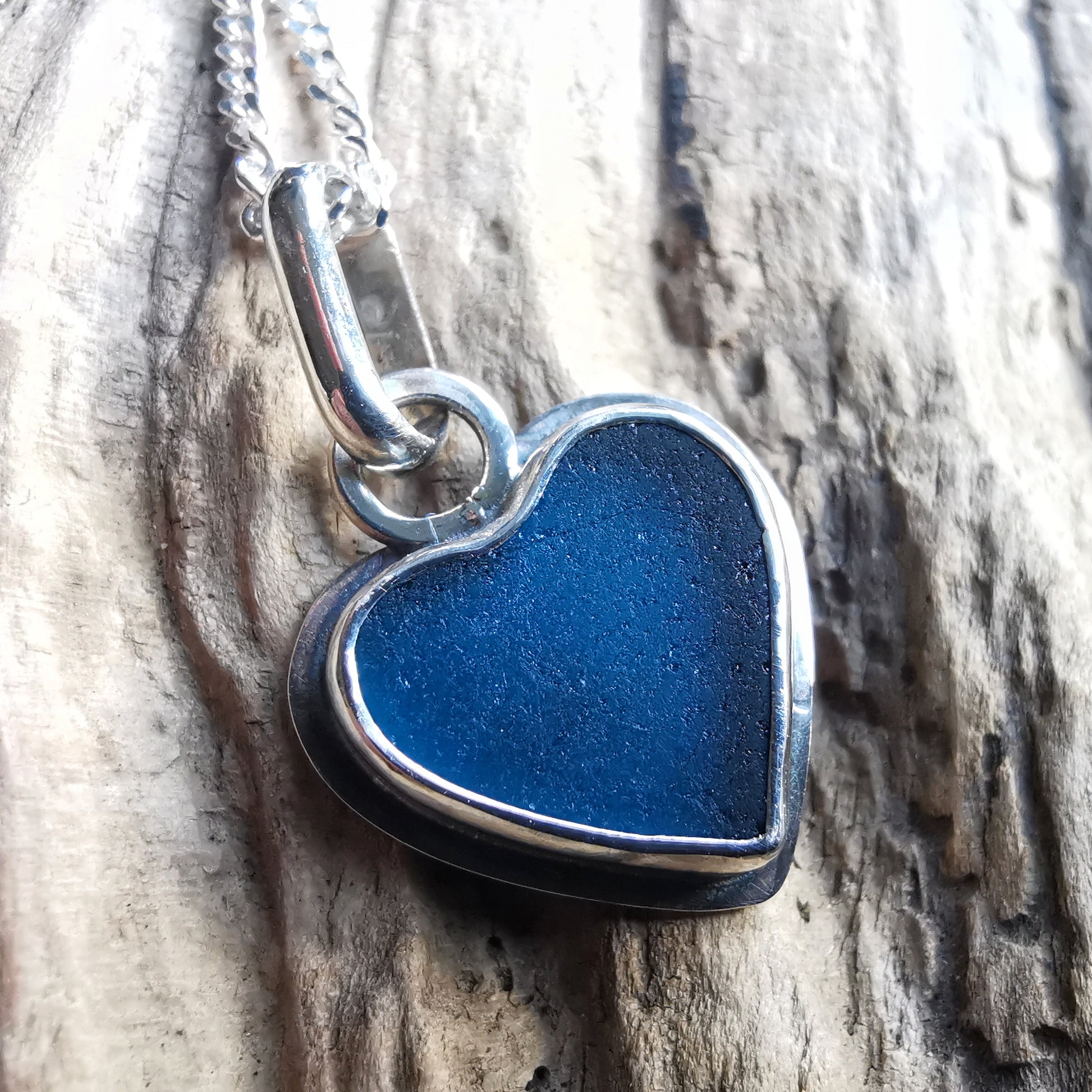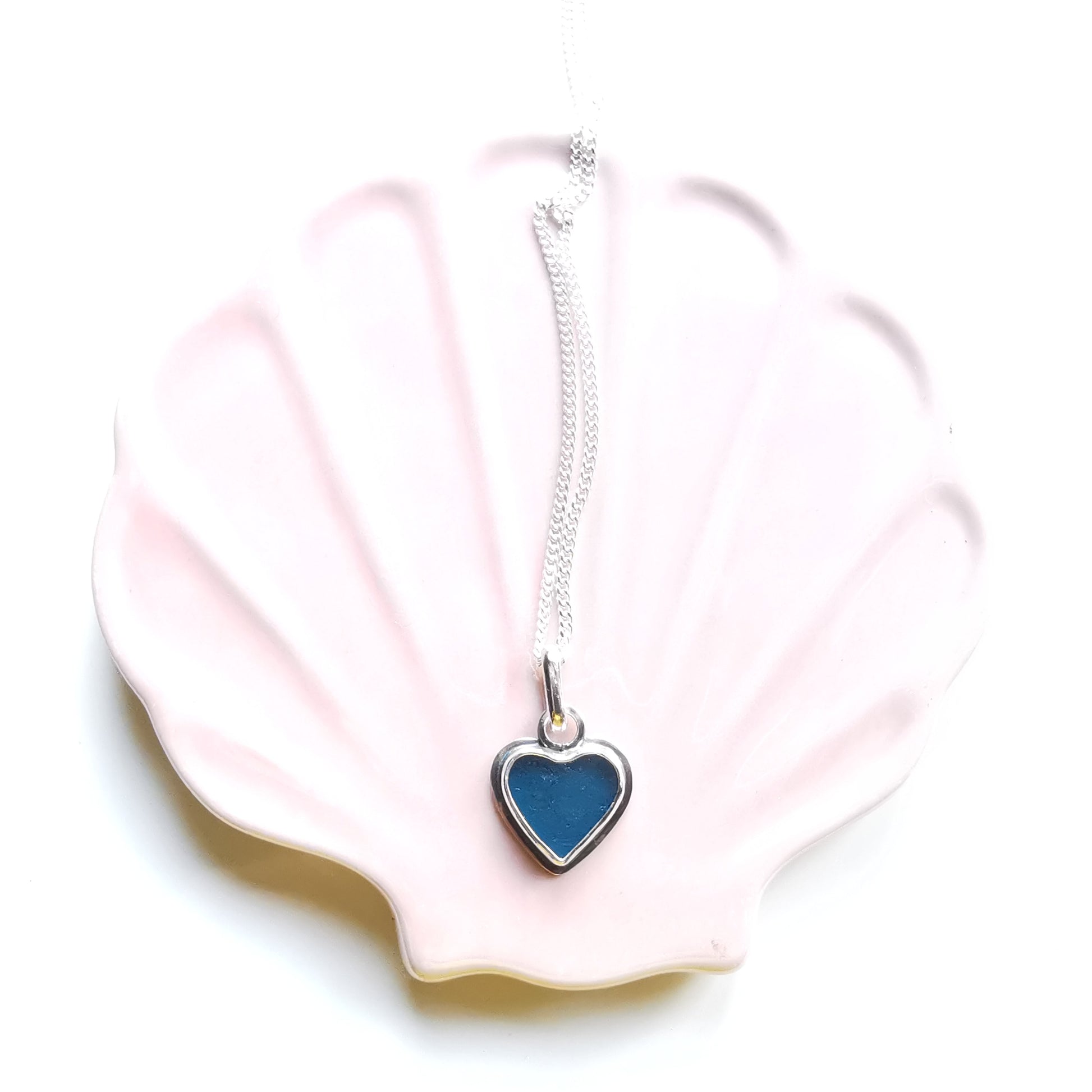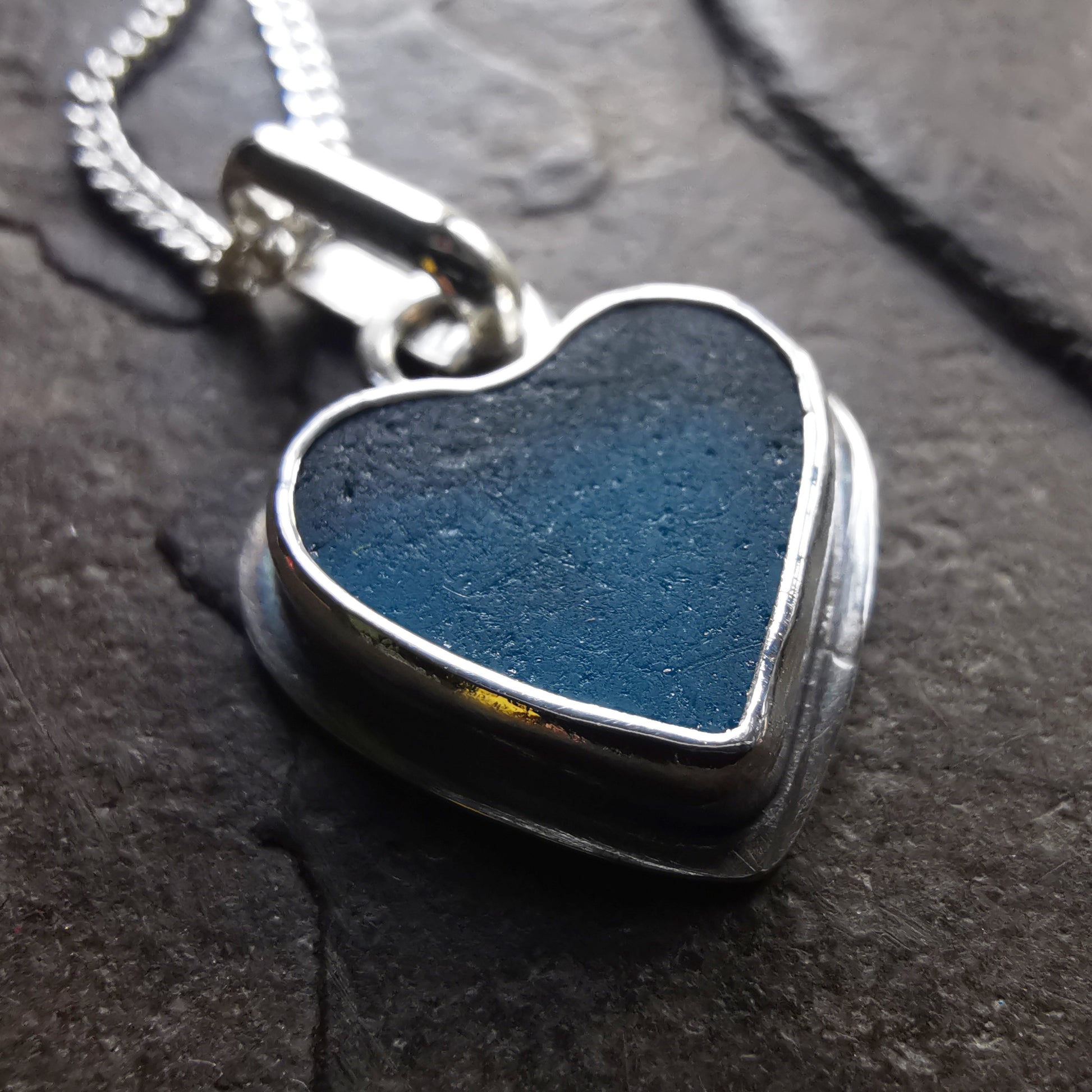 Scottish teal blue sea glass heart & sterling silver pendant.
