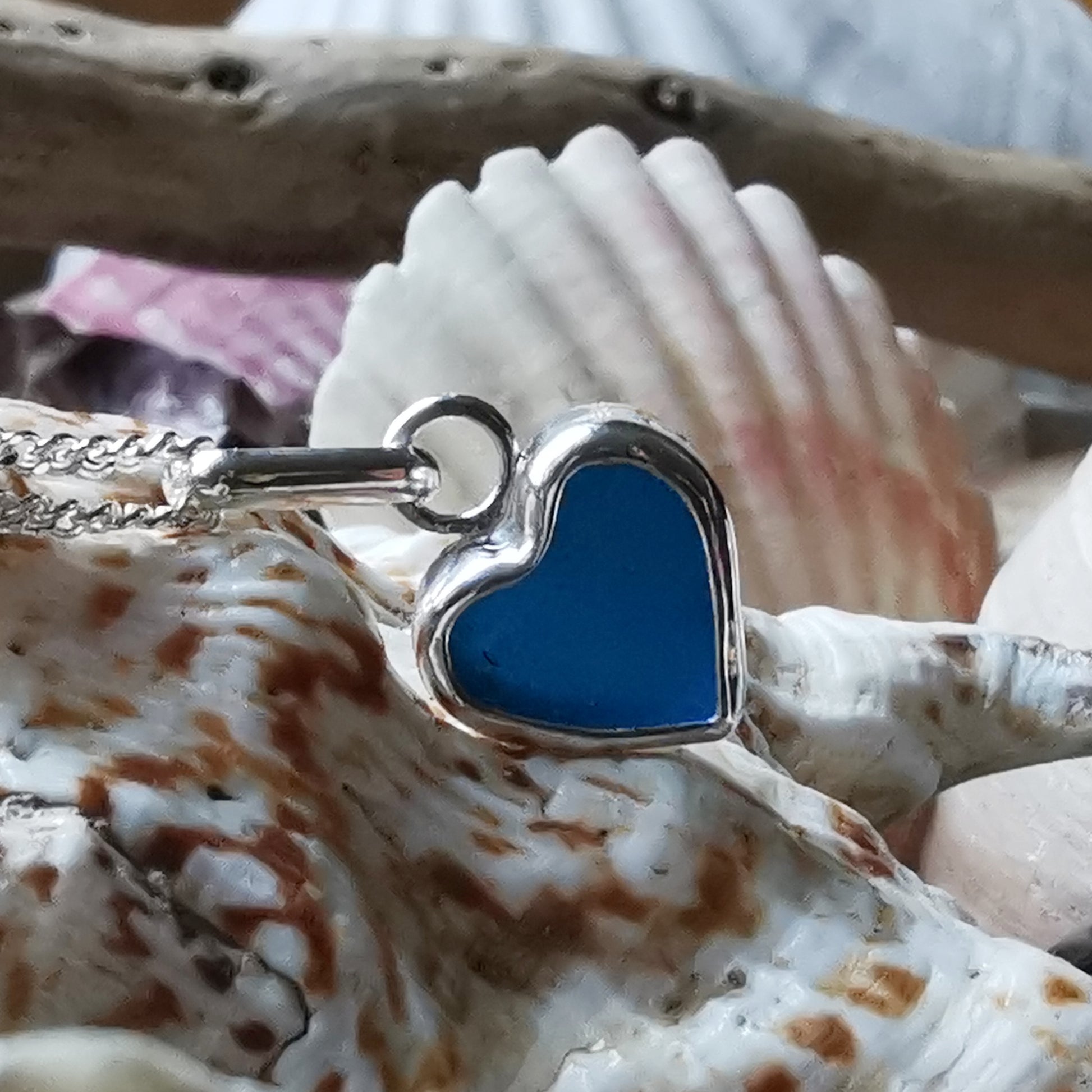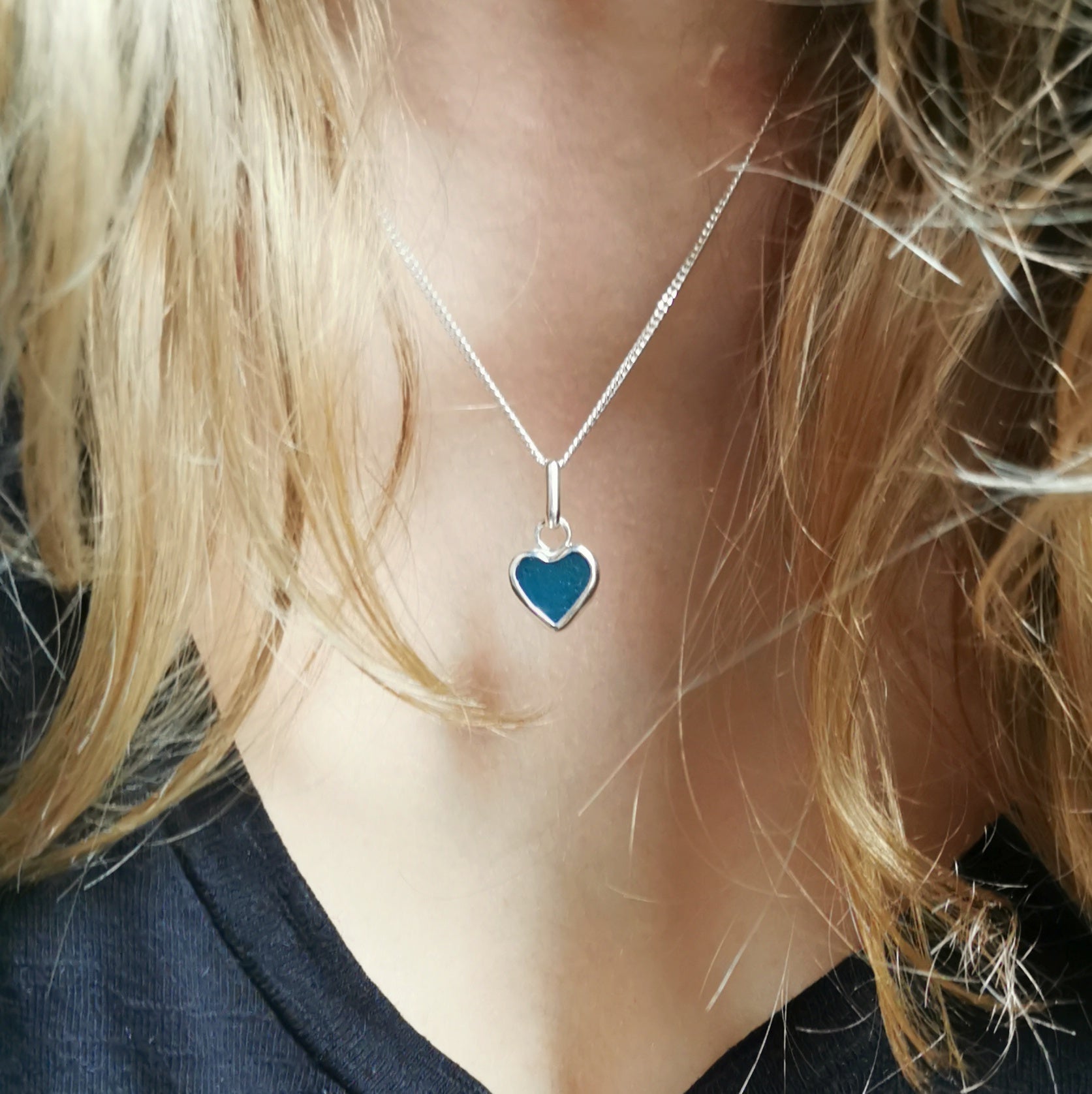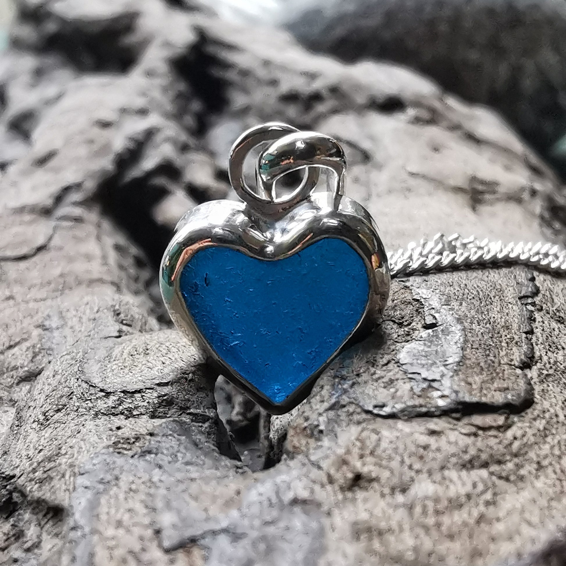 Scottish teal blue sea glass heart & sterling silver pendant.