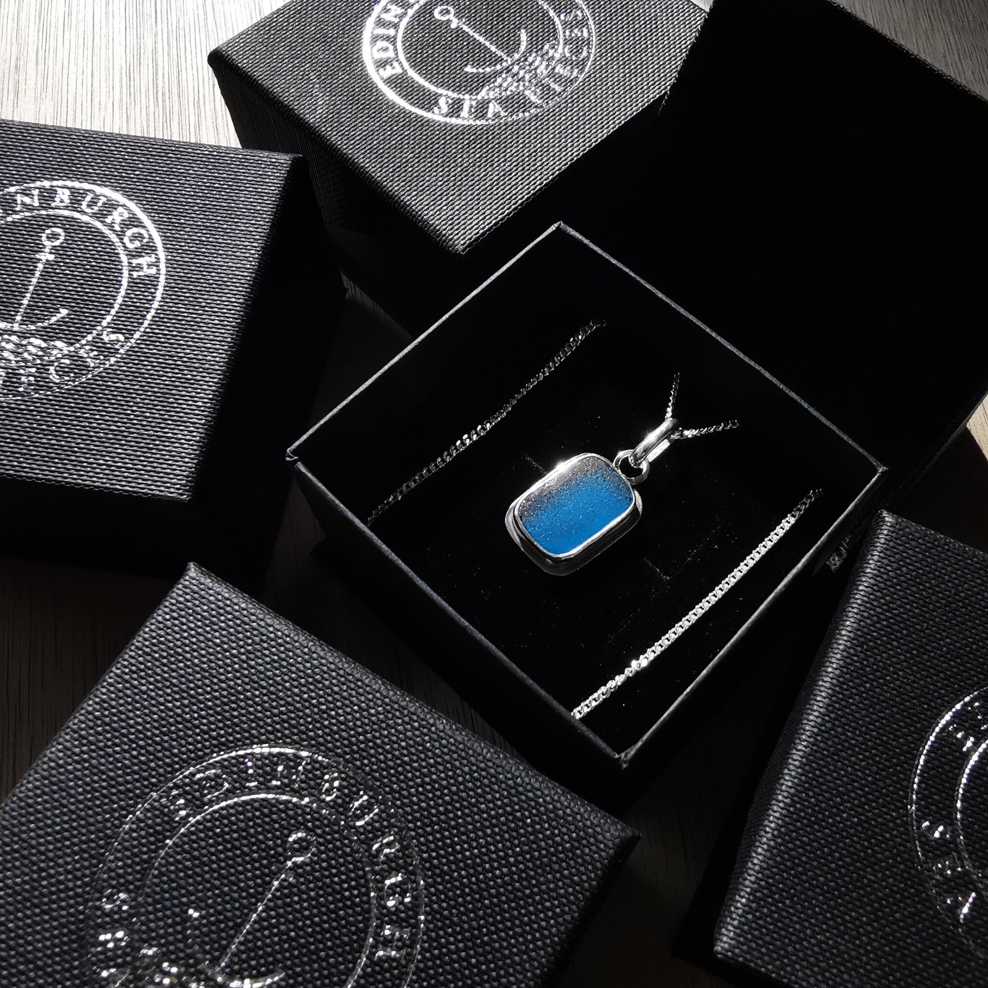 One of a kind pendant composed with teal blue sea glass found by me on Edinburgh's beach.