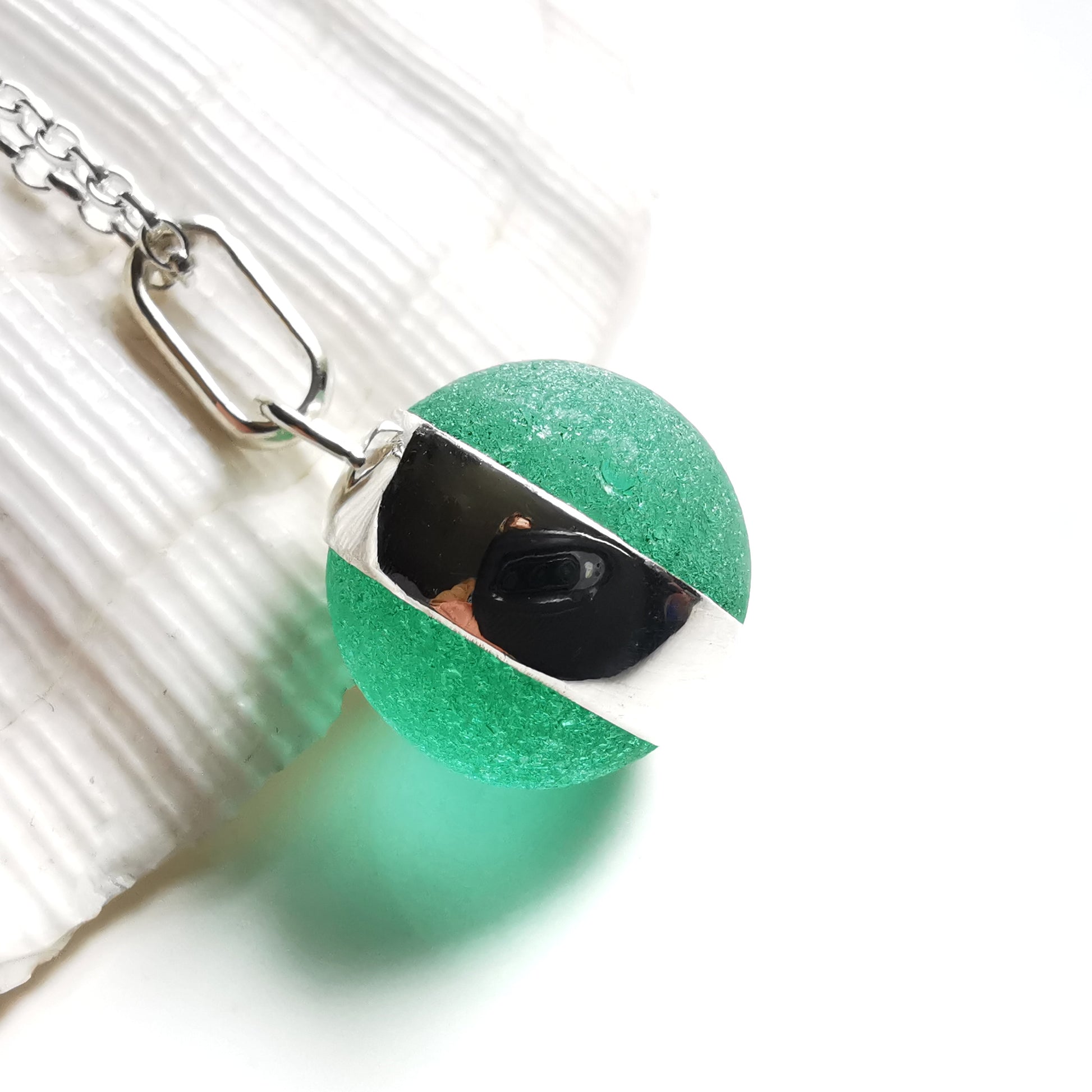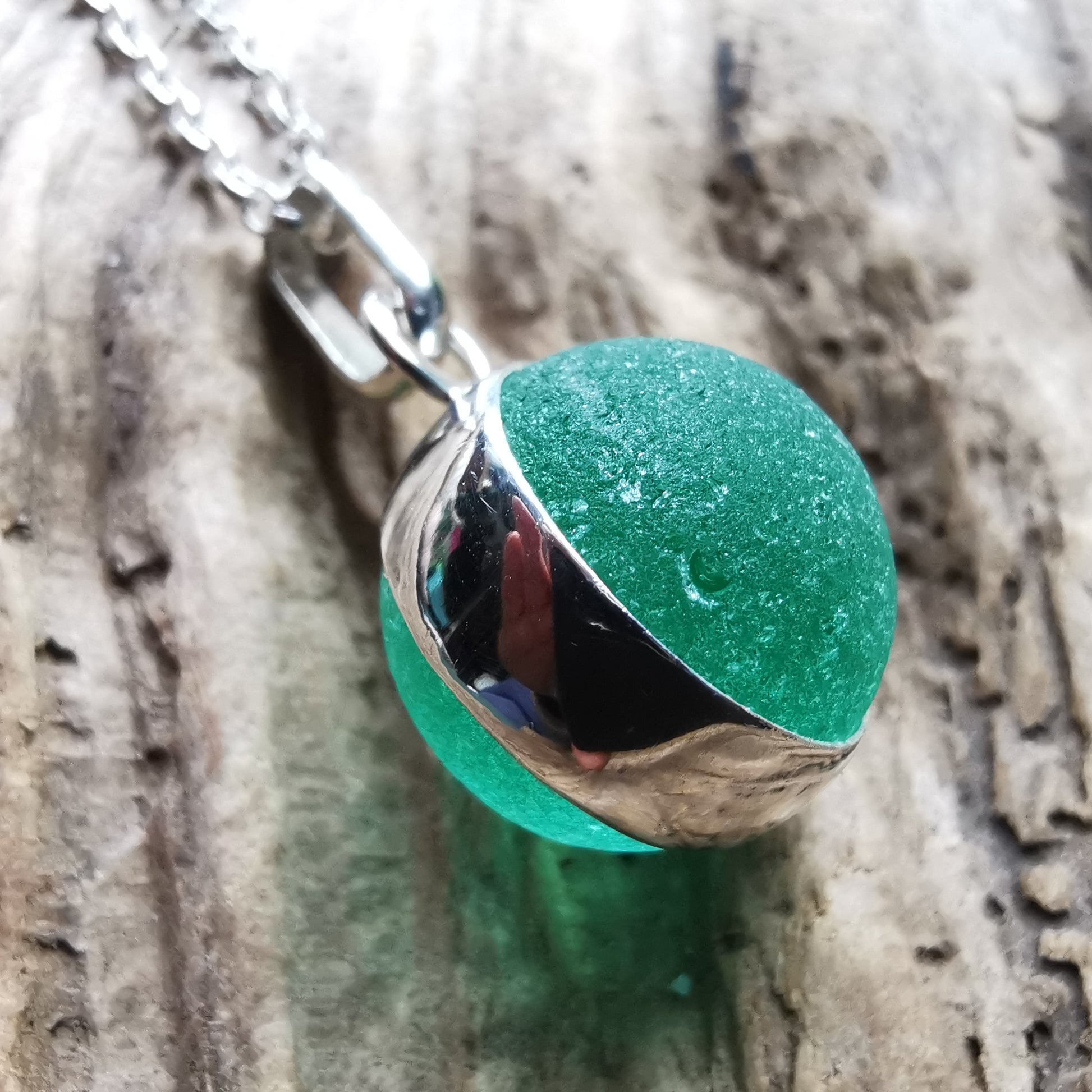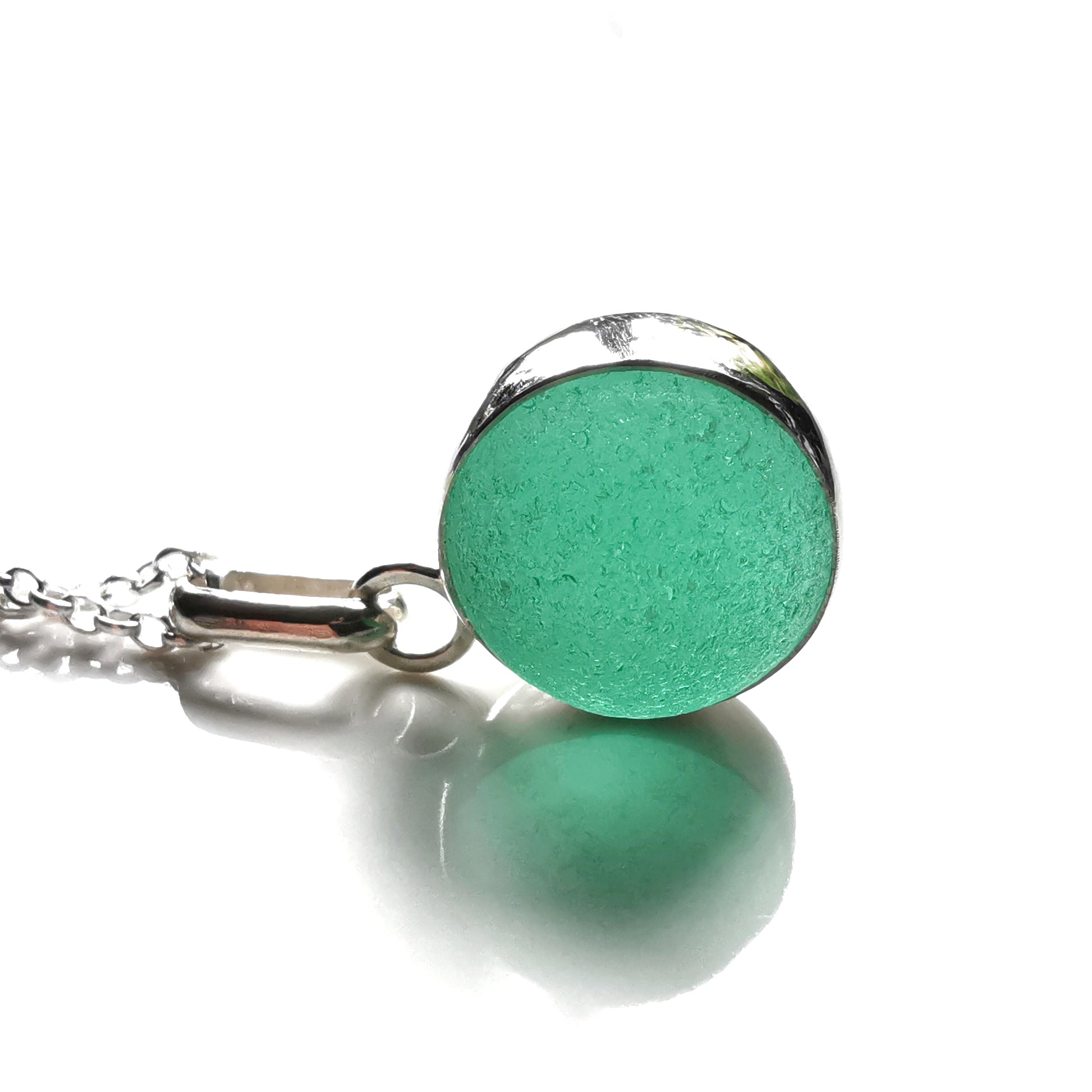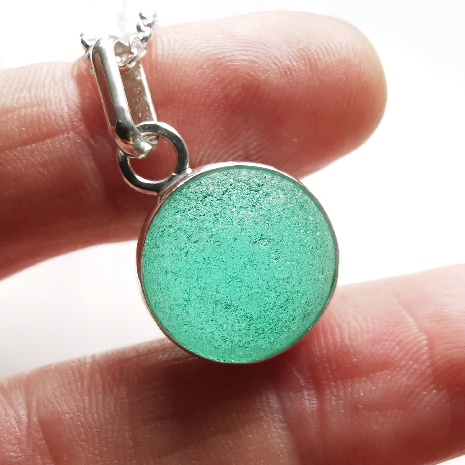 One of a kind pendant composed with genuine frosted teal sea glass marble, found in Edinburgh in January 2024. The marble is set in fine silver bezel, the chain is sterling silver. The marble can spin in the bezel, this is normal and it is not a fault, marble is secure and is not going to fall of the bezel.
