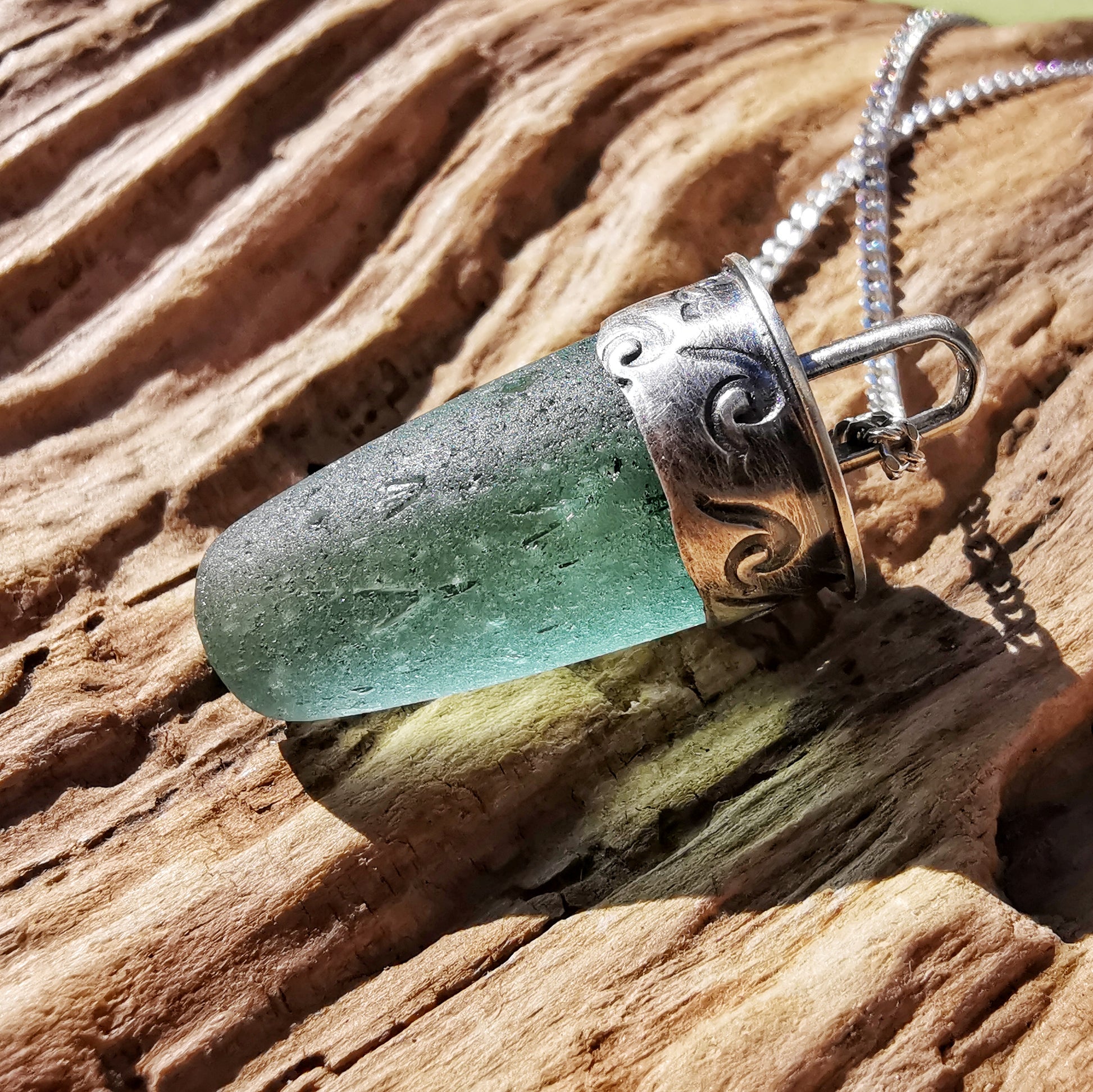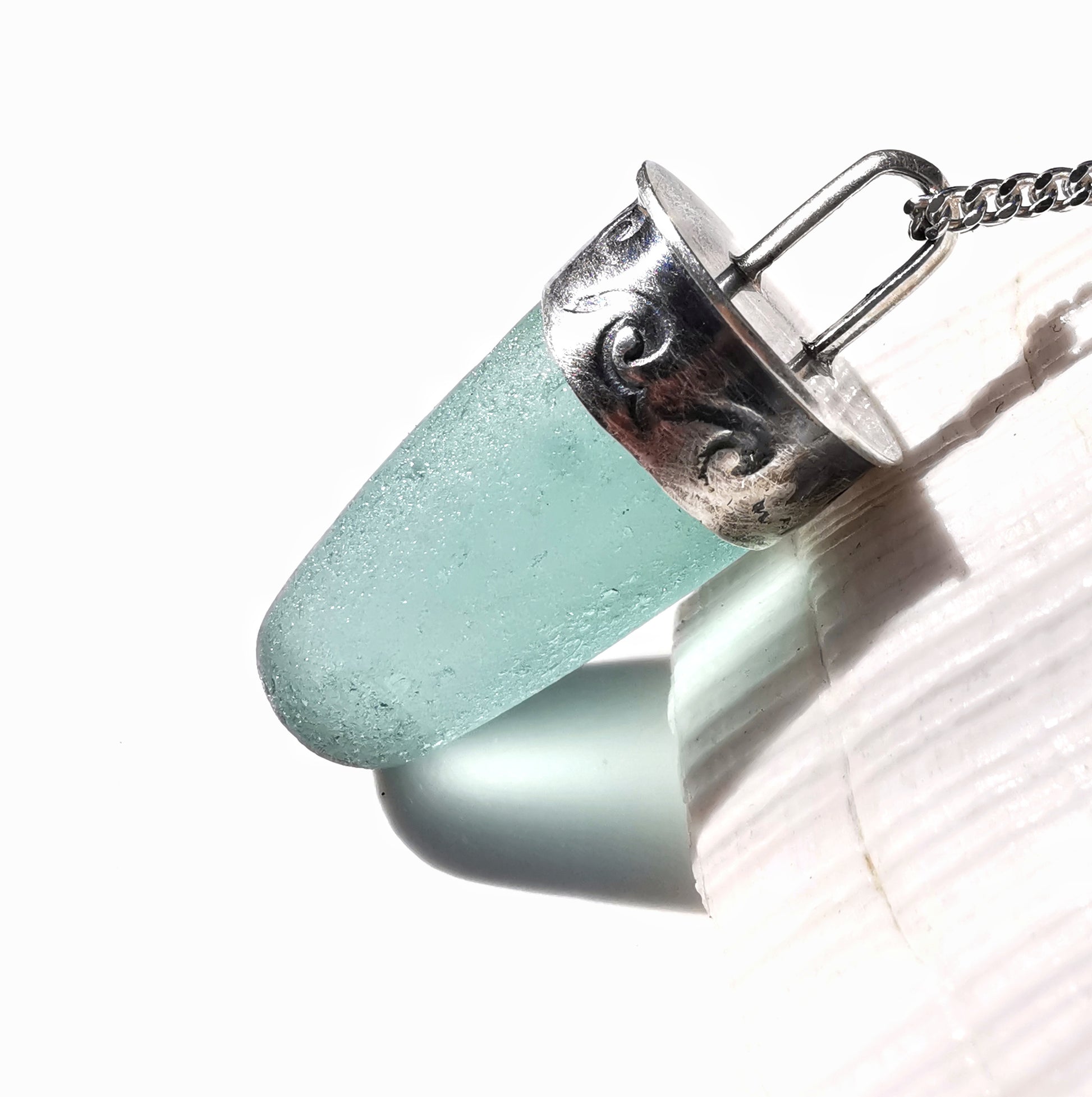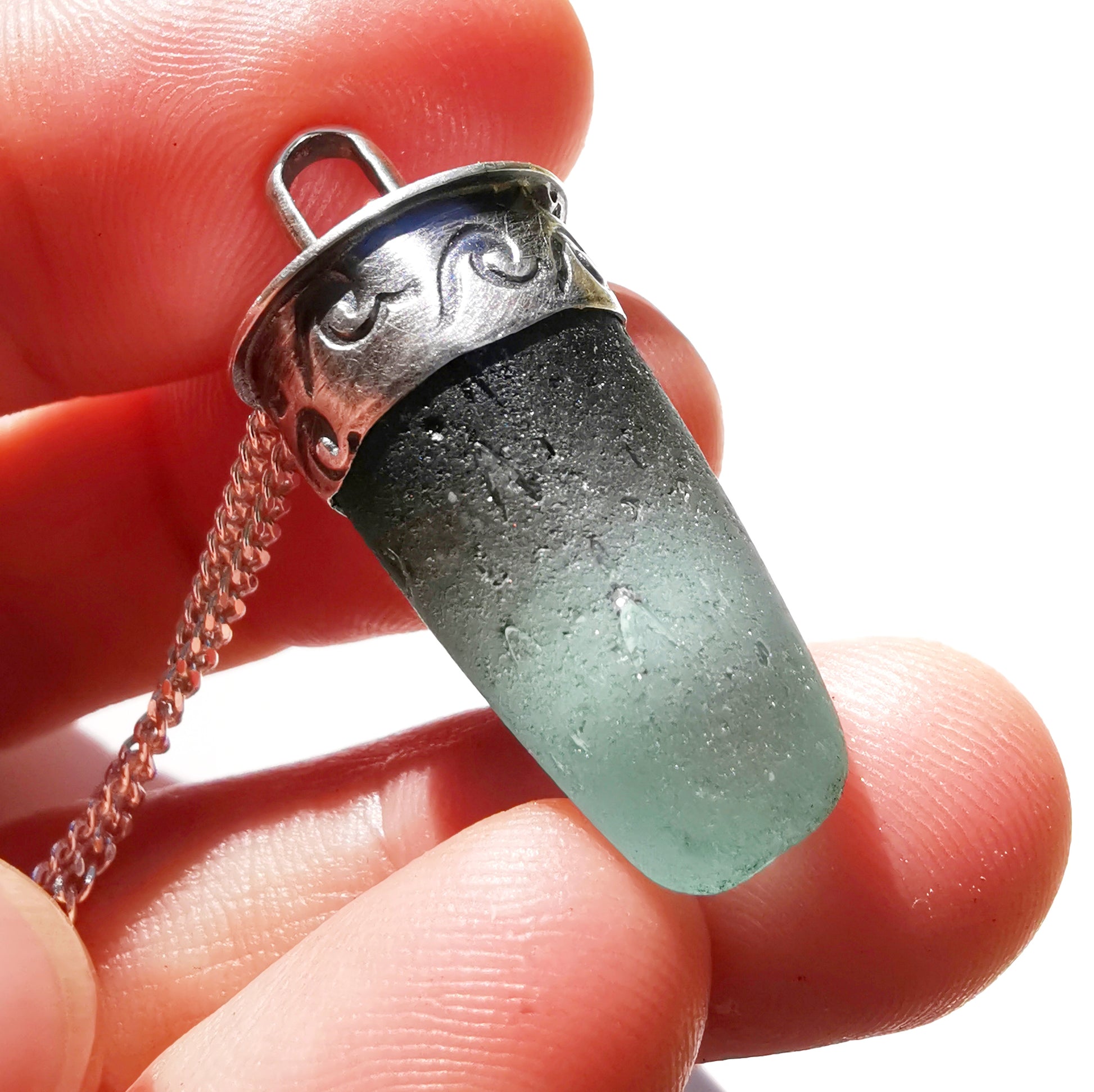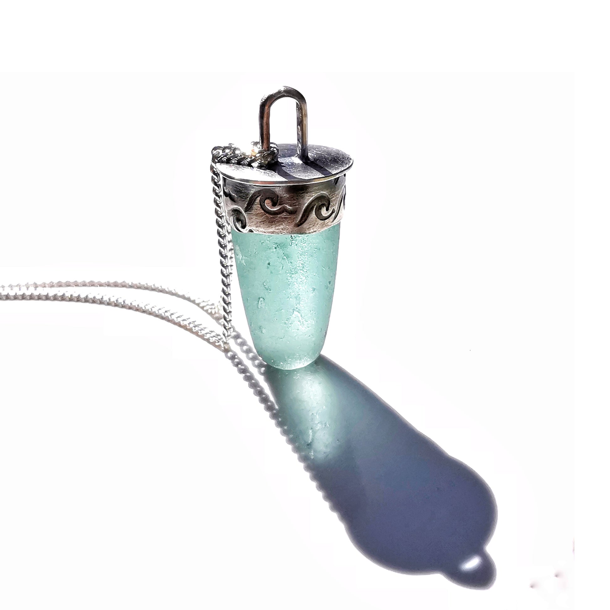 Scottish teal sea glass stopper stem & sterling silver pendant.