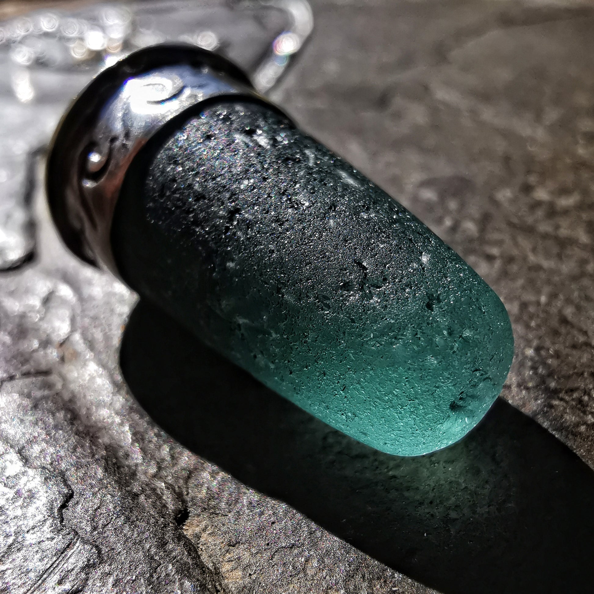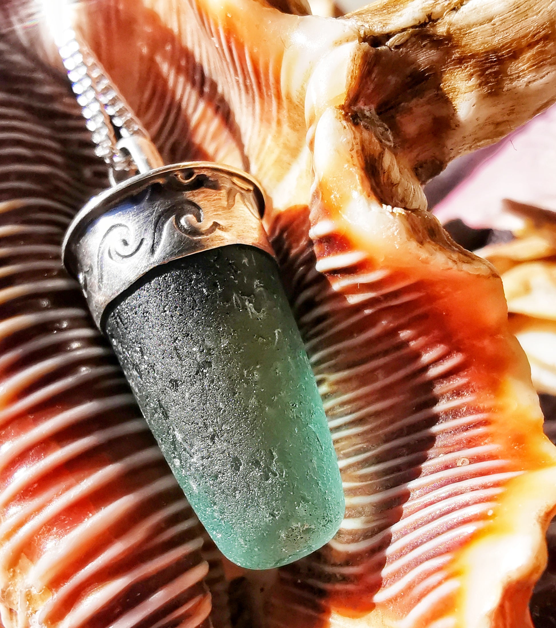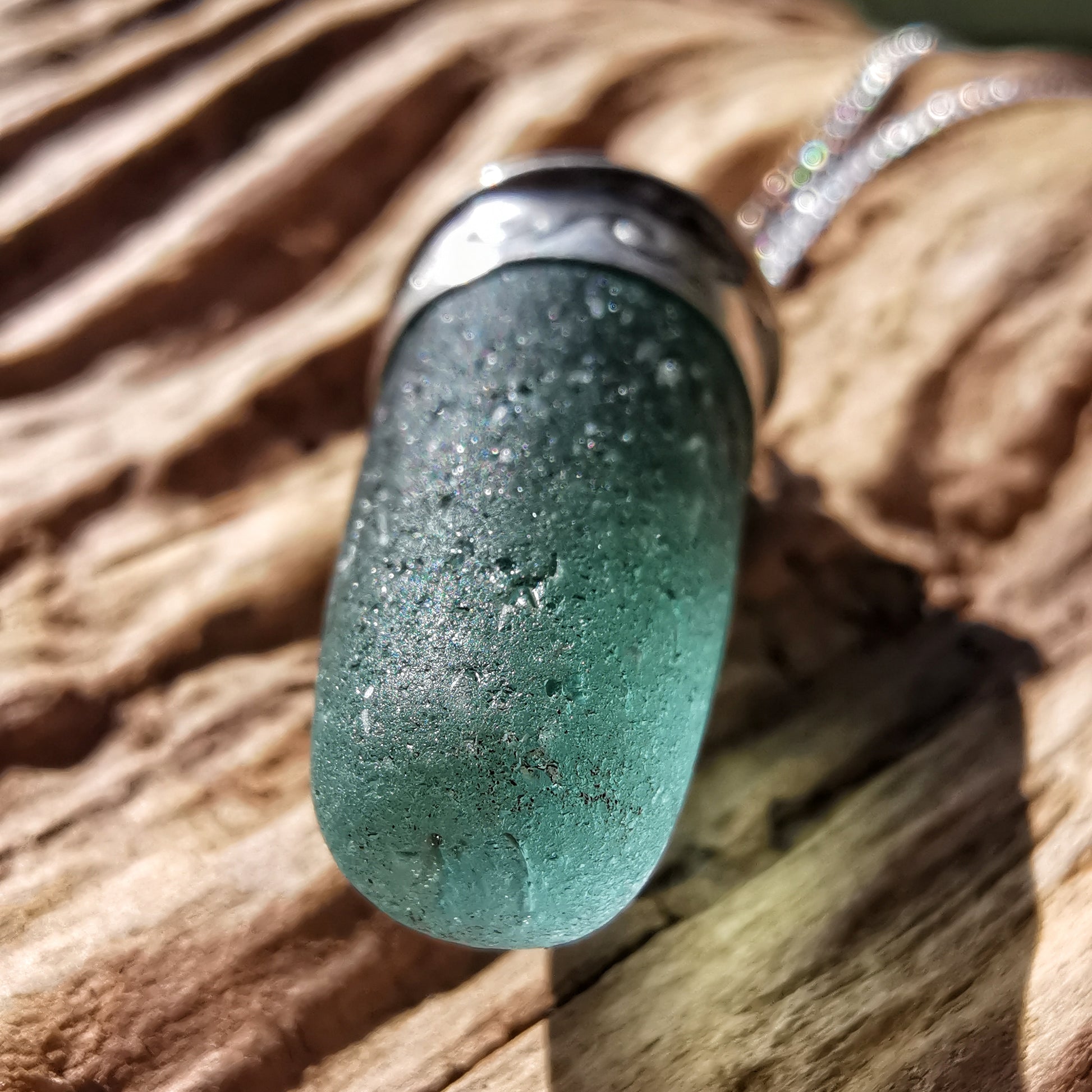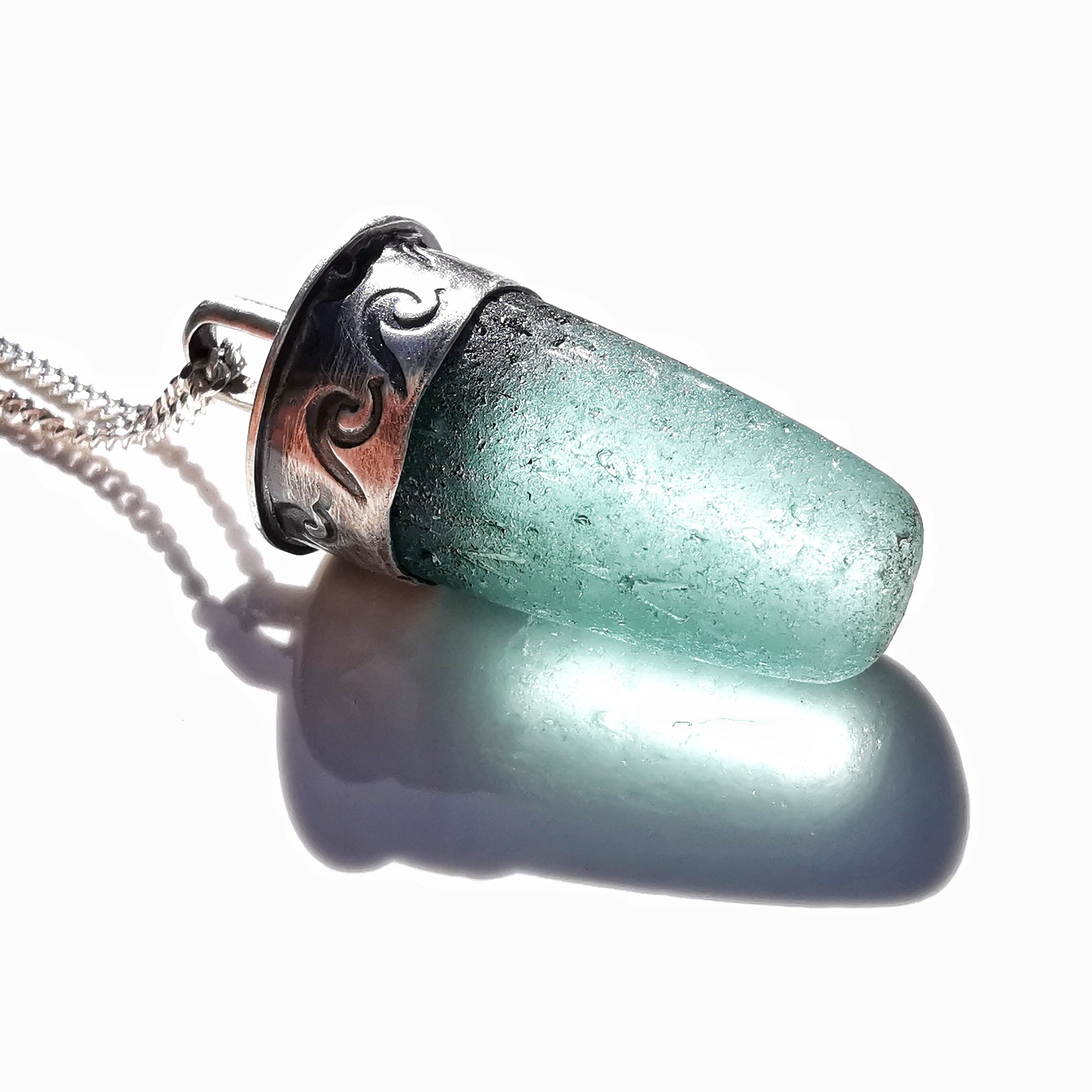 Scottish teal sea glass stopper stem & sterling silver pendant.
