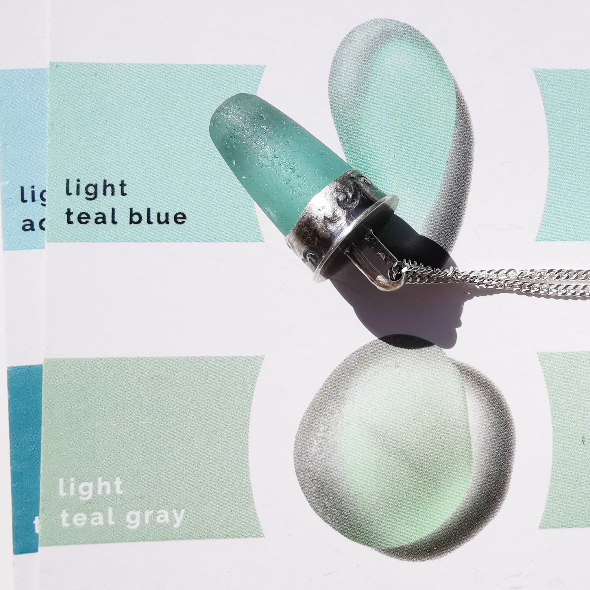 One of a kind pendant composed with genuine frosted teal sea glass stopper stem found by me on Edinburgh's beach. The sea glass is set in fine silver bezel, the chain is sterling silver.