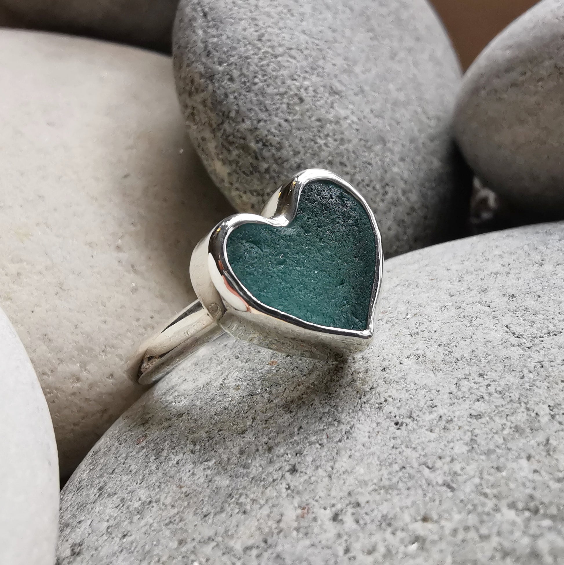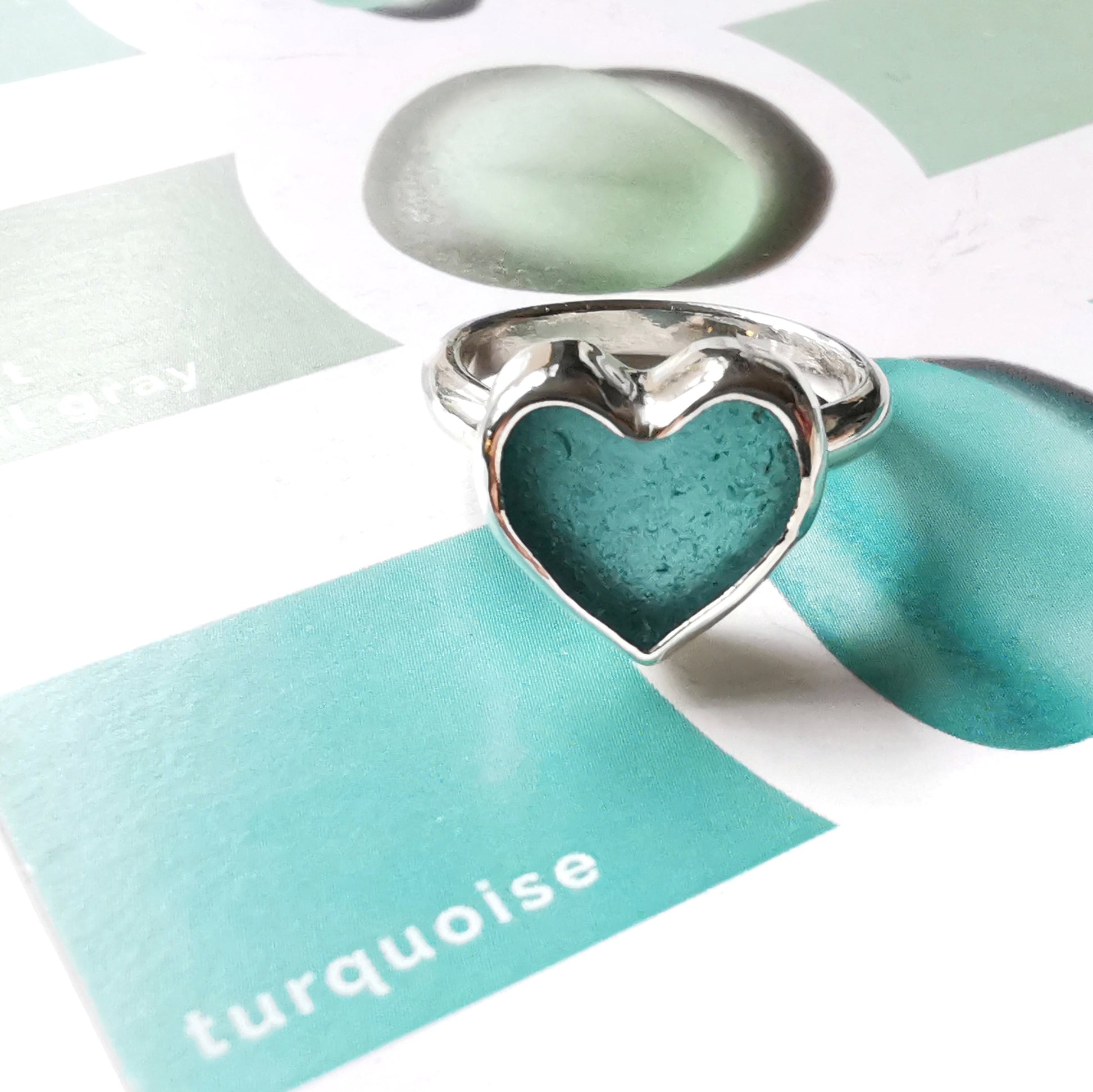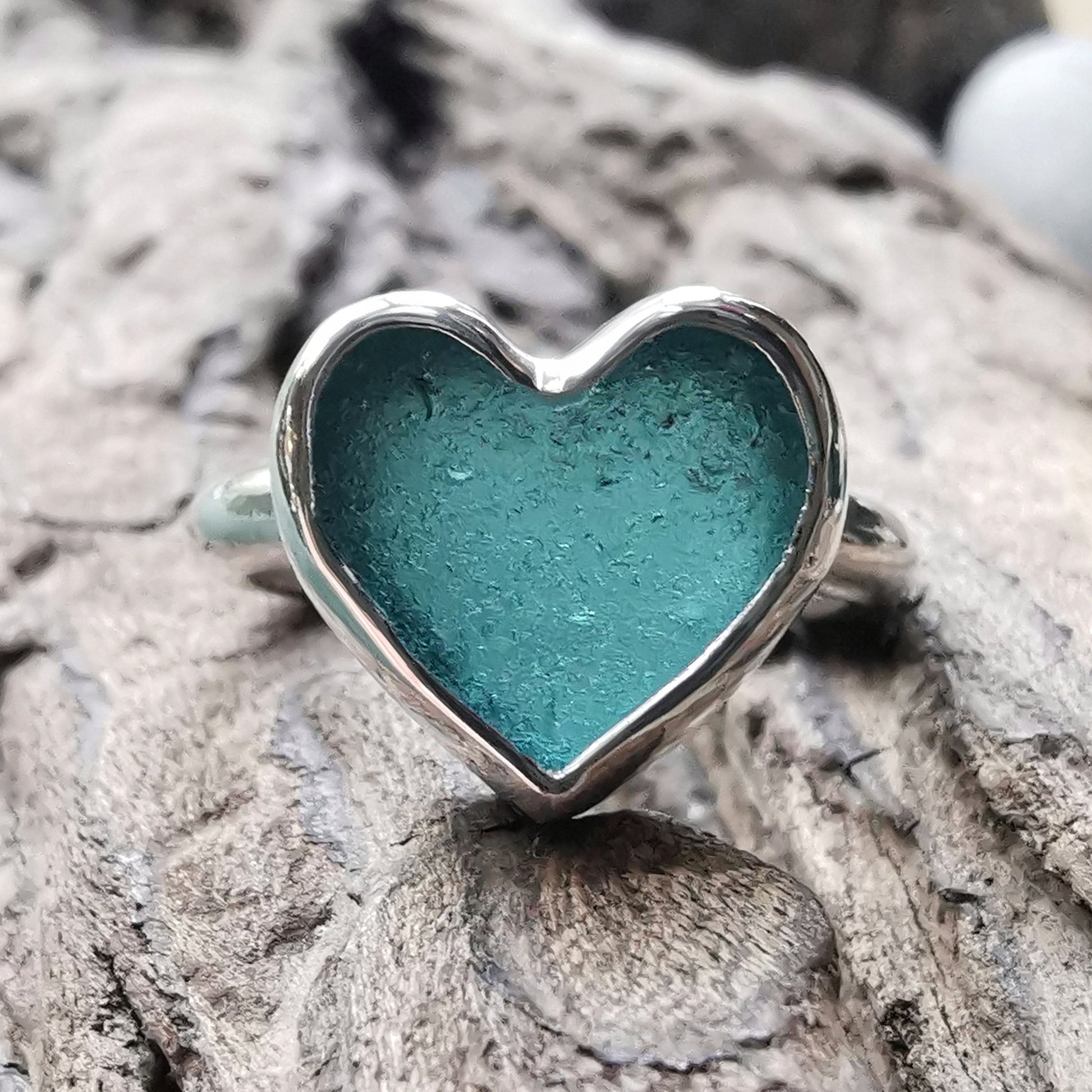 Scottish turquoise sea glass heart & sterling silver ring size N/7.