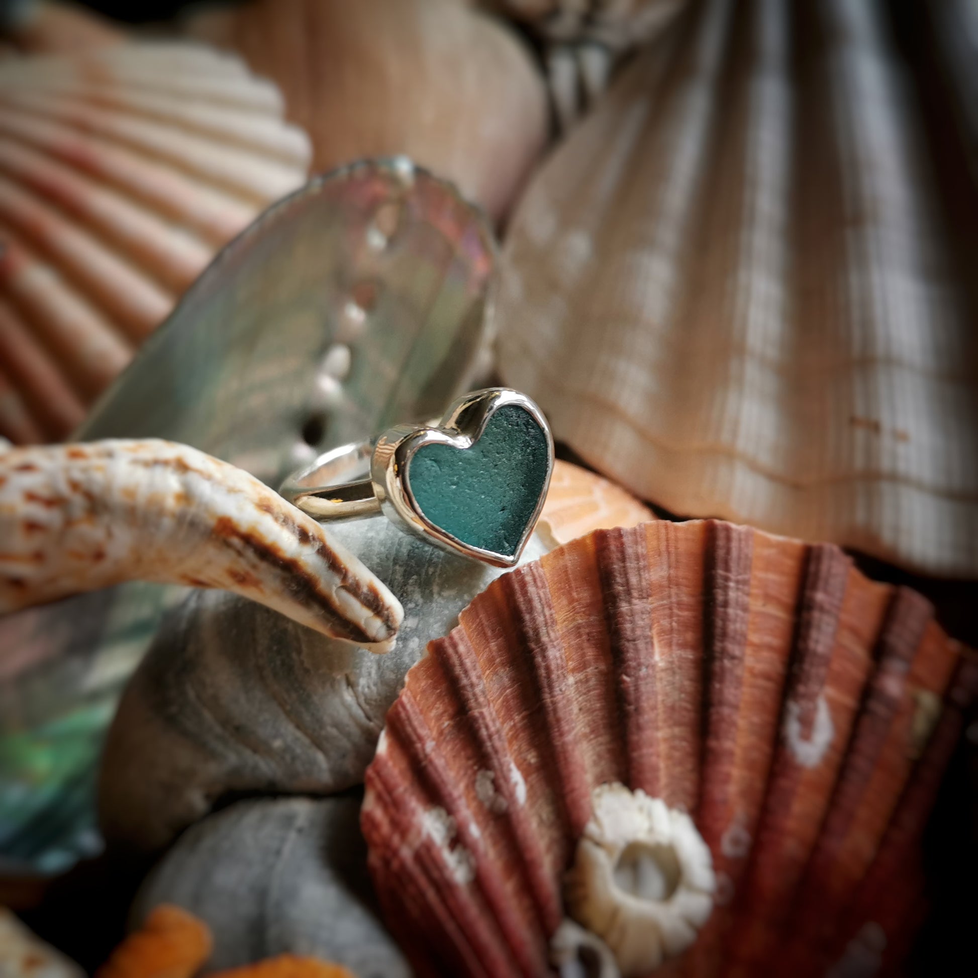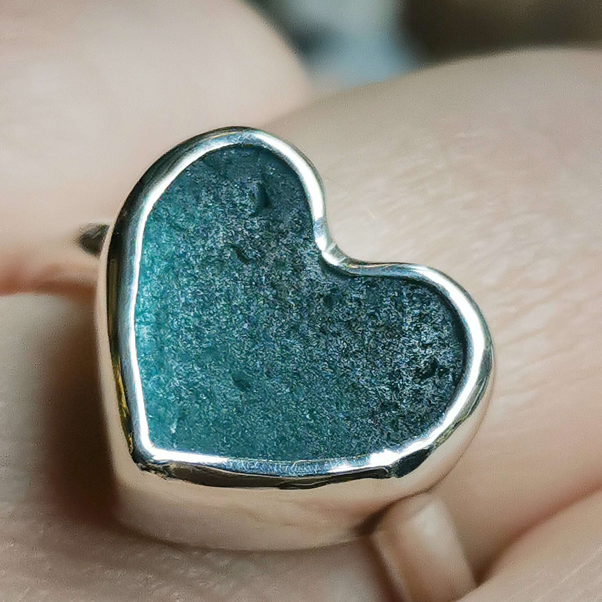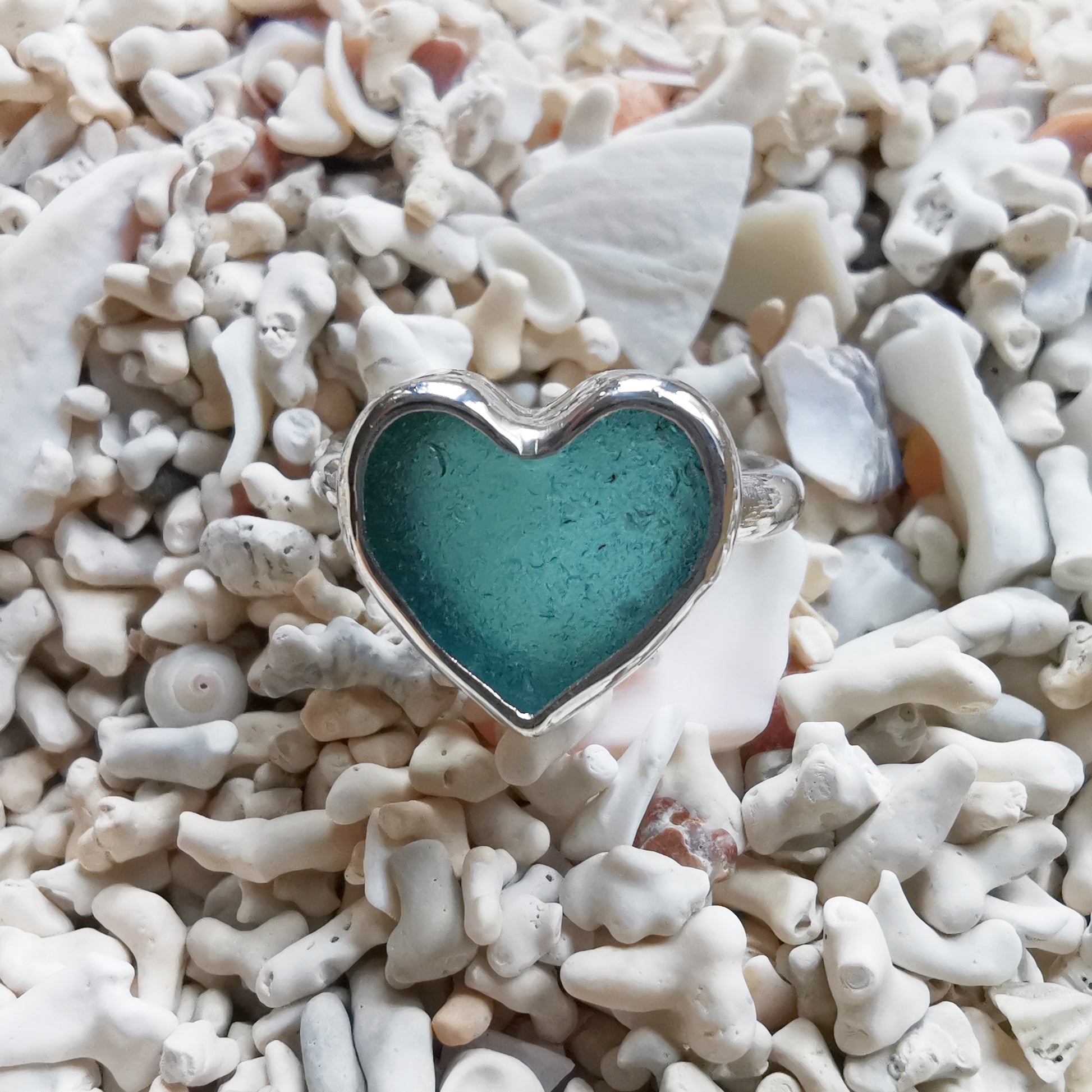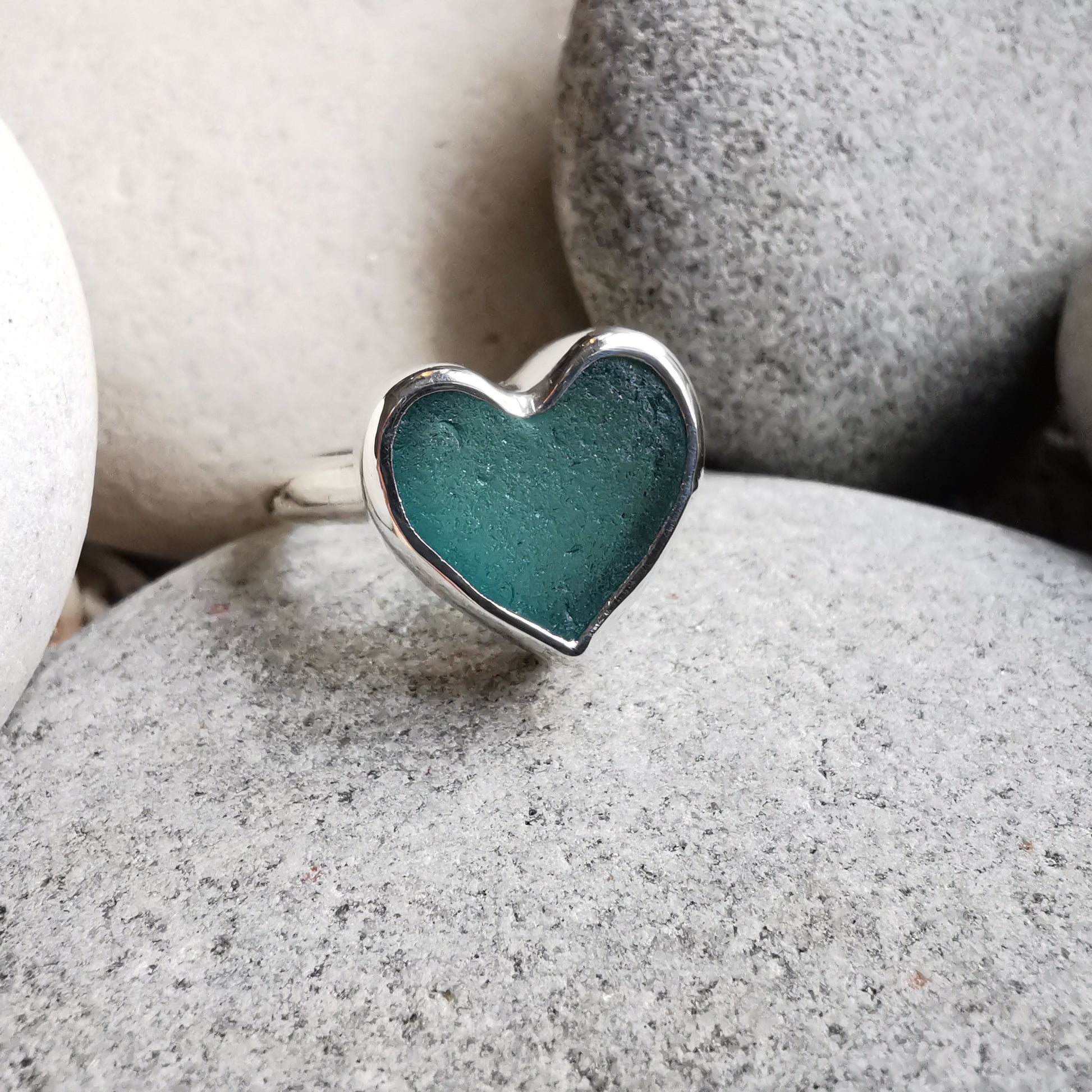 Scottish turquoise sea glass heart & sterling silver ring size N/7.