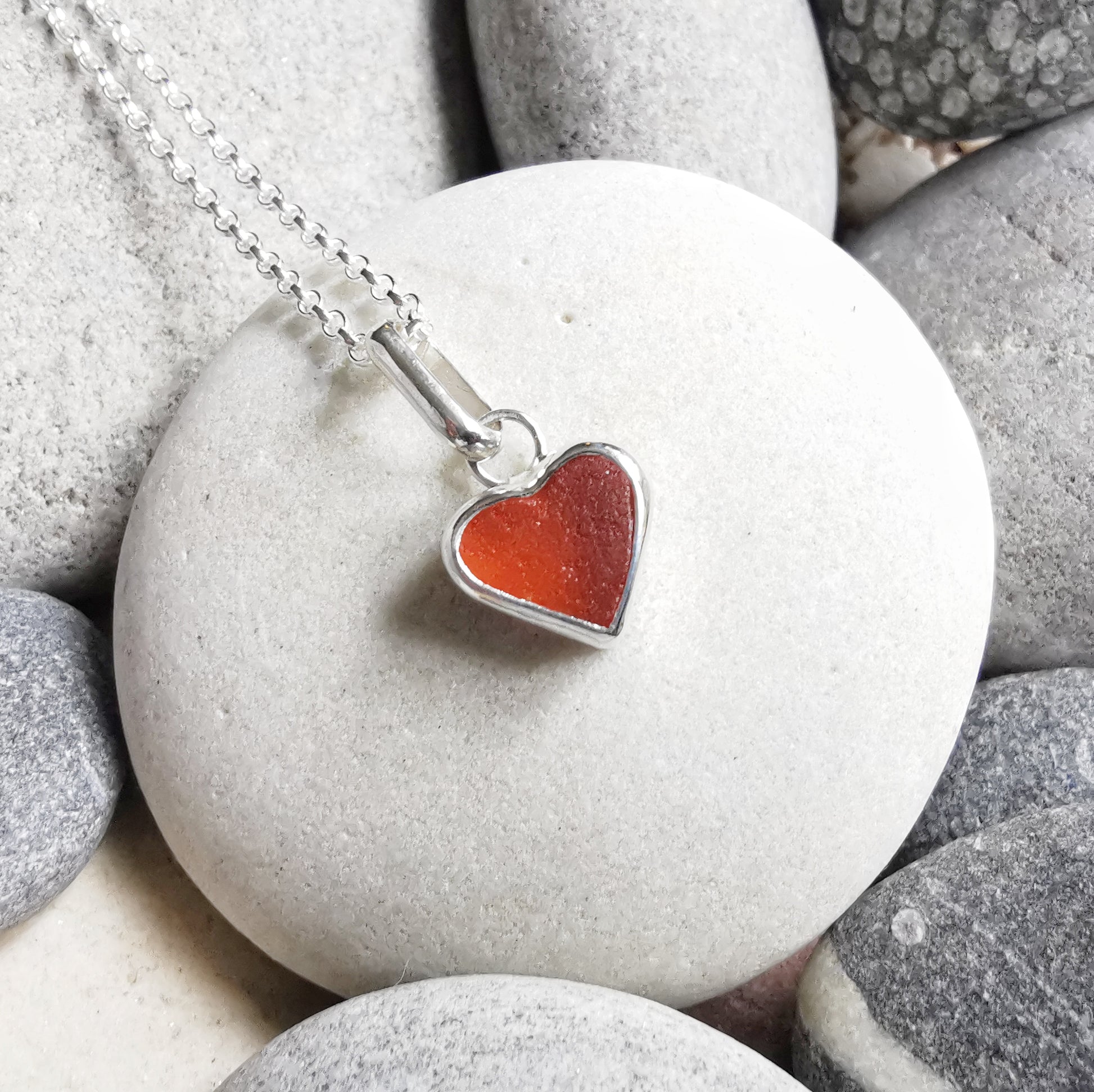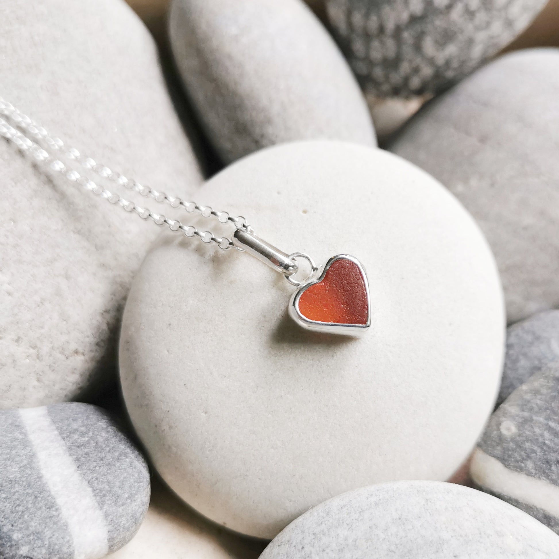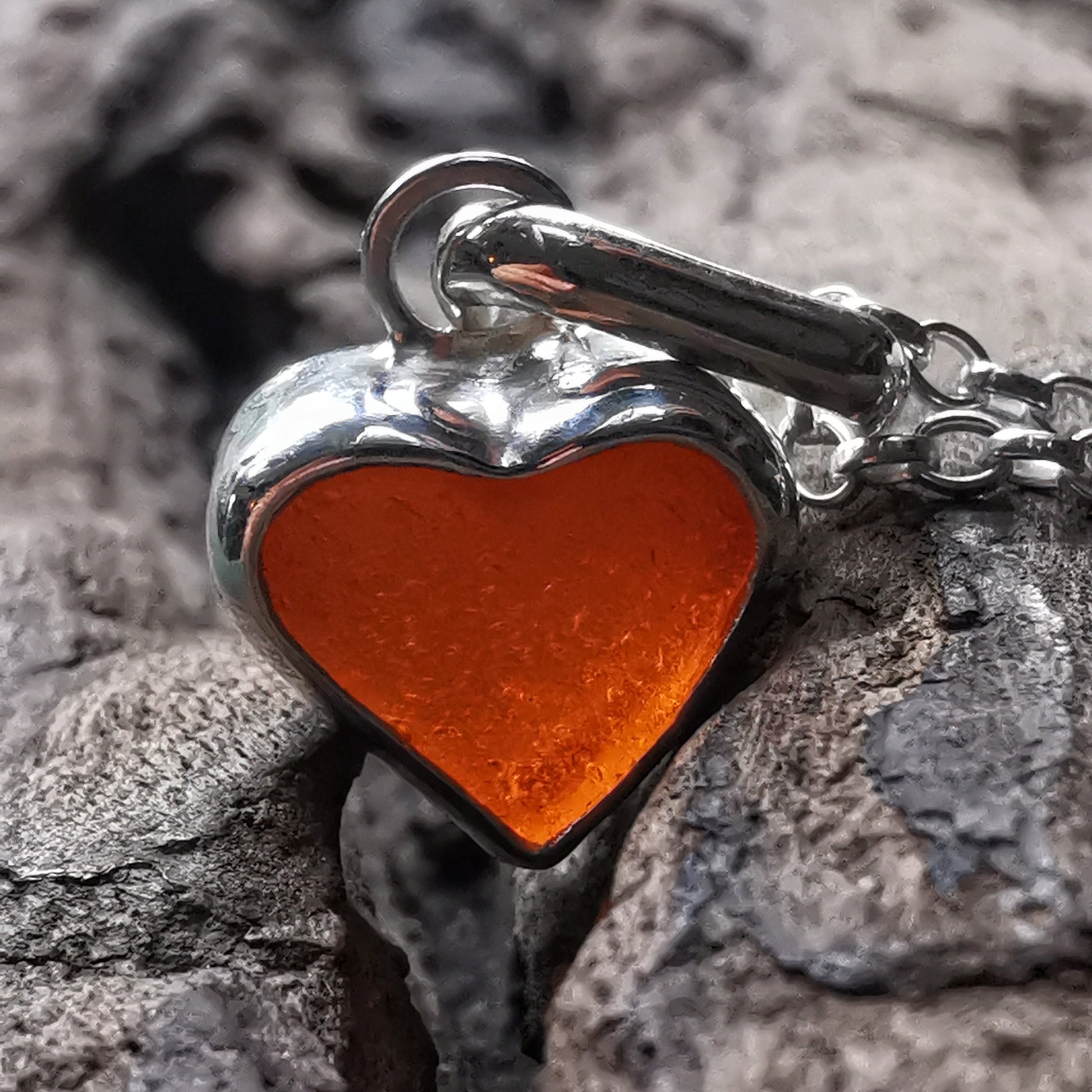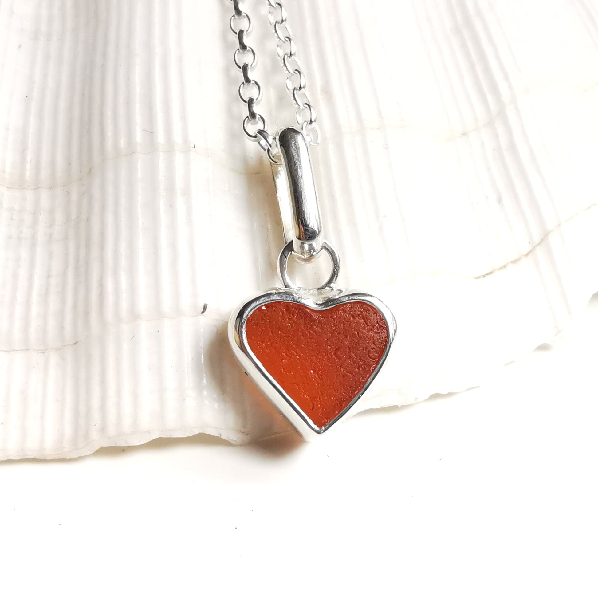Scottish UV deep orange sea glass heart & sterling silver pendant.