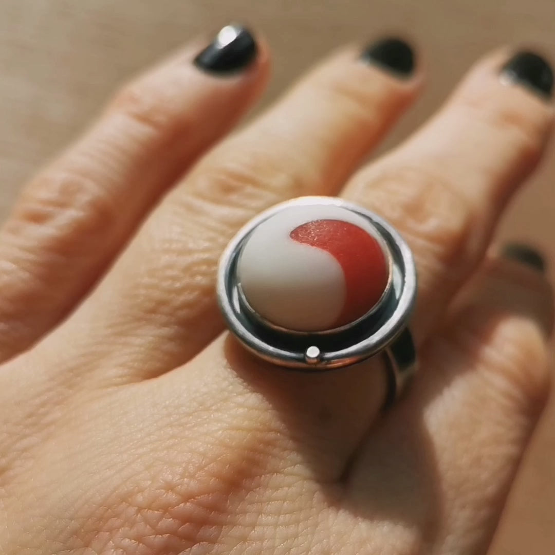 One of a kind ring composed with genuine white and red sea glass half marble. The sea glass is set in fine silver bezel, the band is sterling silver.