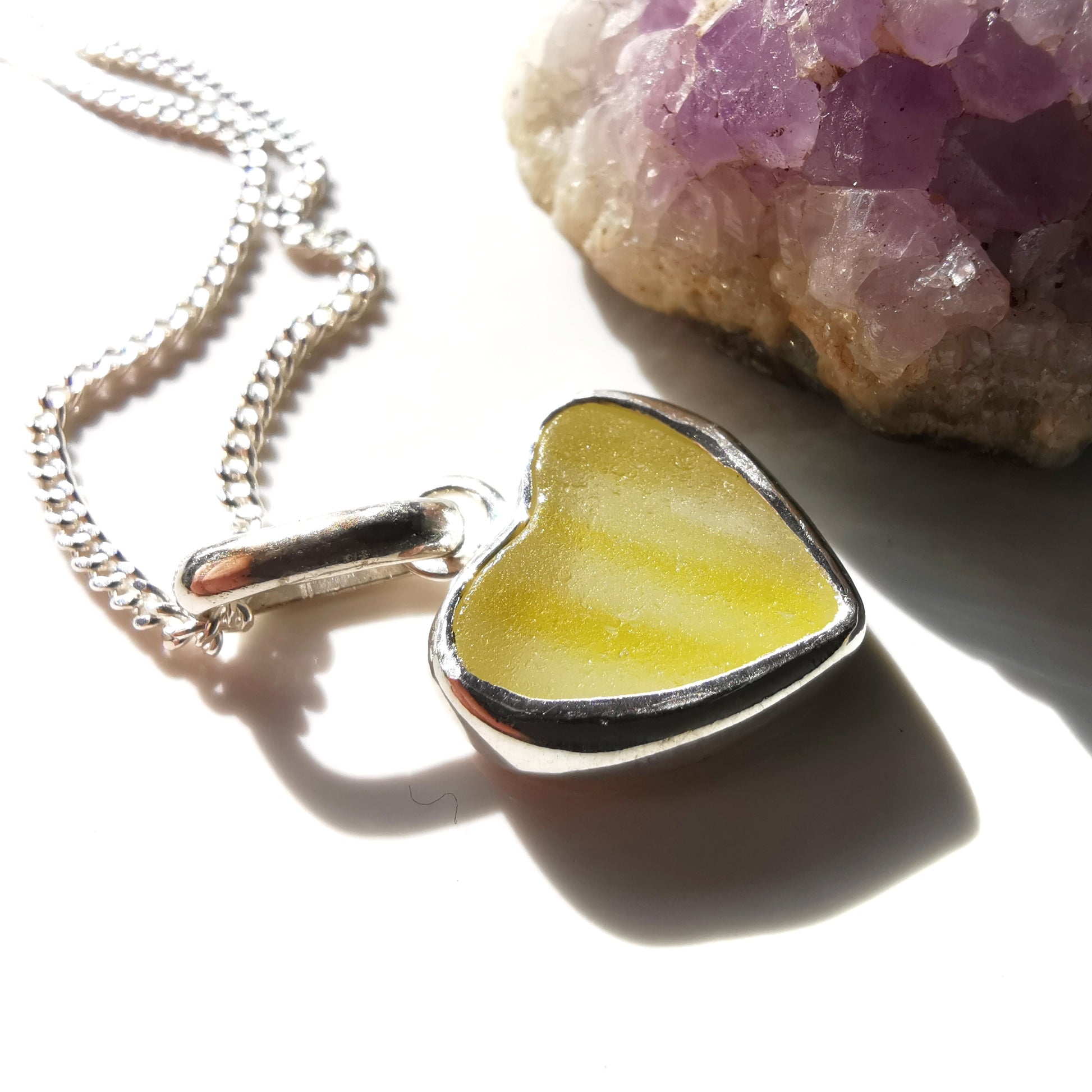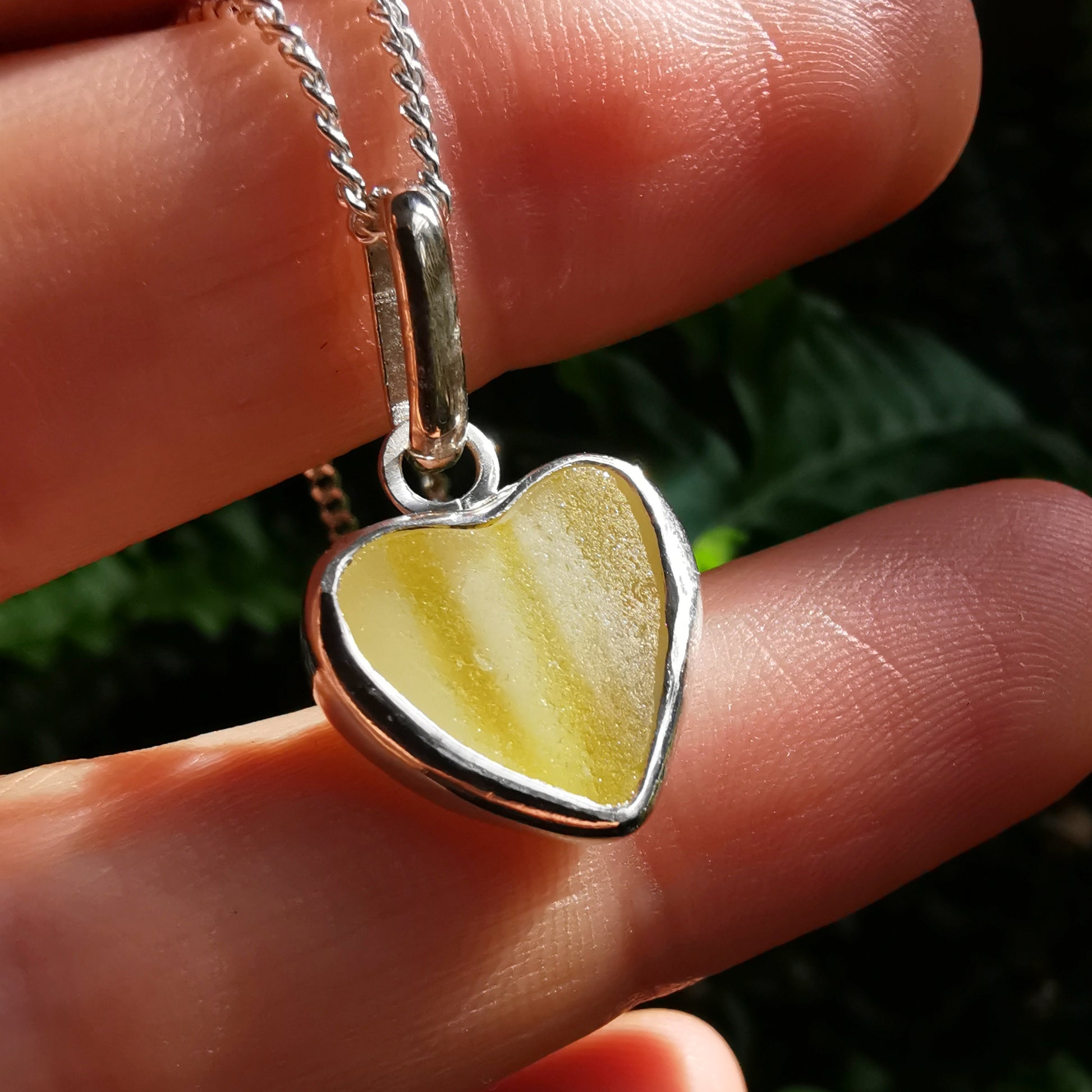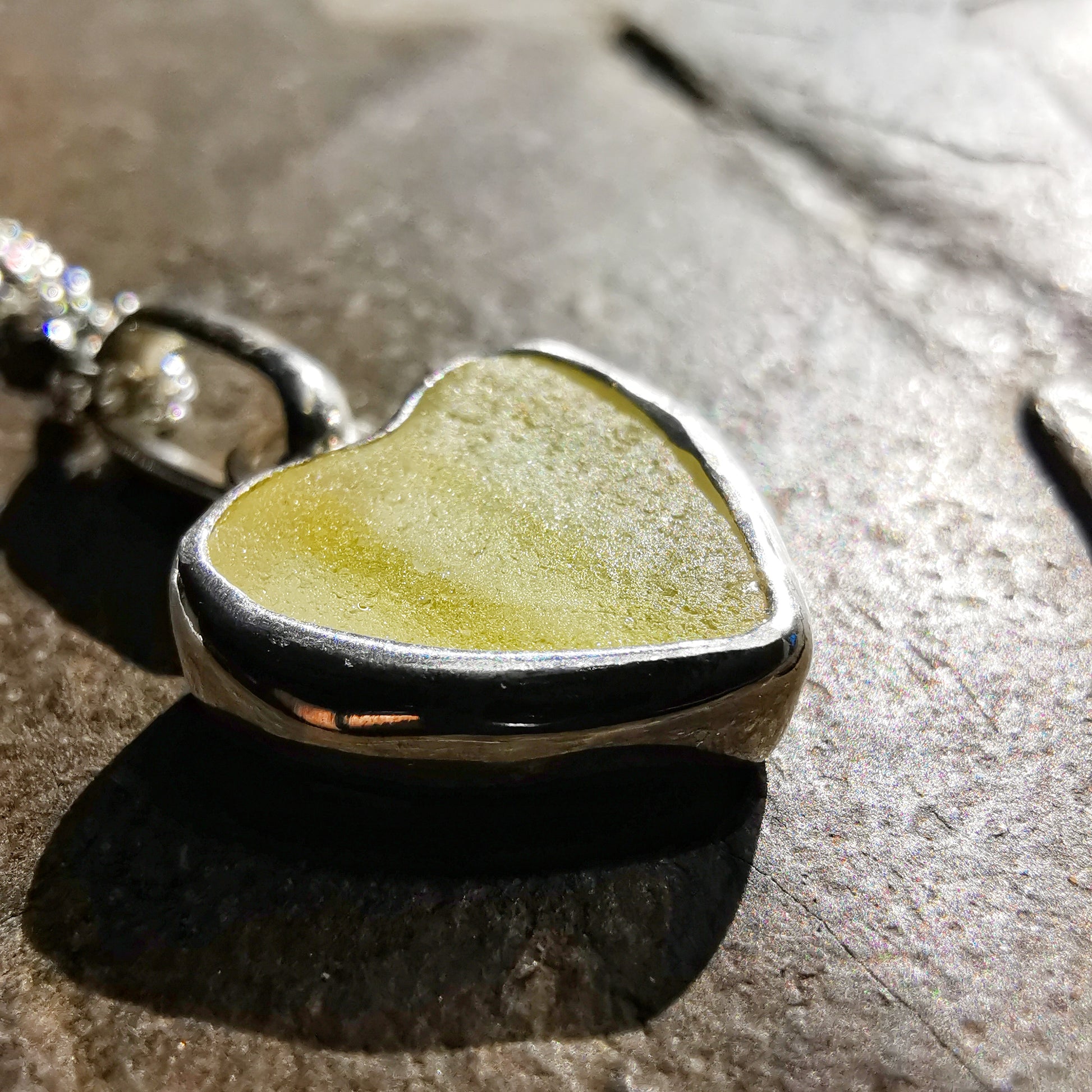 One of a kind pendant composed with genuine Scottish yellow and white sea glass. The sea glass is wrapped in fine silver bezel, the chain is sterling silver. I've shaped this sea glass heart myself.