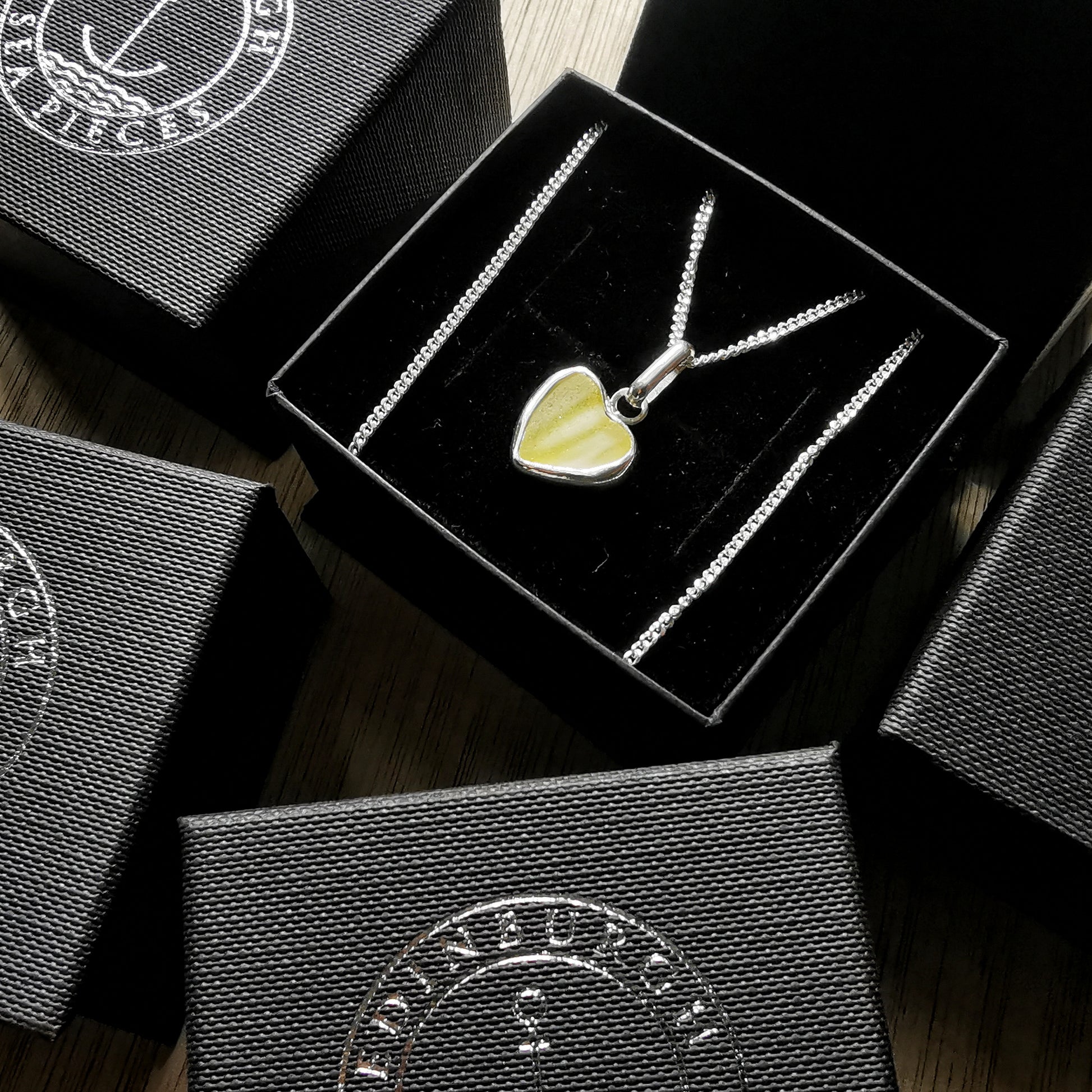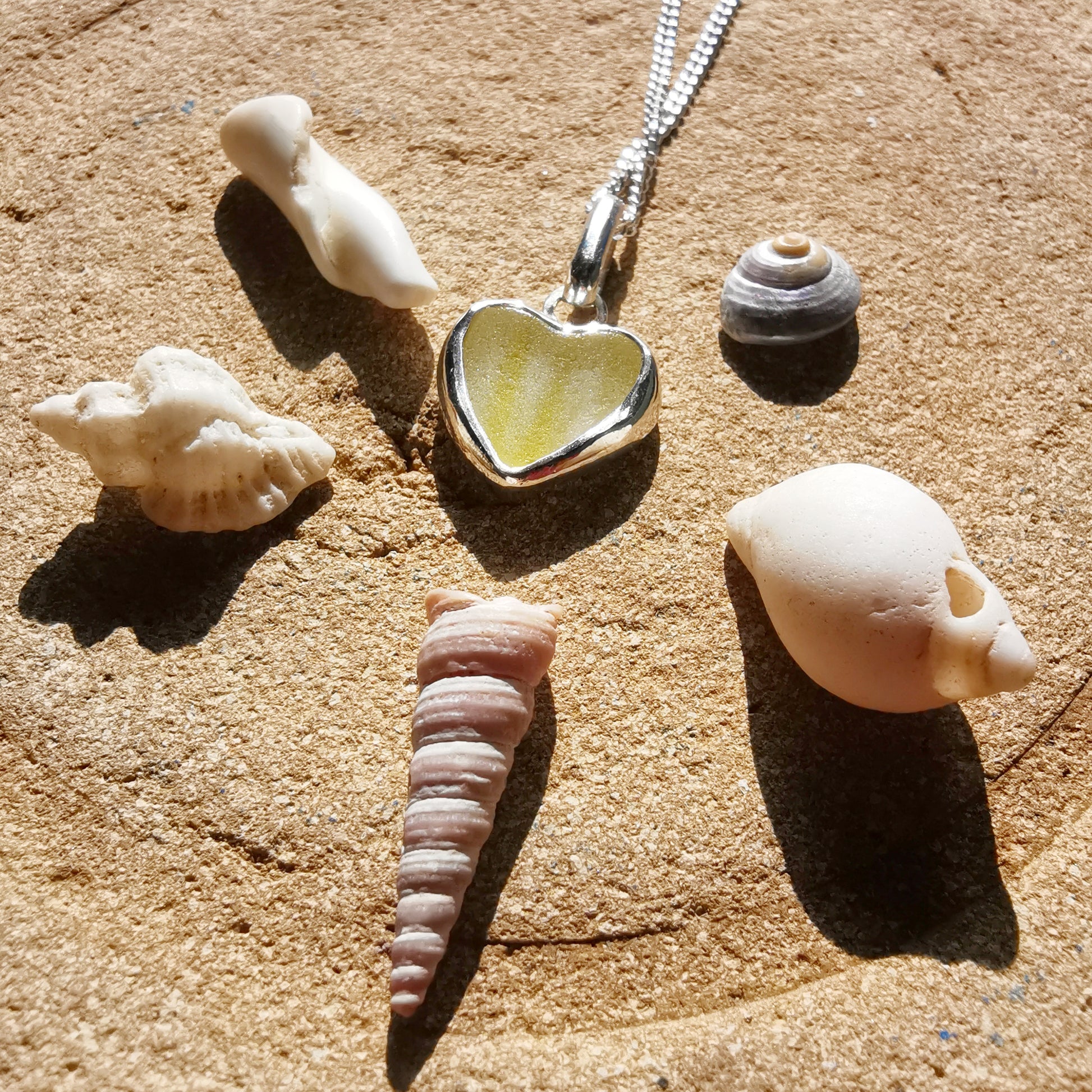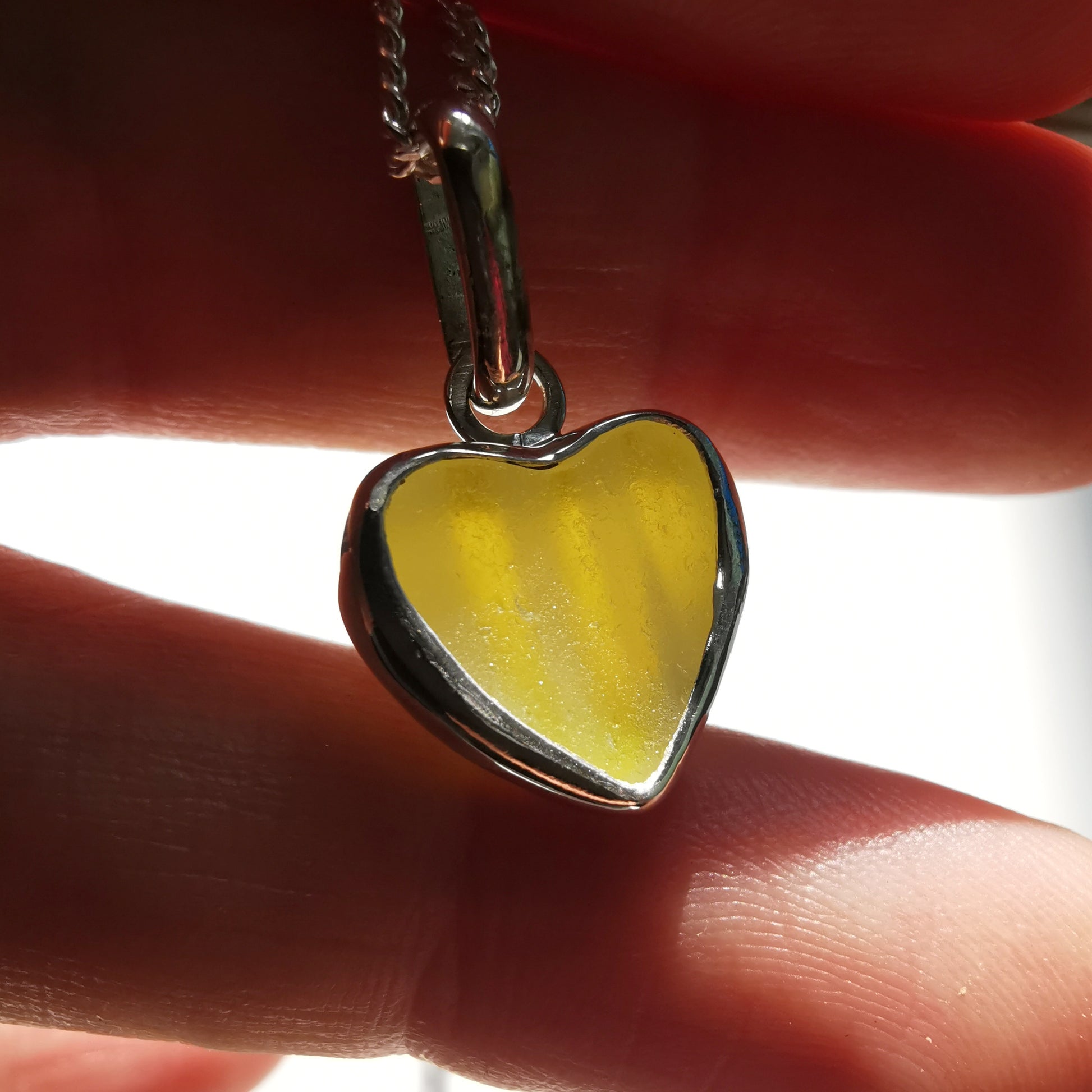 One of a kind pendant composed with genuine Scottish yellow and white sea glass. The sea glass is wrapped in fine silver bezel, the chain is sterling silver. I've shaped this sea glass heart myself.