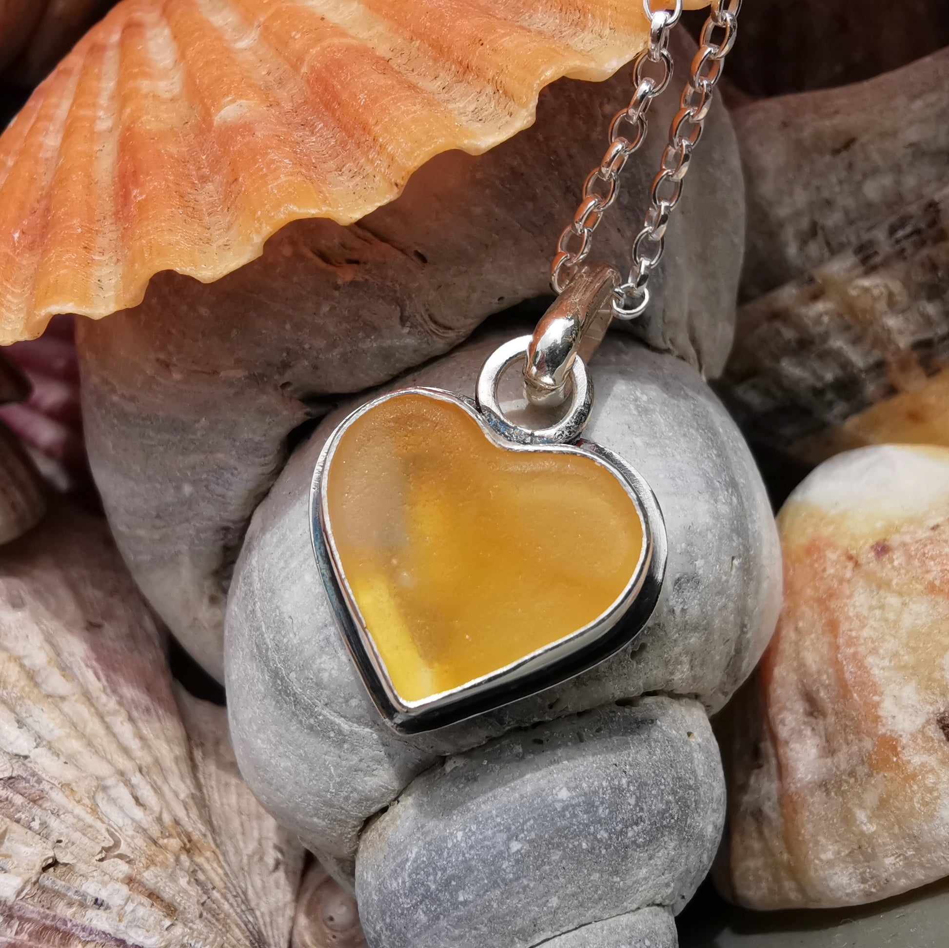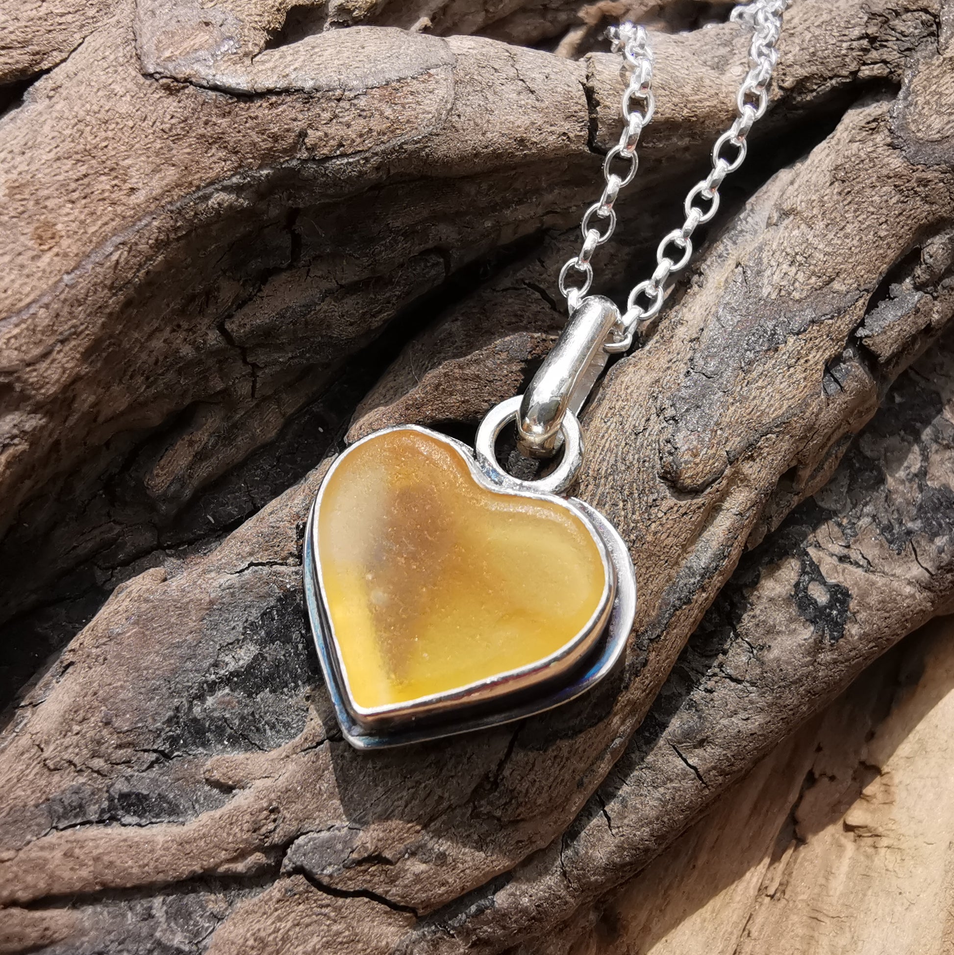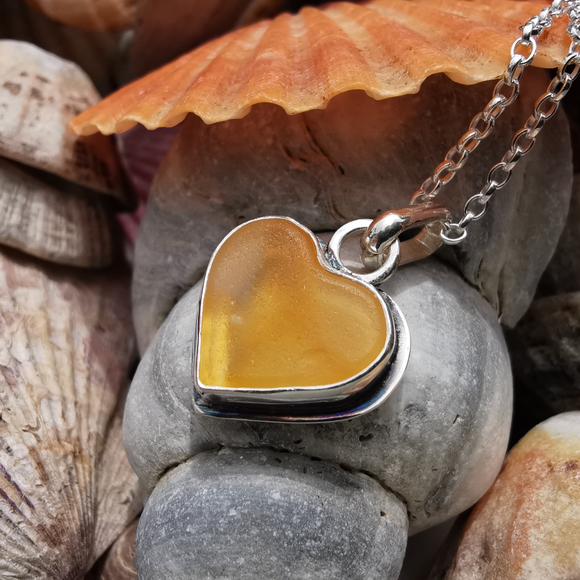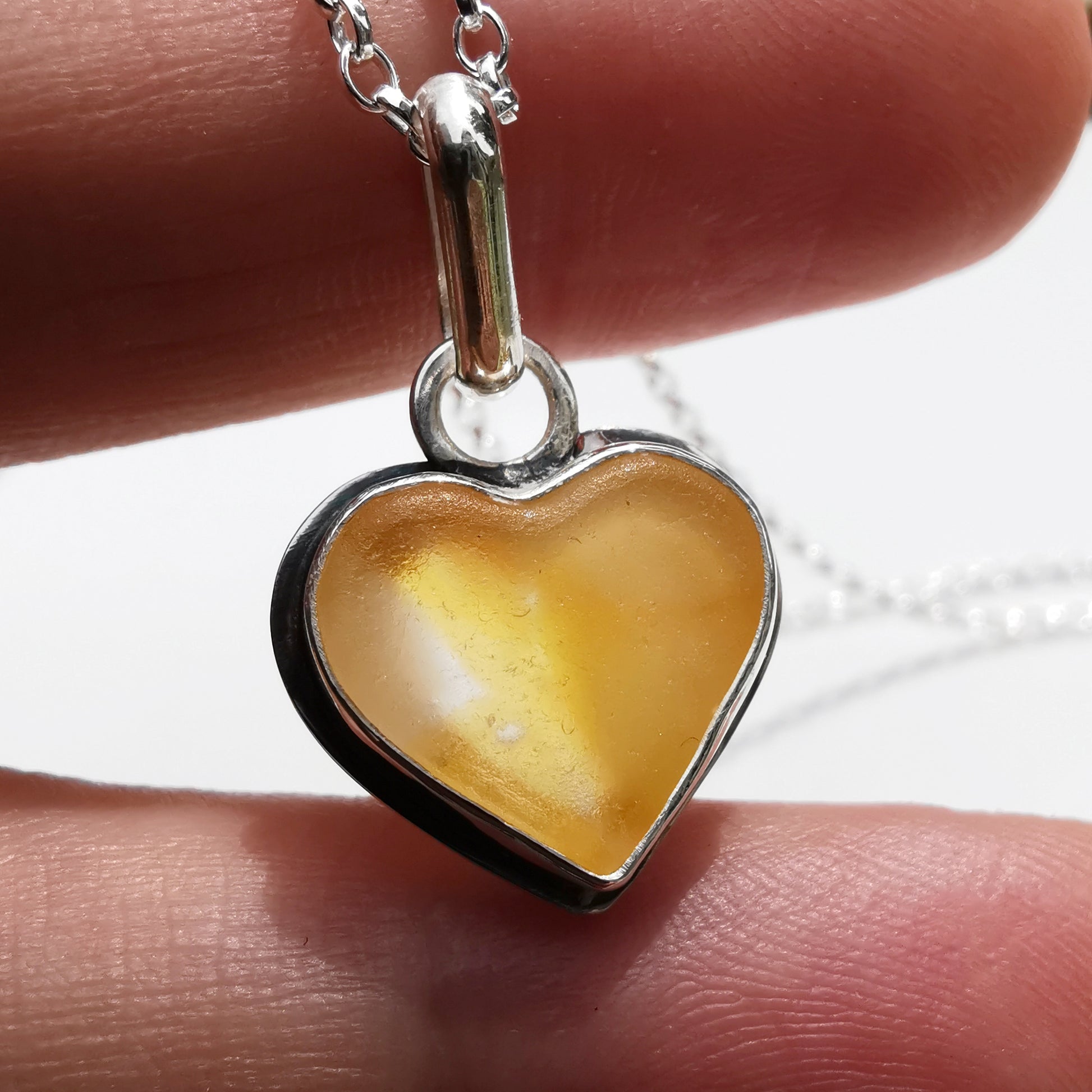 Scottish yellow sea glass heart pendant, sterling silver necklace.
