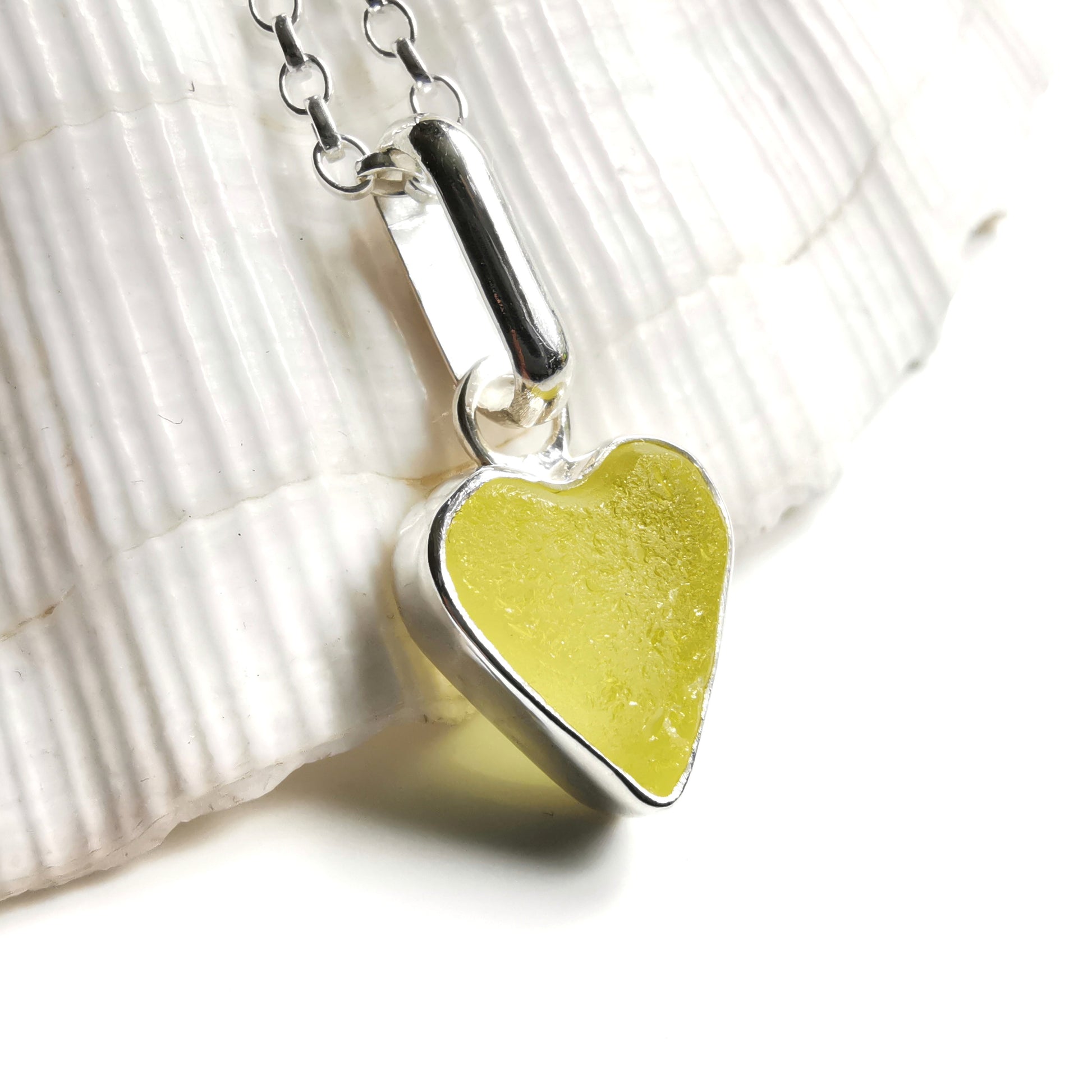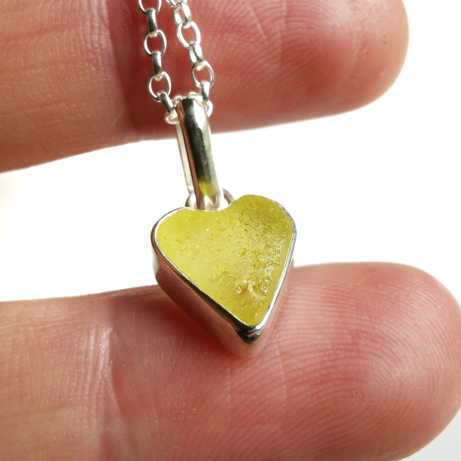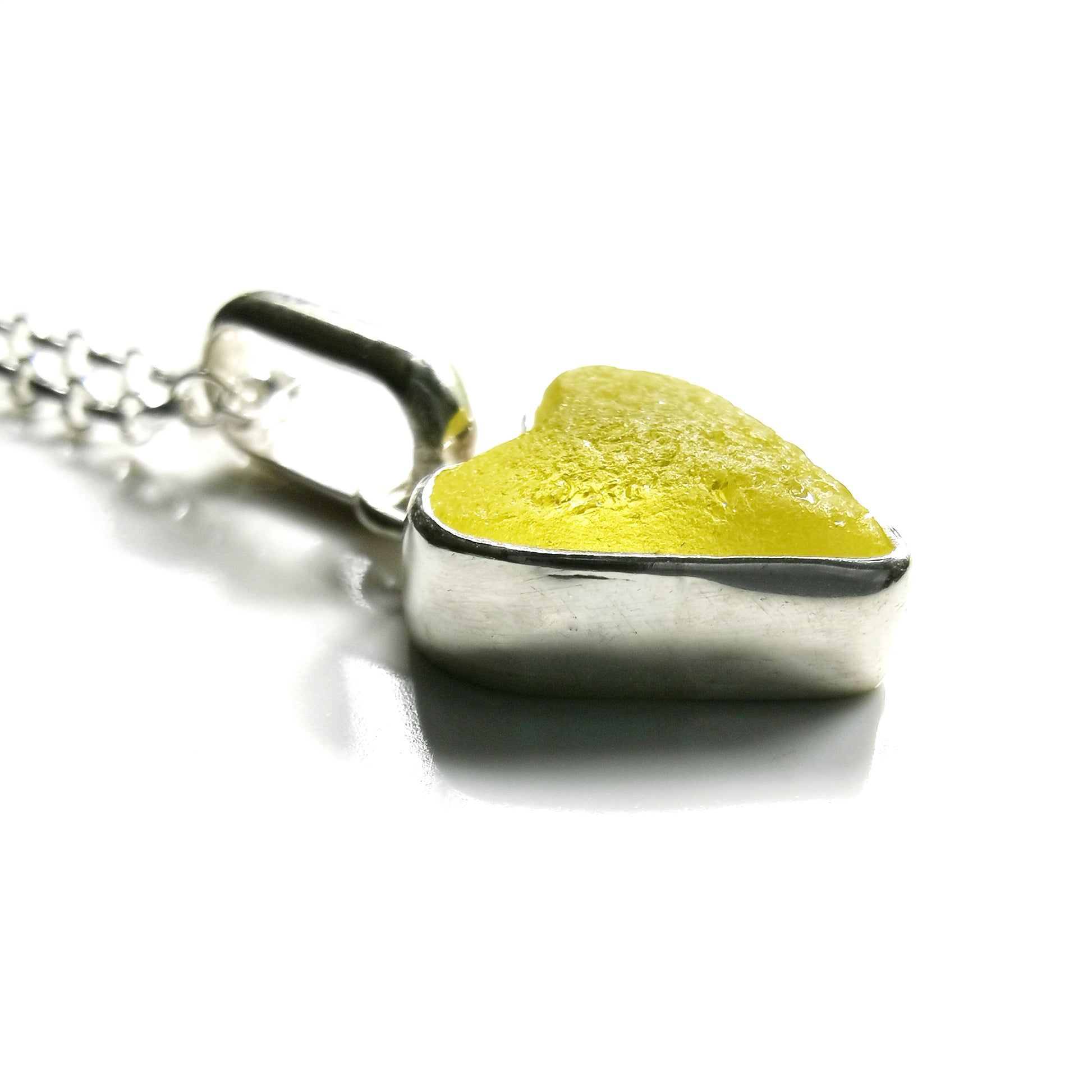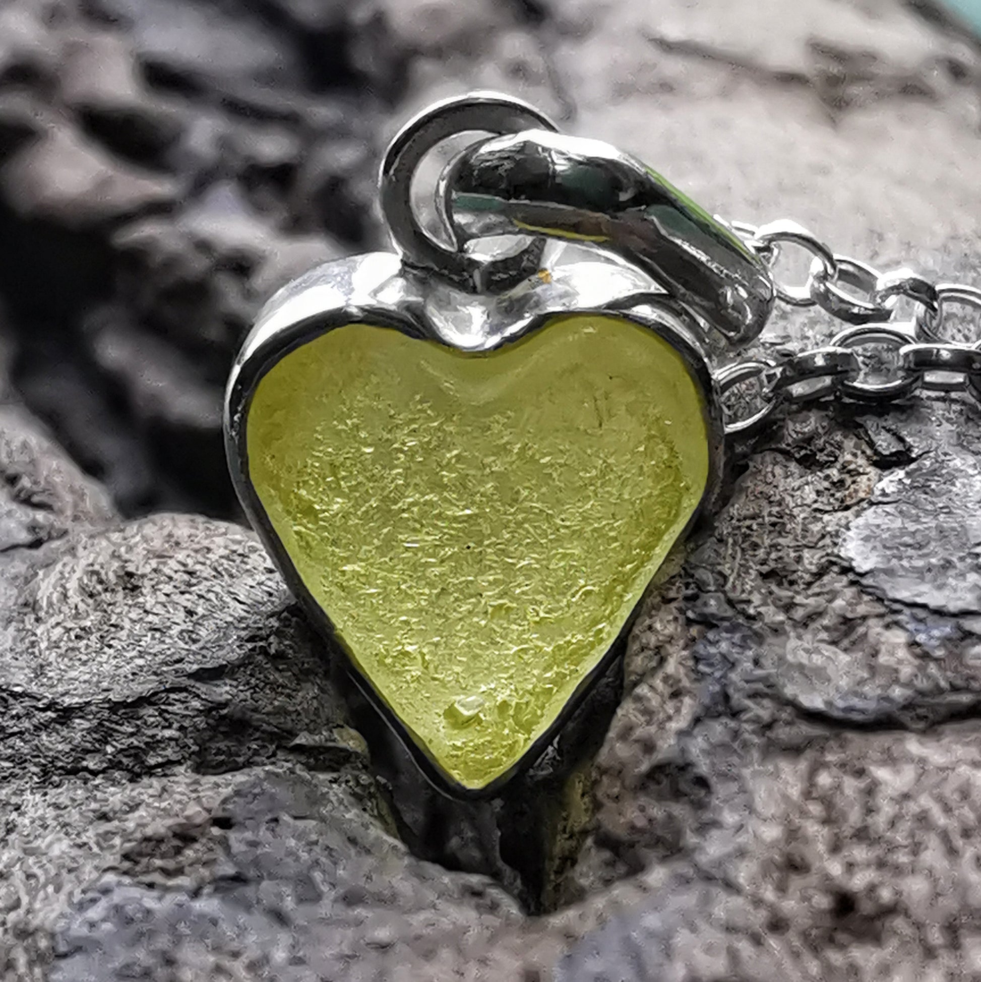Scottish yellow UV sea glass & sterling silver heart pendant.