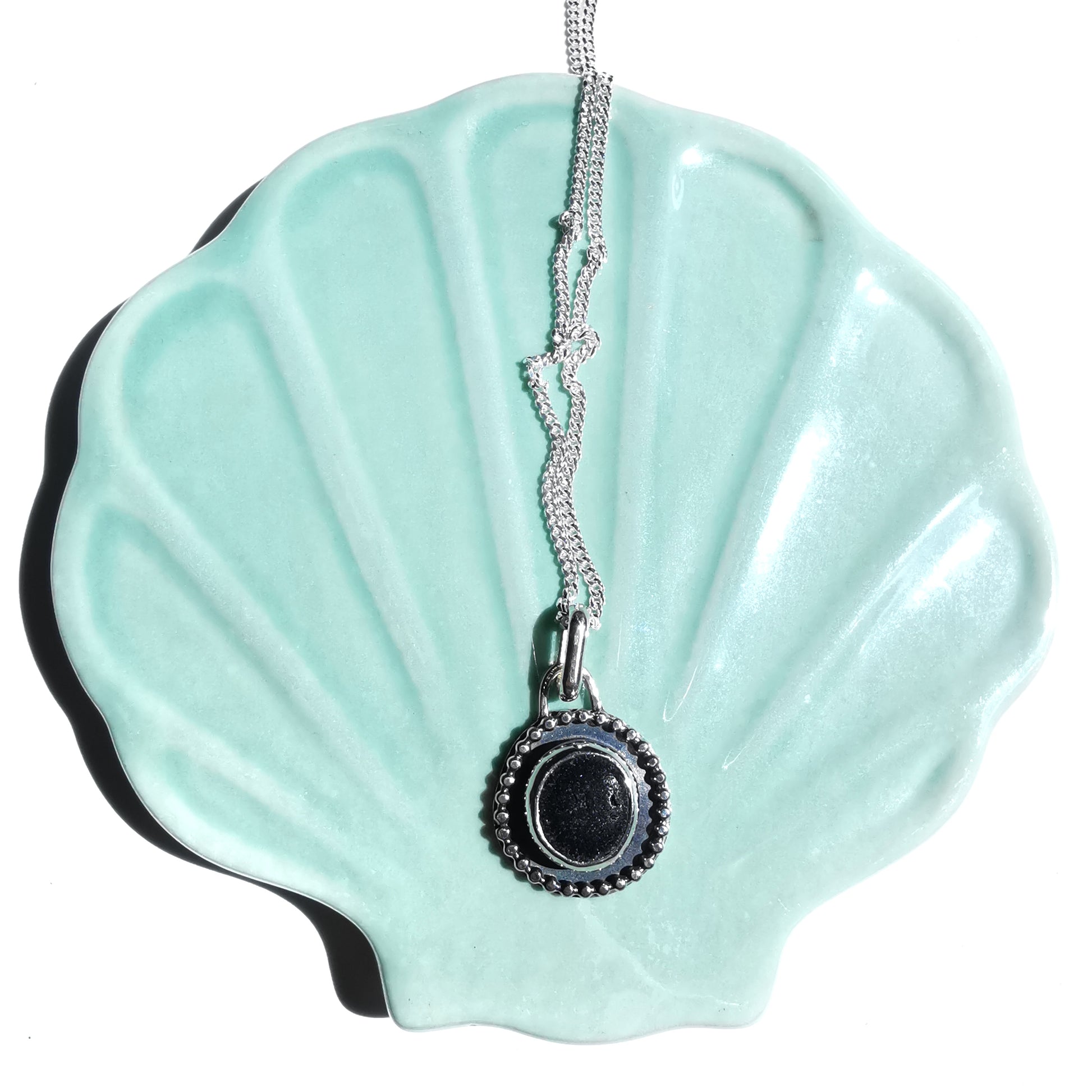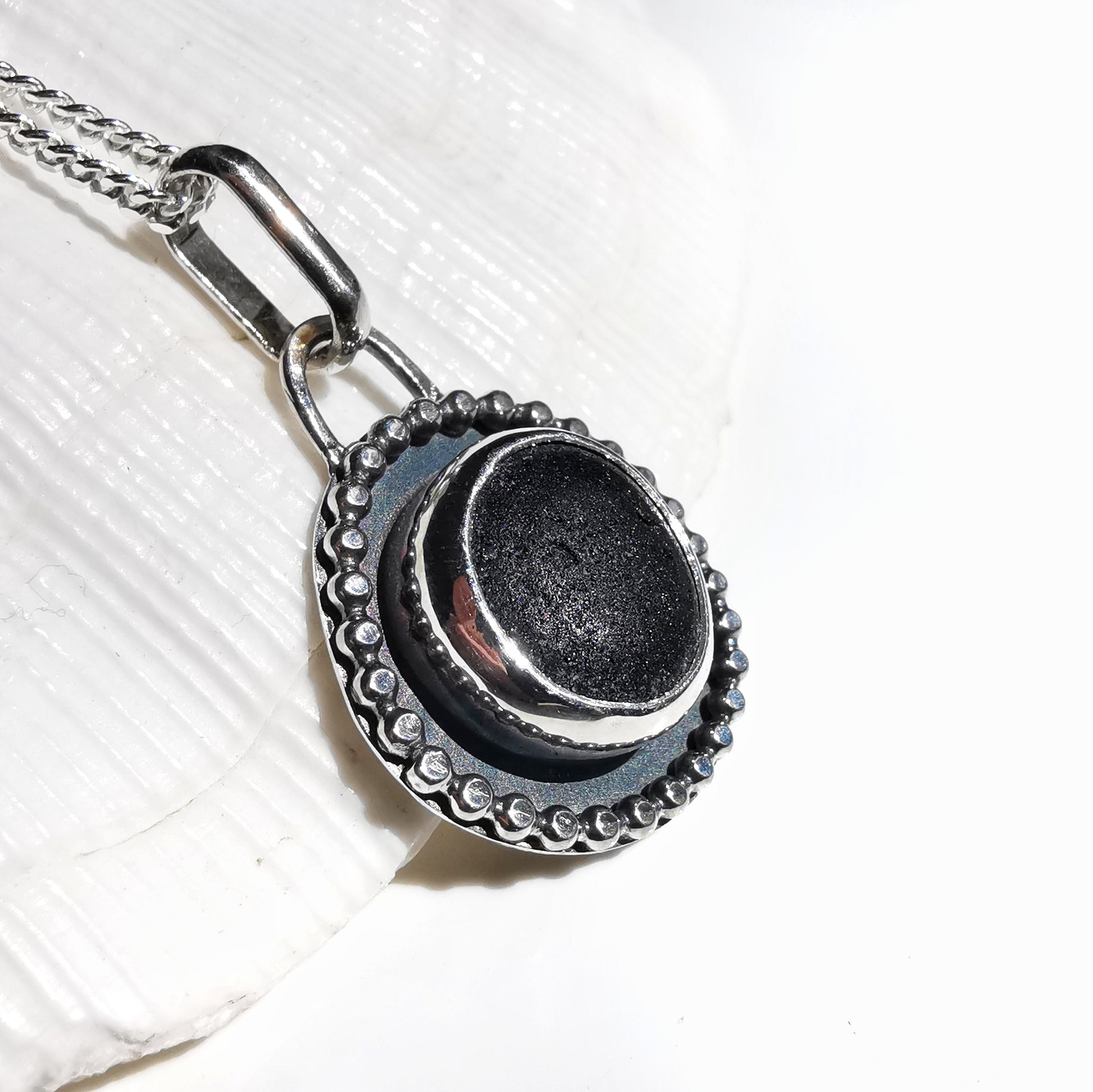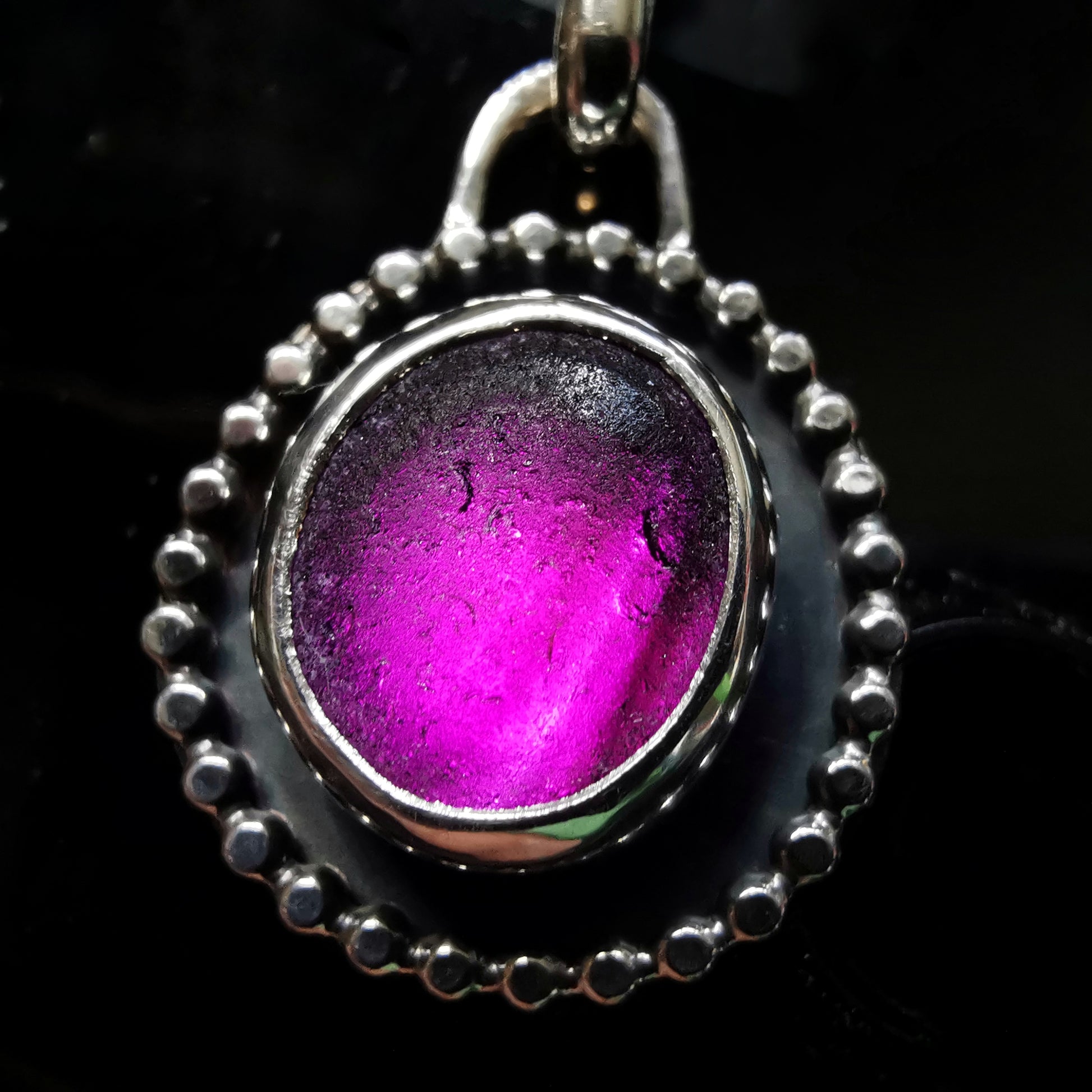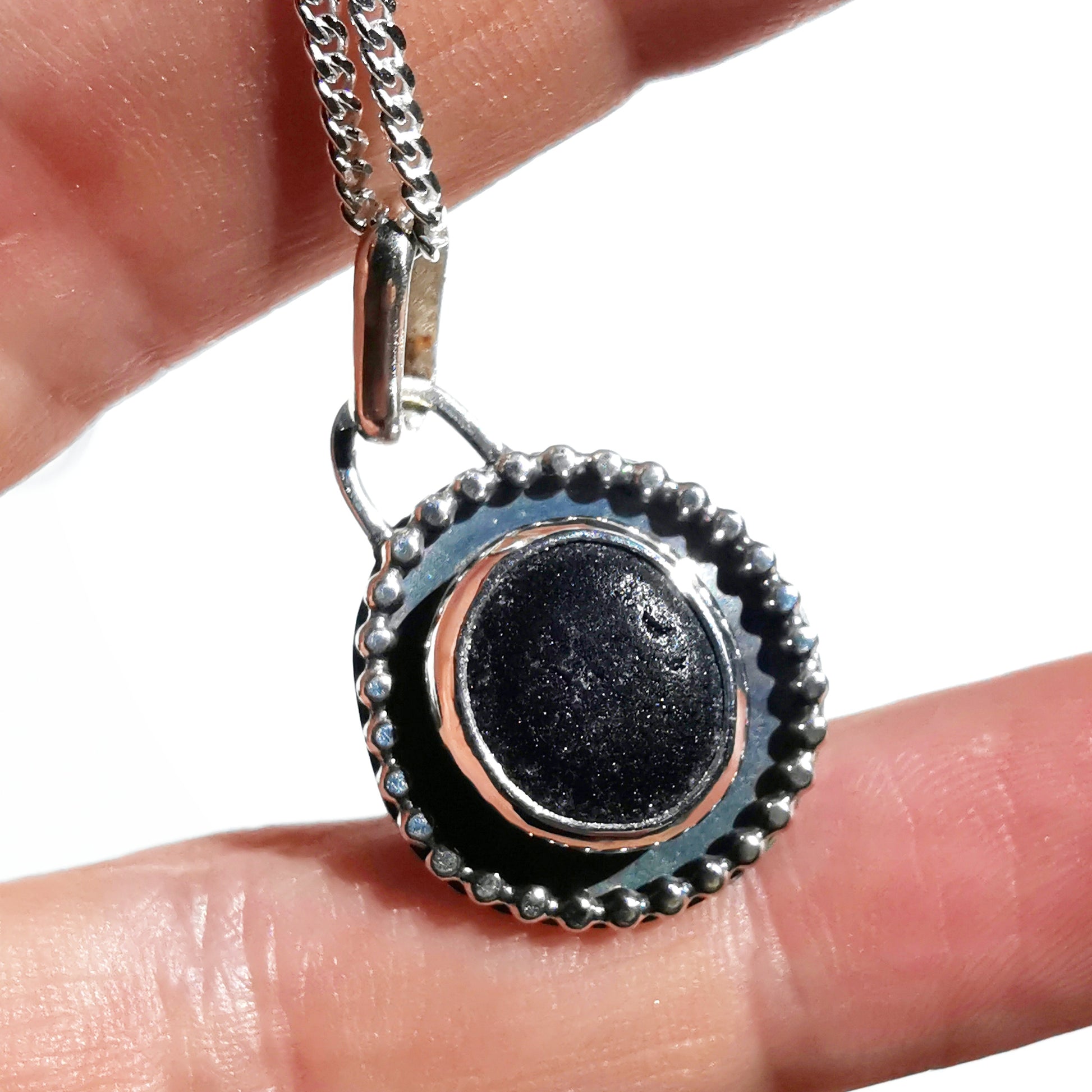 Seaham black sea glass with hidden colour & sterling silver pendant.