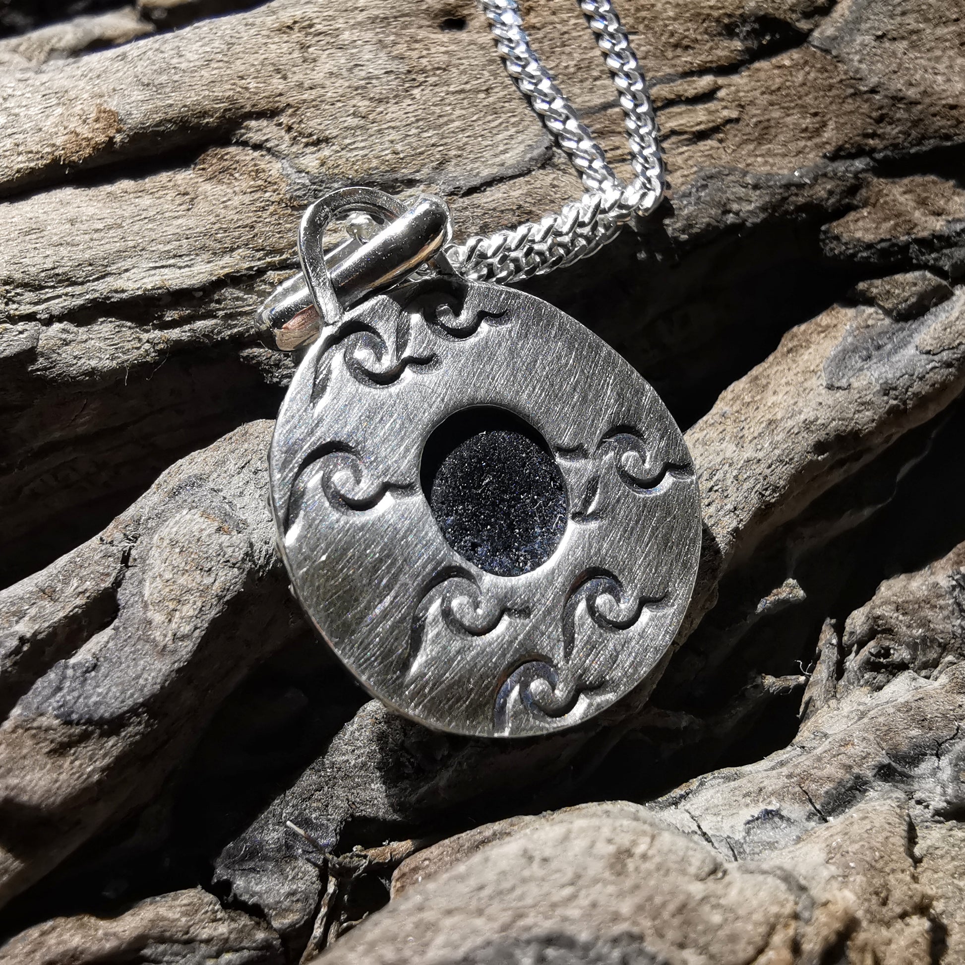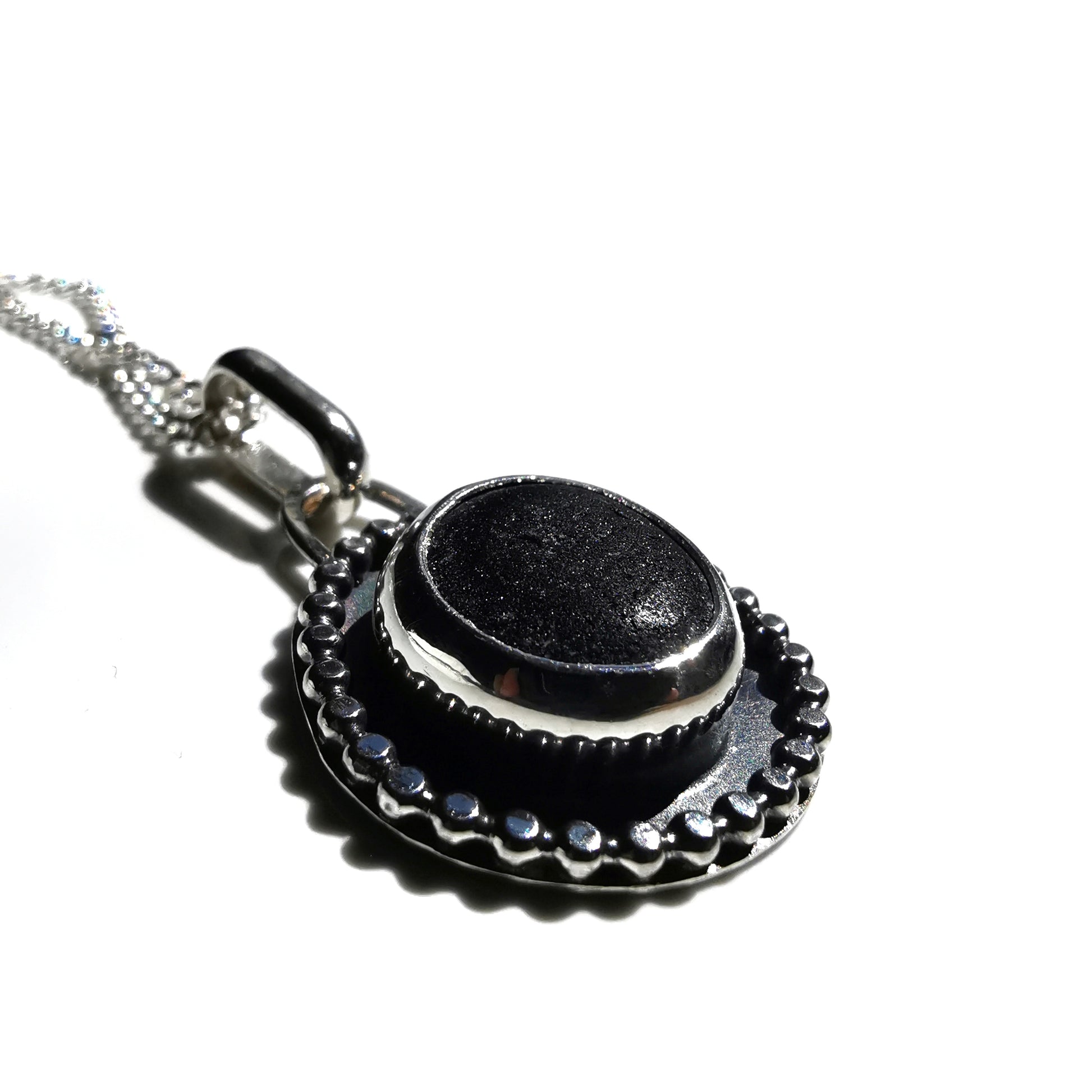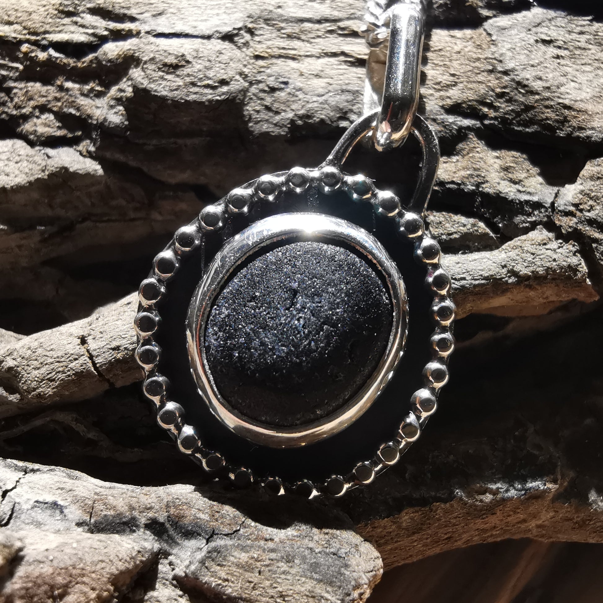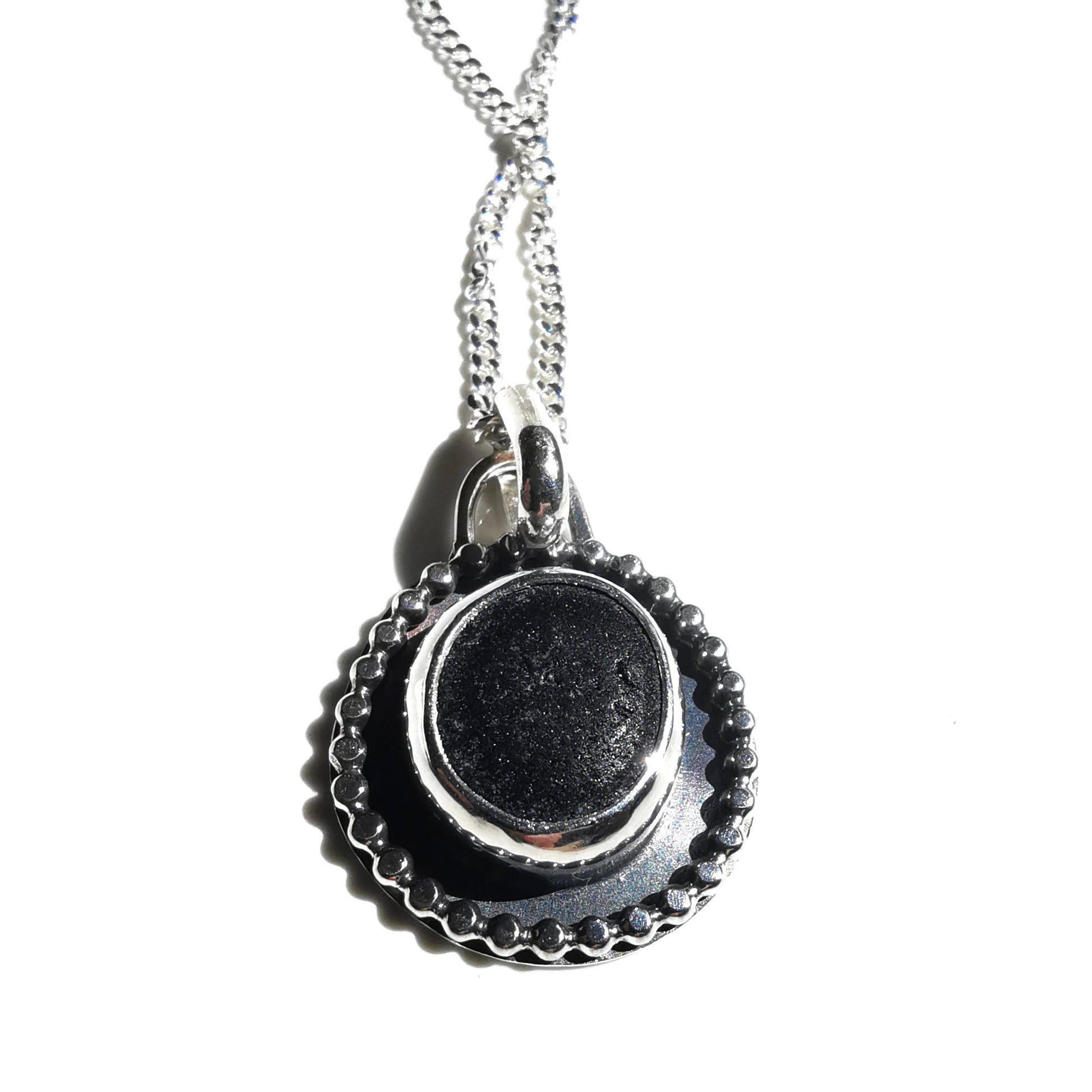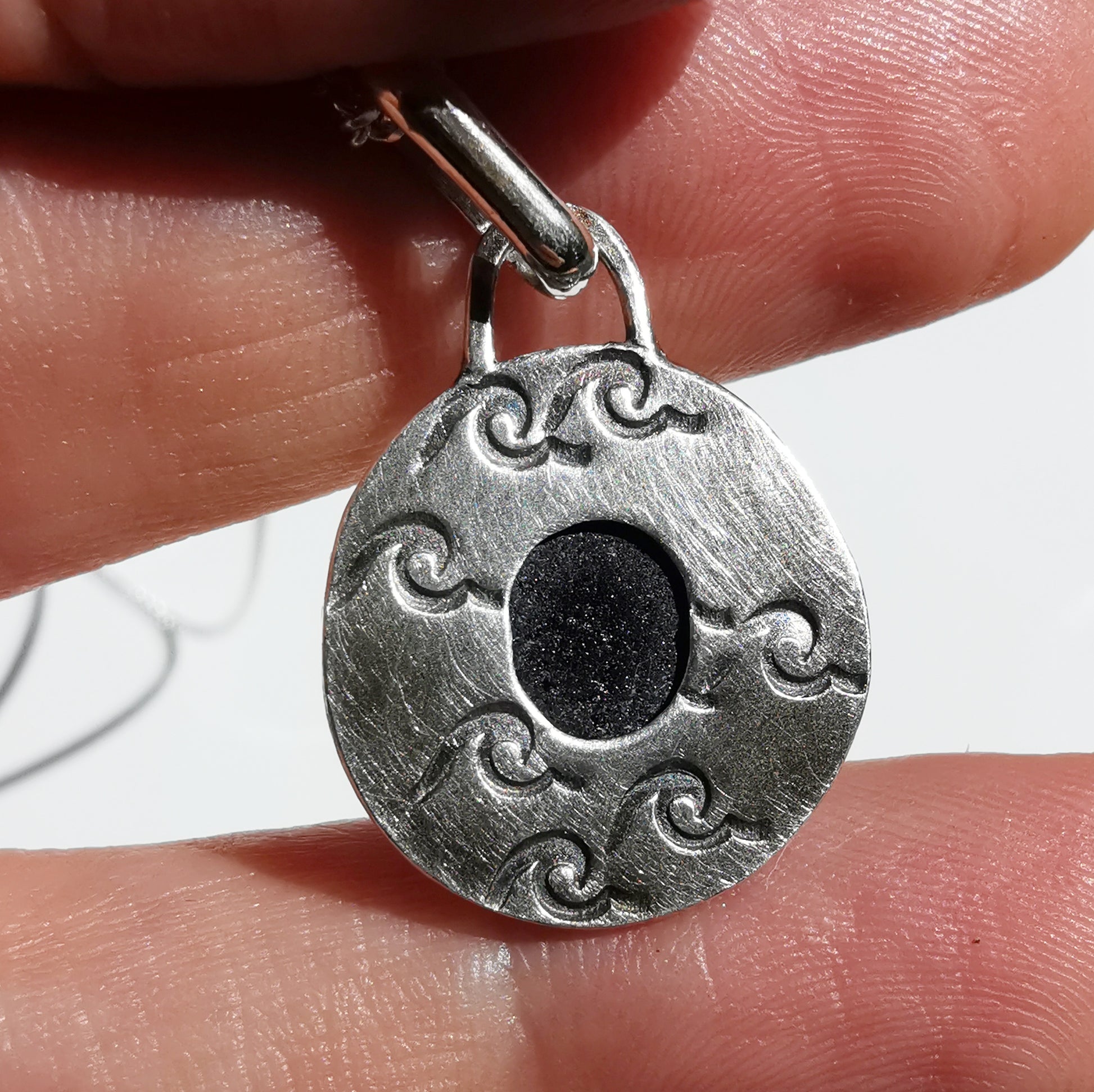 Seaham black sea glass with hidden colour & sterling silver pendant.