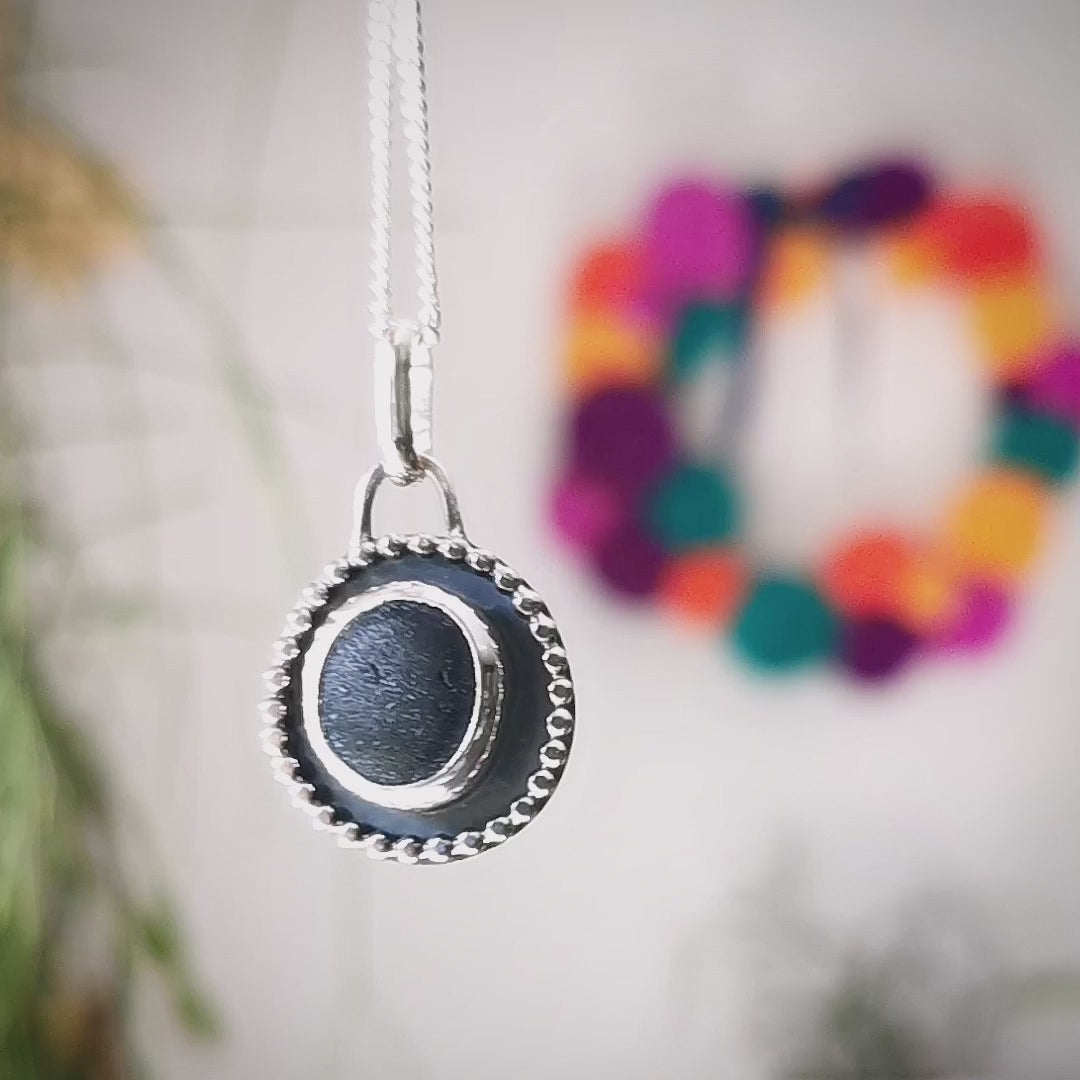 One of a kind pendant composed with genuine frosted black sea glass with surprising hidden colour, found by me in Seaham. The sea glass is set in backless fine silver bezel, the chain is sterling silver.