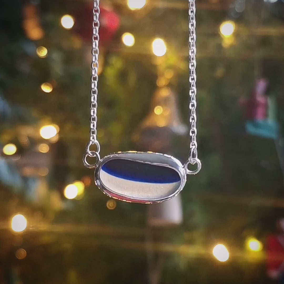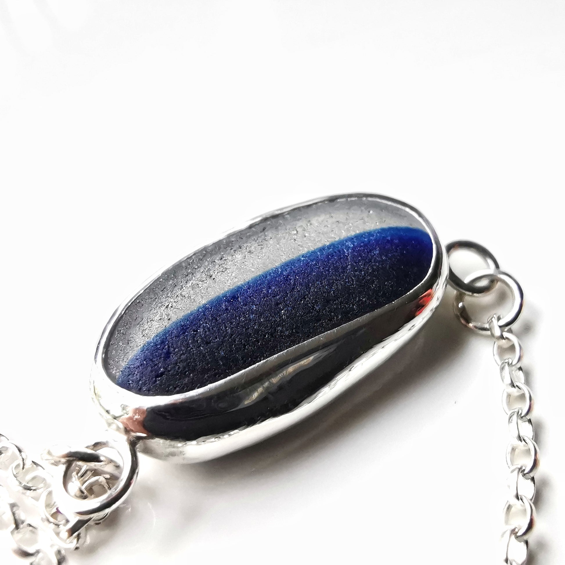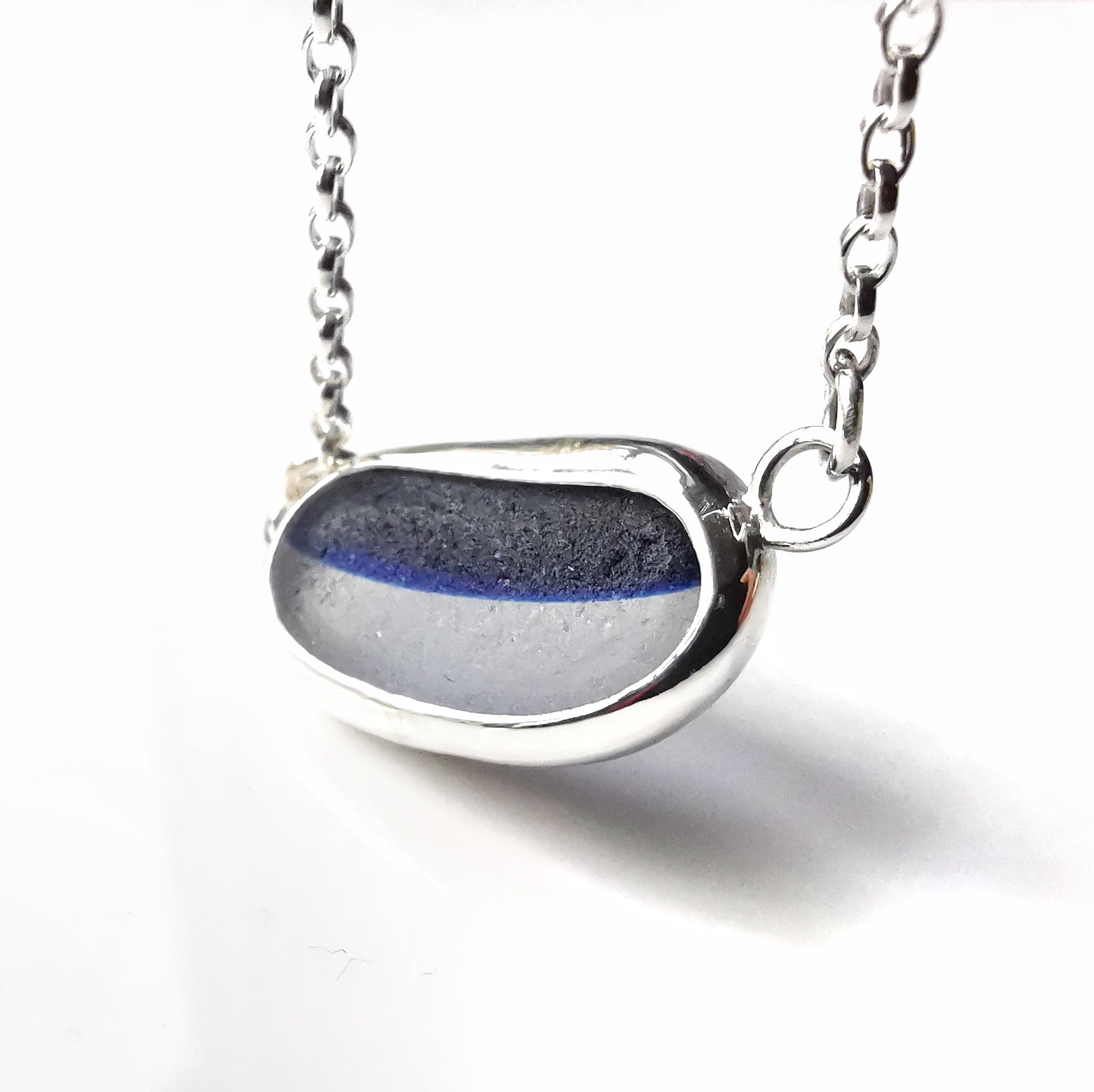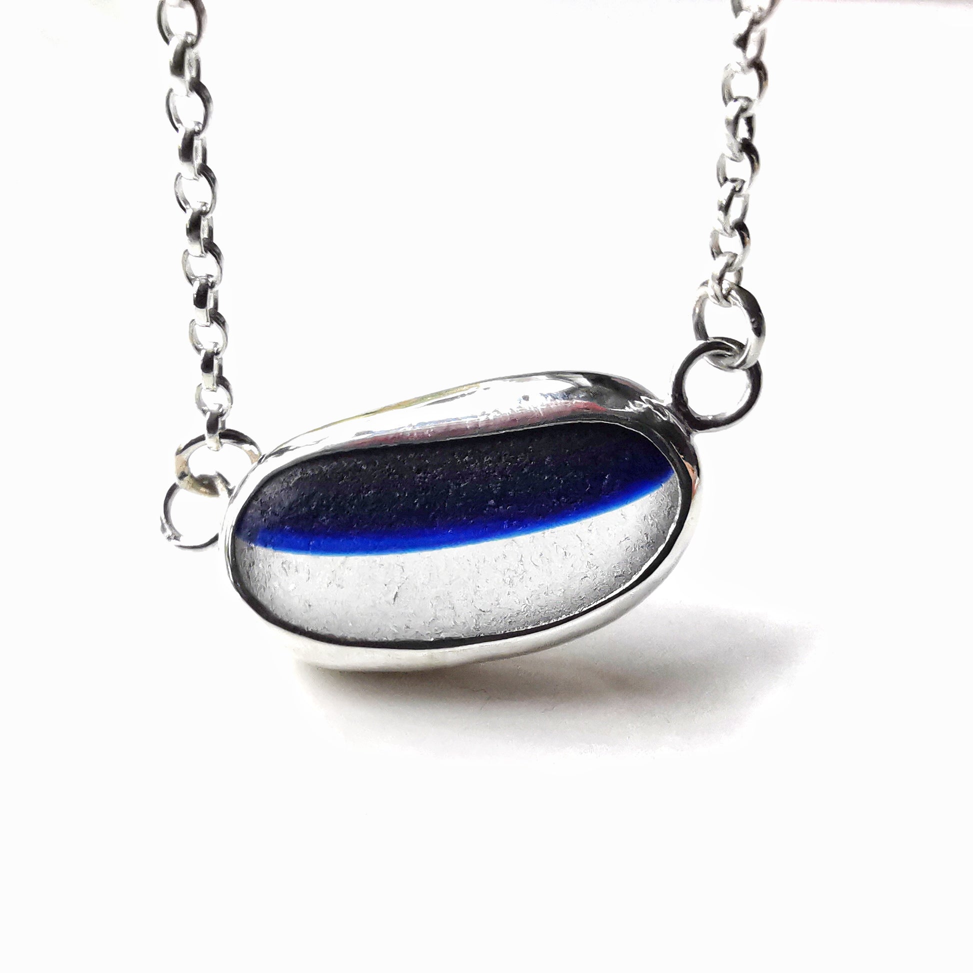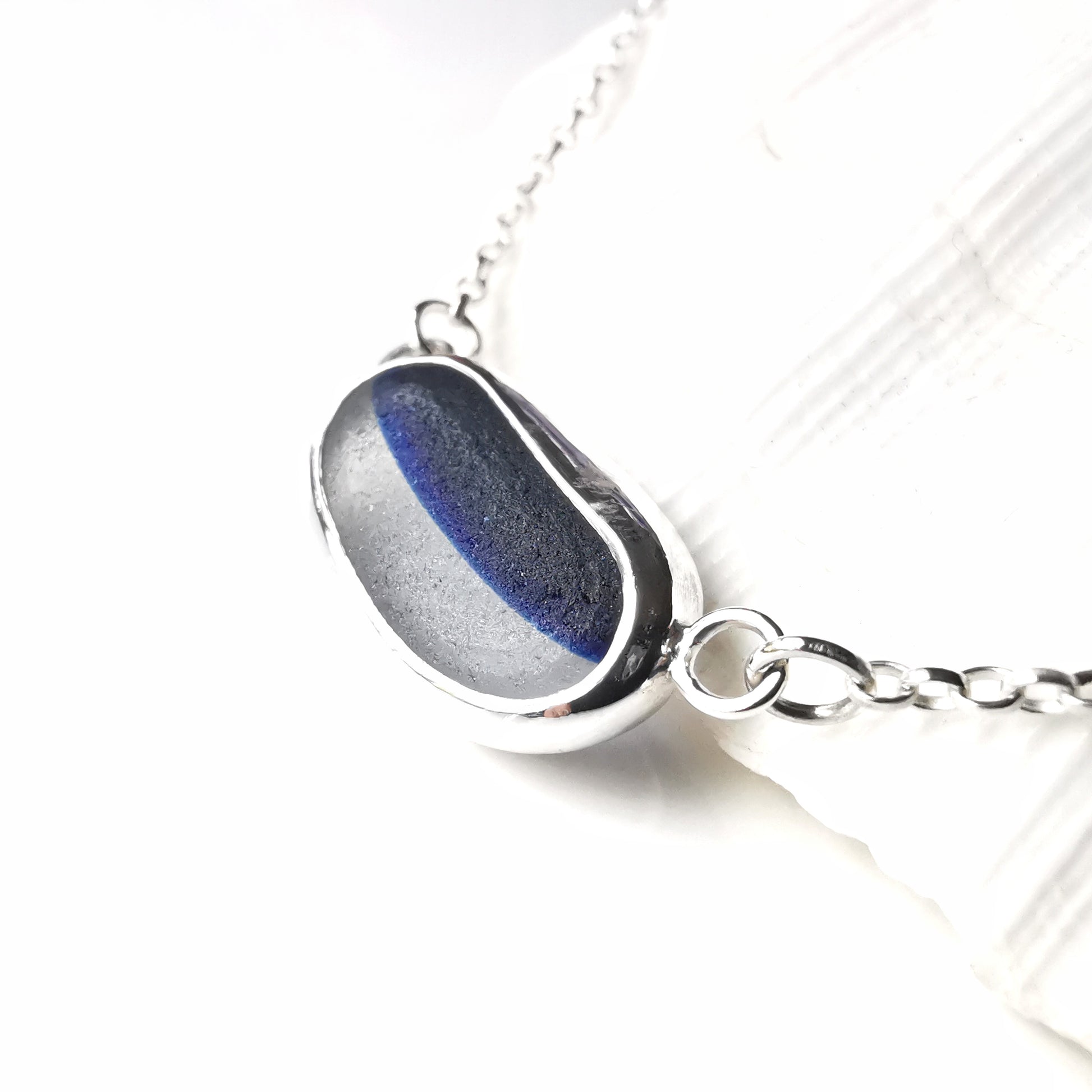 One of a kind pendant composed with genuine frosted blue and clear sea glass from Seaham. The sea glass is set in backless fine silver bezel, the chain is sterling silver.