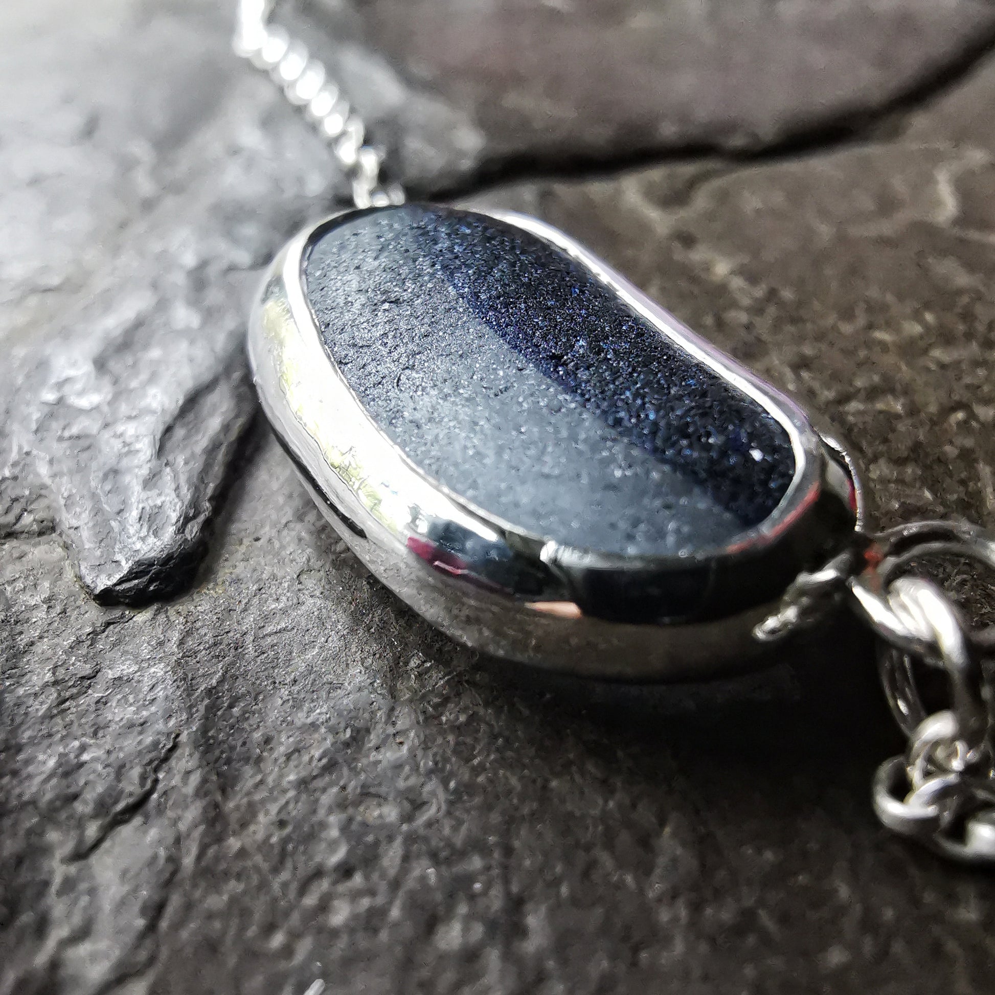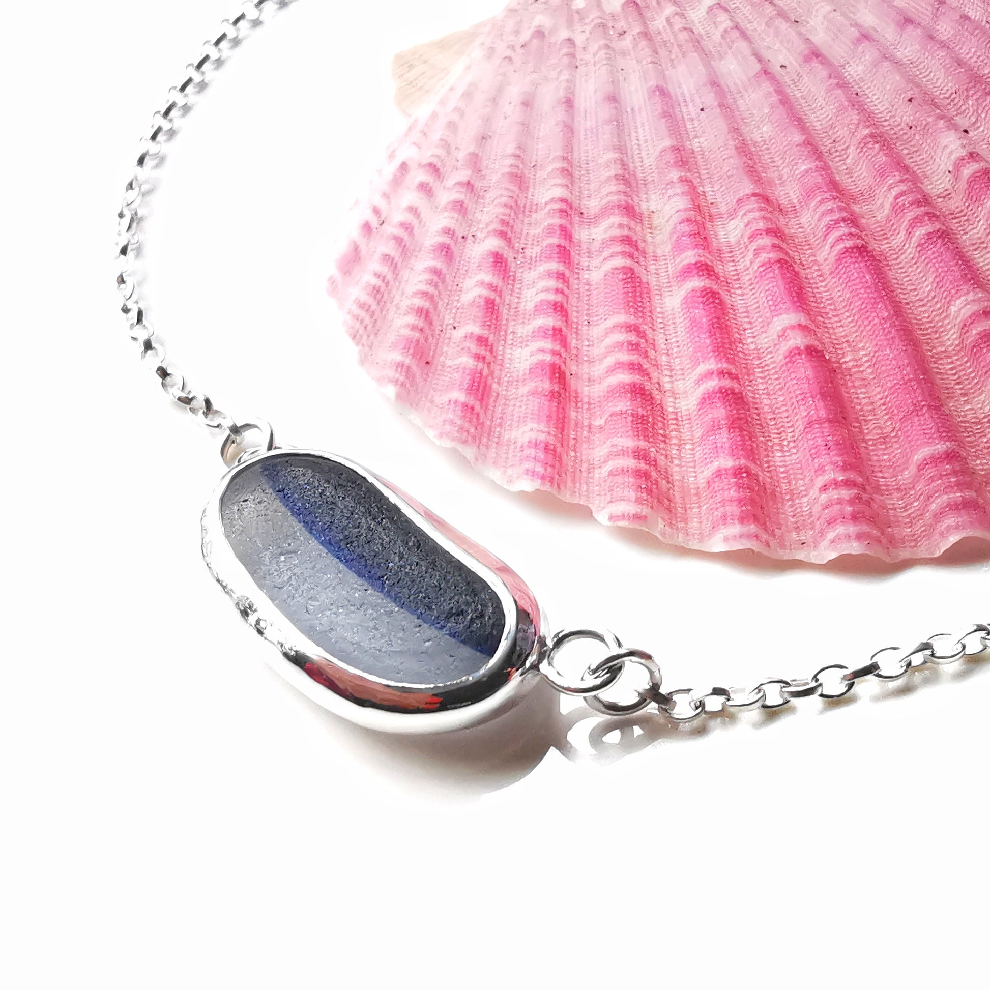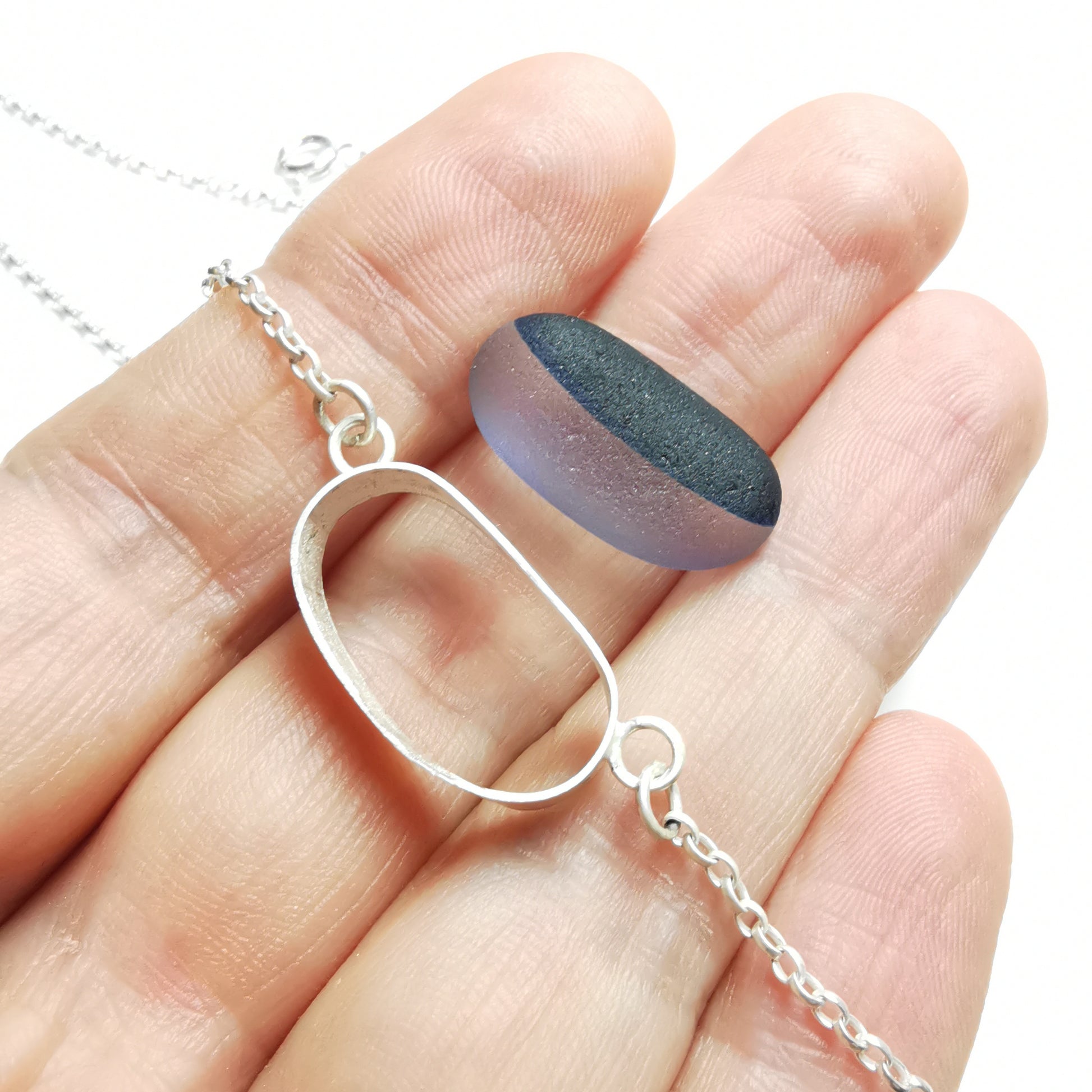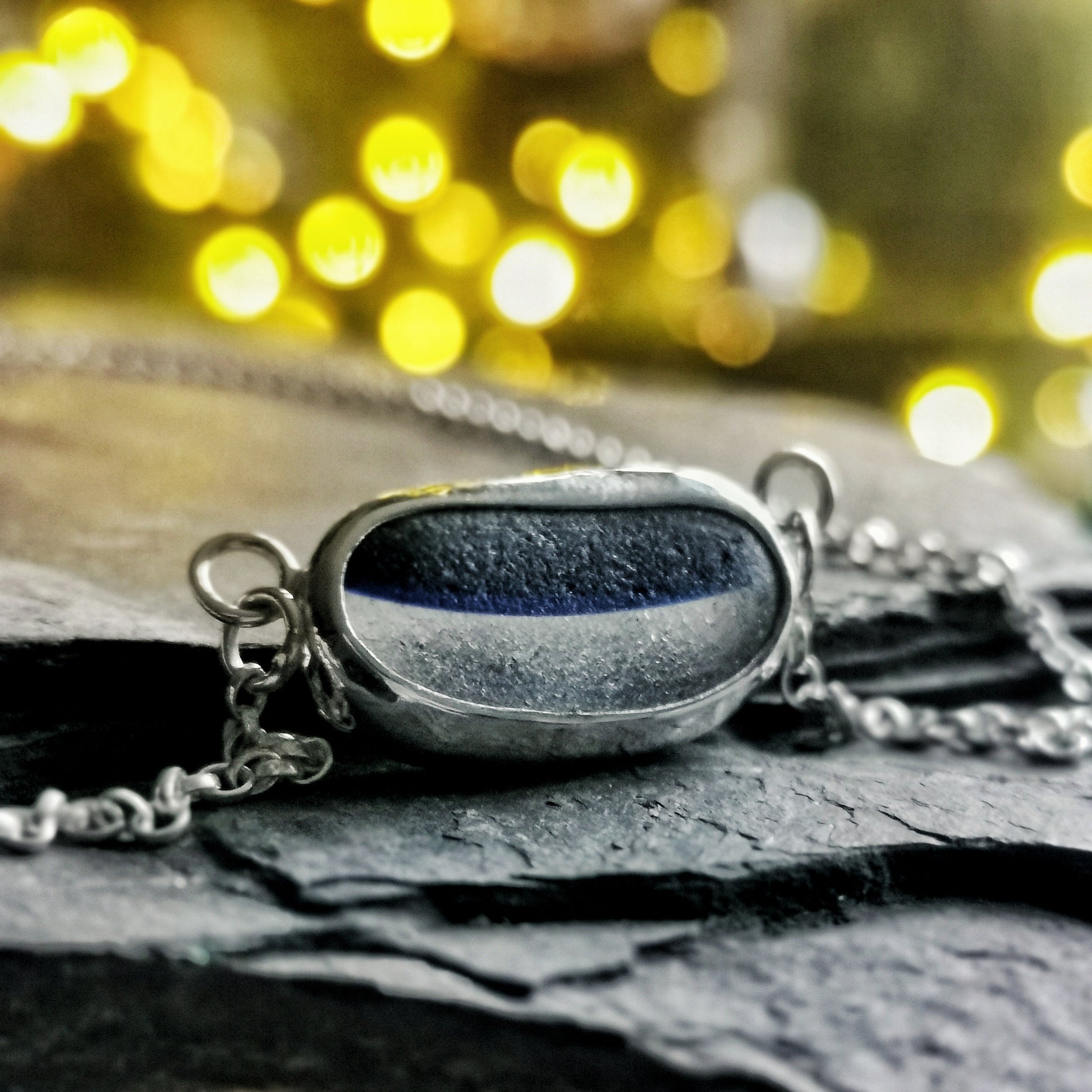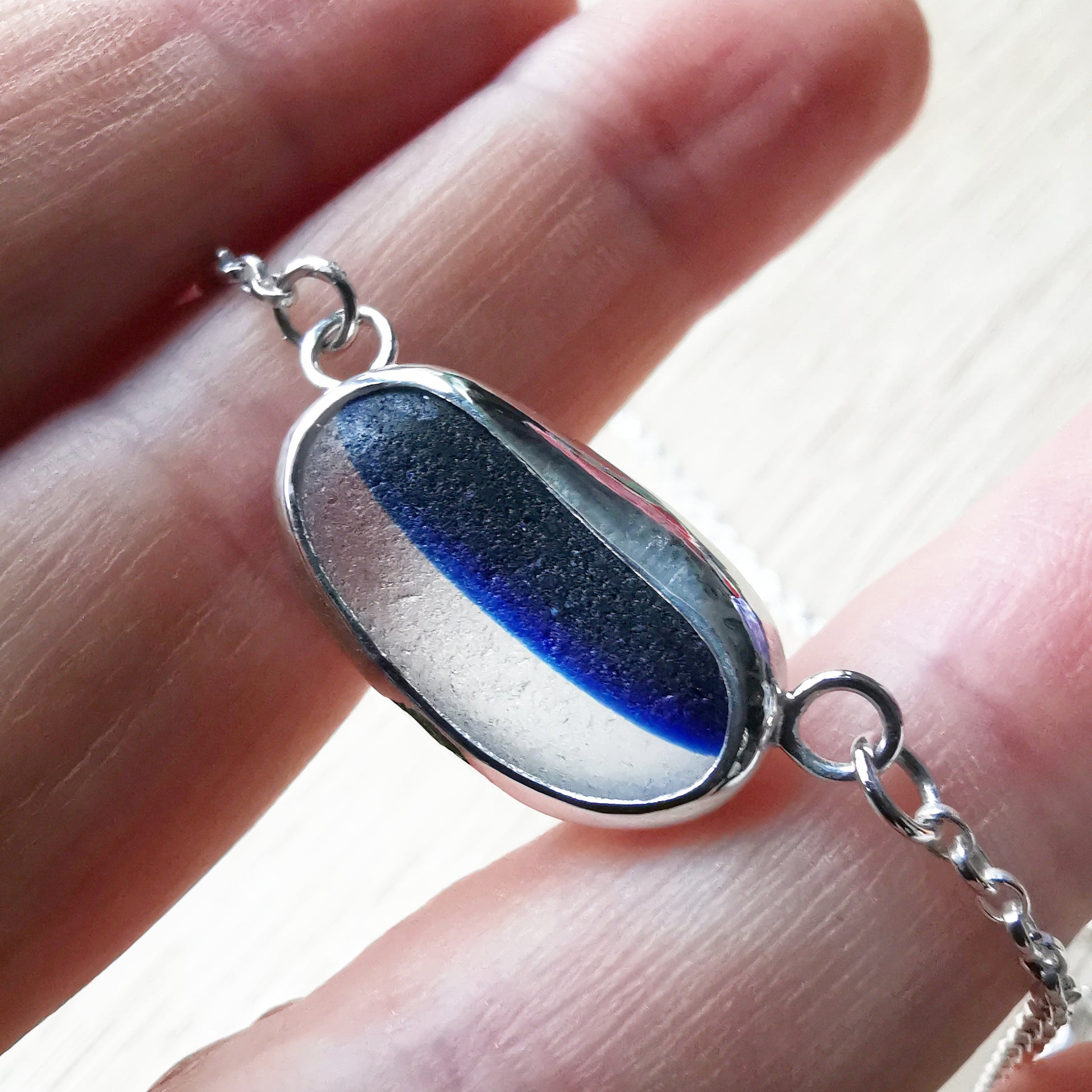 One of a kind pendant composed with genuine frosted blue and clear sea glass from Seaham. The sea glass is set in backless fine silver bezel, the chain is sterling silver.