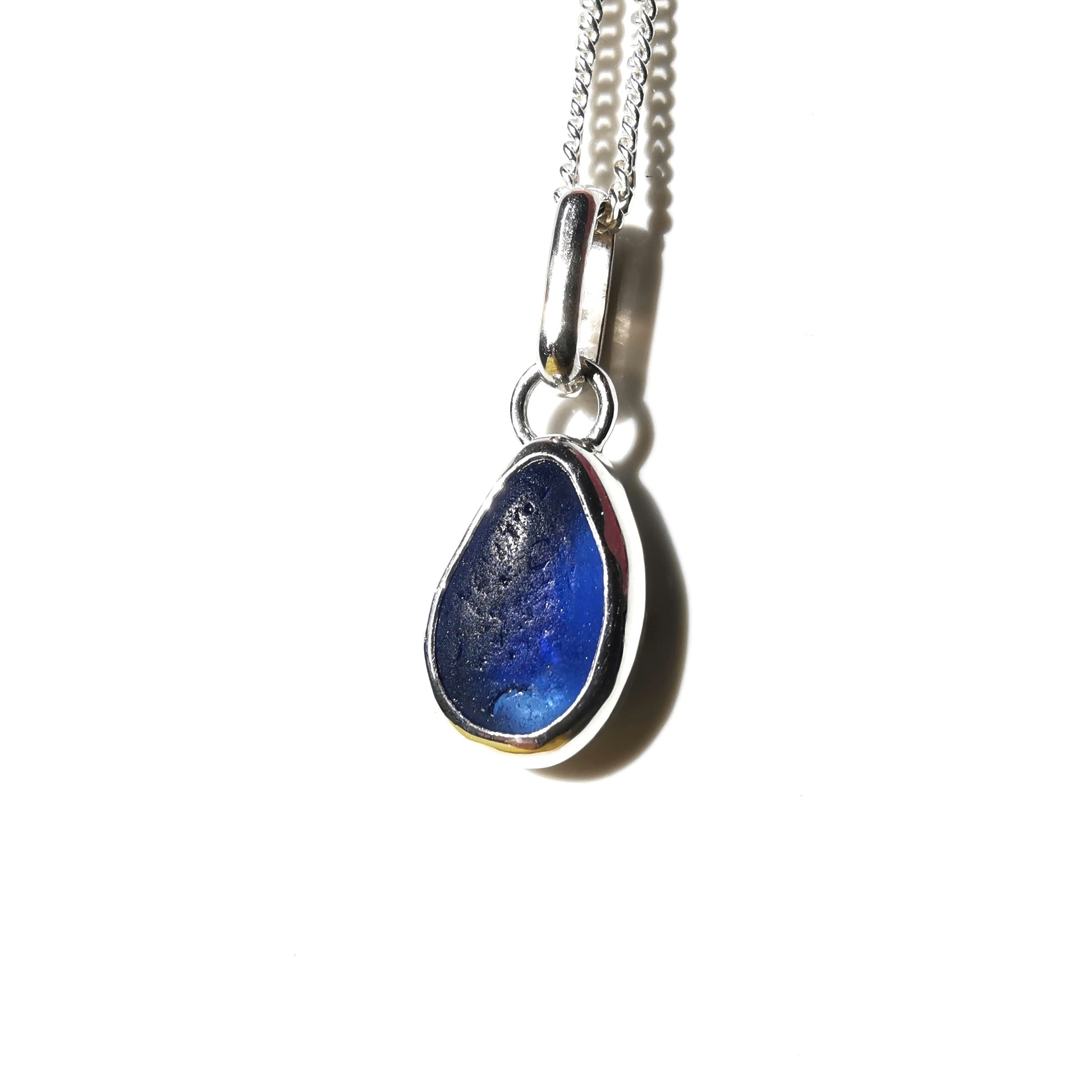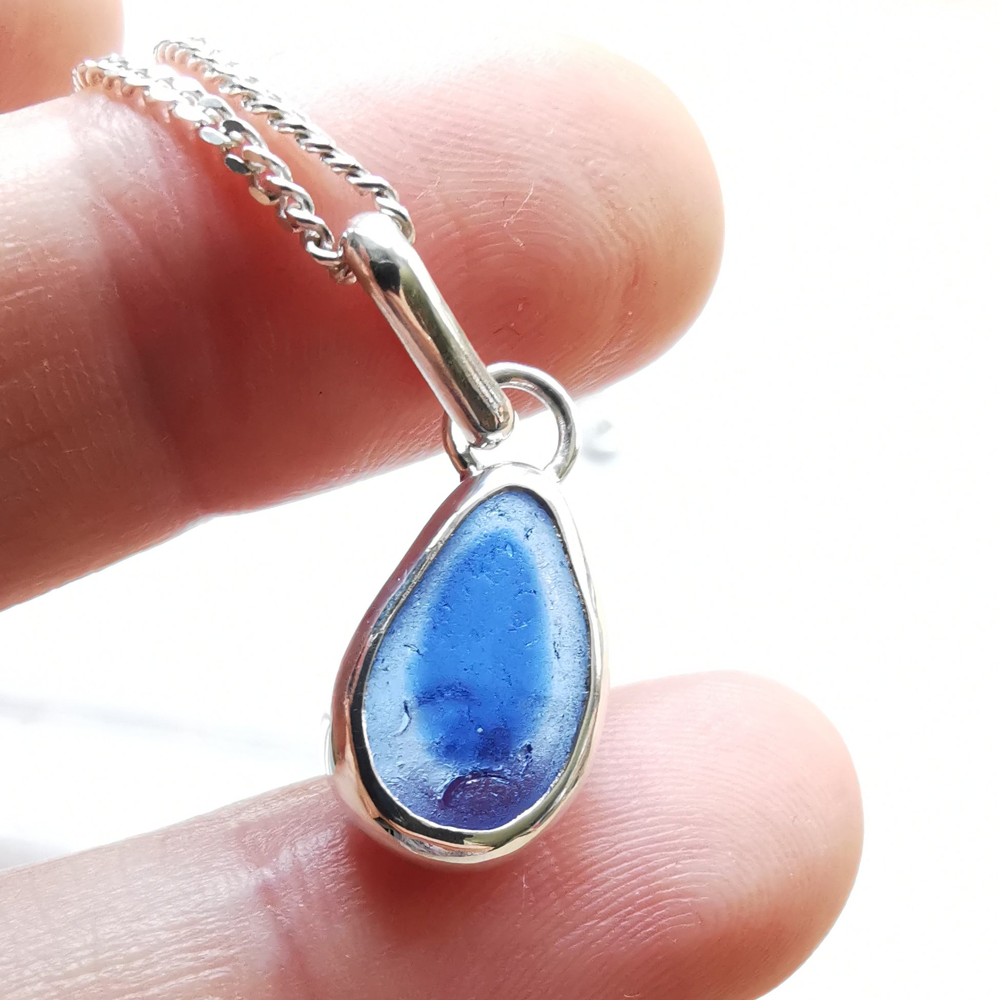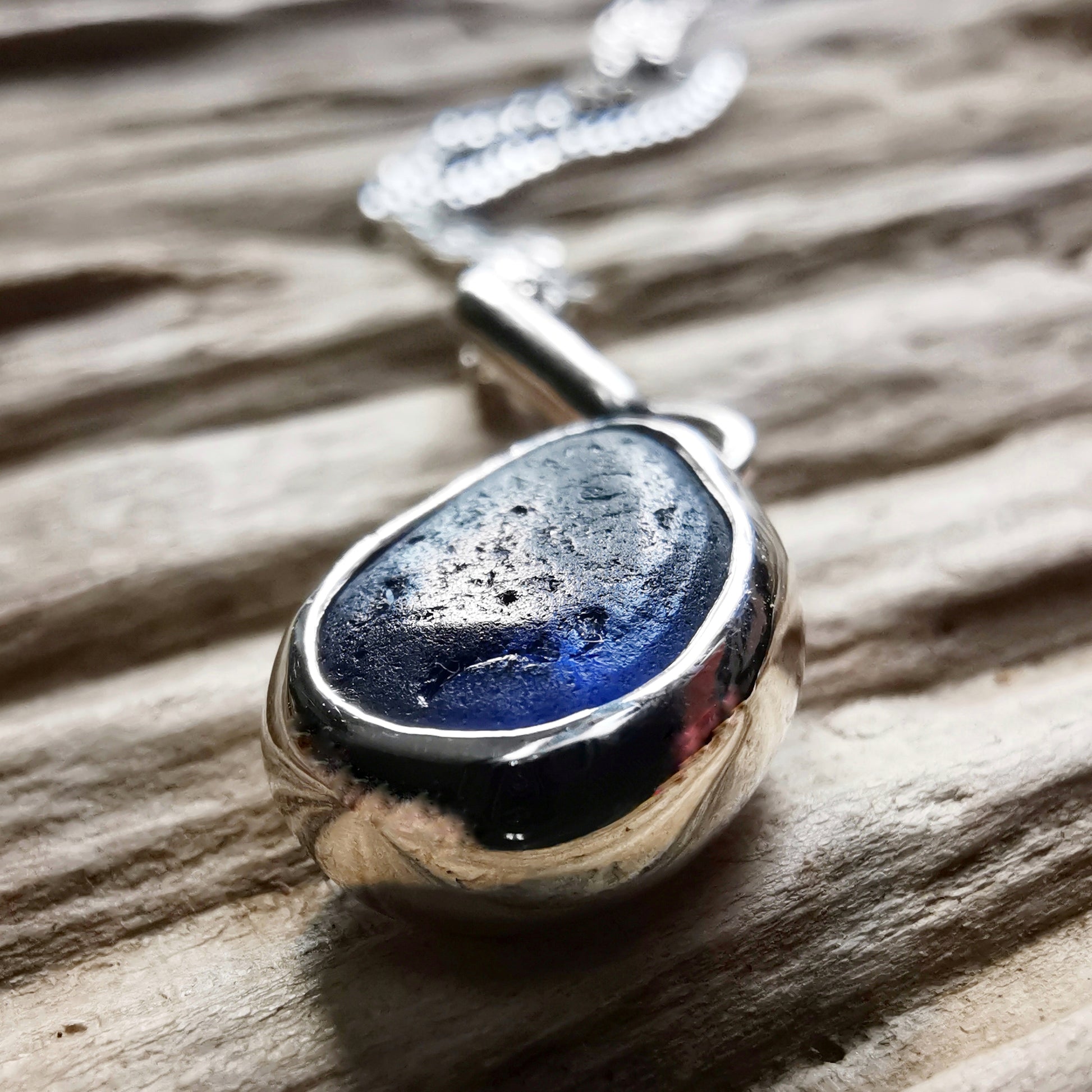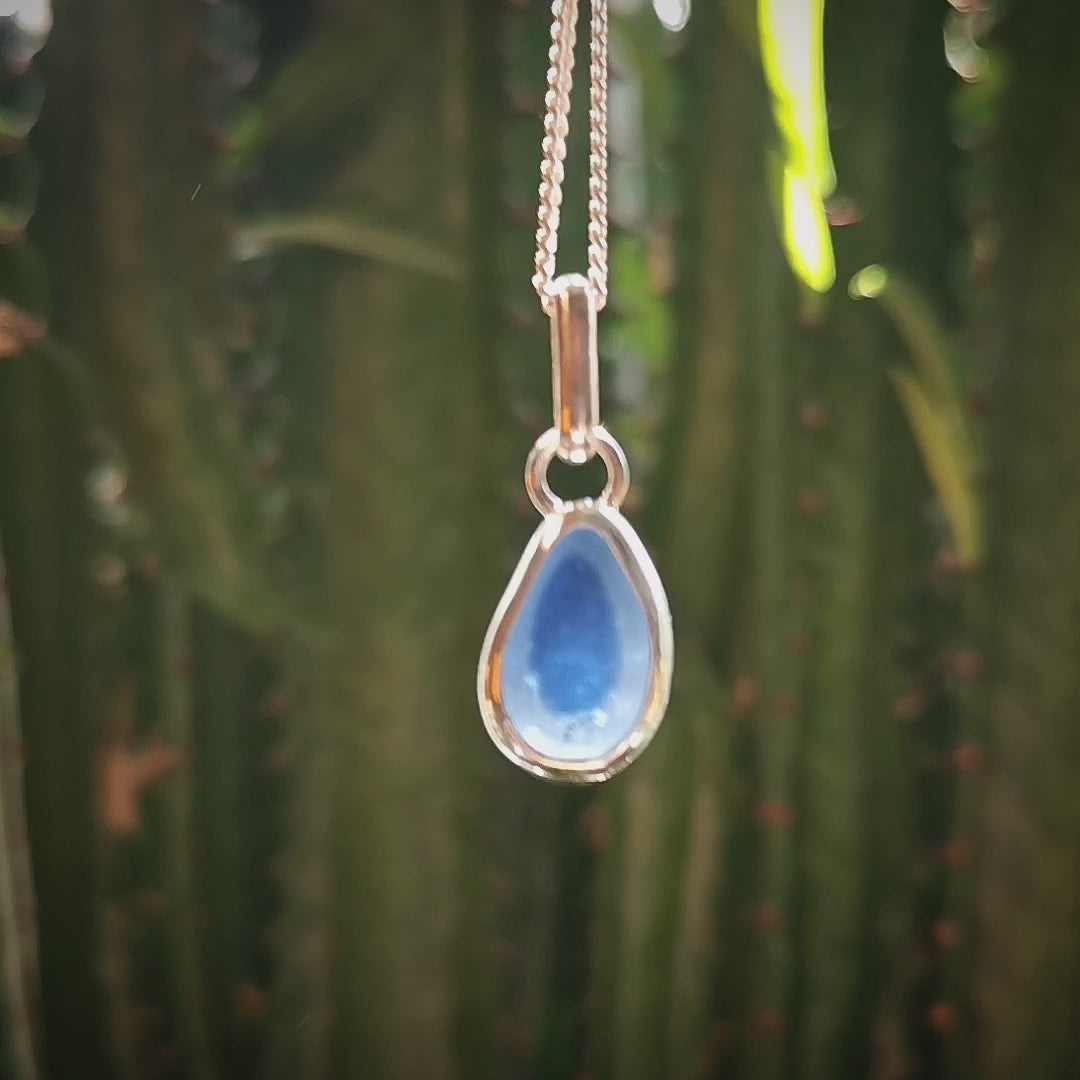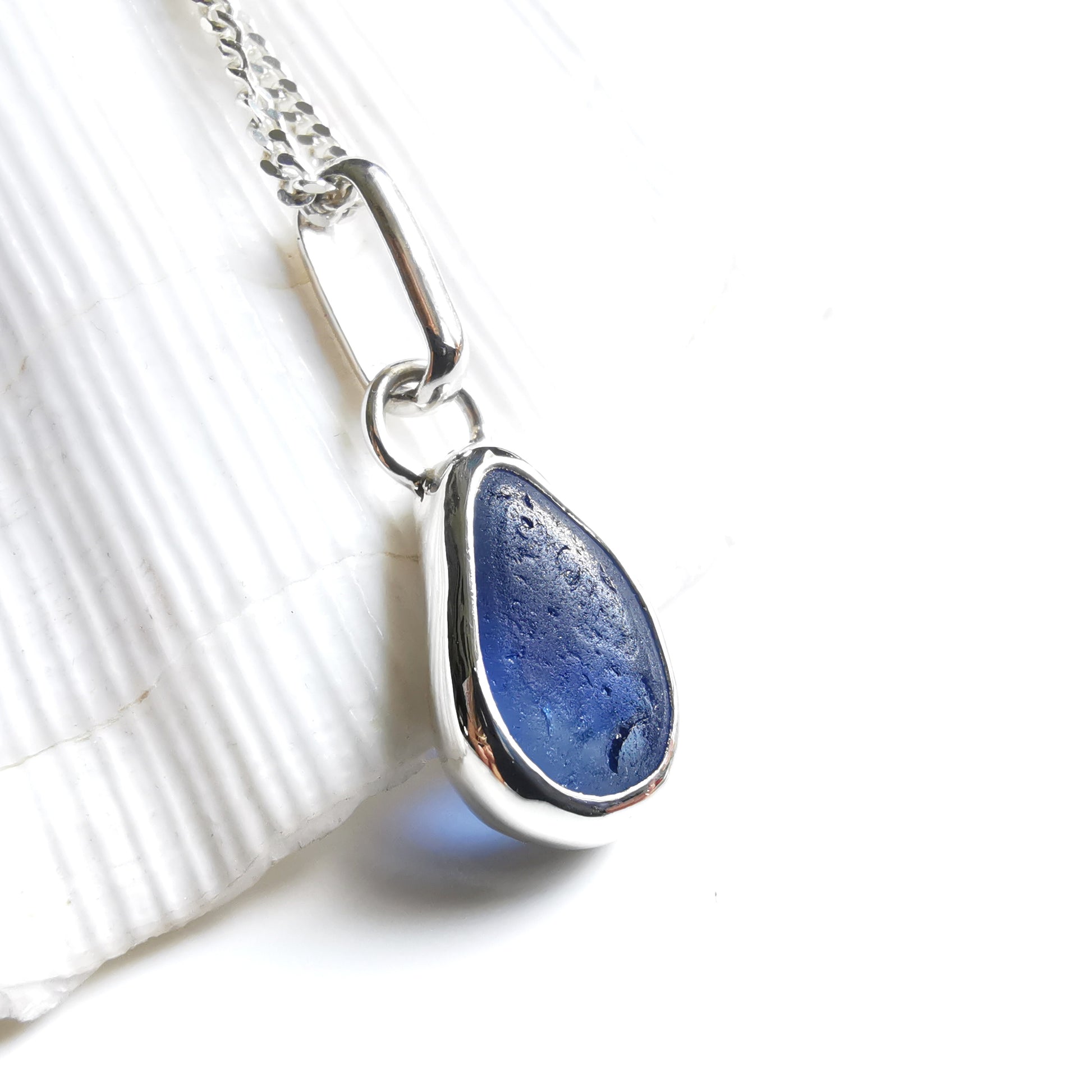 One of a kind pendant composed with genuine frosted multicoloured blue sea glass, found by me in Seaham in April 2024. The sea glass is set in backless fine silver bezel, the chain is sterling silver.