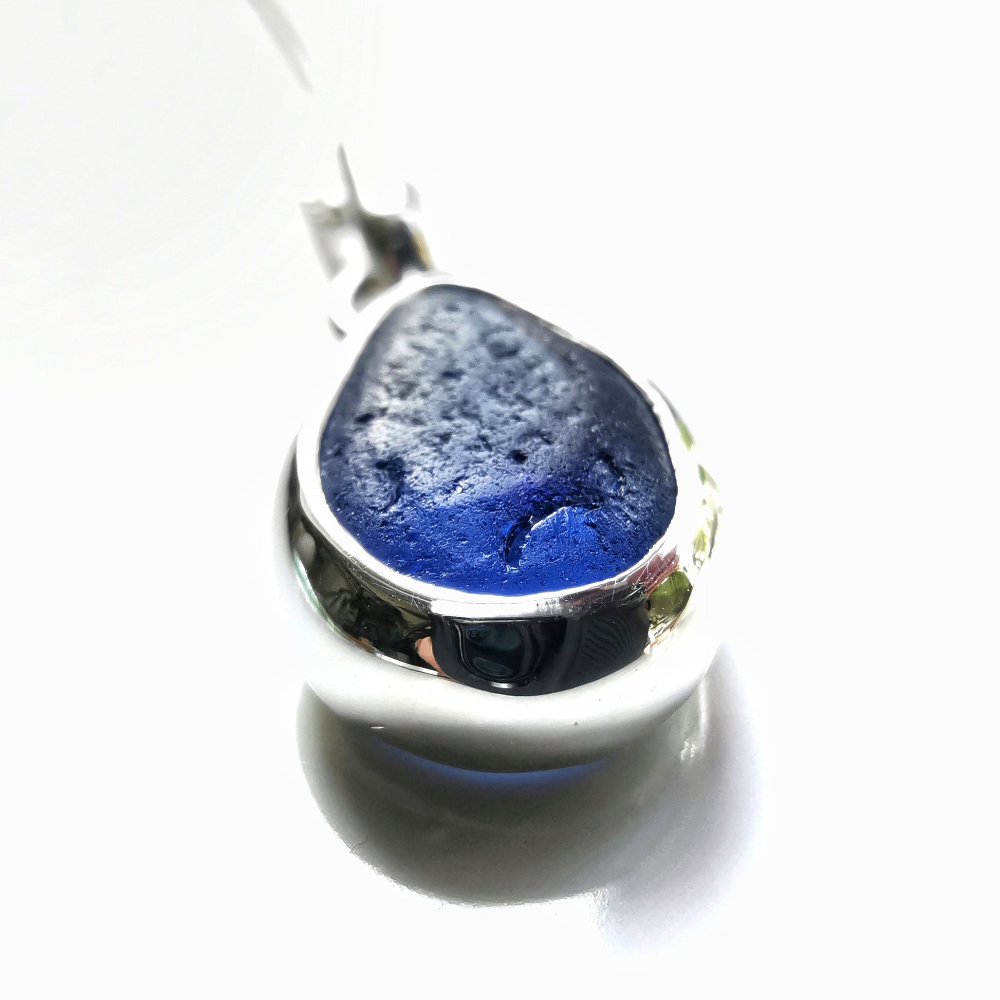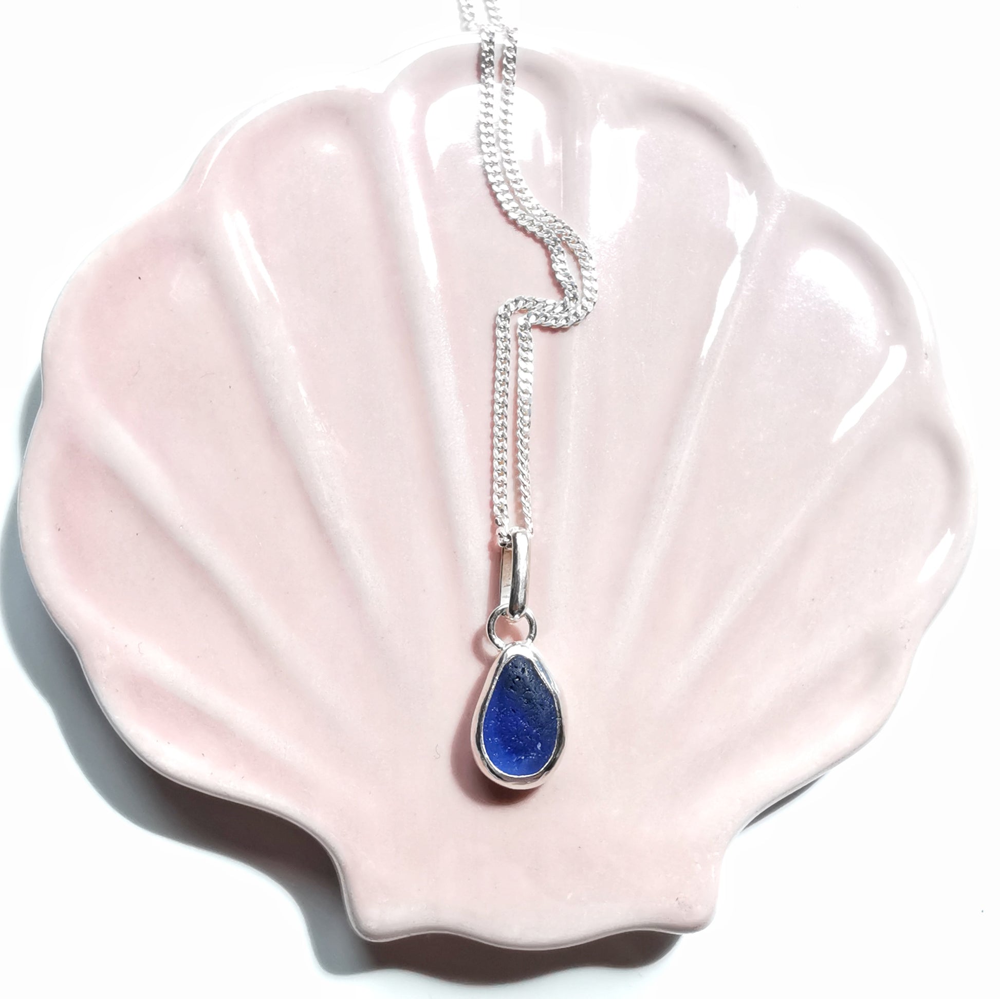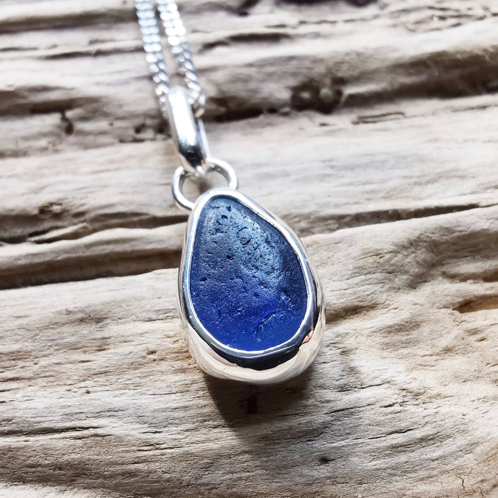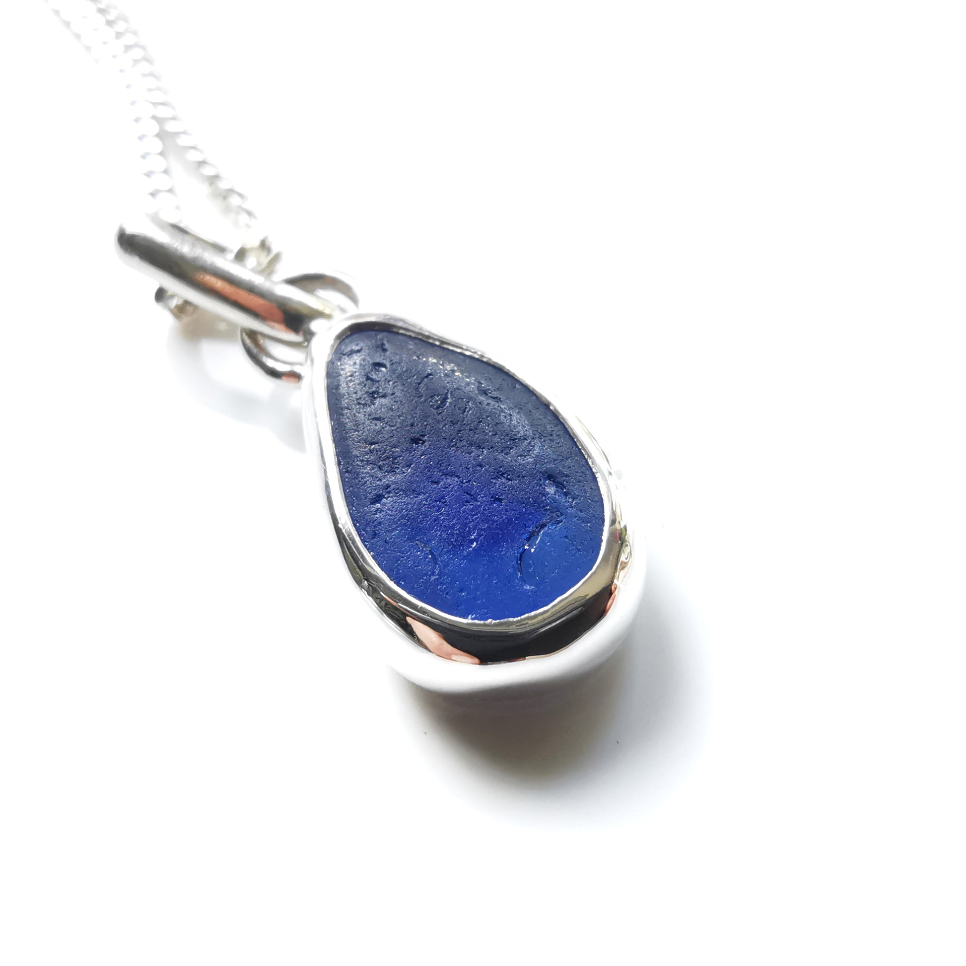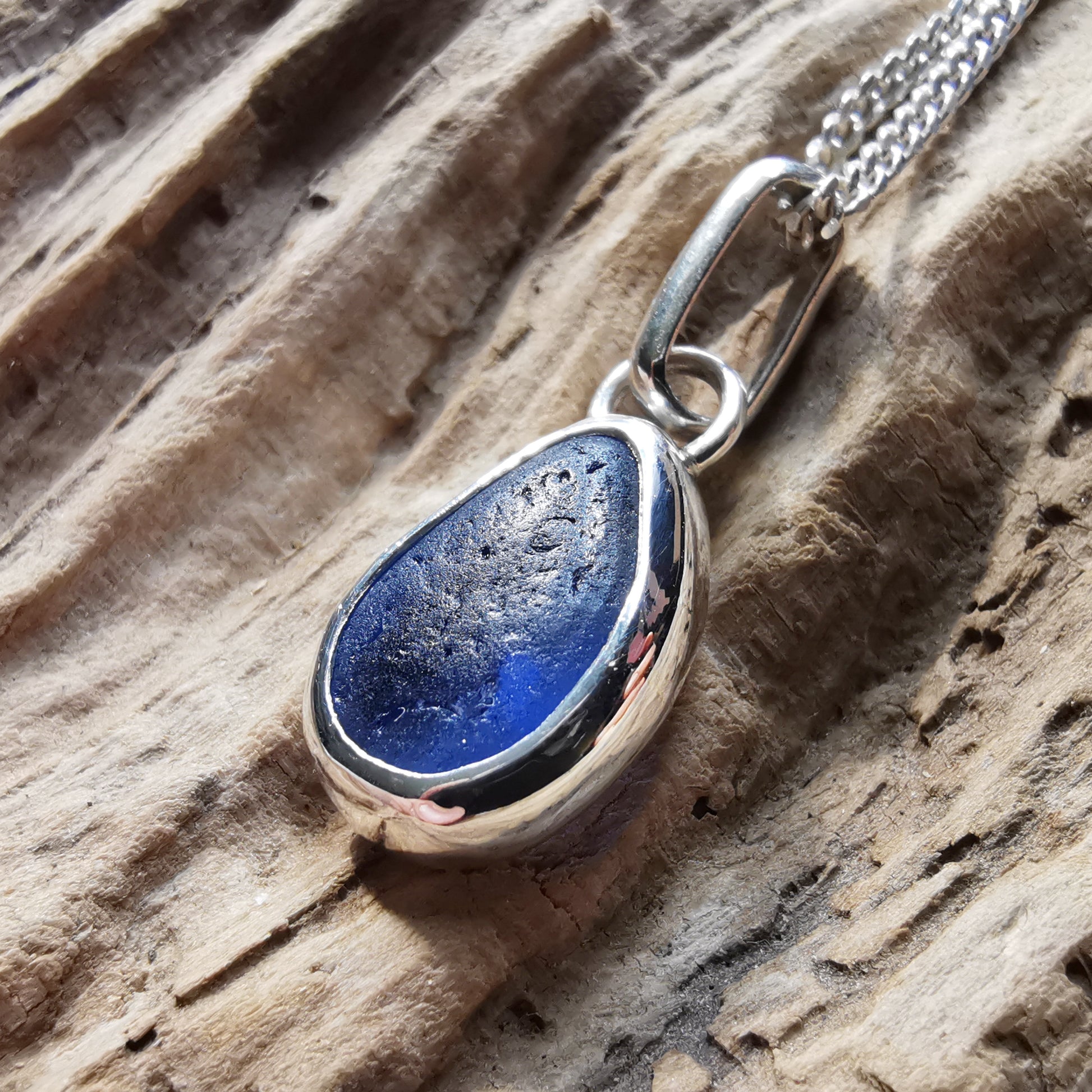 One of a kind pendant composed with genuine frosted multicoloured blue sea glass, found by me in Seaham in April 2024. The sea glass is set in backless fine silver bezel, the chain is sterling silver.