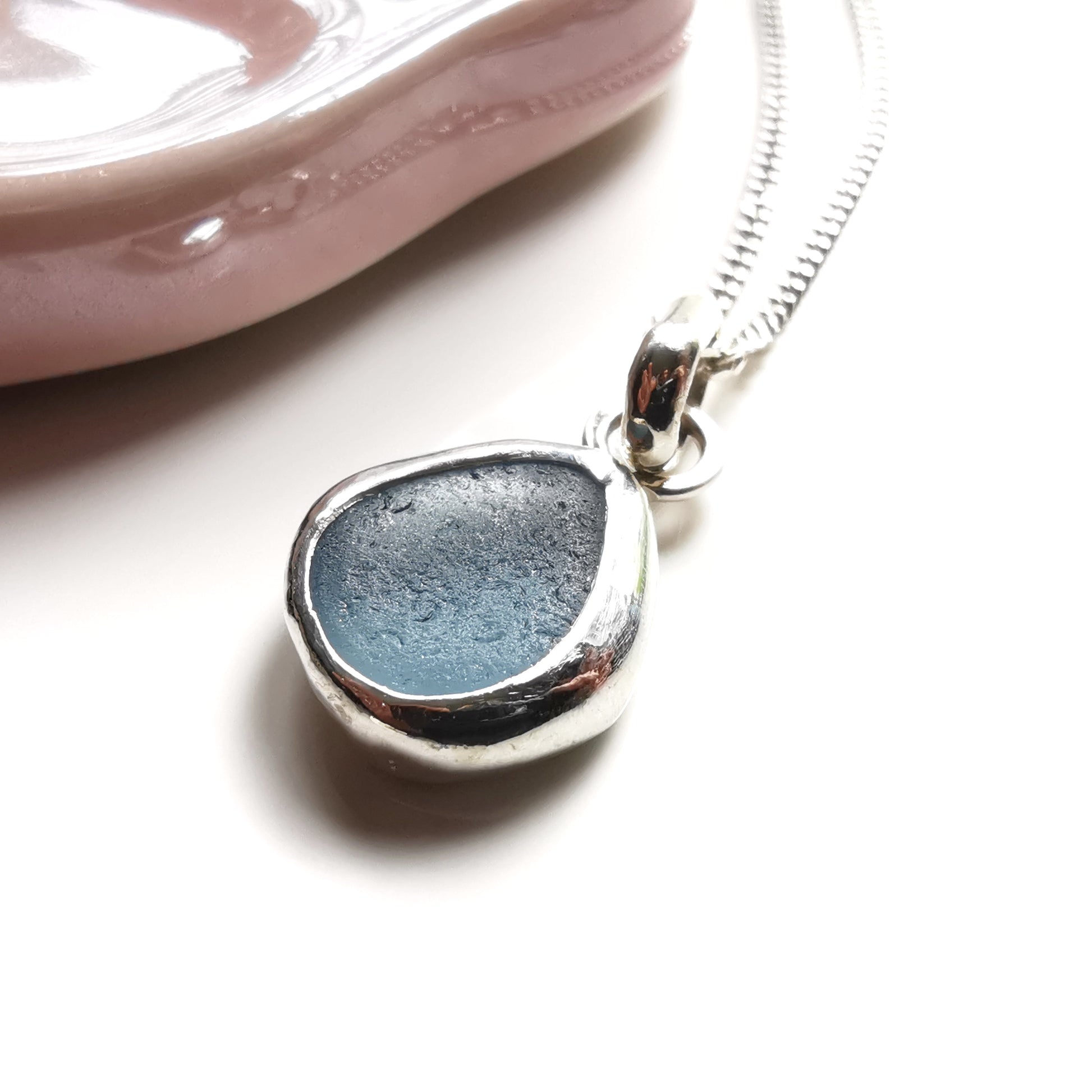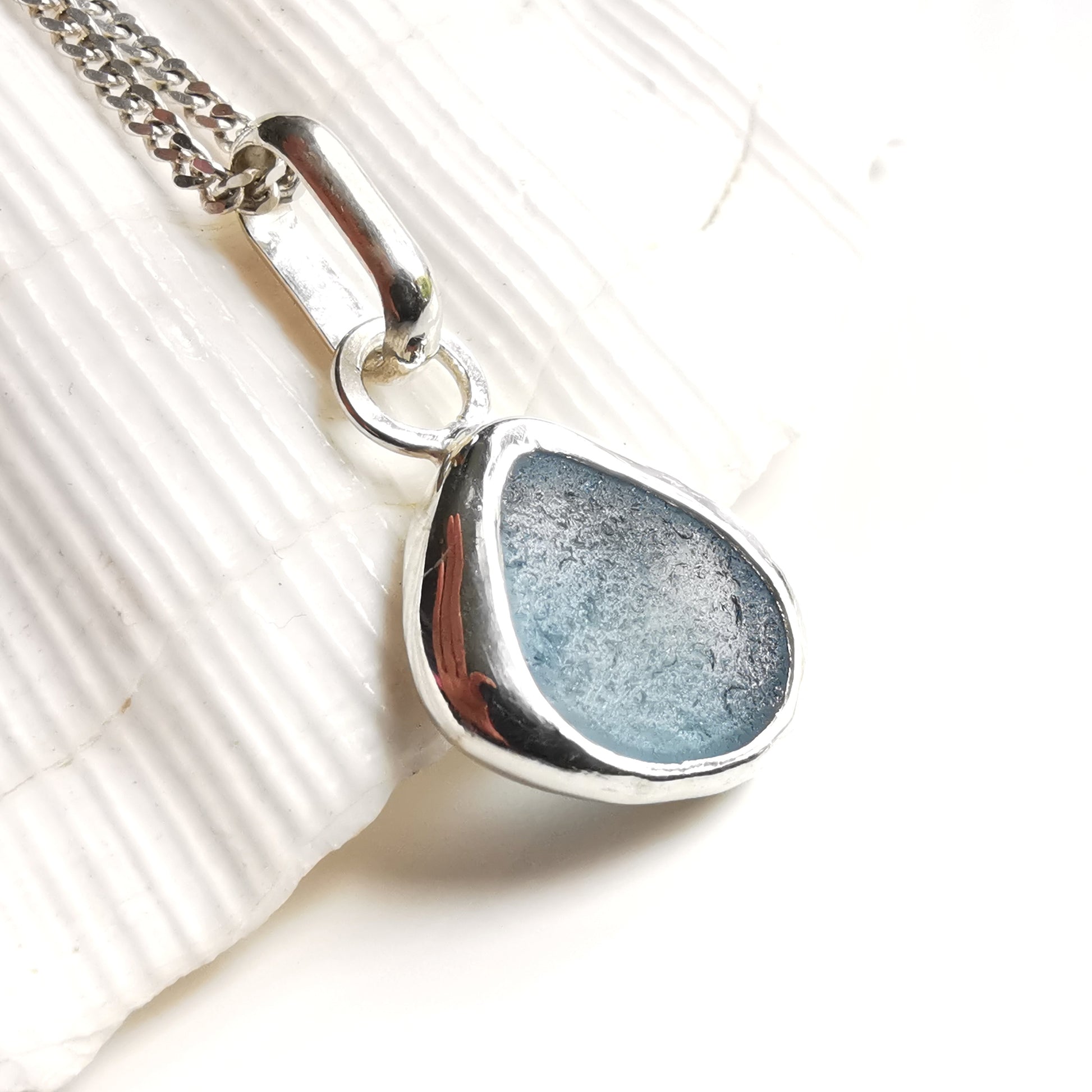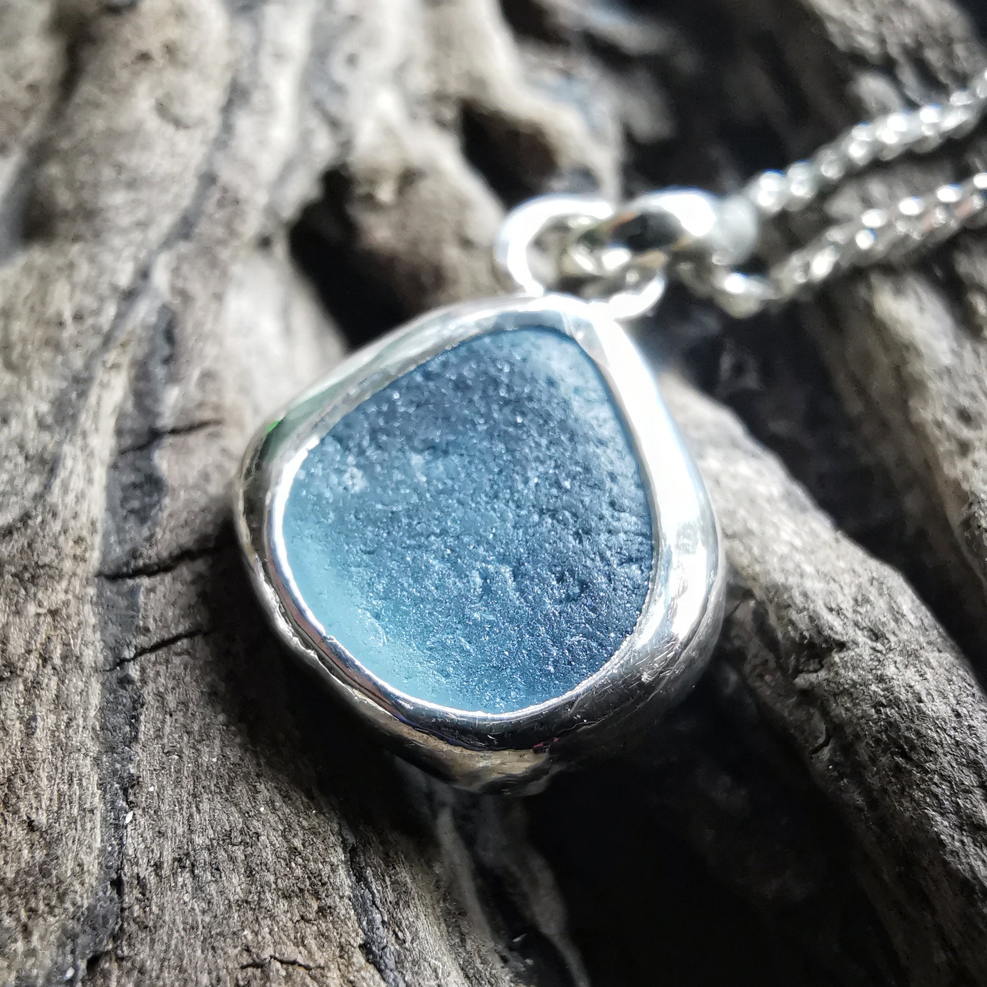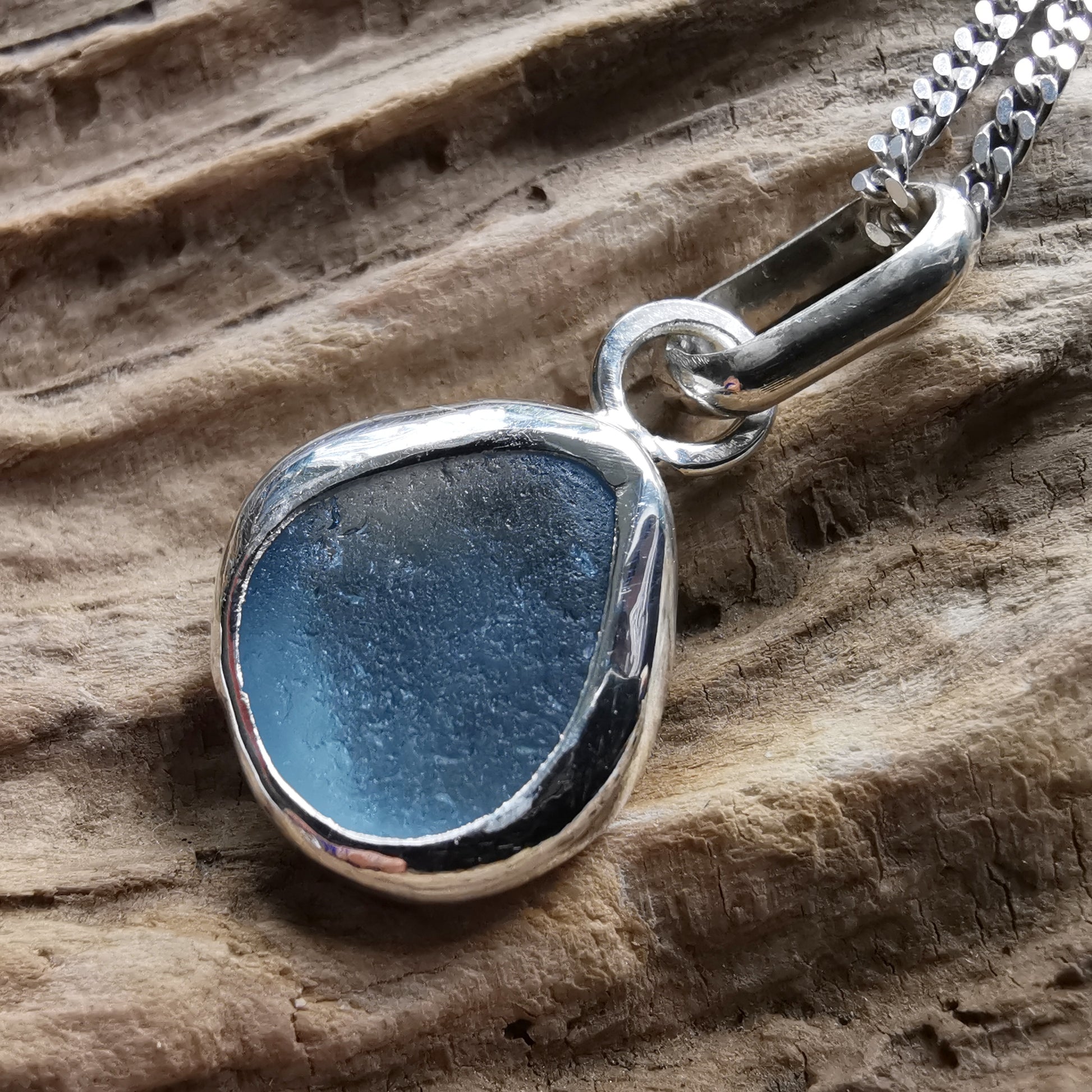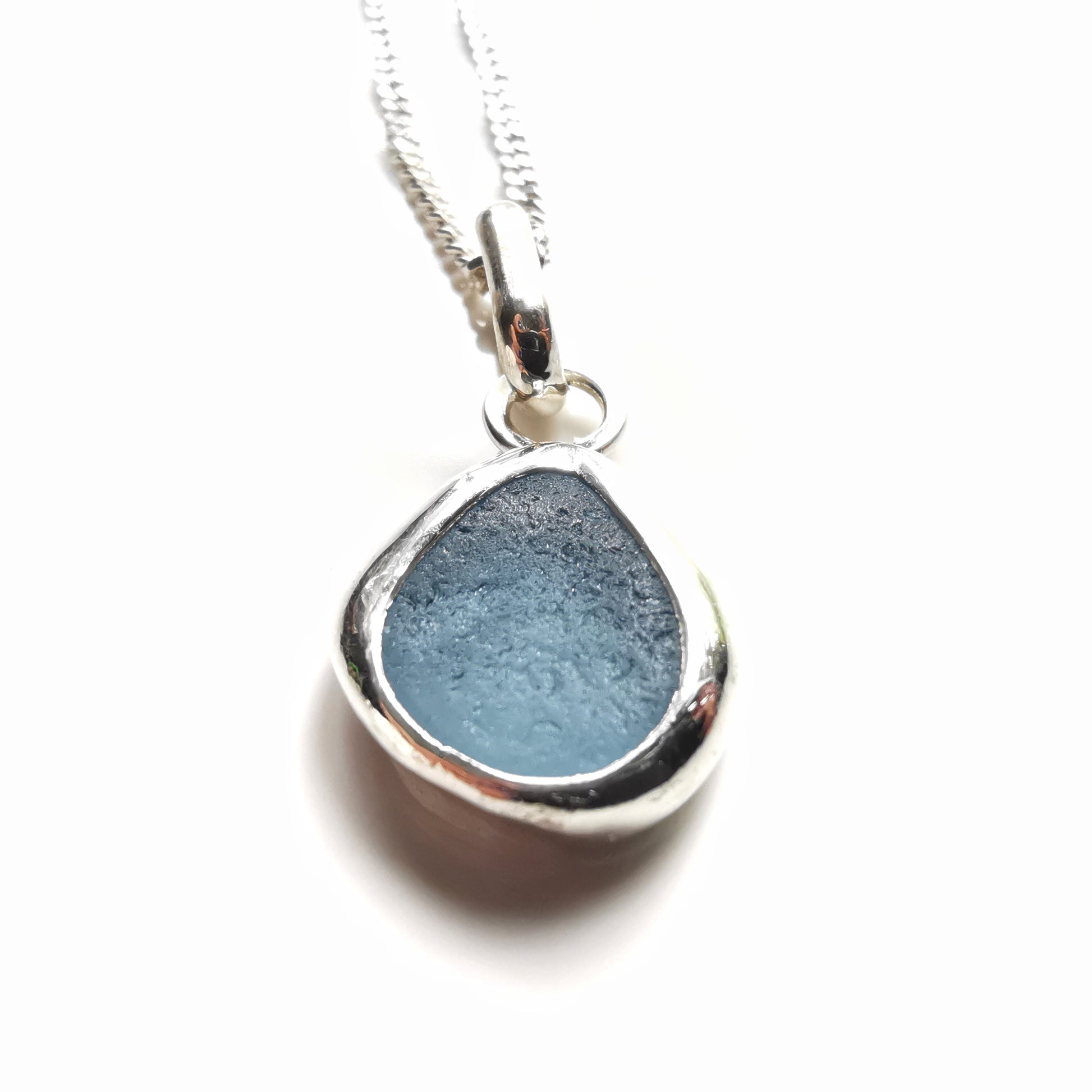One of a kind pendant composed with genuine frosted blue sea glass, from Seaham. The sea glass is set in backless fine silver bezel, the chain is sterling silver.
