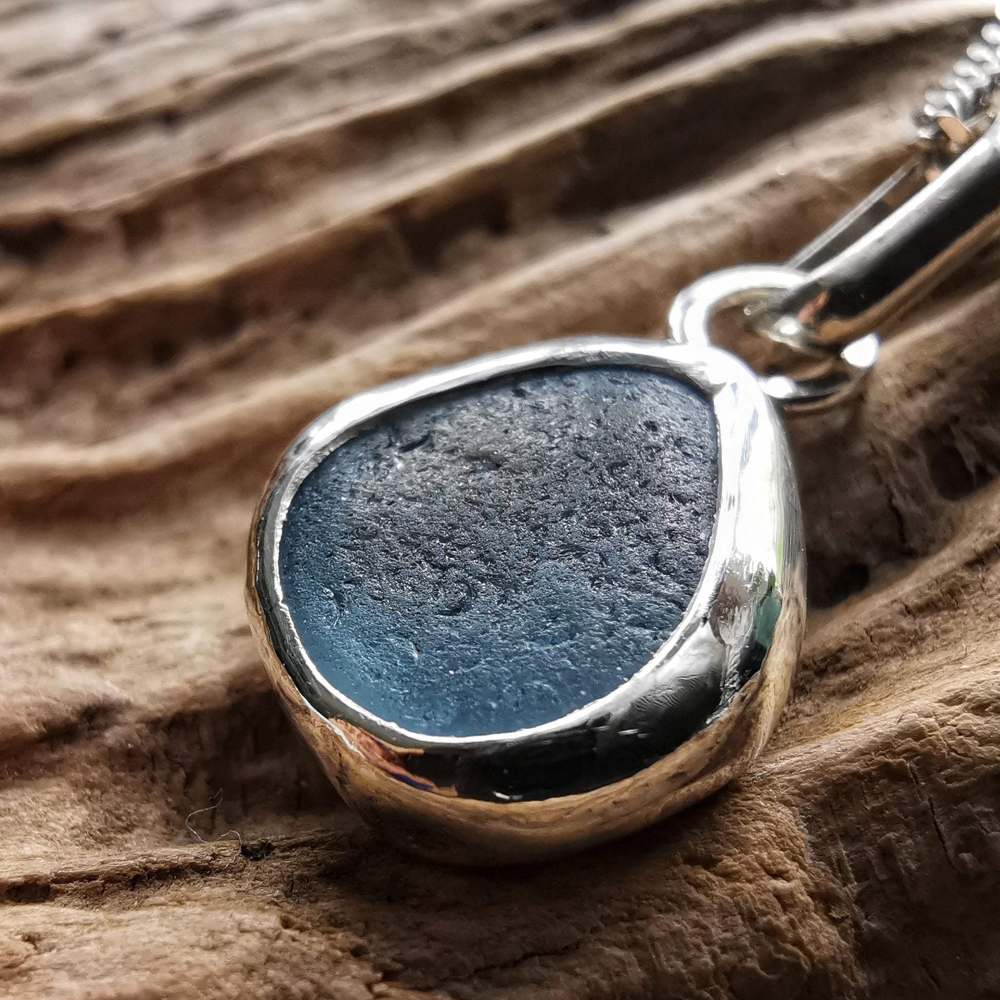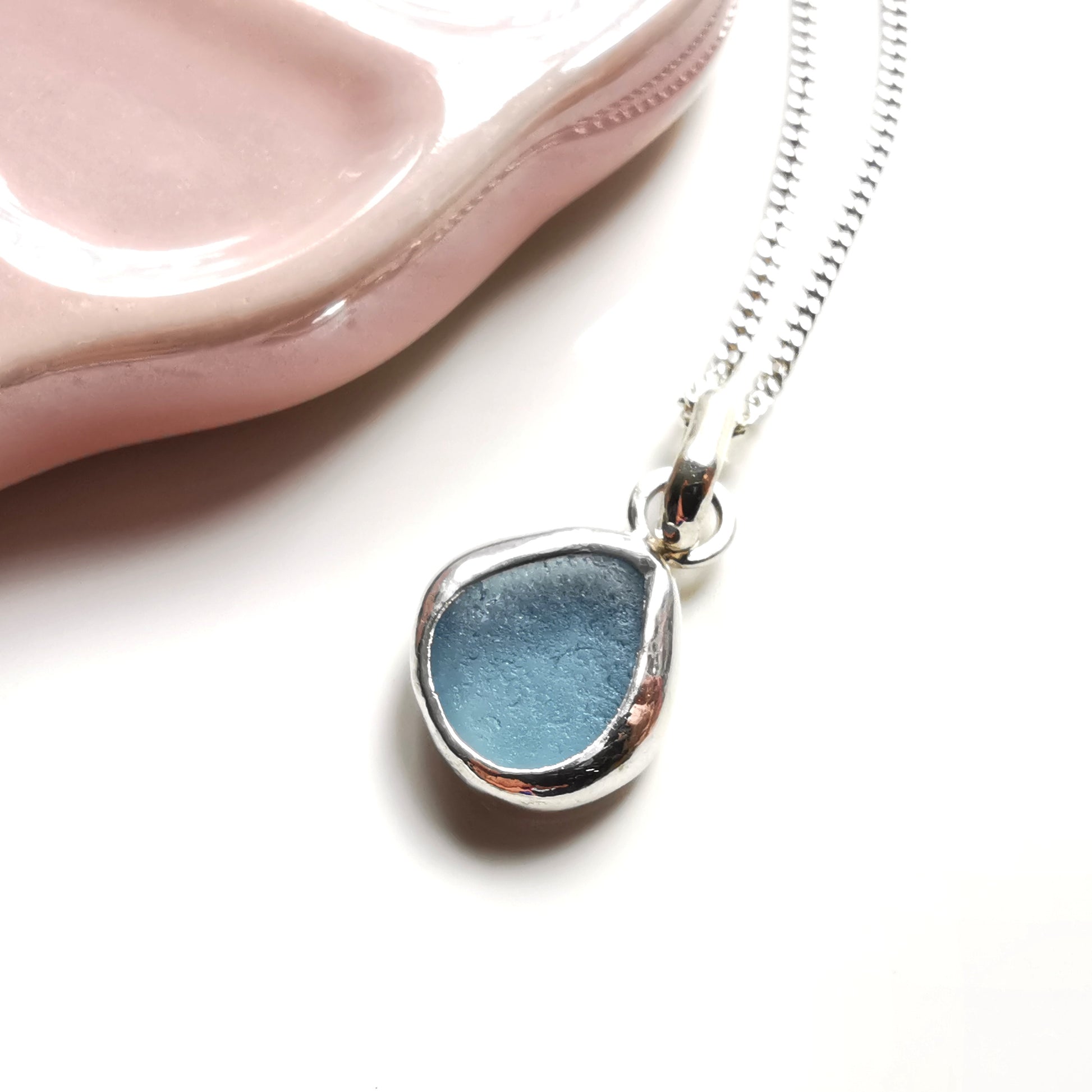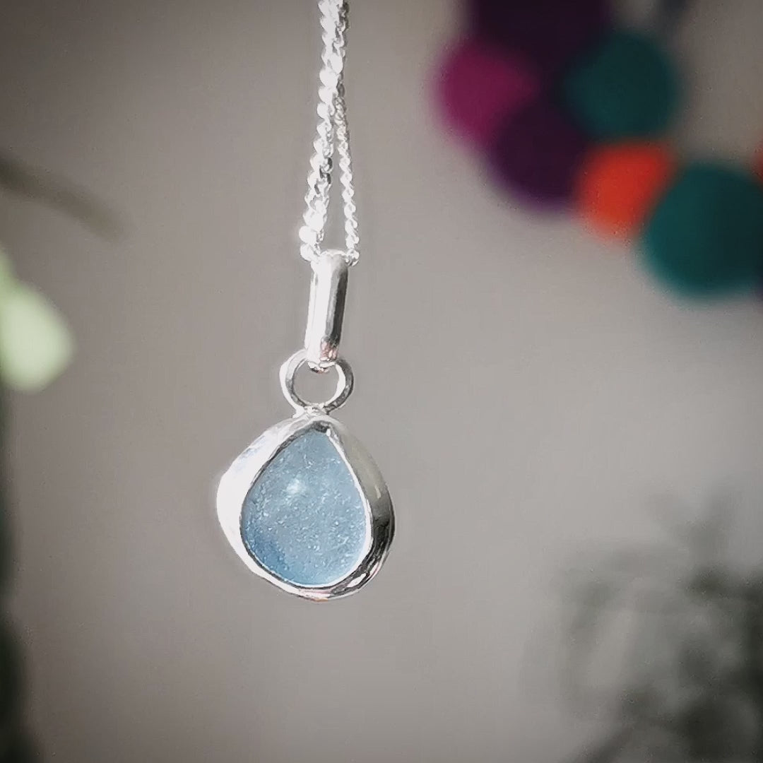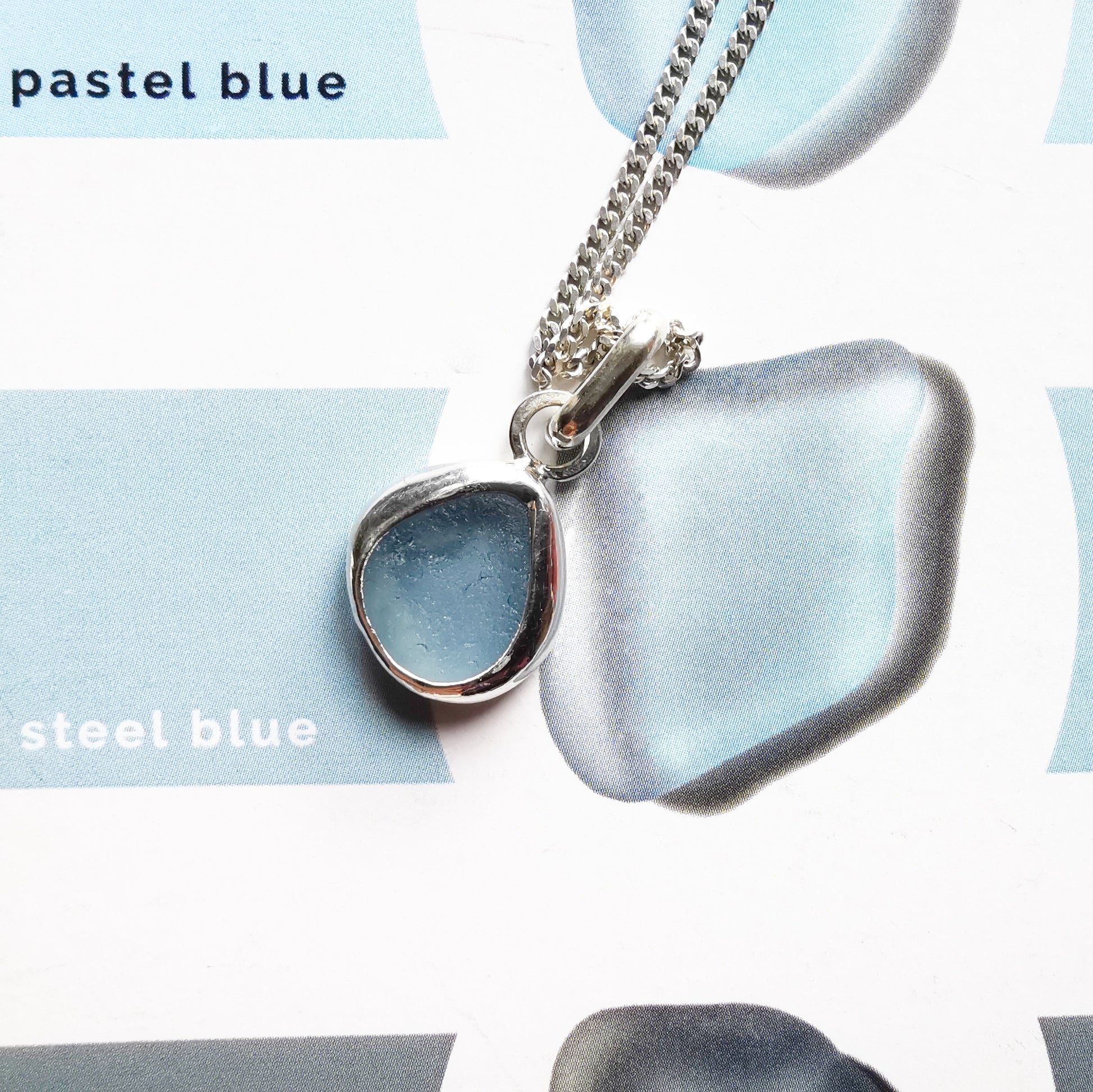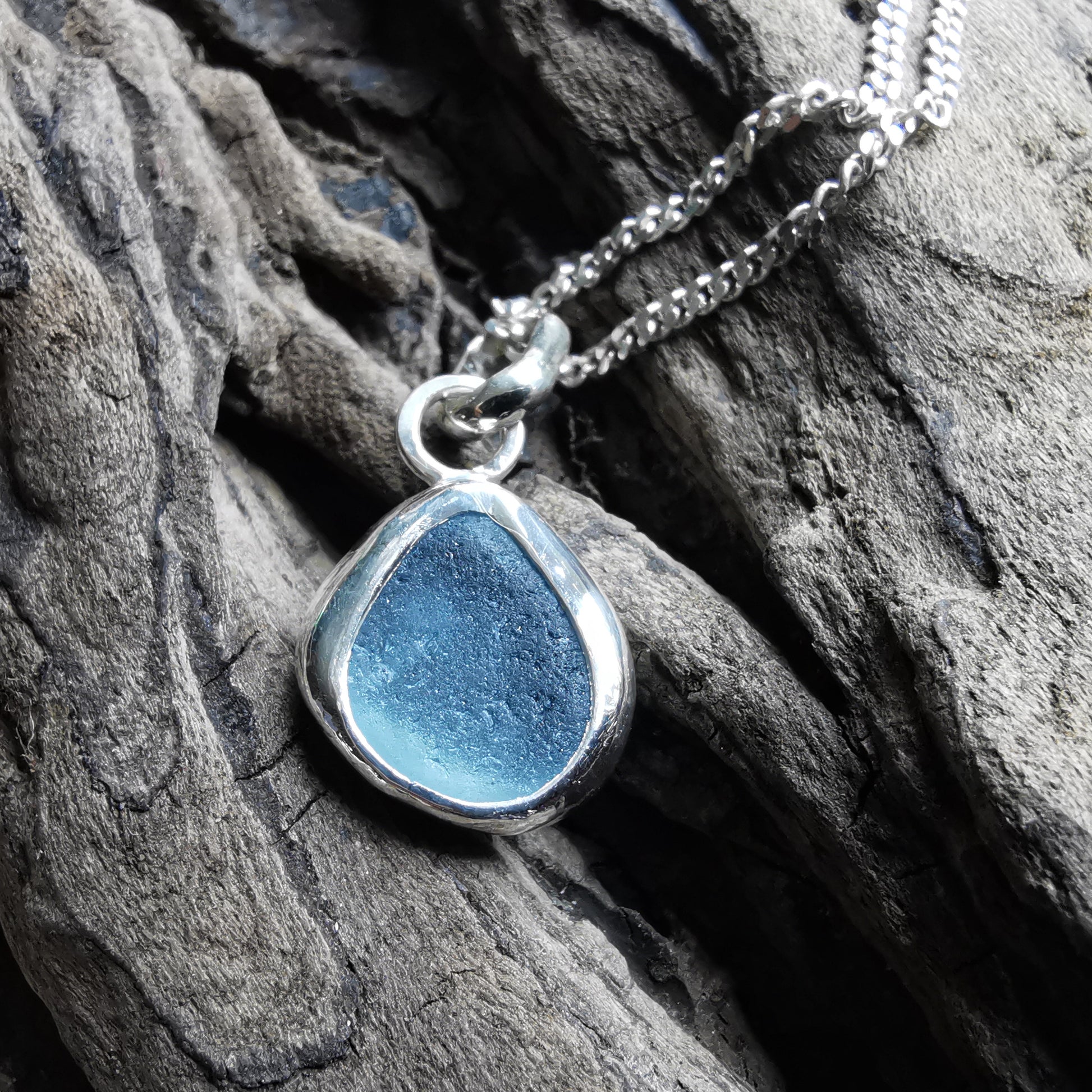 One of a kind pendant composed with genuine frosted blue sea glass, from Seaham. The sea glass is set in backless fine silver bezel, the chain is sterling silver.