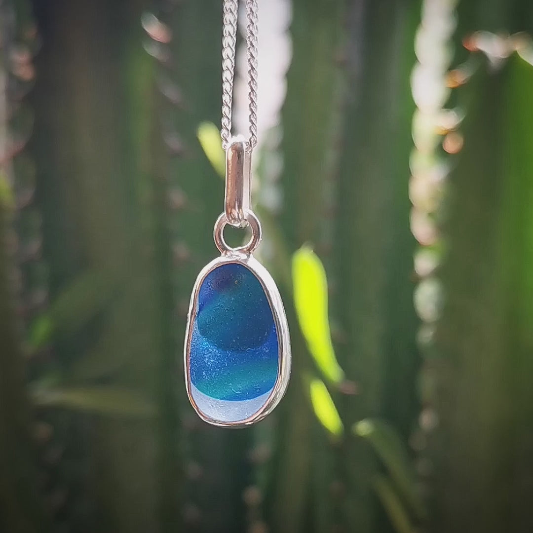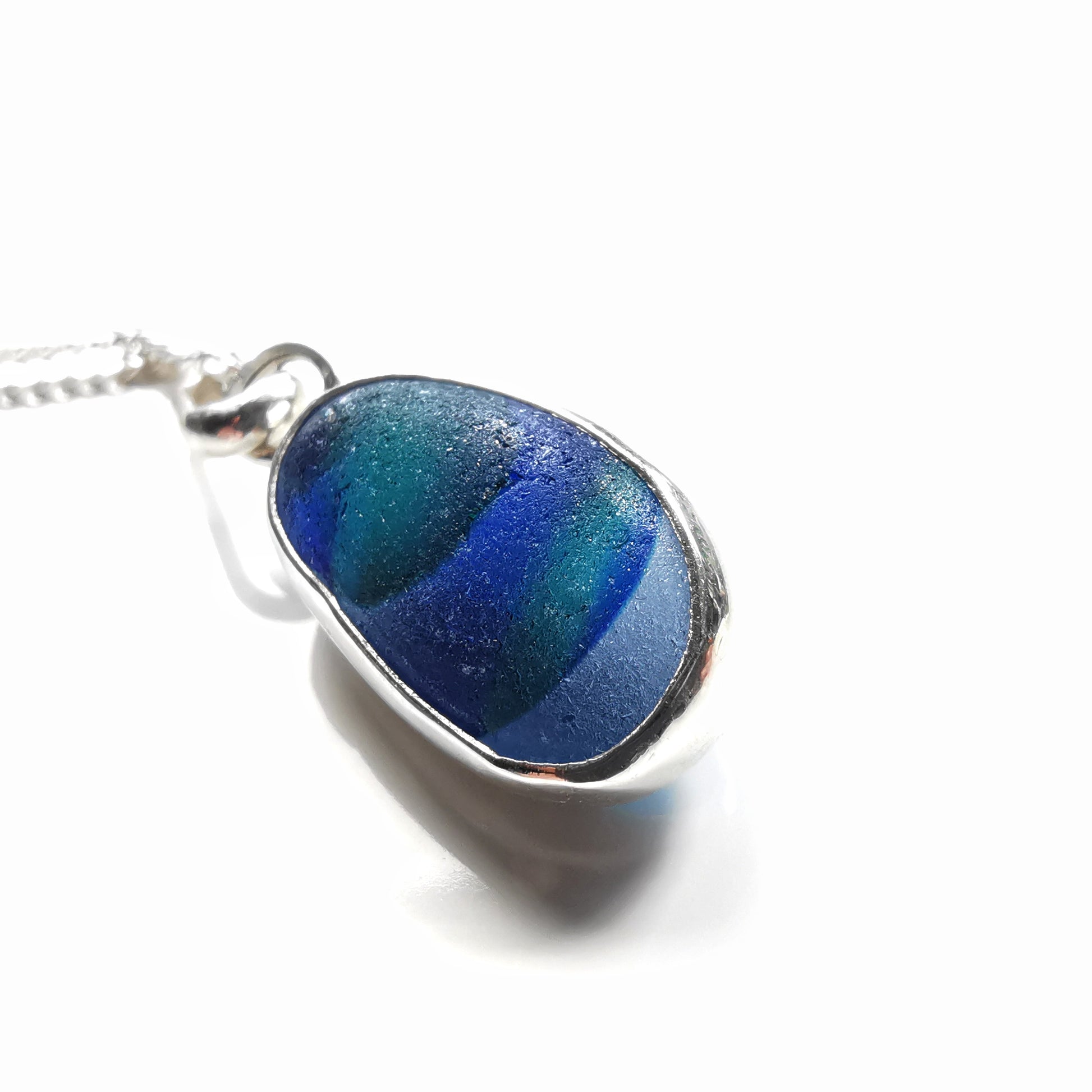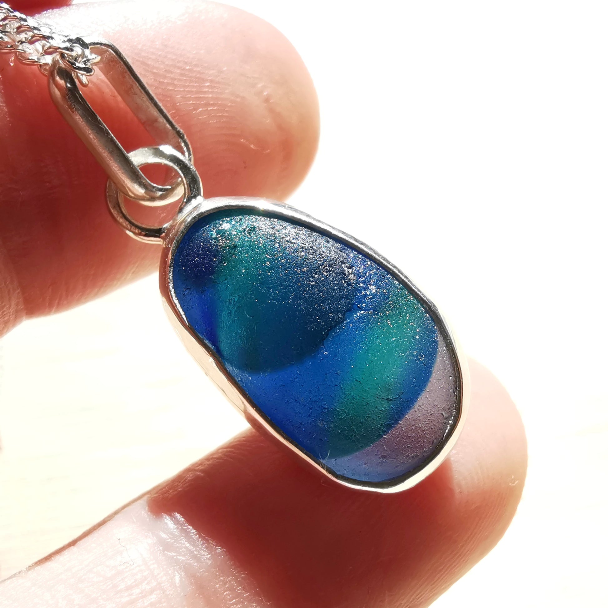 One of a kind pendant composed with genuine frosted multicoloured sea glass, found by me in Seaham earlier this month. The sea glass is set in backless fine silver bezel, the chain is sterling silver.