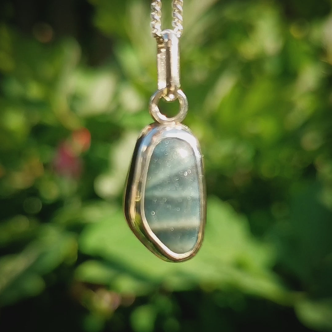 One of a kind pendant composed with genuine frosted blue sea glass, found by me in Seaham in April 2024. The sea glass is set in backless fine silver bezel, the chain is sterling silver.