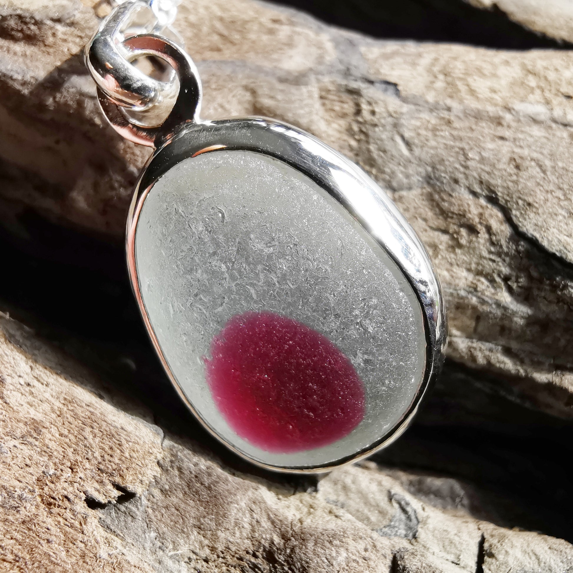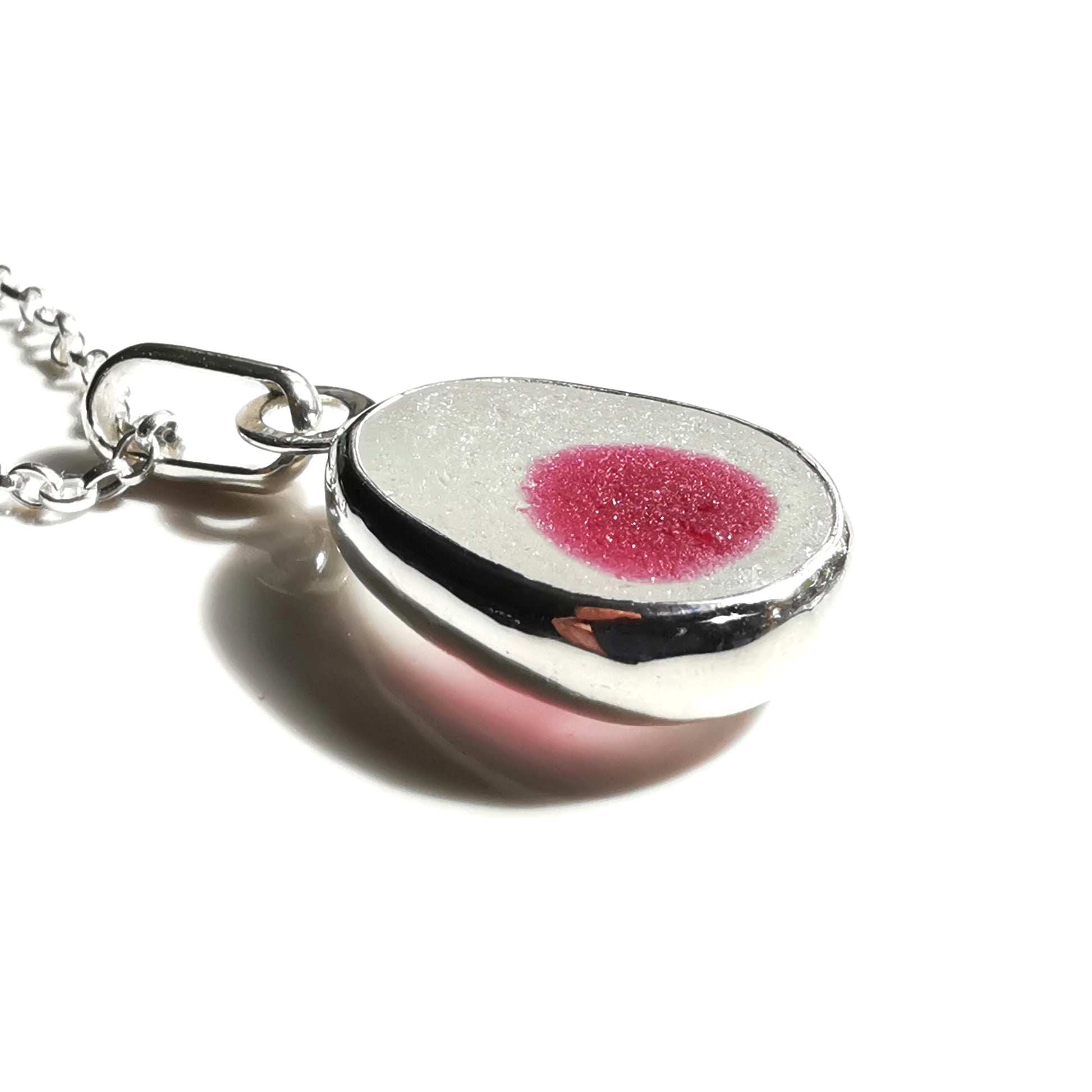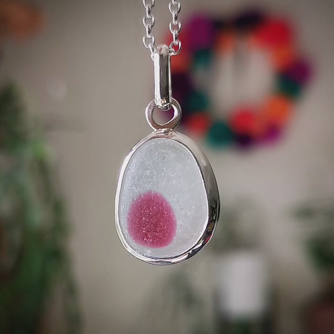One of a kind pendant composed with genuine frosted pink and clear multicoloured sea glass which looks like fried egg with pink yolk, found by me in Seaham in April 2024. The sea glass is set in backless fine silver bezel, the chain is sterling silver.