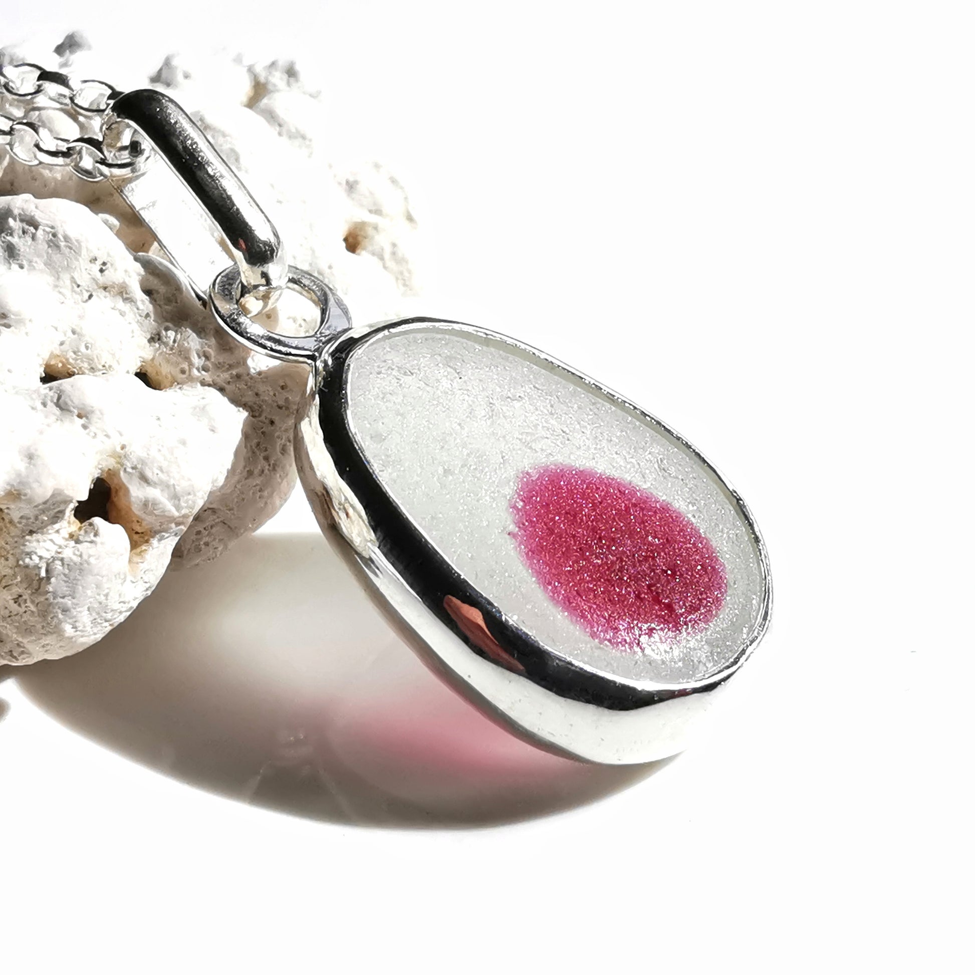 Seaham pink and clear multi sea glass & sterling silver pendant.