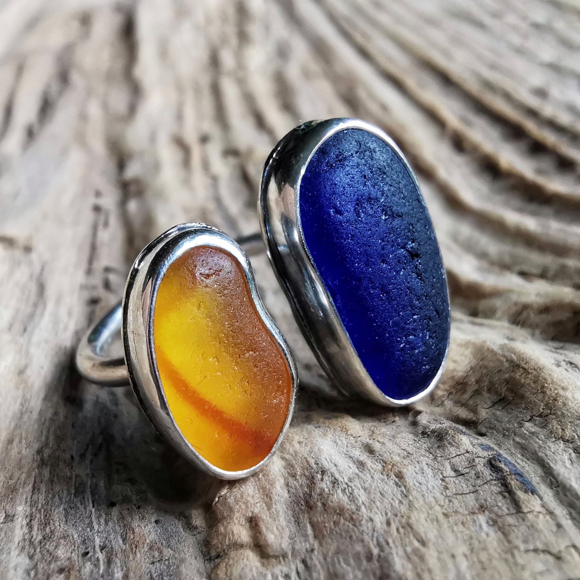 One of a kind ring made with UV orange and blue sea glass found by me in Seaham. The sea glass is set in fine silver bezel, the band is sterling silver.