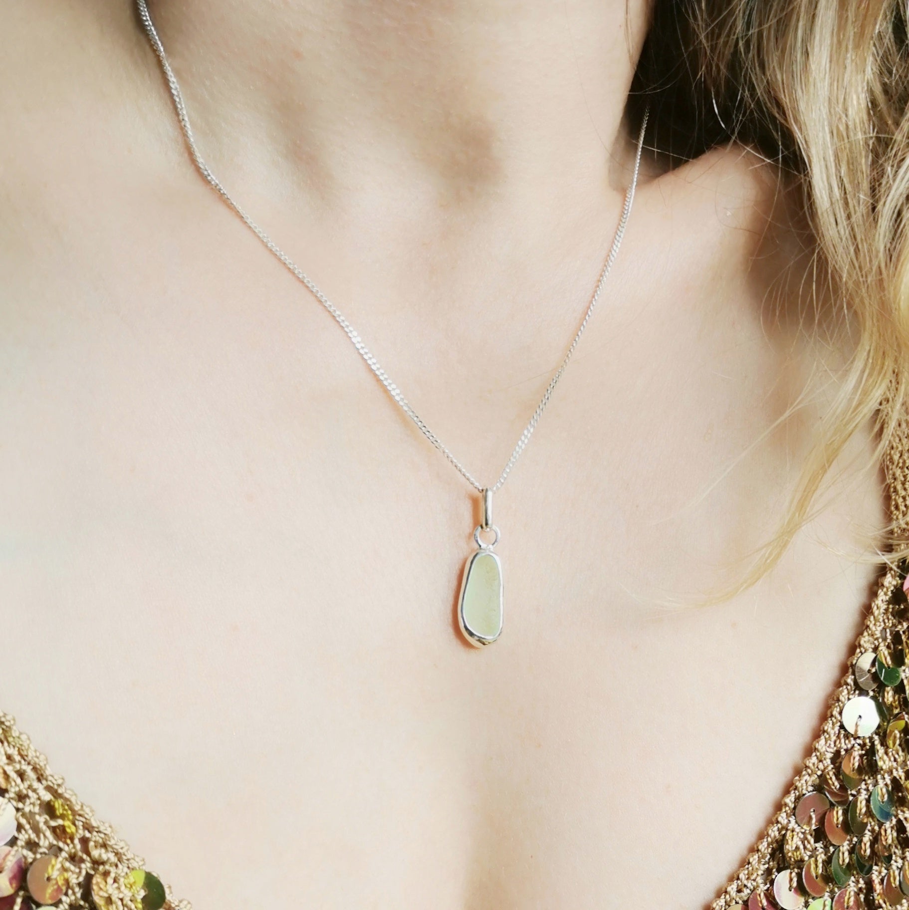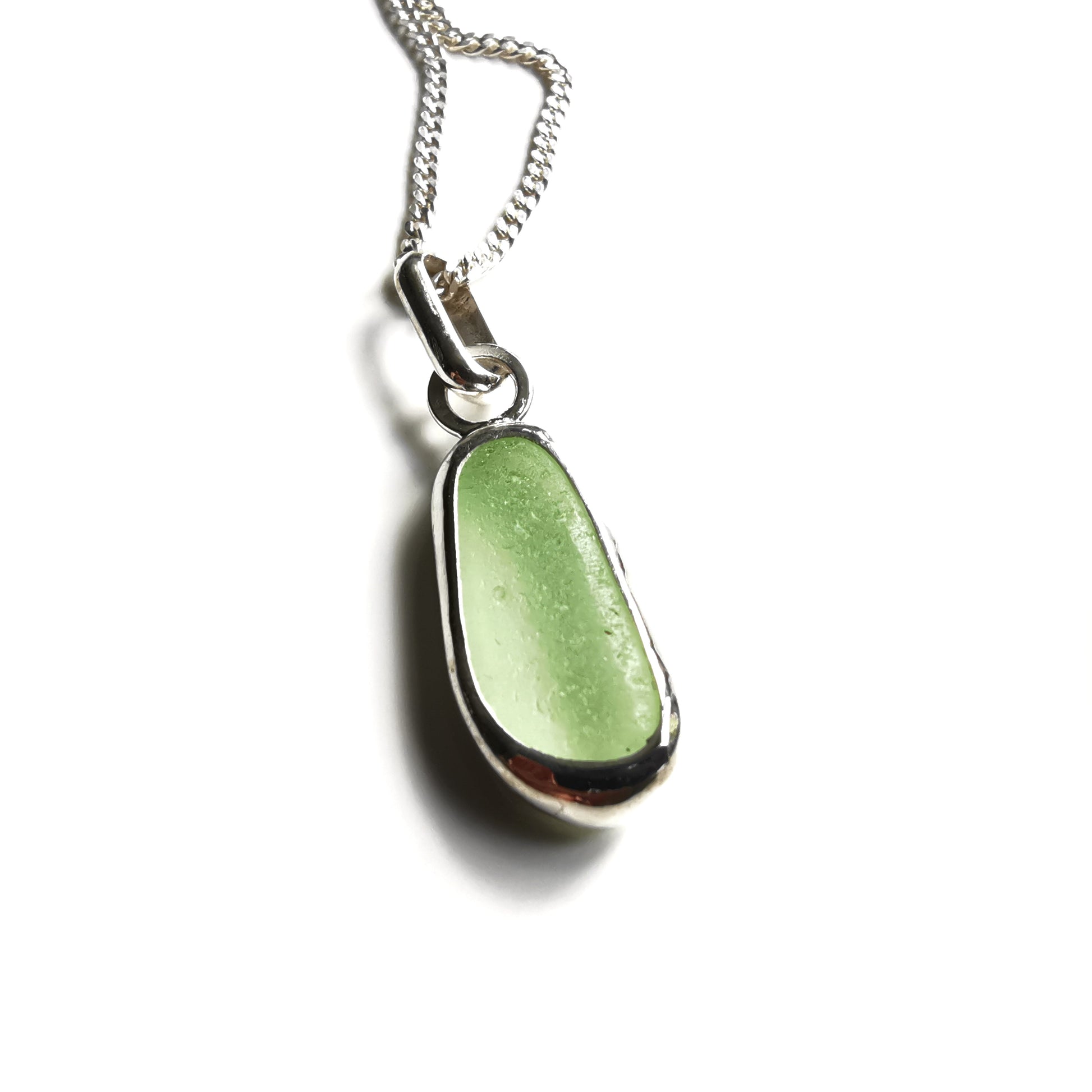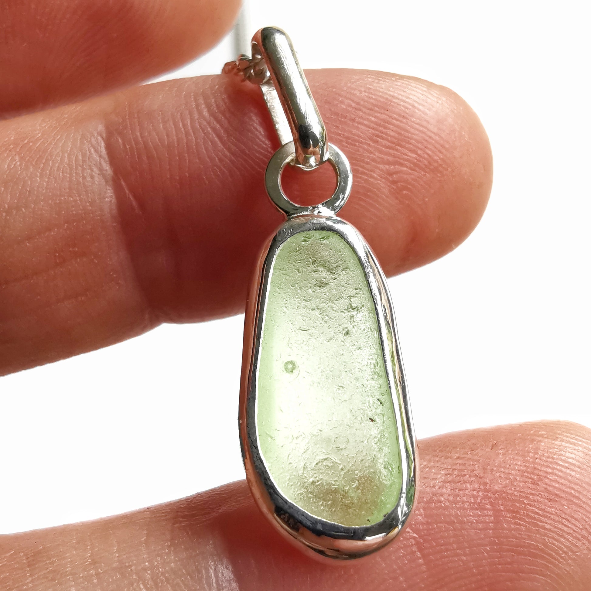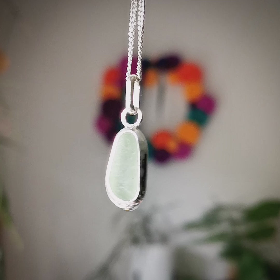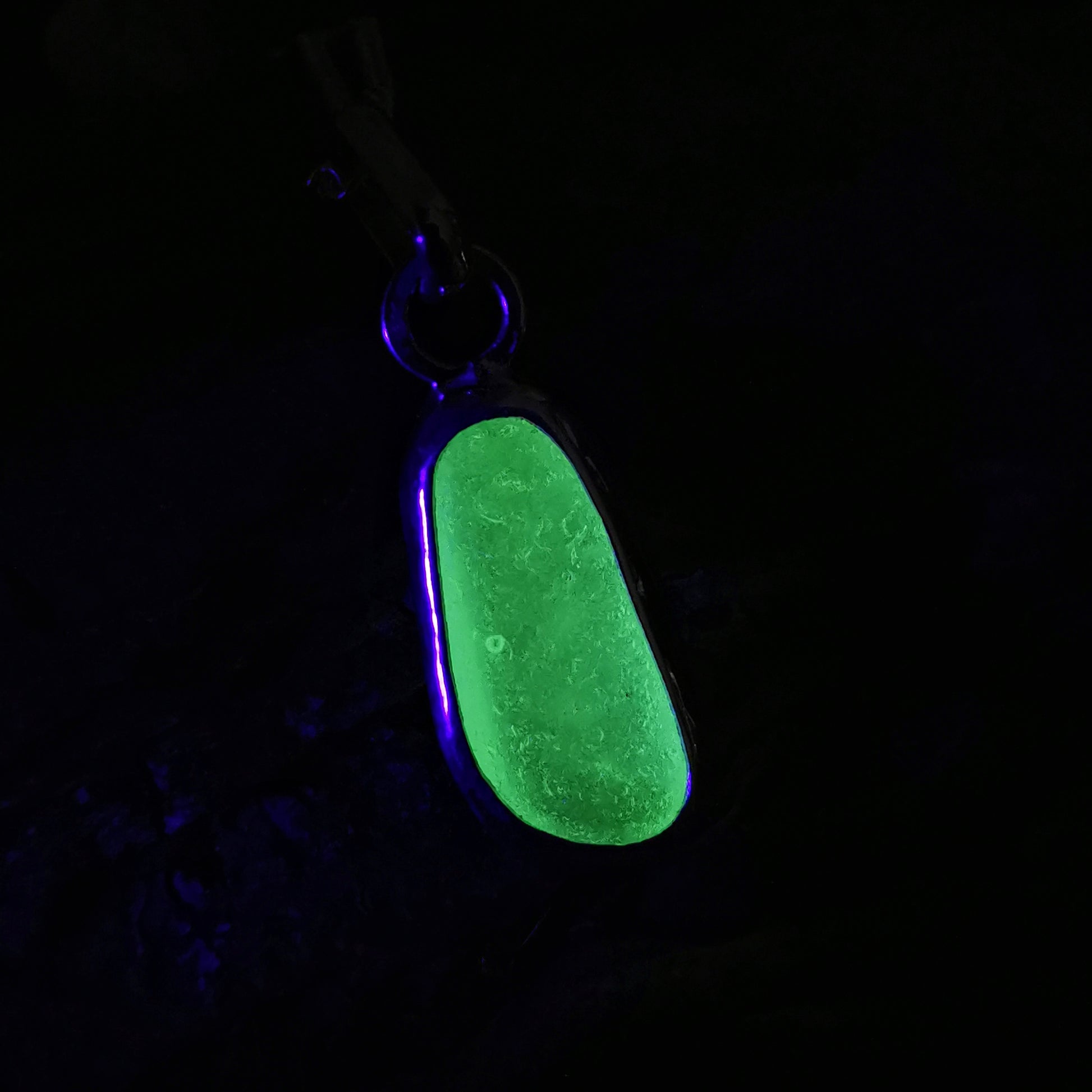 One of a kind pendant composed with genuine frosted UV sea glass (glows under ultraviolet light), found by myself on a beach in Seaham. The sea glass is set in fine backless silver bezel, the chain is sterling silver.