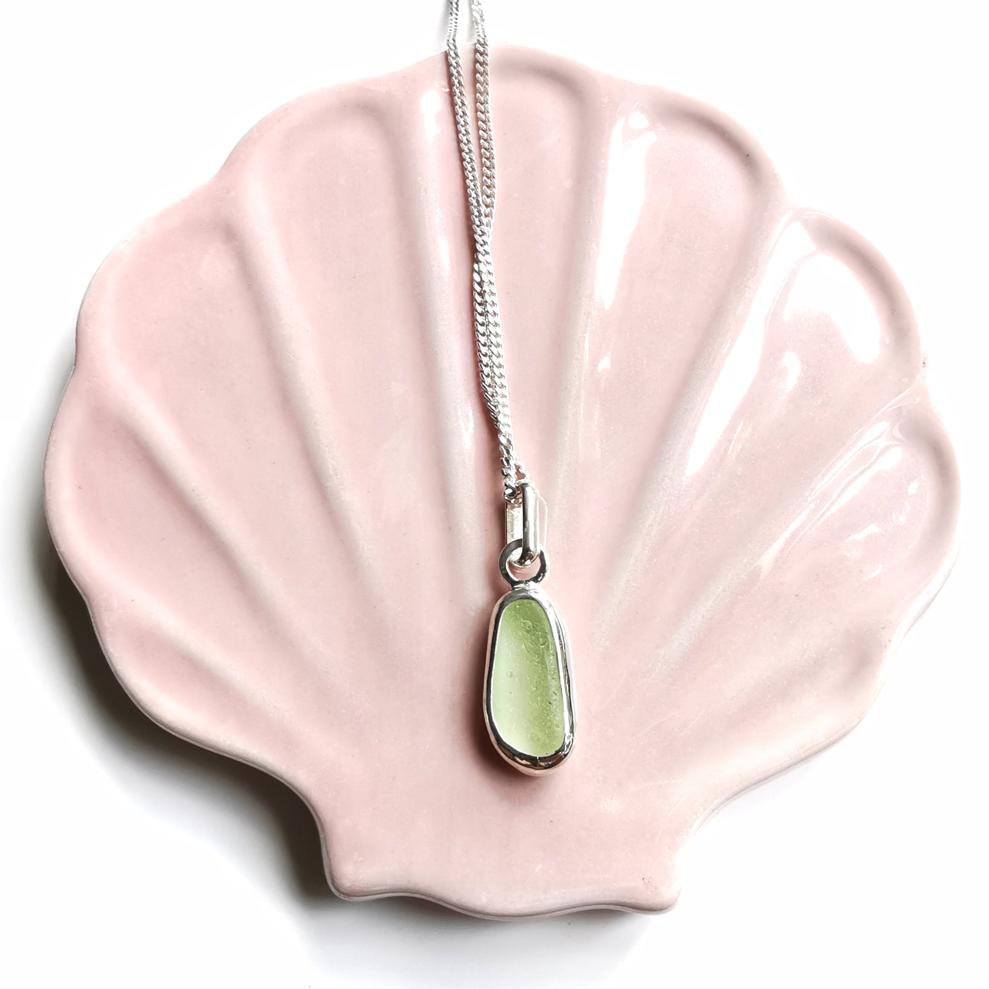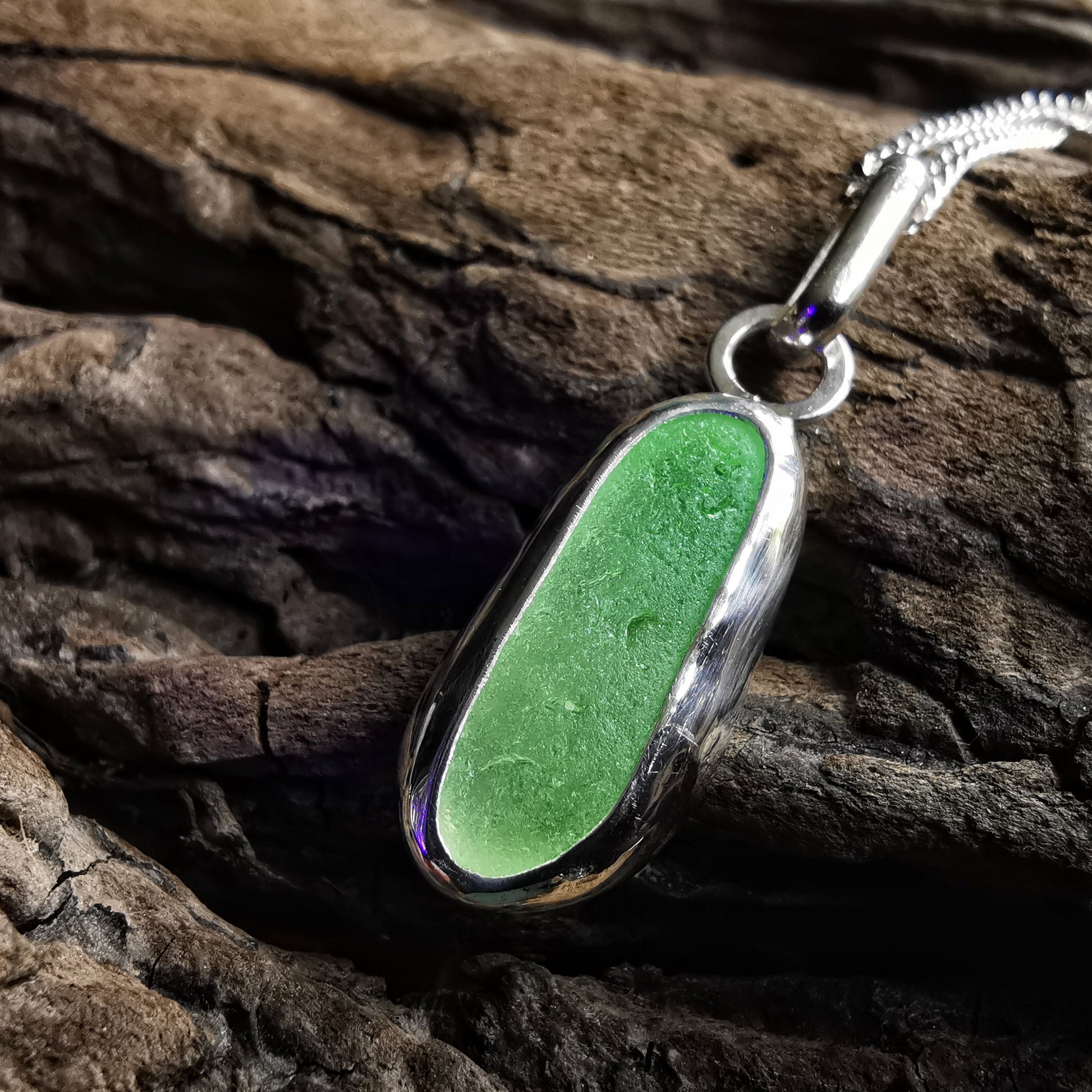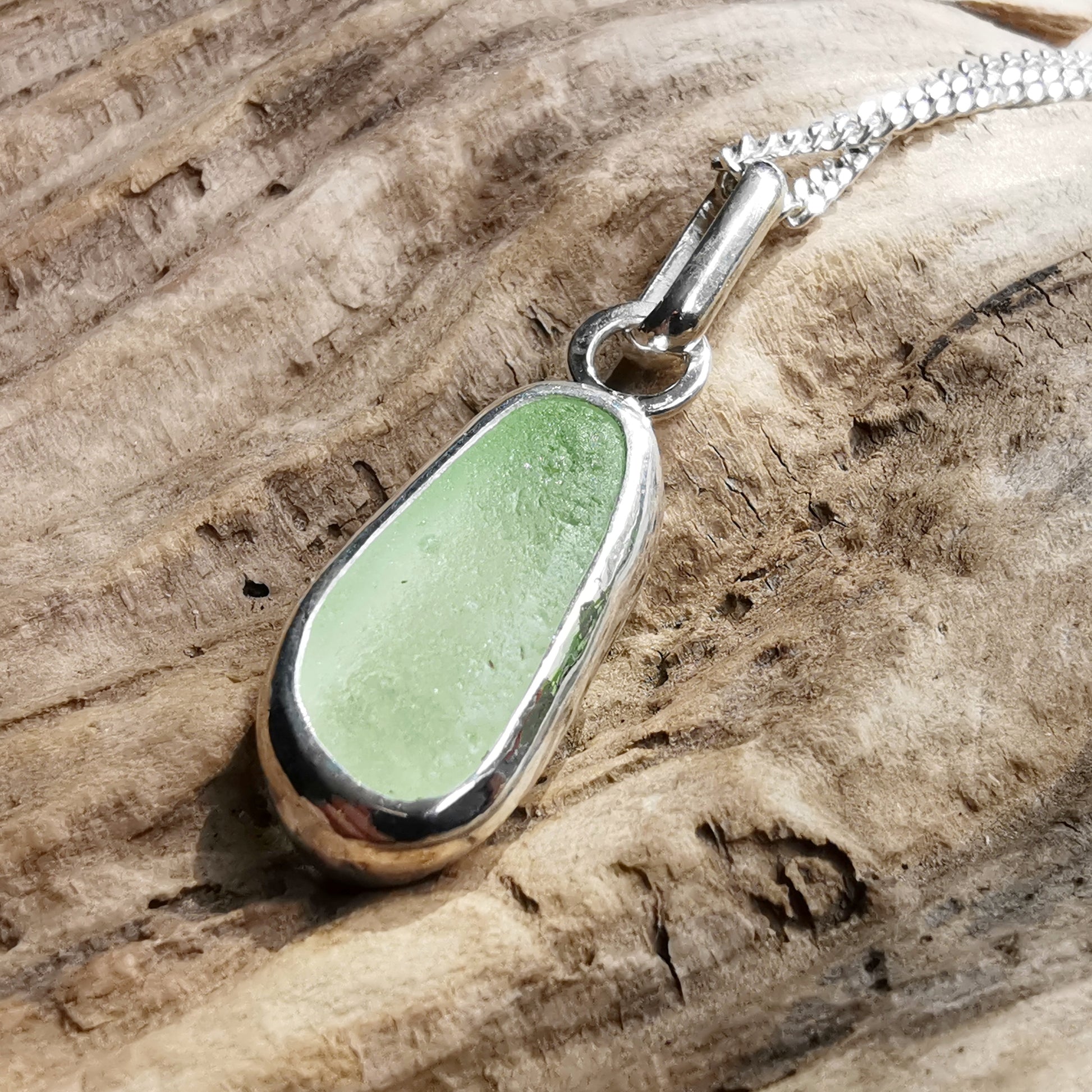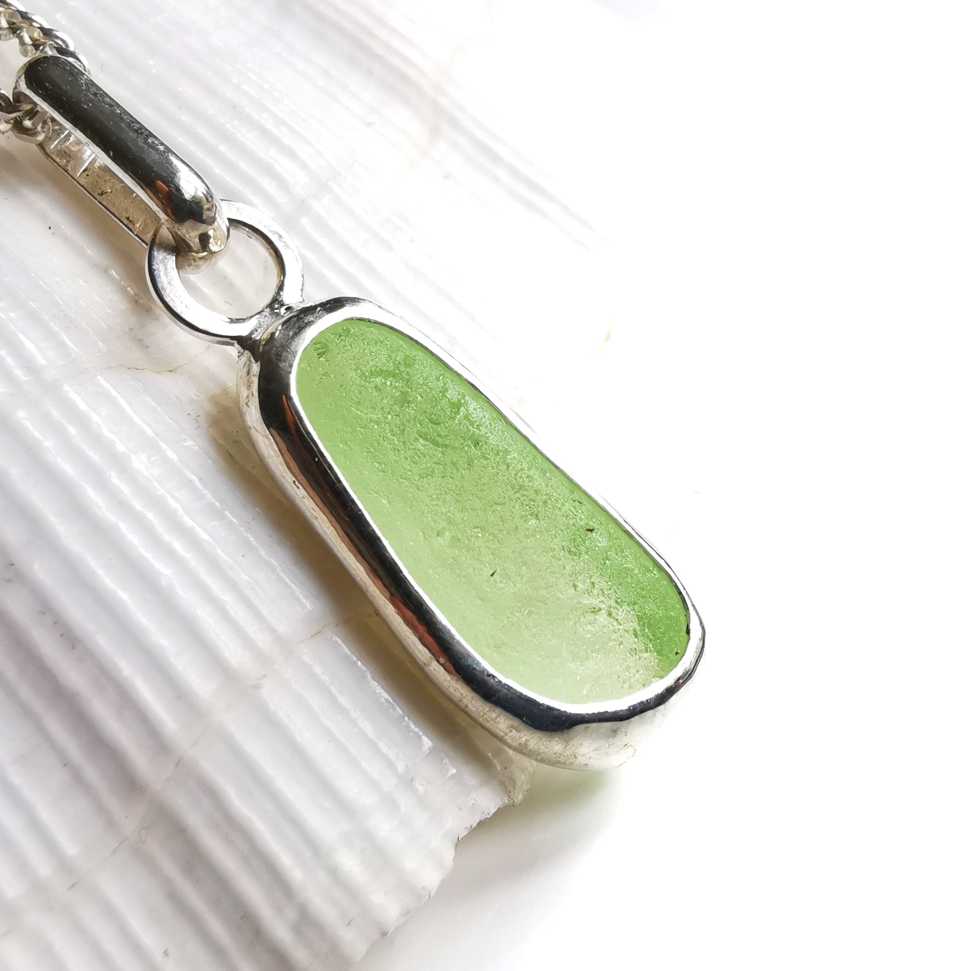 One of a kind pendant composed with genuine frosted UV sea glass (glows under ultraviolet light), found by myself on a beach in Seaham. The sea glass is set in fine backless silver bezel, the chain is sterling silver.
