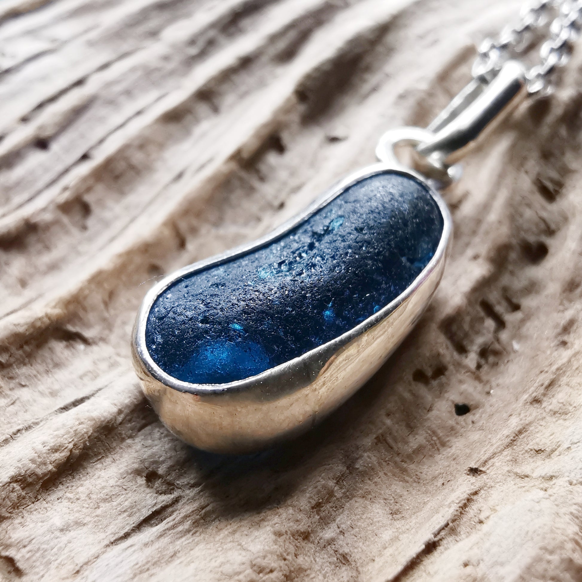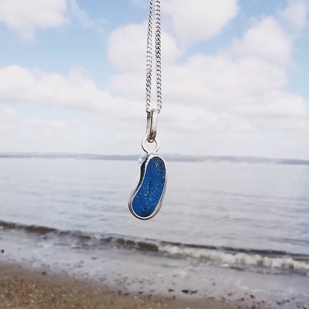 One of a kind pendant composed with teal blue sea glass found by me on Seaham's beach.